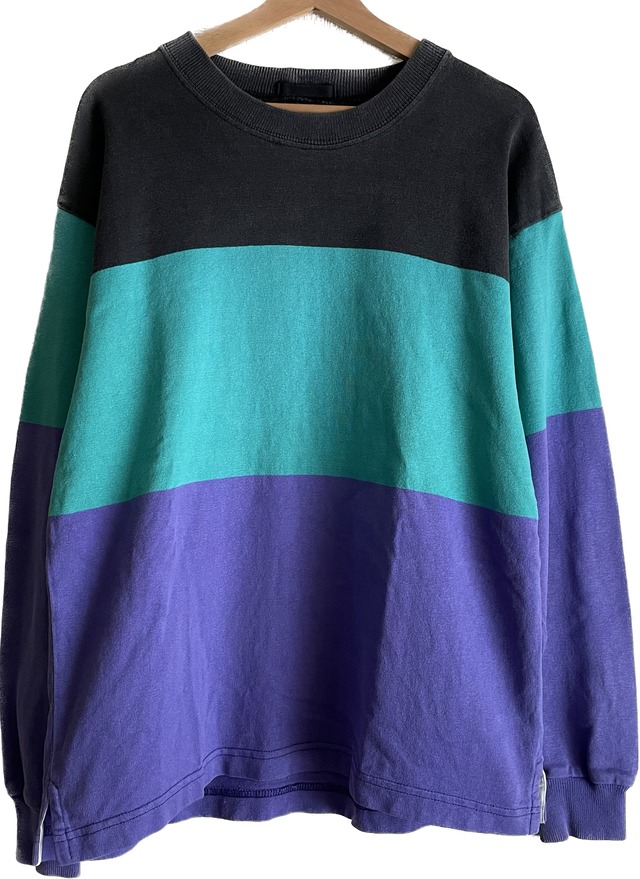 Lands’end Mulch Border Sweat Shirt USA Made!! 90s 【サイズ】M ・着丈:71cm ・肩幅:55cm ・袖丈:63.5cm ・身幅:55cm ※平置きでの採寸となります。 【状態】袖先にほつれ(写真9枚目)や多少の使用感はございますが、使用に支障を及ぼす傷や汚れ等見受けられず、古着慣れされている方であれば問題無くご着用いただけると思います。 【商品詳細】ランズエンドのマルチボーダースウェットシャツ。サイズはM。カラーはパープル×ターコイズ×ブラックのマルチボーダー仕様。90年代頃USA製。太いピッチのボーダーで存在感あります。悪めなカラーリングが目を惹きます。Mサイズですが大きめ。 【備考】 ・実寸について、測り方によって誤差が出る可能性がございます。 ・可能な限り実物に近いような撮影を心がけておりますが、ご確認いただく際の機器や環境によって色合いが変わって見える場合がございます。 予めご理解の程お願い致します。 ・USED.VINTAGEアイテムの為、文章に記載のないダメージや汚れ等ある場合がございます。 ・商品についてご質問ございましたらご連絡下さい。