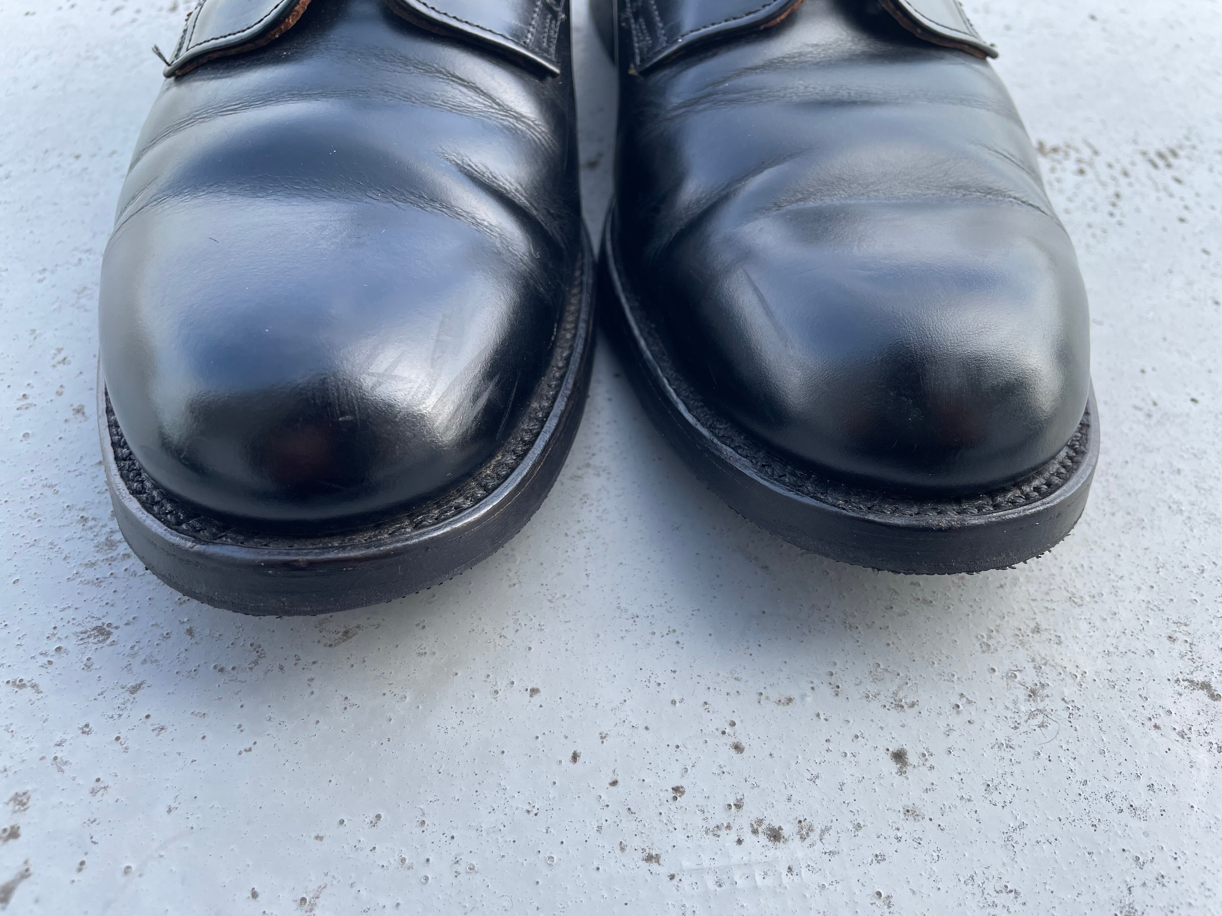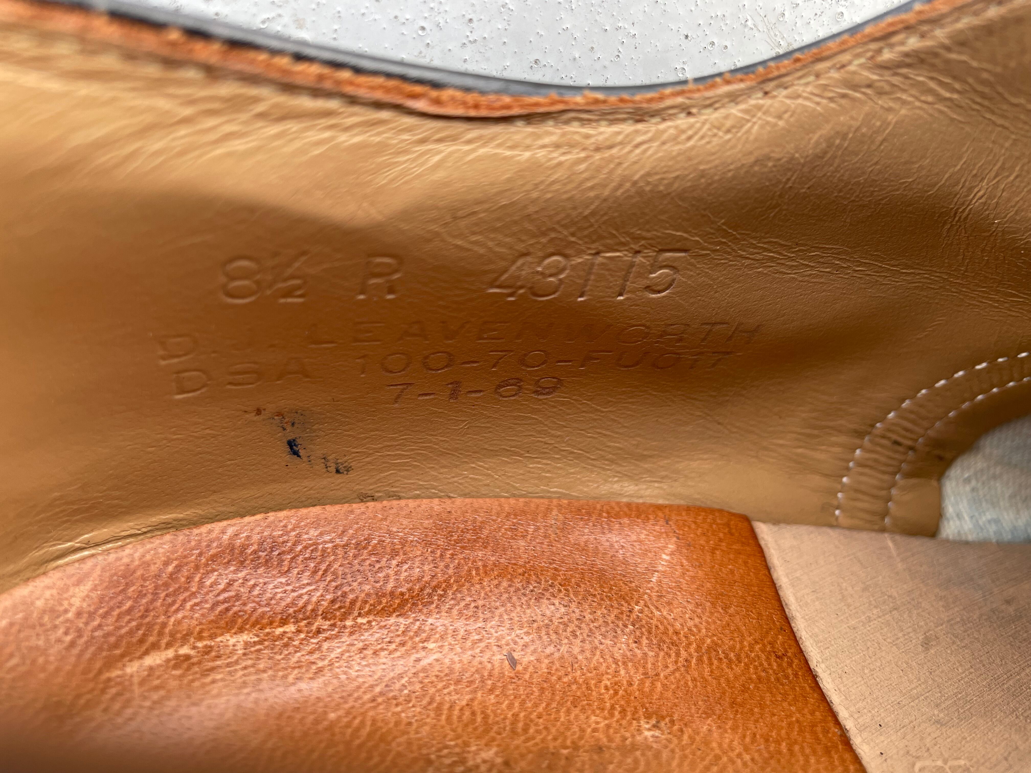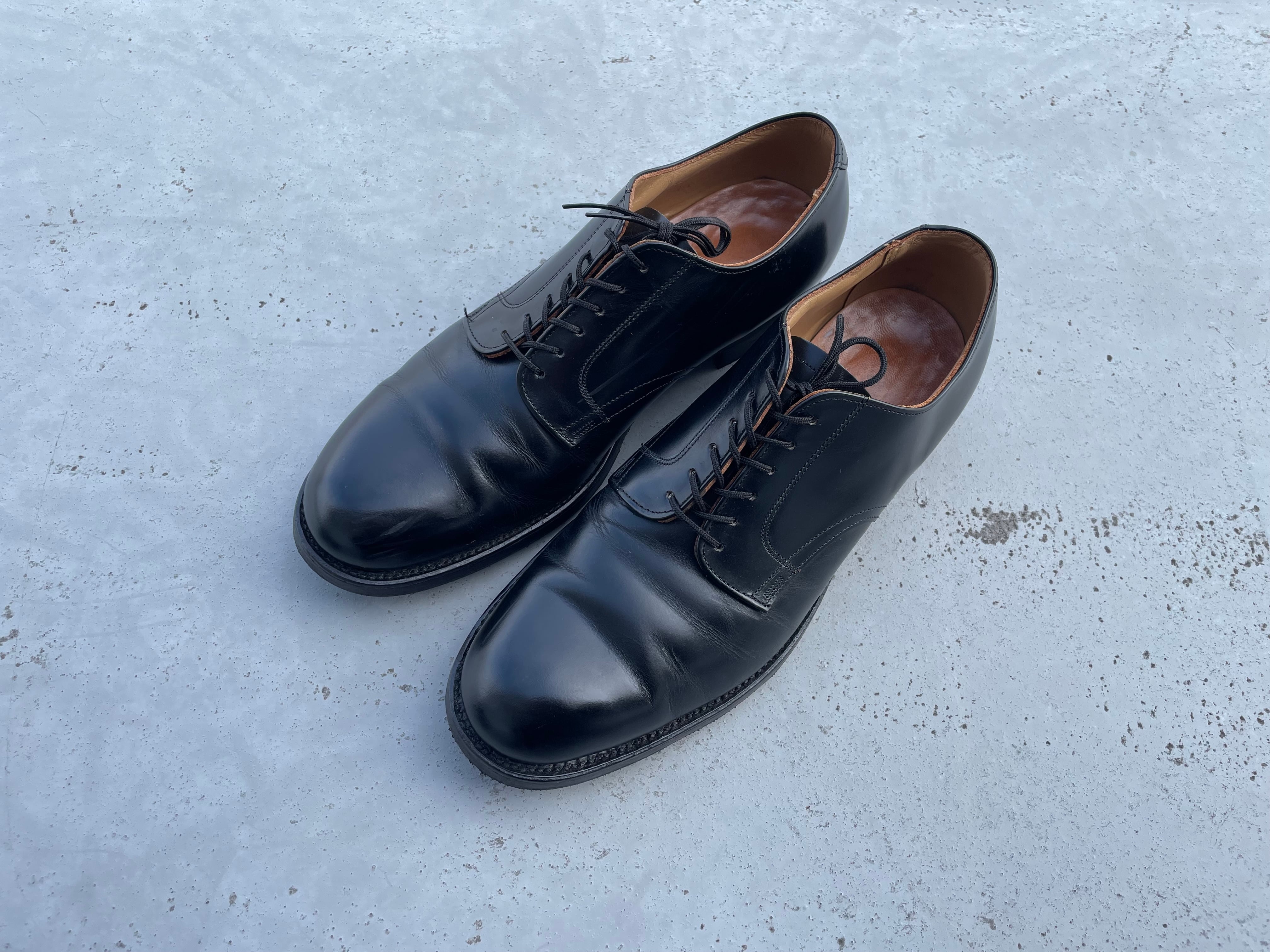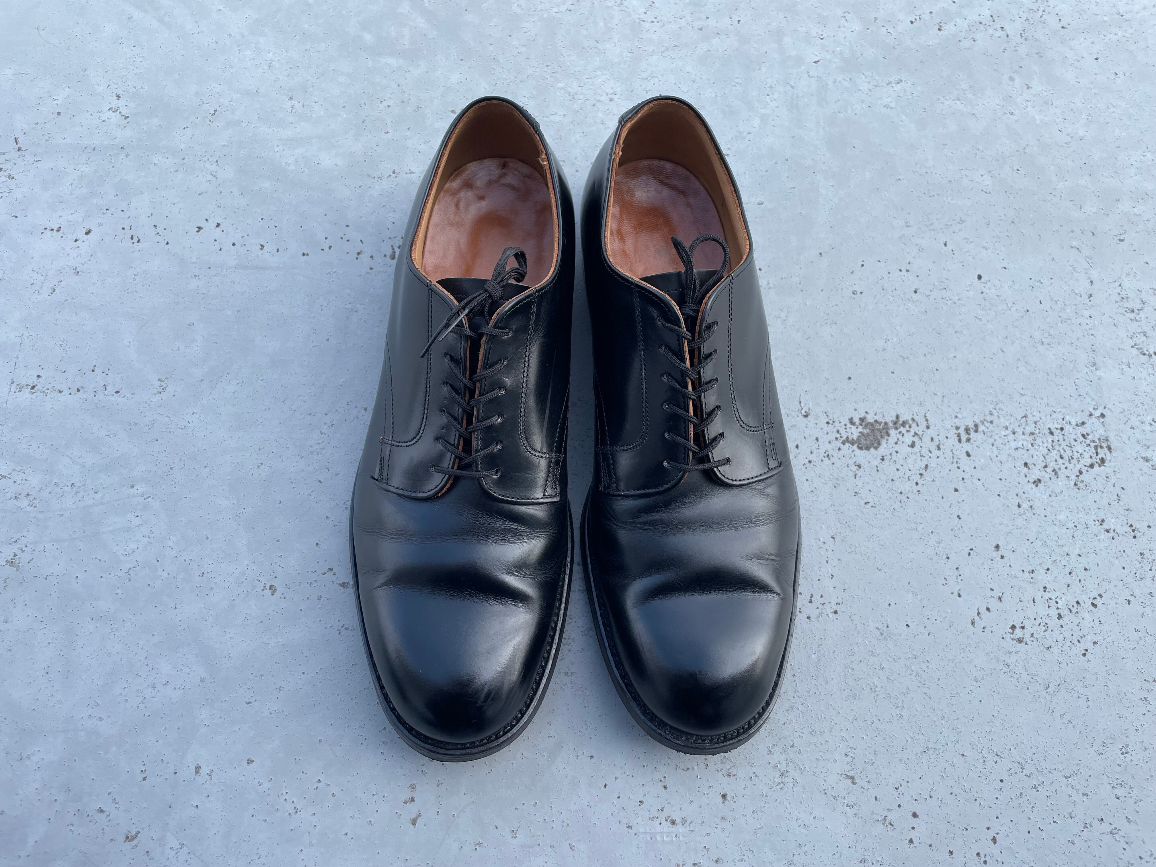 【商品詳細】U.S.NAVYのサービスシューズ。カラーはブラック。サイズはゴールデンの8 1/2。70年D.J.LEAVENWORTH社製。タン裏フェルト。6ホール。Oldのガラスレザー仕様で雰囲気◎履きシワや踵減り等少なく、年代物の割に状態も良いと思います。