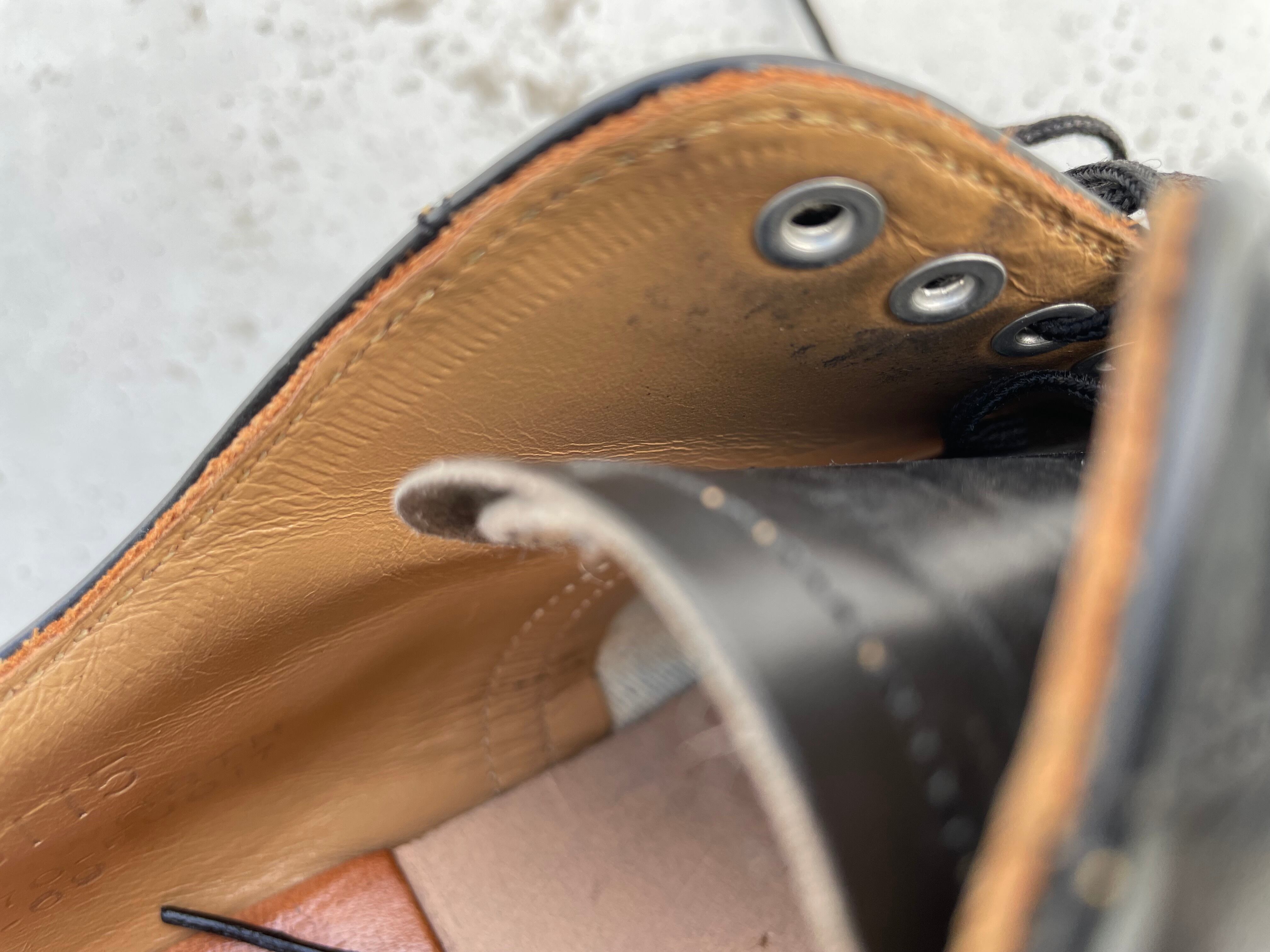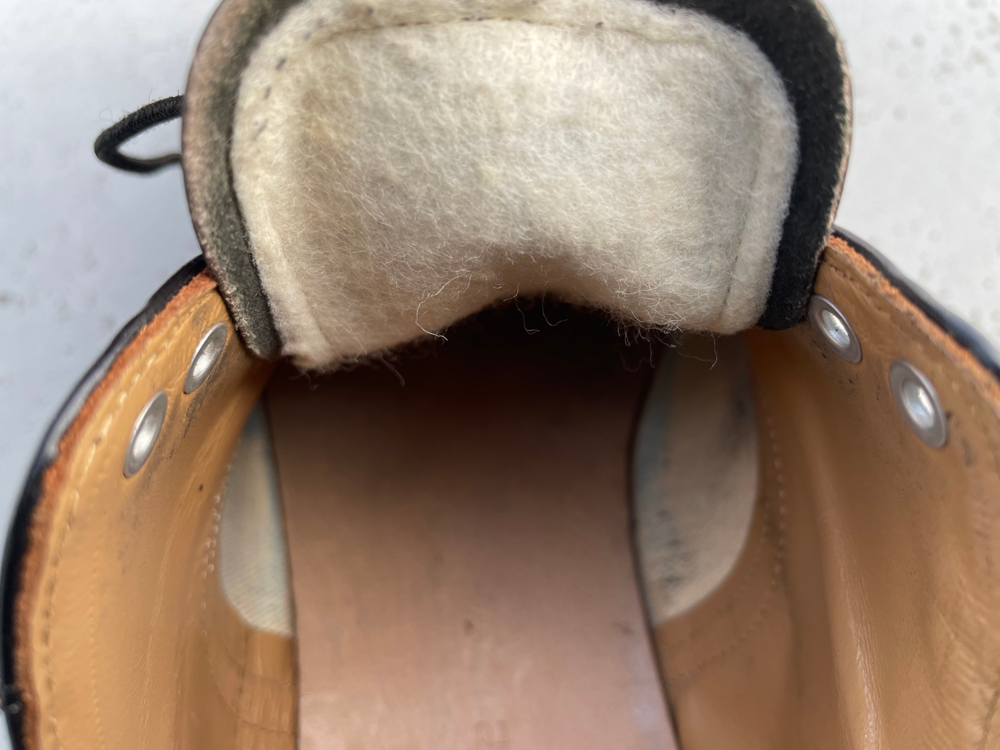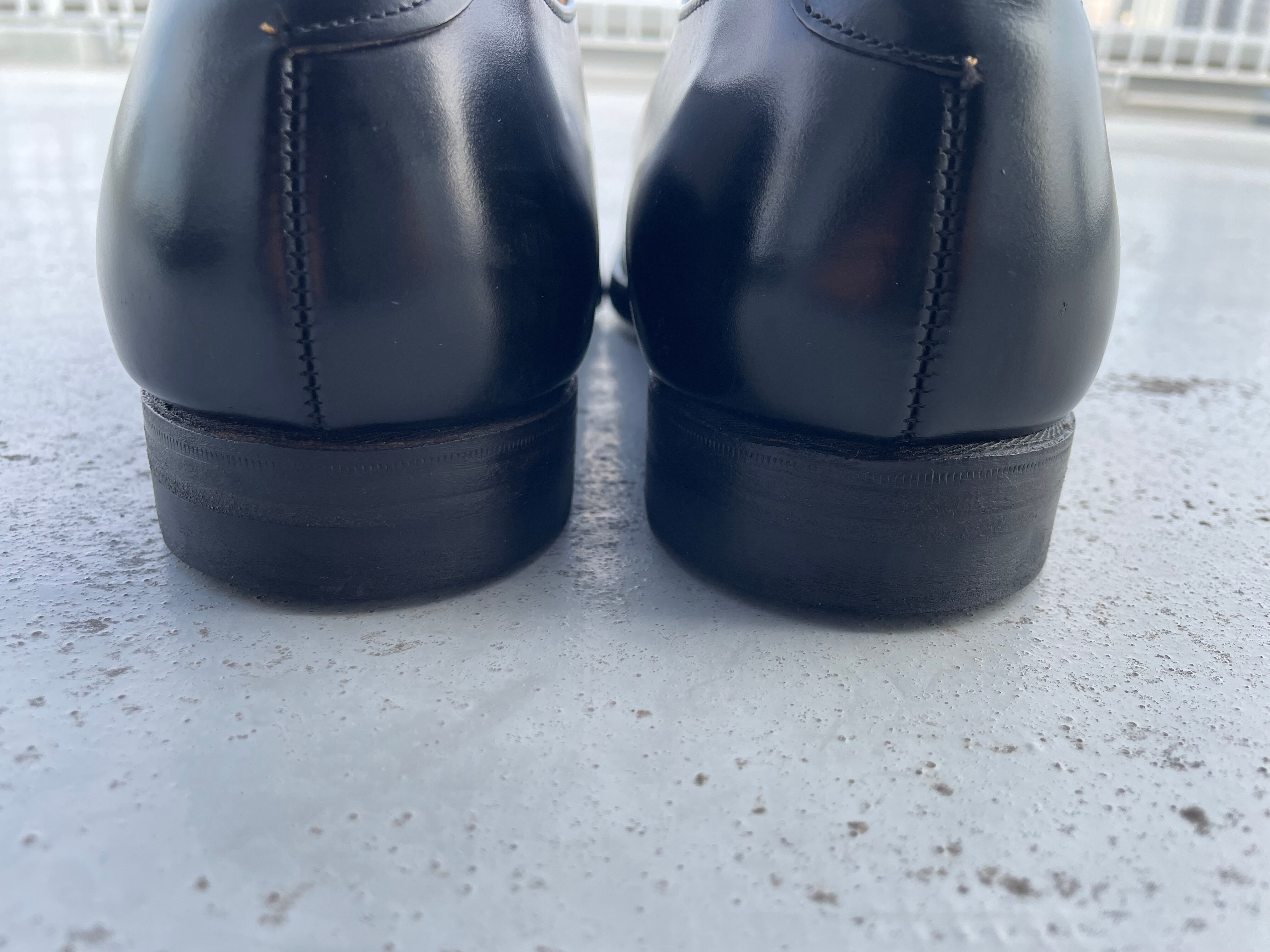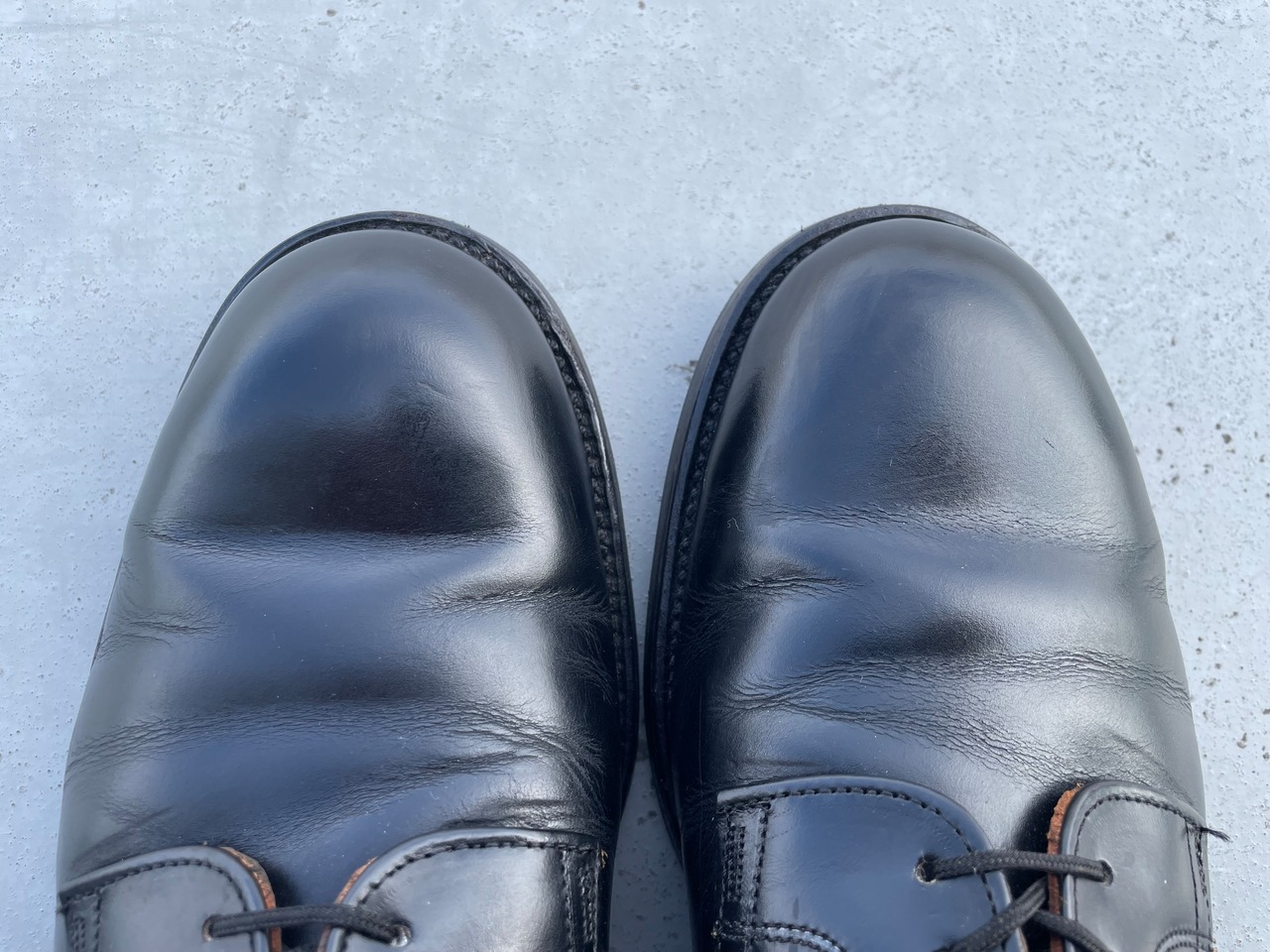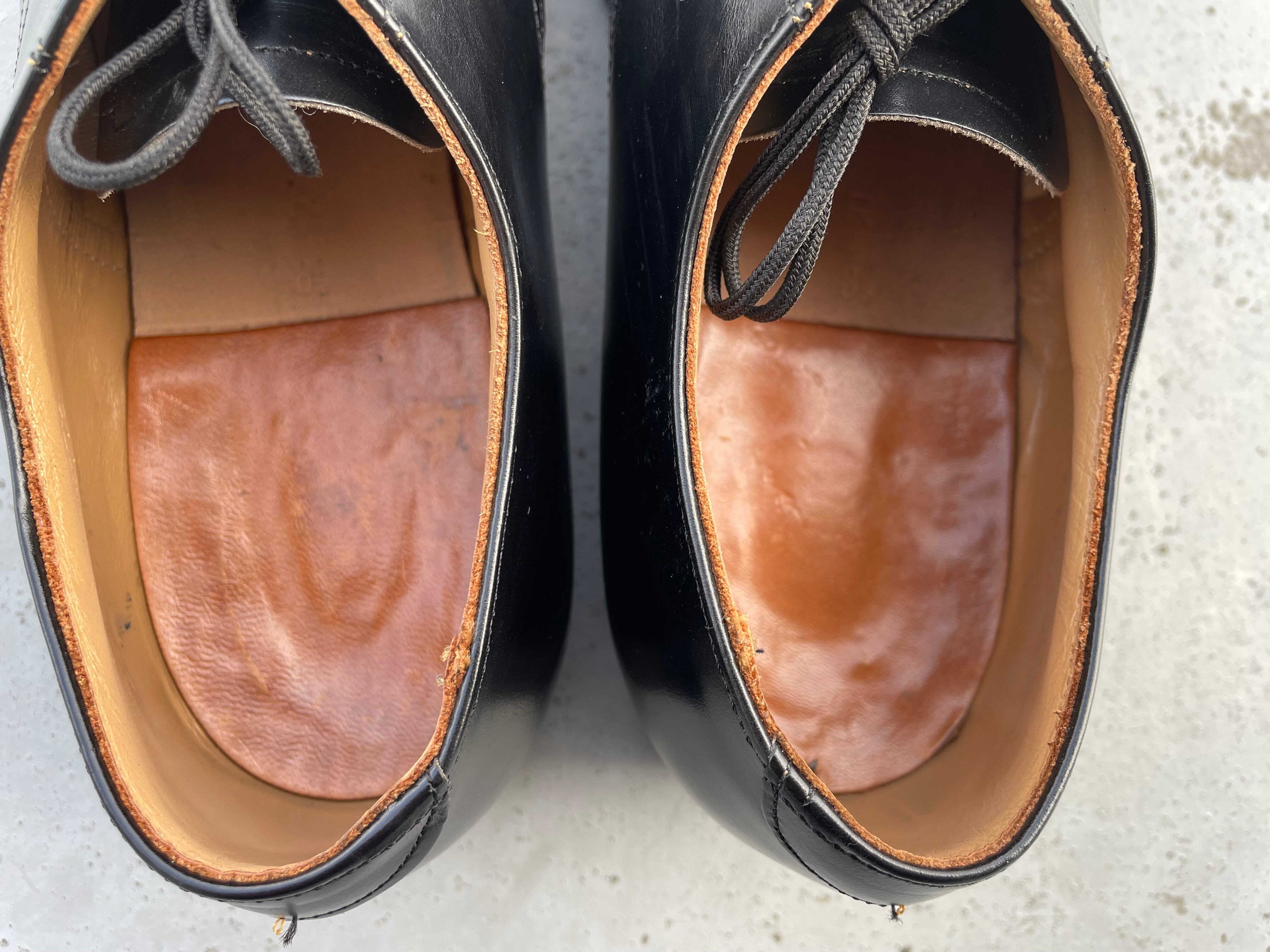 【商品詳細】U.S.NAVYのサービスシューズ。カラーはブラック。サイズはゴールデンの8 1/2。70年D.J.LEAVENWORTH社製。タン裏フェルト。6ホール。Oldのガラスレザー仕様で雰囲気◎履きシワや踵減り等少なく、年代物の割に状態も良いと思います。