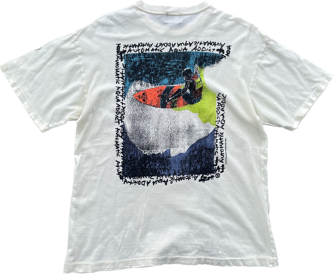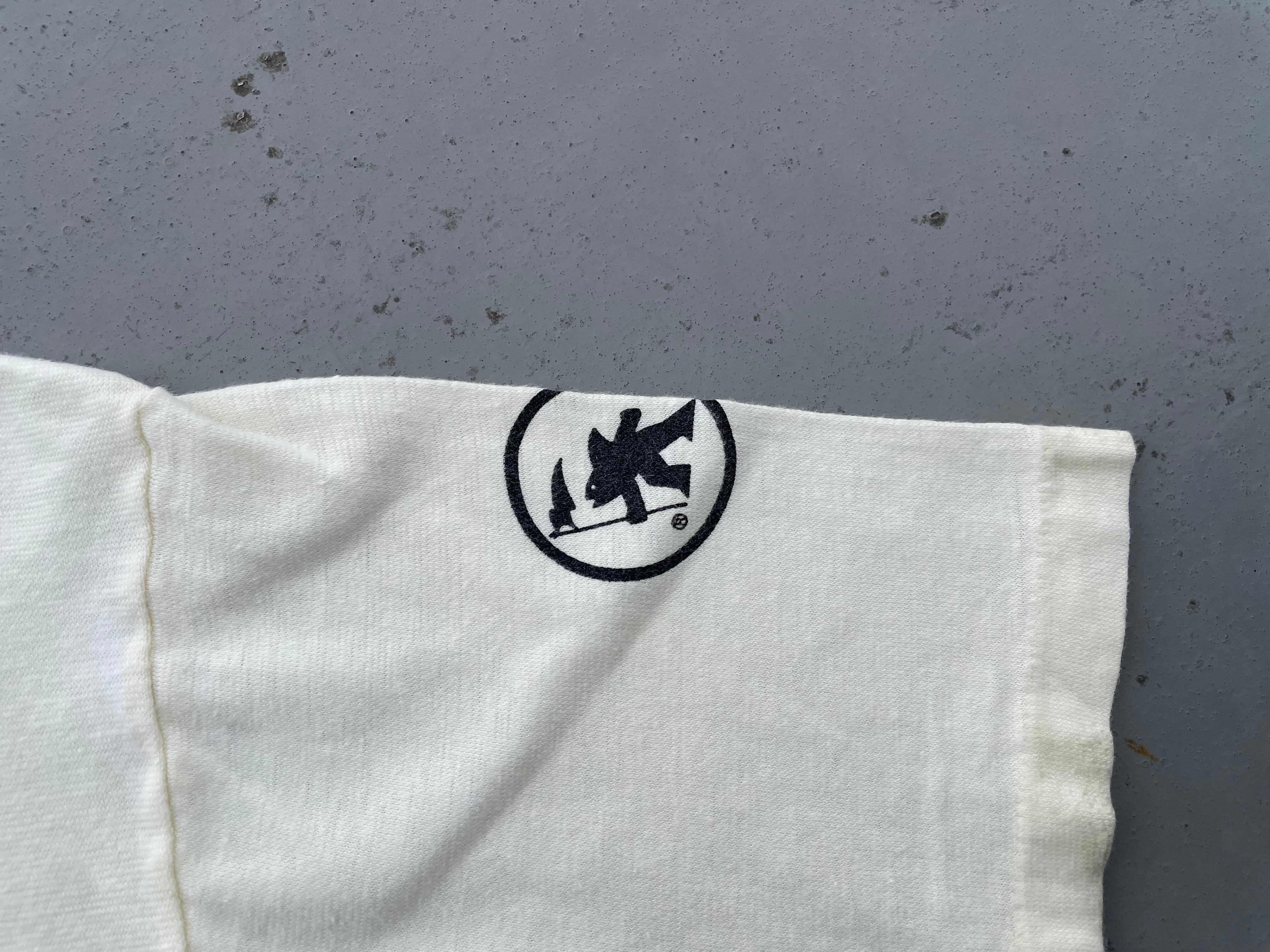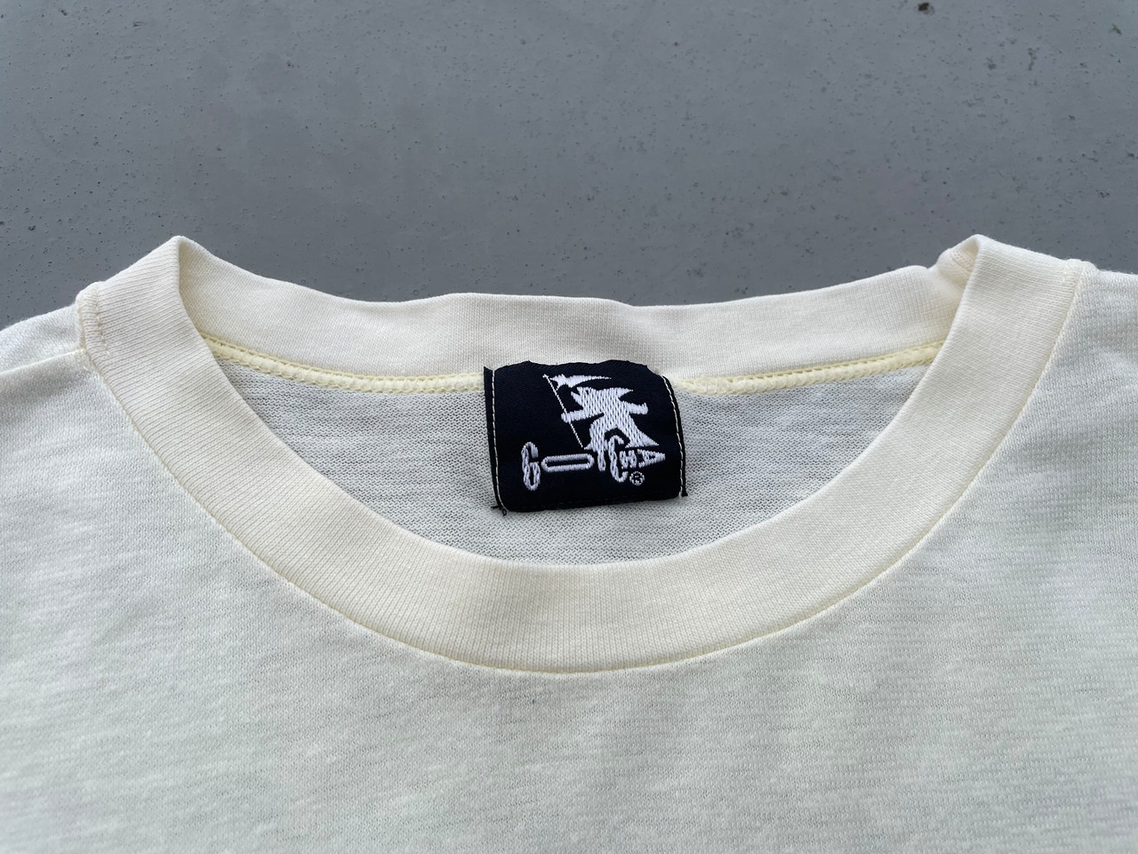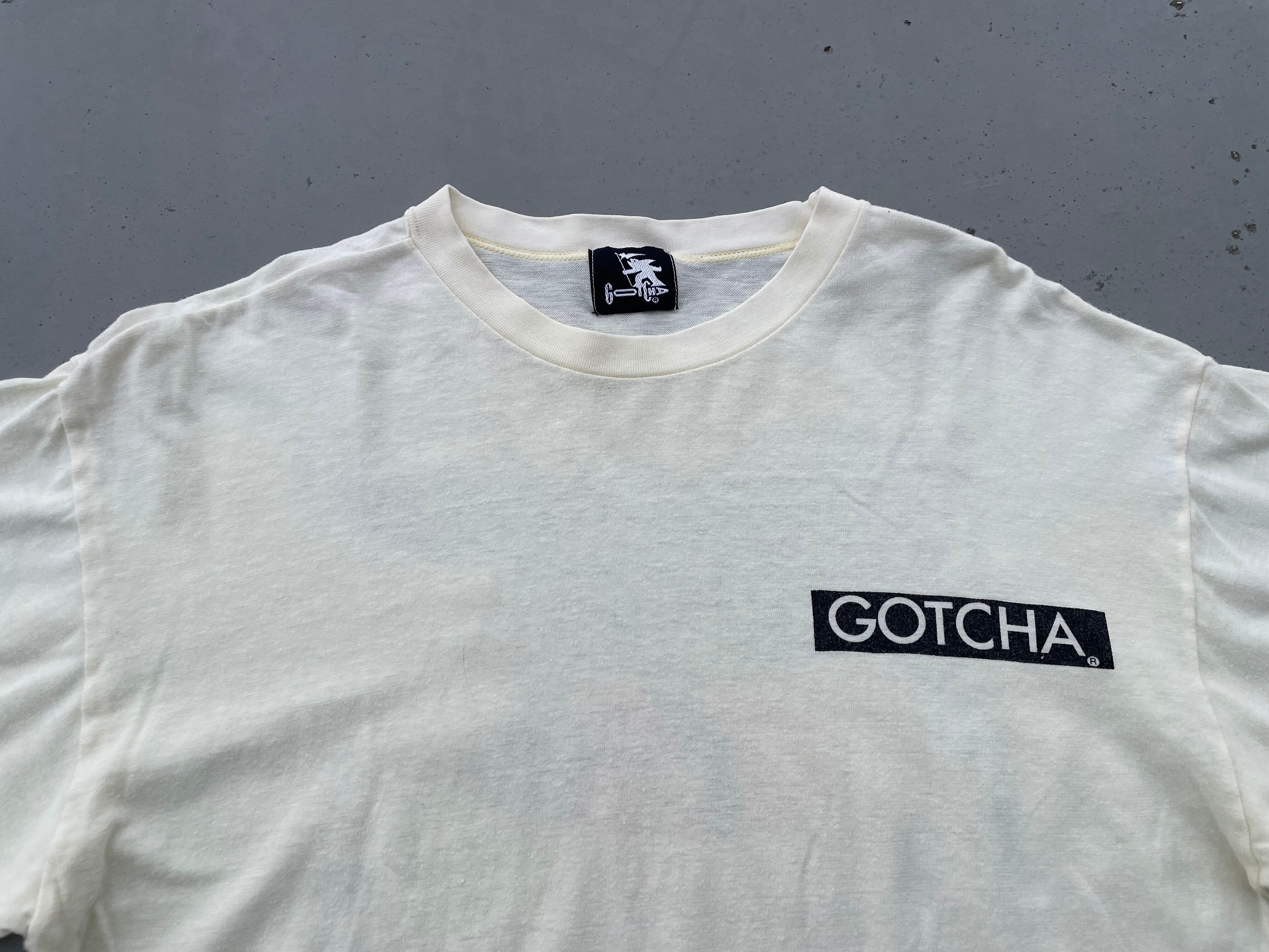 【商品詳細】Gotchaの半袖Tシャツ。カラーはホワイト。88年製。裾・袖シングル。ショーン・ステューシーがデザインした希少な1着。希少な染み込みプリント。ショーンフォントはいつの時代も褪せないすね。出ない系かと。