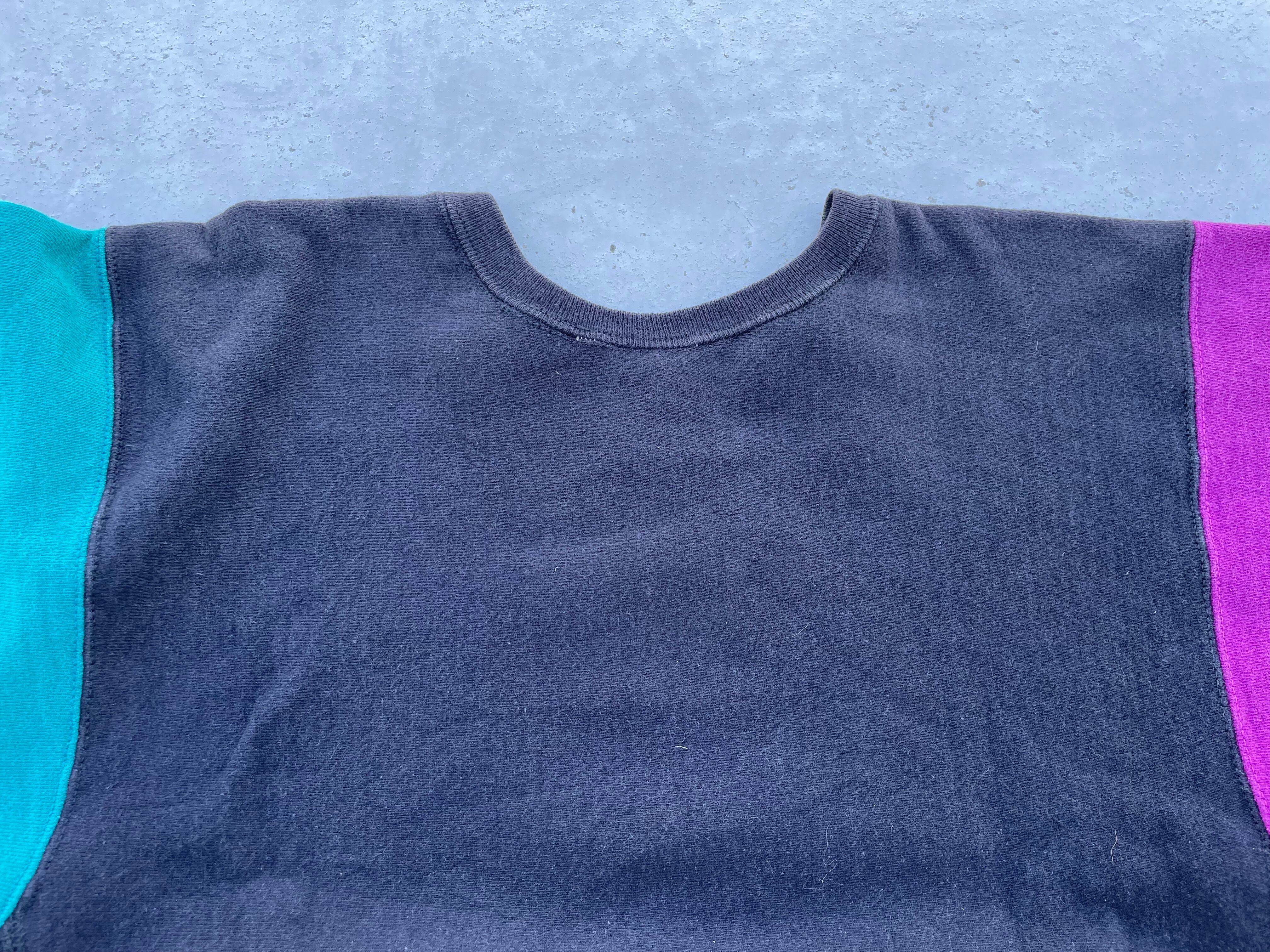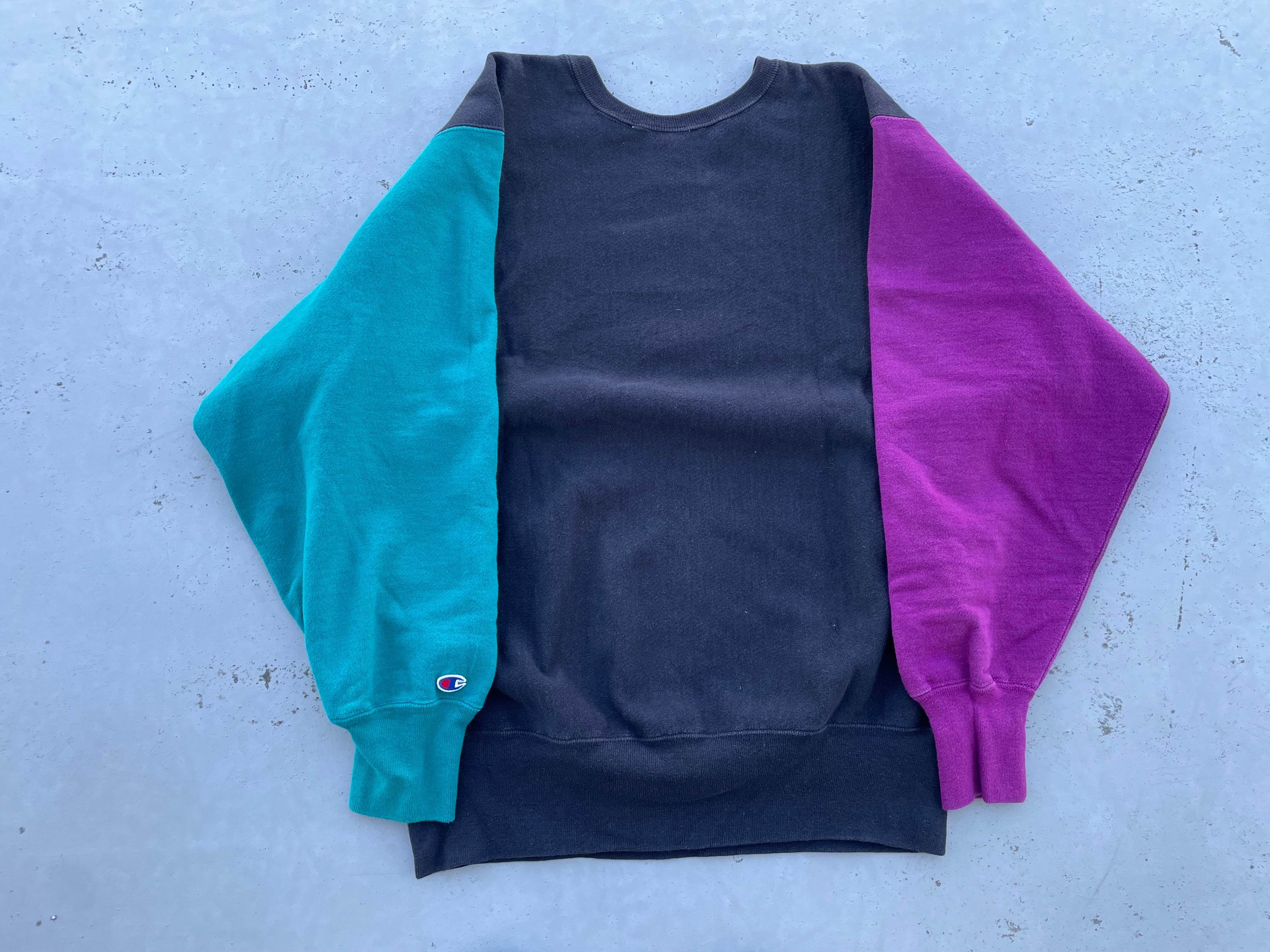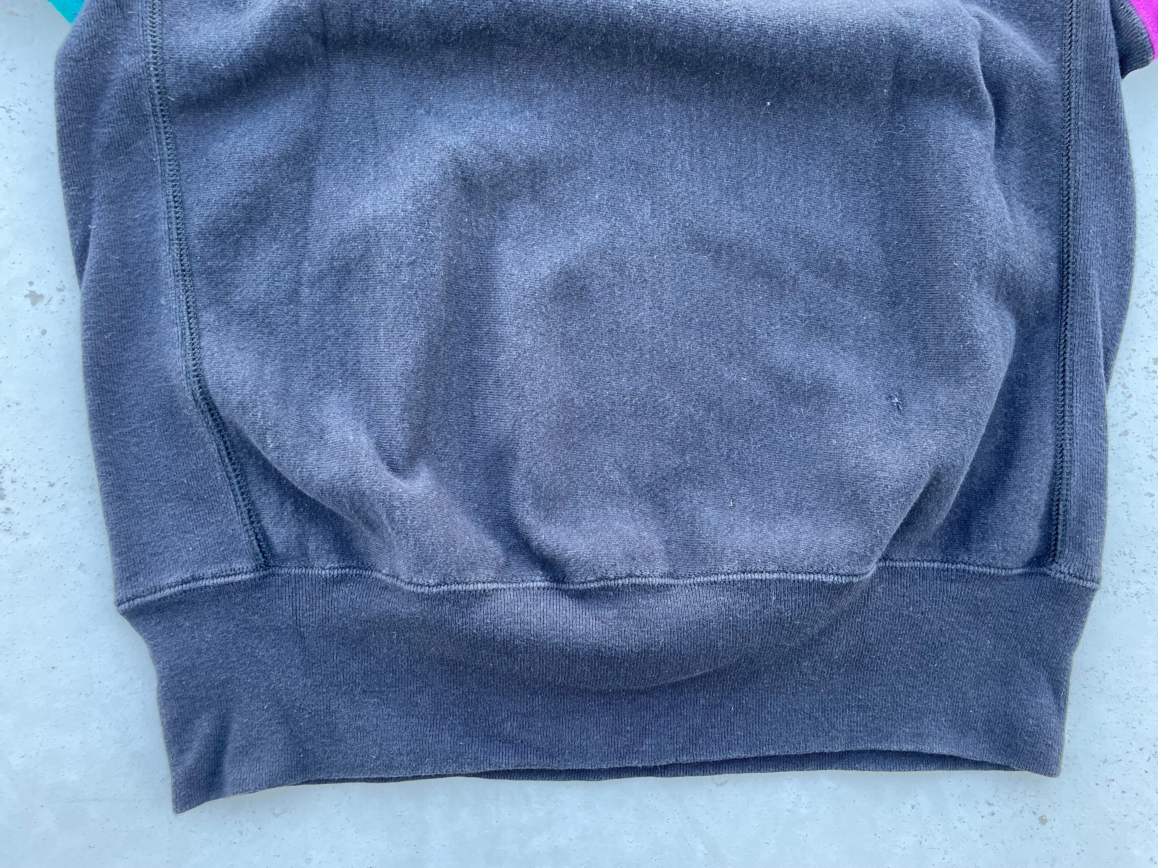 【商品詳細】チャンピオンのリバースウィーブ。カラーはブラック×ピンク×ターコイズのクレイジーパターン。サイズはXL。90年代USA製。リバースウィーブのクレイジーパターンの中でも代表的なパターンと言っても過言でないかと。背面下部にダメージありますがあまり気にならないと思います。生地はフカフカを感じられ前線で活躍する個体だと思います。