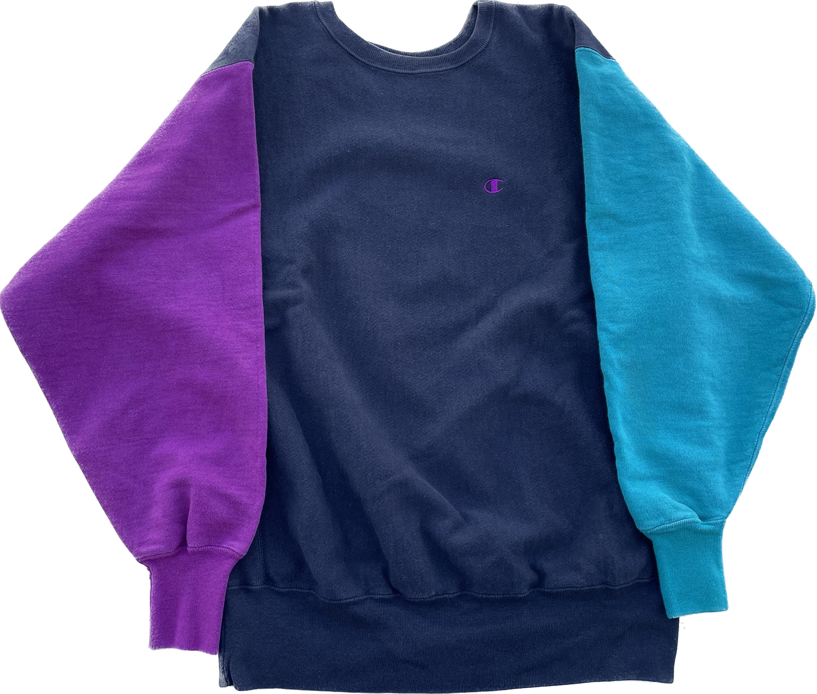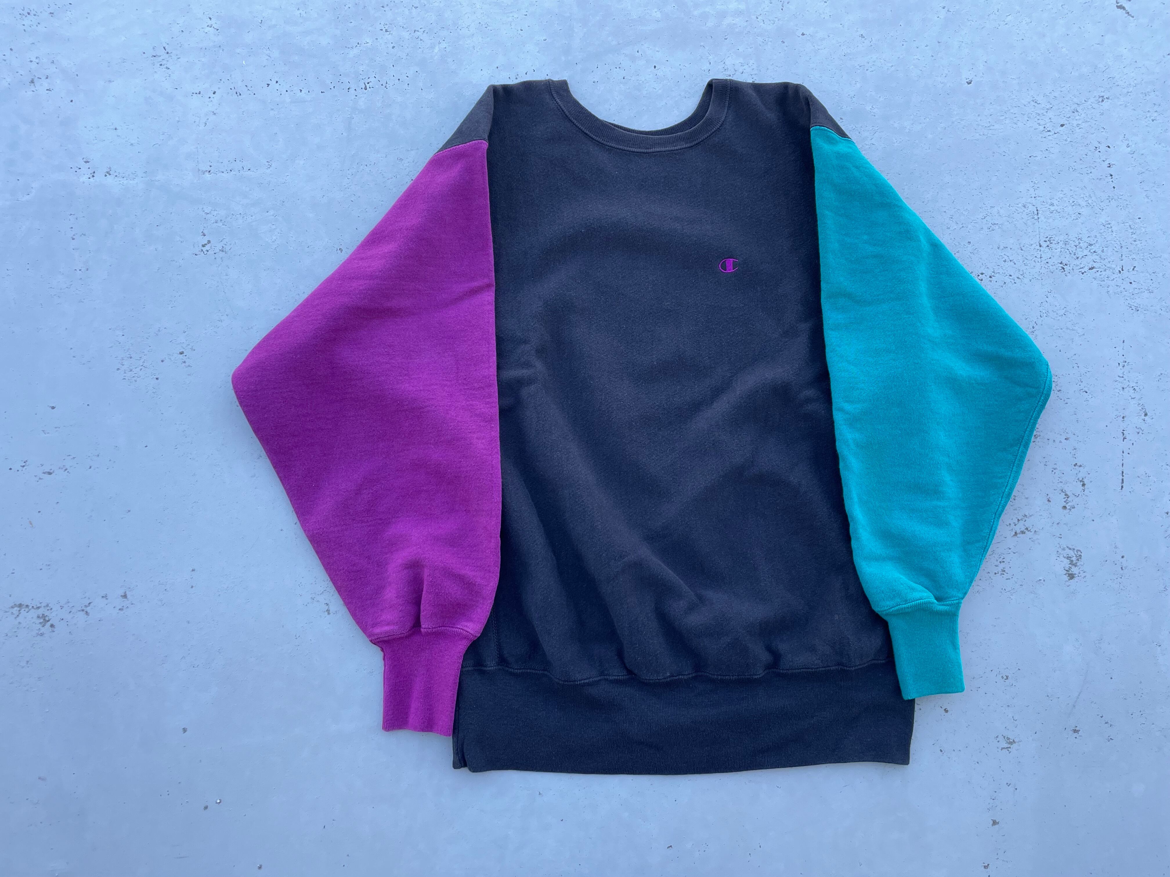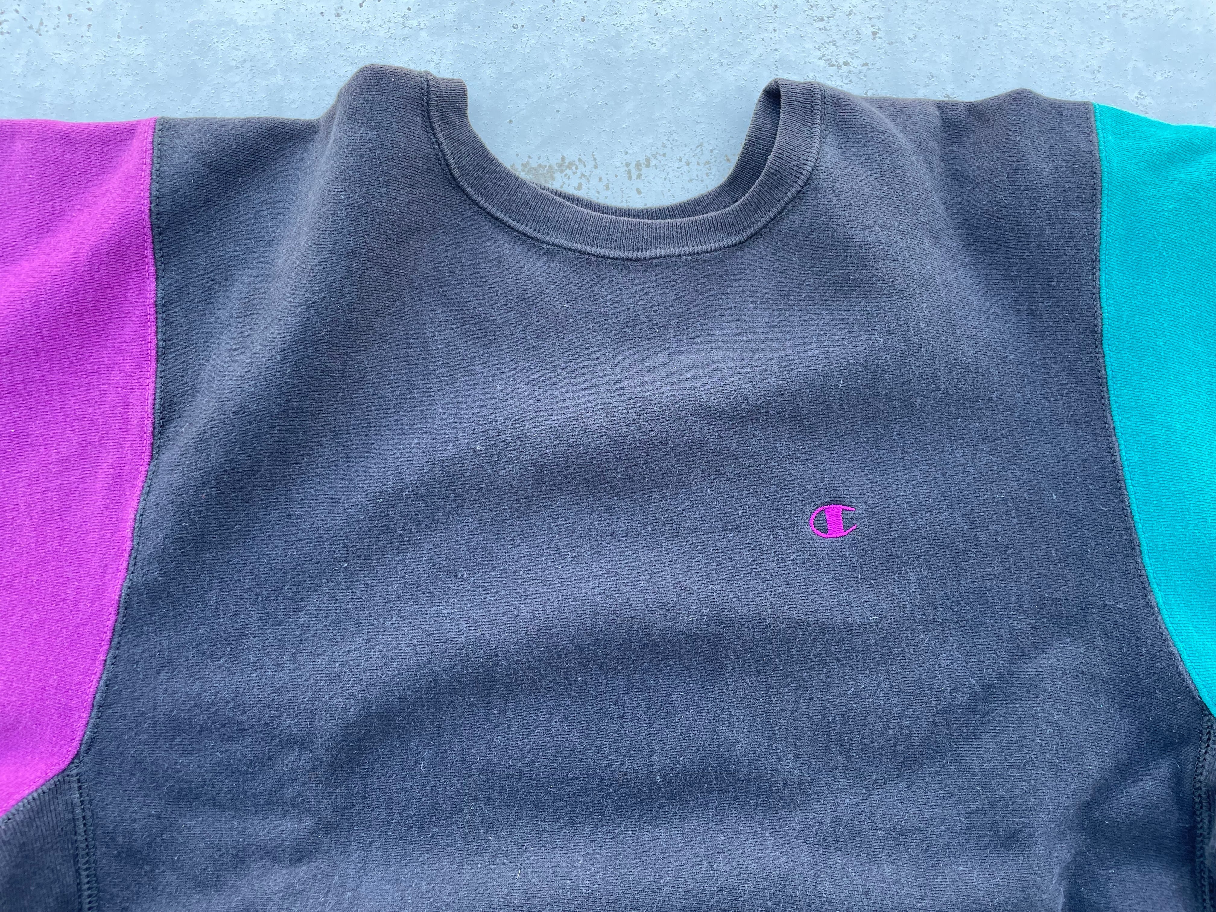 【商品詳細】チャンピオンのリバースウィーブ。カラーはブラック×ピンク×ターコイズのクレイジーパターン。サイズはXL。90年代USA製。リバースウィーブのクレイジーパターンの中でも代表的なパターンと言っても過言でないかと。背面下部にダメージありますがあまり気にならないと思います。生地はフカフカを感じられ前線で活躍する個体だと思います。