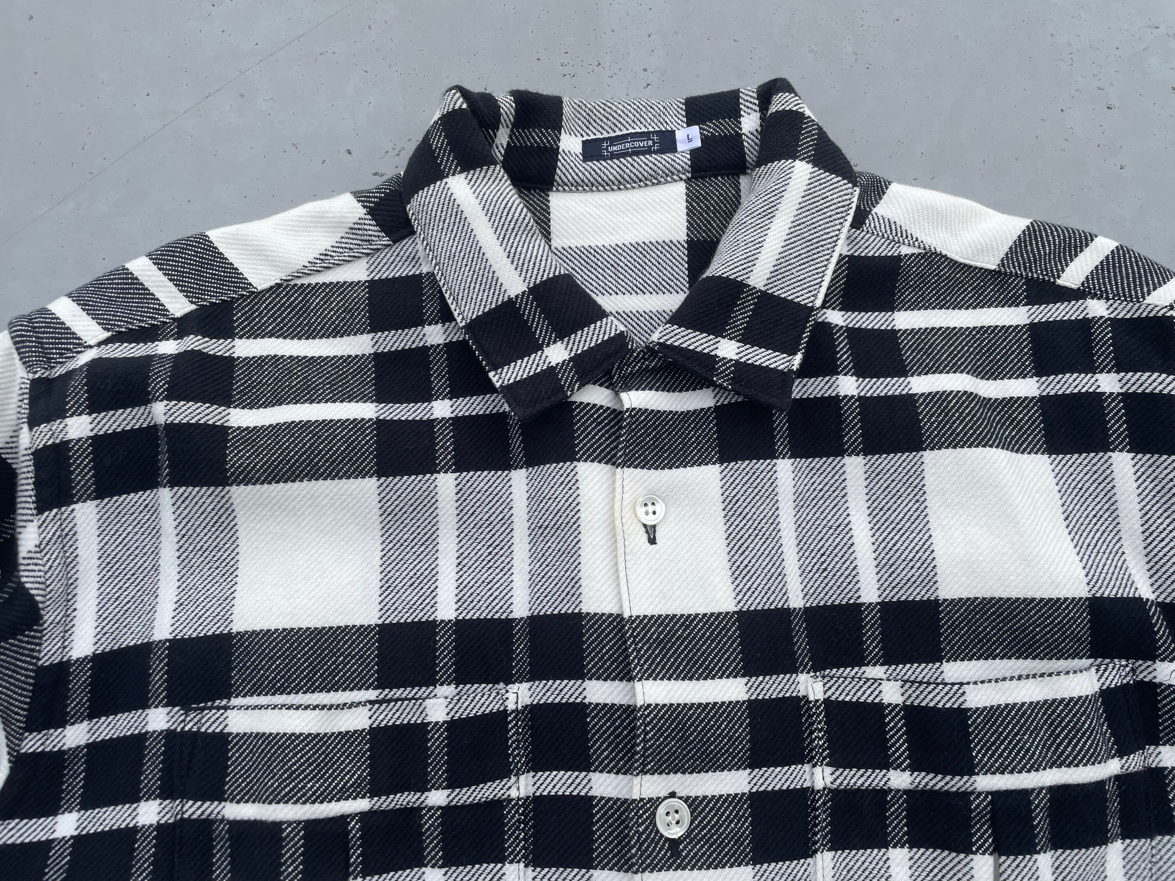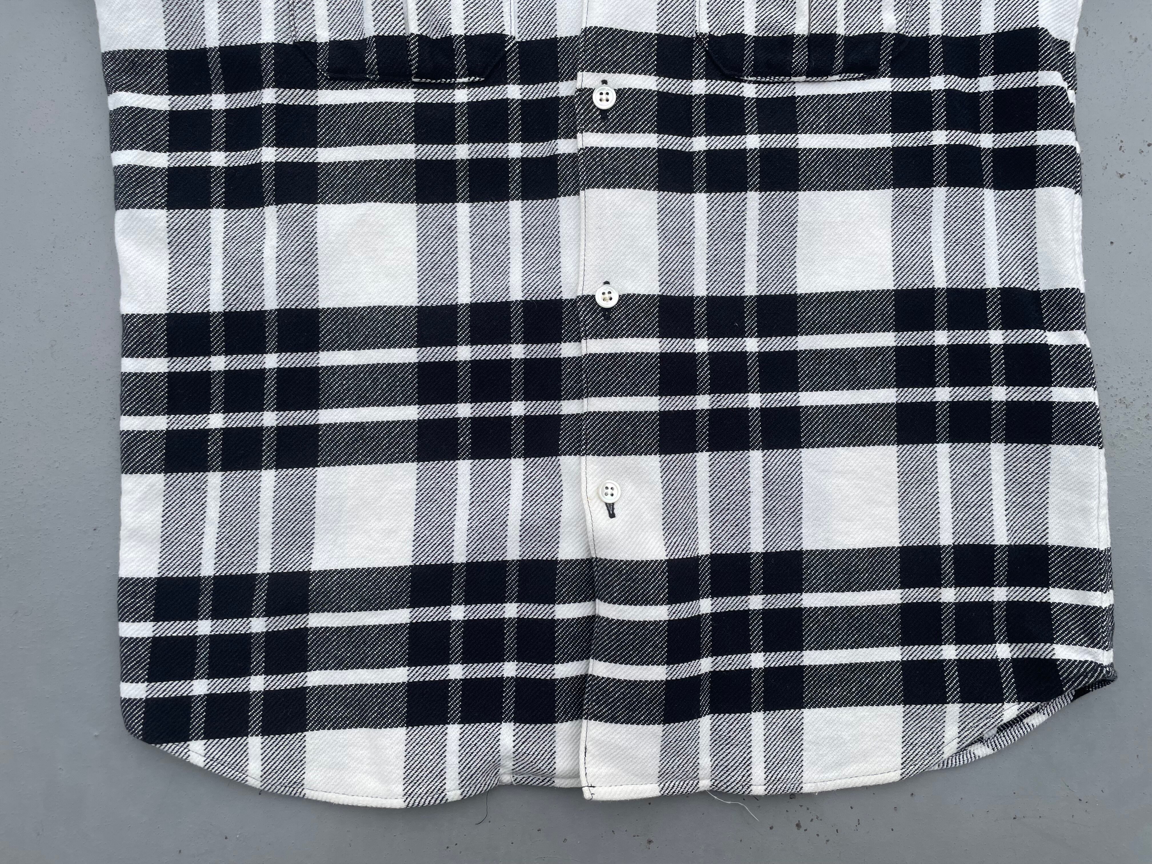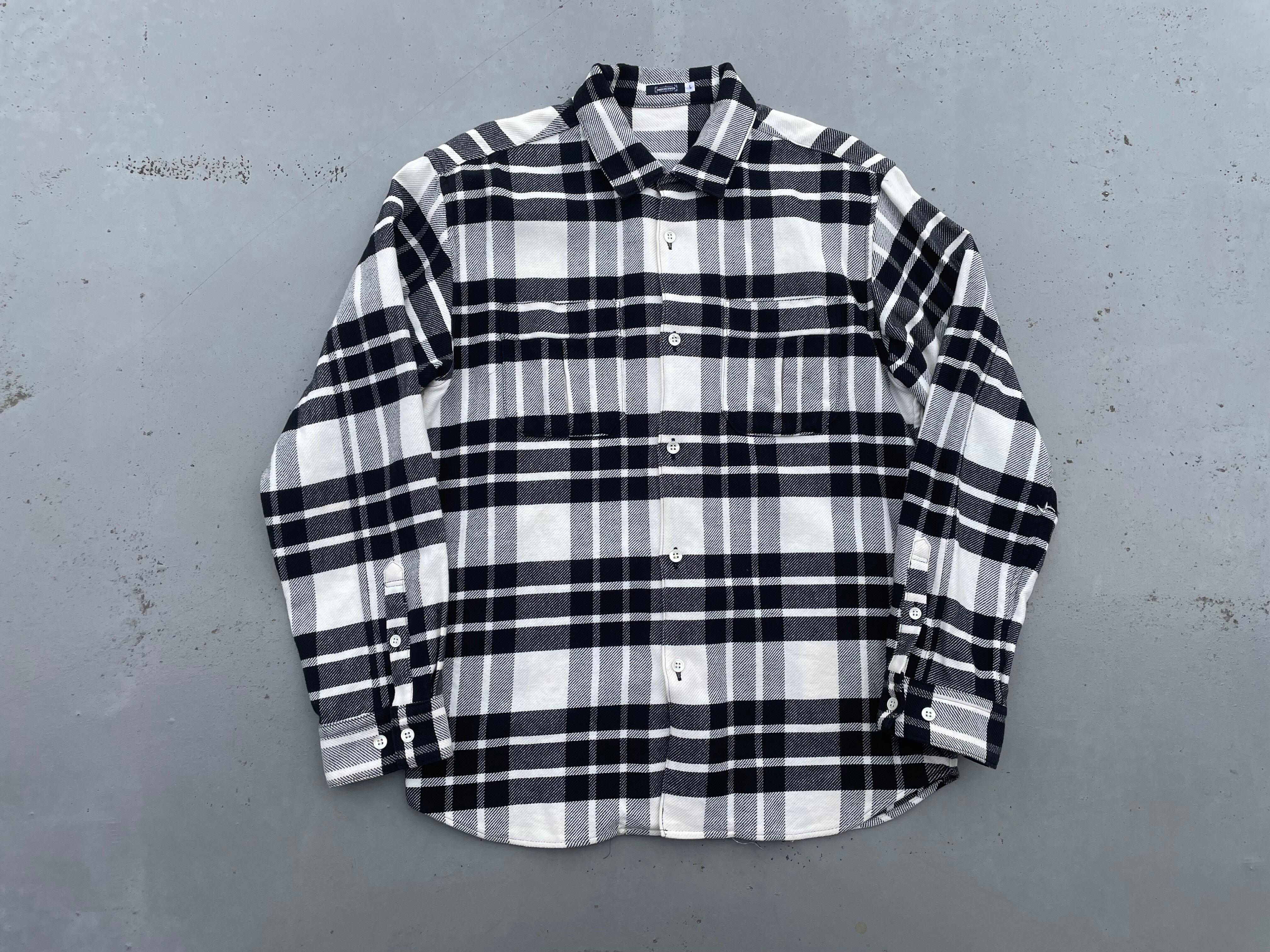 【商品詳細】D.A.V.F期 アンダーカバーのコットンチェックオープンカラーシャツ。カラーはホワイト×ブラック。コットン100%。サイズはL。01-02年日本製。「宝飾武装義勇軍期」と言われ、比較的派手なデザインの物が多かったシーズンですがこちらのシャツは至ってシンプルなデザインで当時のブランドらしからぬ風貌。綺麗なラウンドシルエットや開襟仕様等、今時な1着になっていると思います。これはもう出ない系ですね。