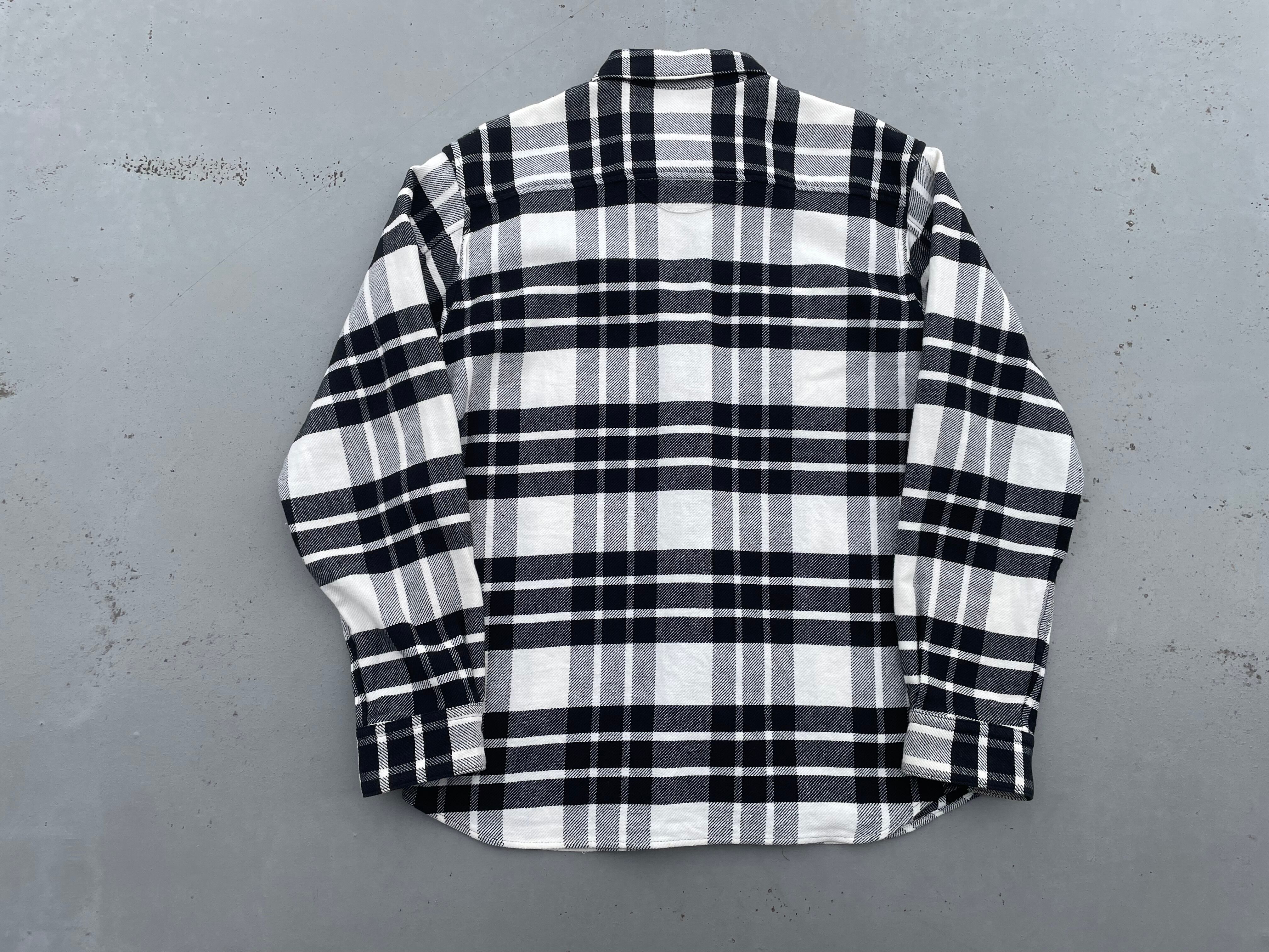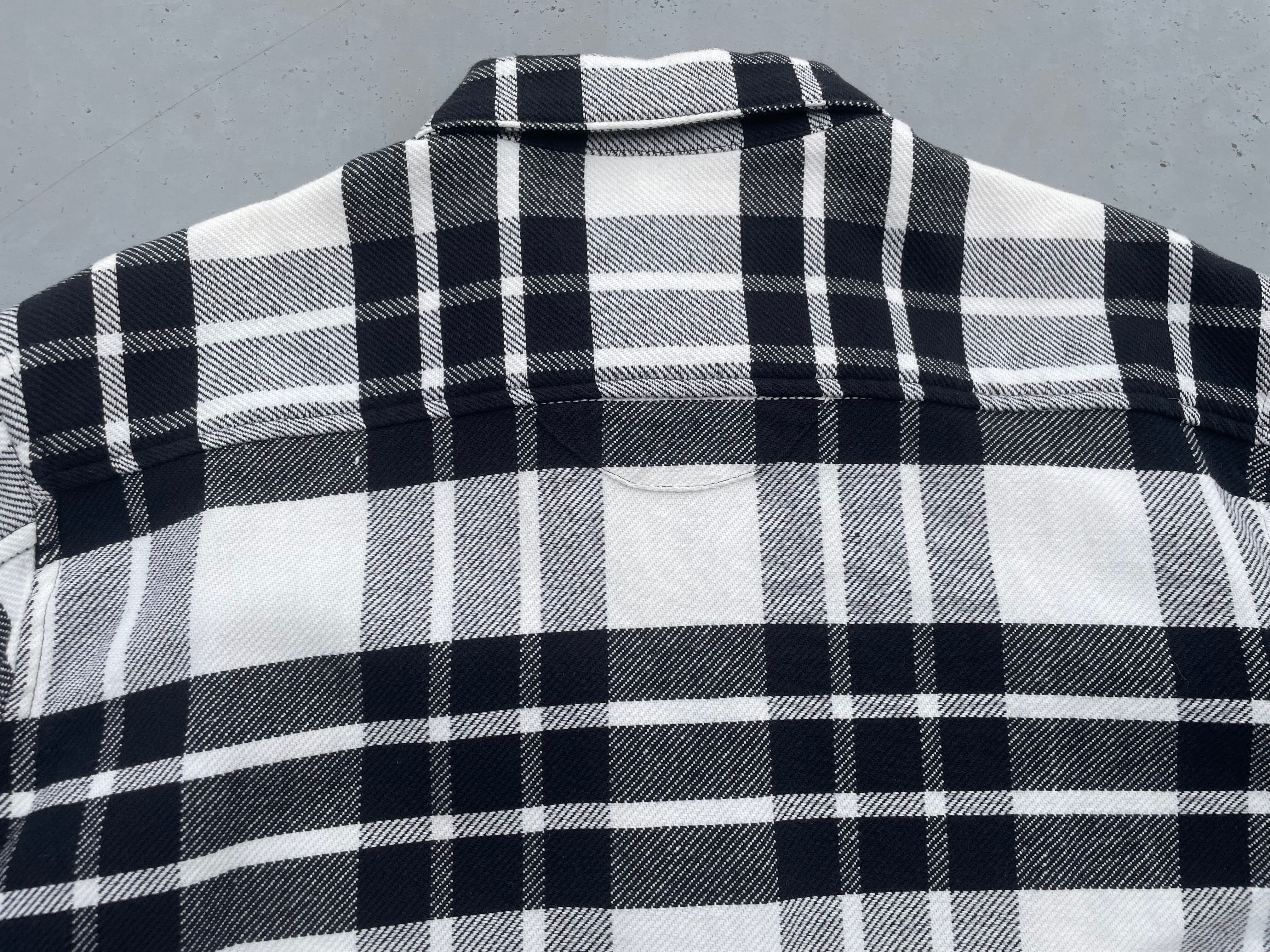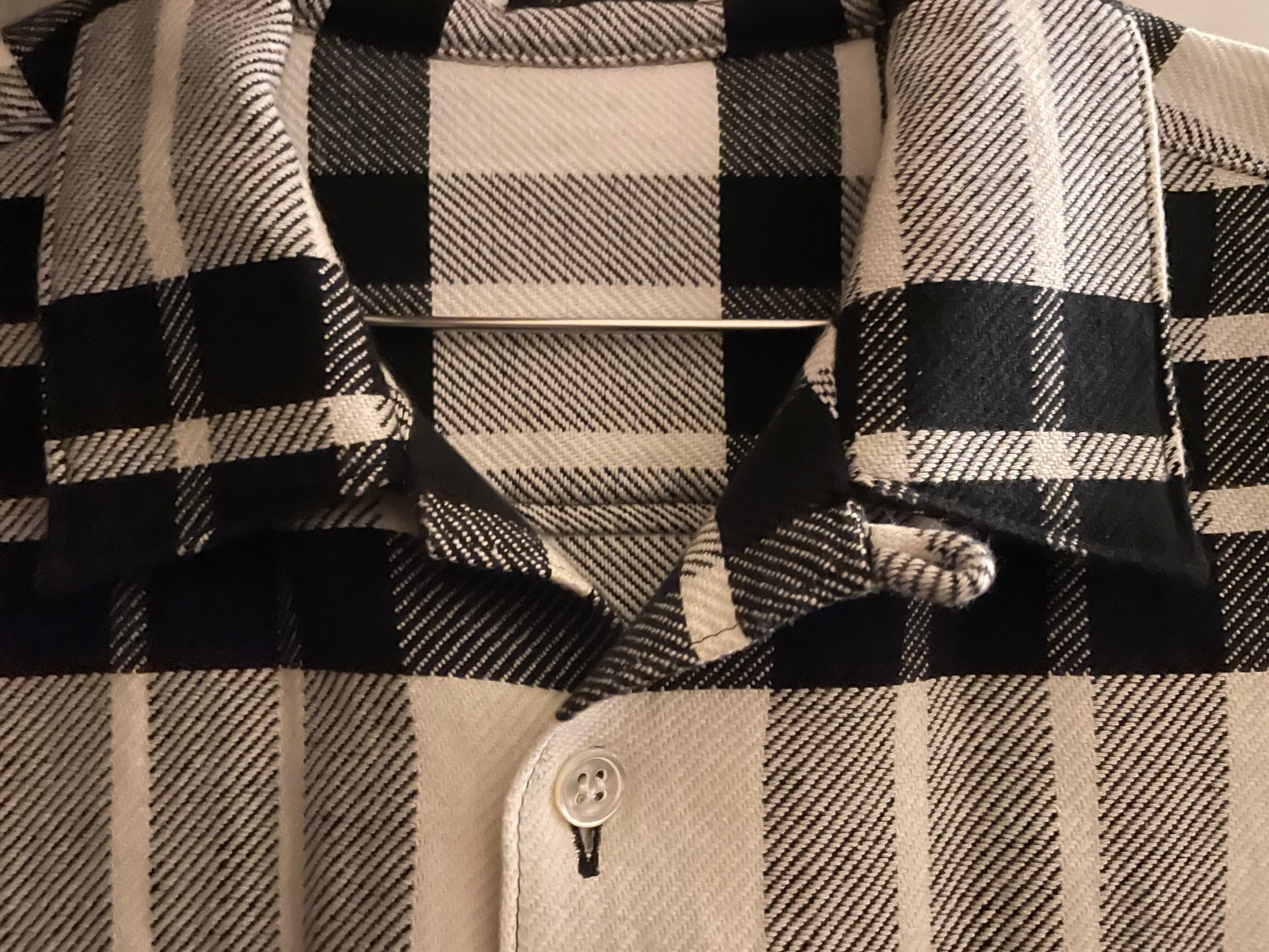 【商品詳細】D.A.V.F期 アンダーカバーのコットンチェックオープンカラーシャツ。カラーはホワイト×ブラック。コットン100%。サイズはL。01-02年日本製。「宝飾武装義勇軍期」と言われ、比較的派手なデザインの物が多かったシーズンですがこちらのシャツは至ってシンプルなデザインで当時のブランドらしからぬ風貌。綺麗なラウンドシルエットや開襟仕様等、今時な1着になっていると思います。これはもう出ない系ですね。