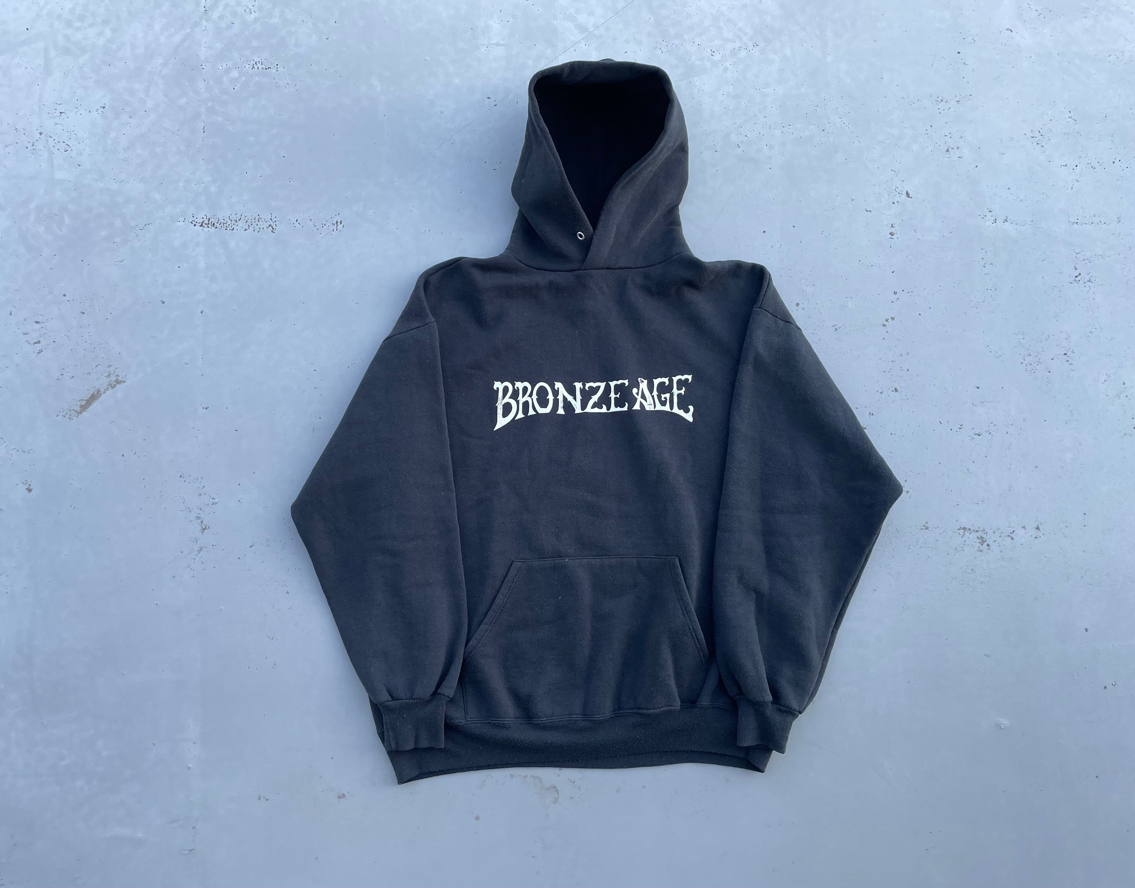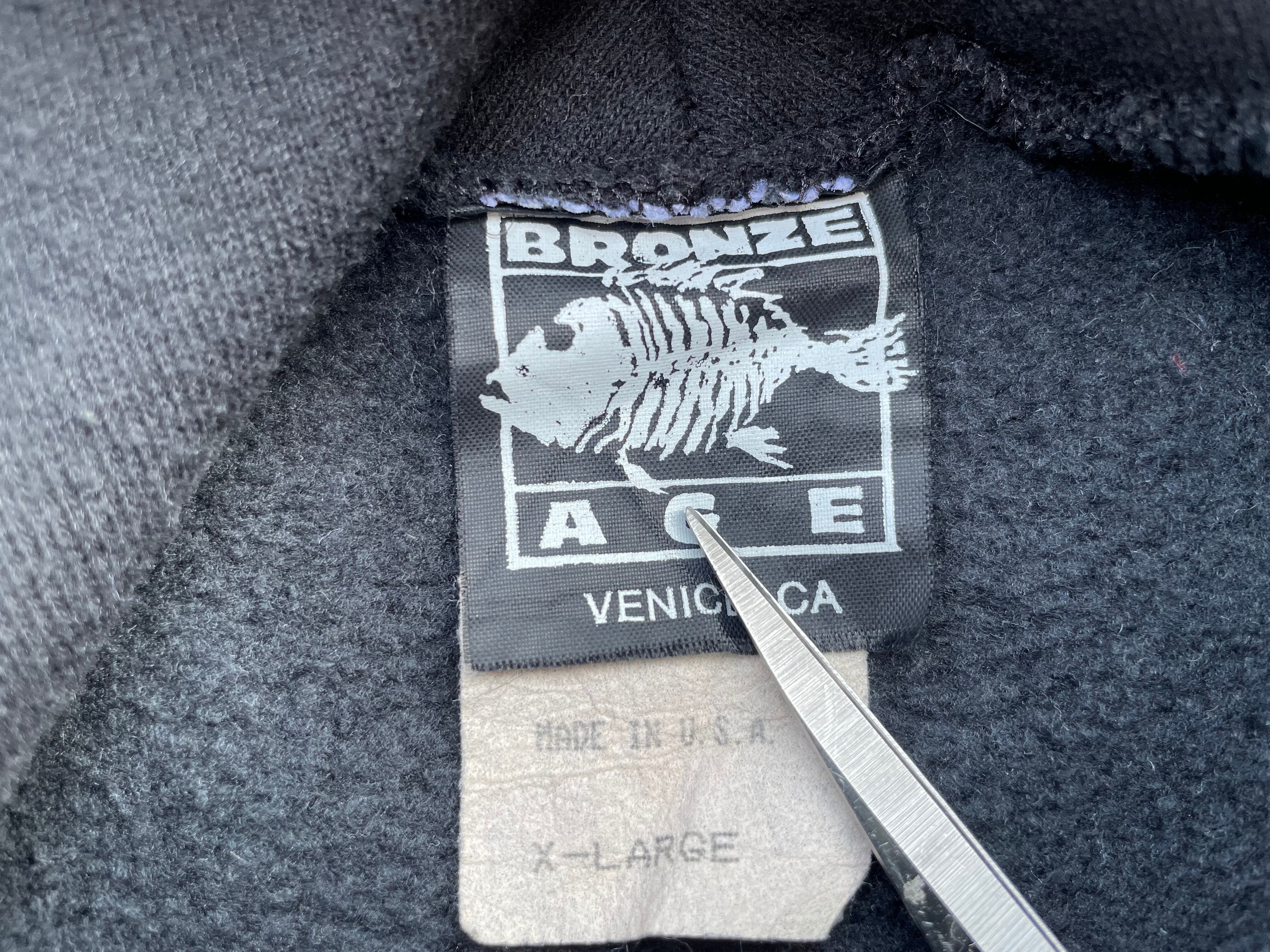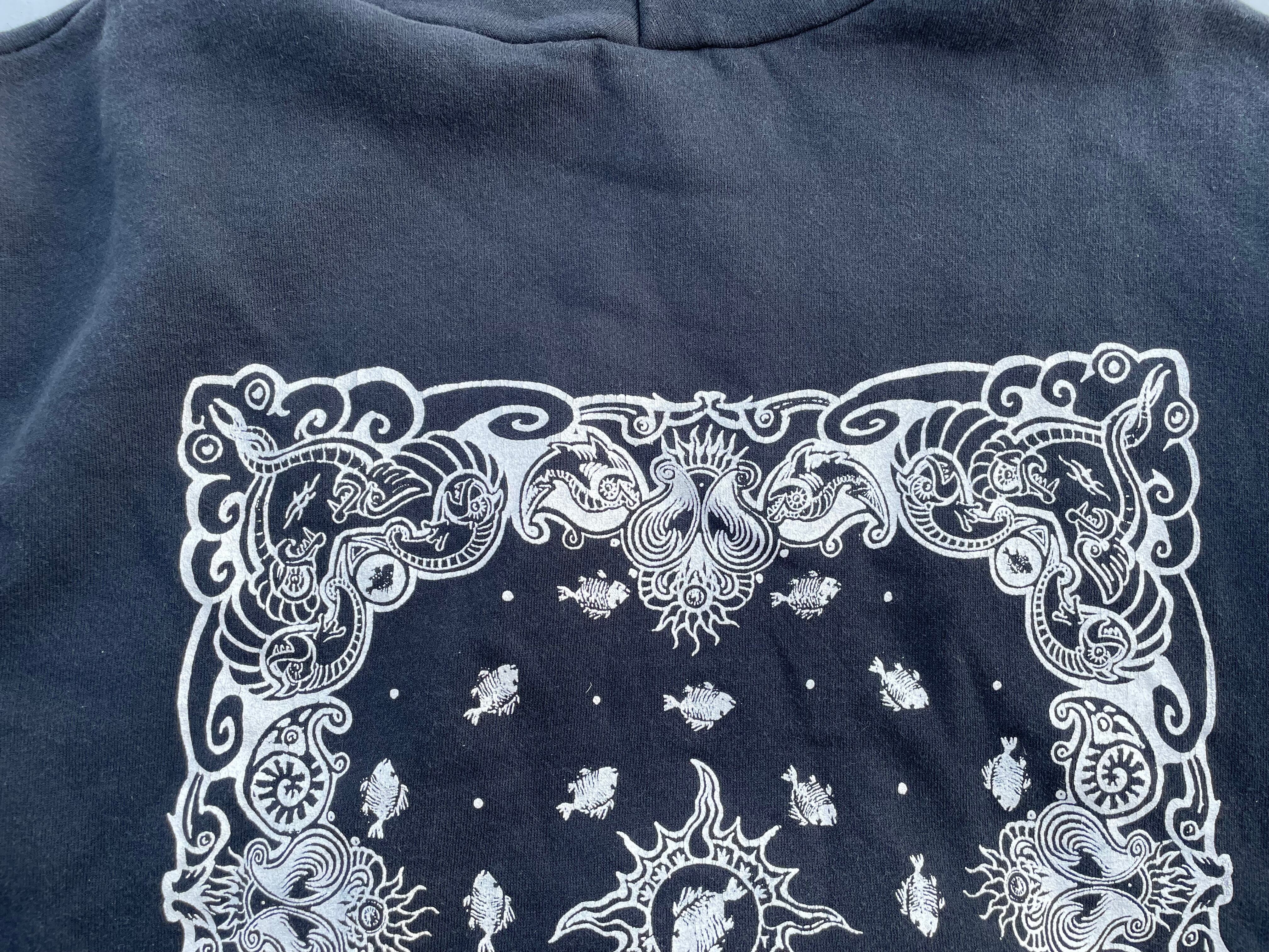 【商品詳細】ブロンズエイジのプルオーバーパーカー。カラーはブラック。サイズはXL。90年代頃USA製。ブロンズエイジのアイコンとなっているフィッシュプリントをペイズリーパターンにした1着。存在感のある大判プリントの為、これ1着で決まるかと。サイズも大きめで需要高めの個体だと思います。