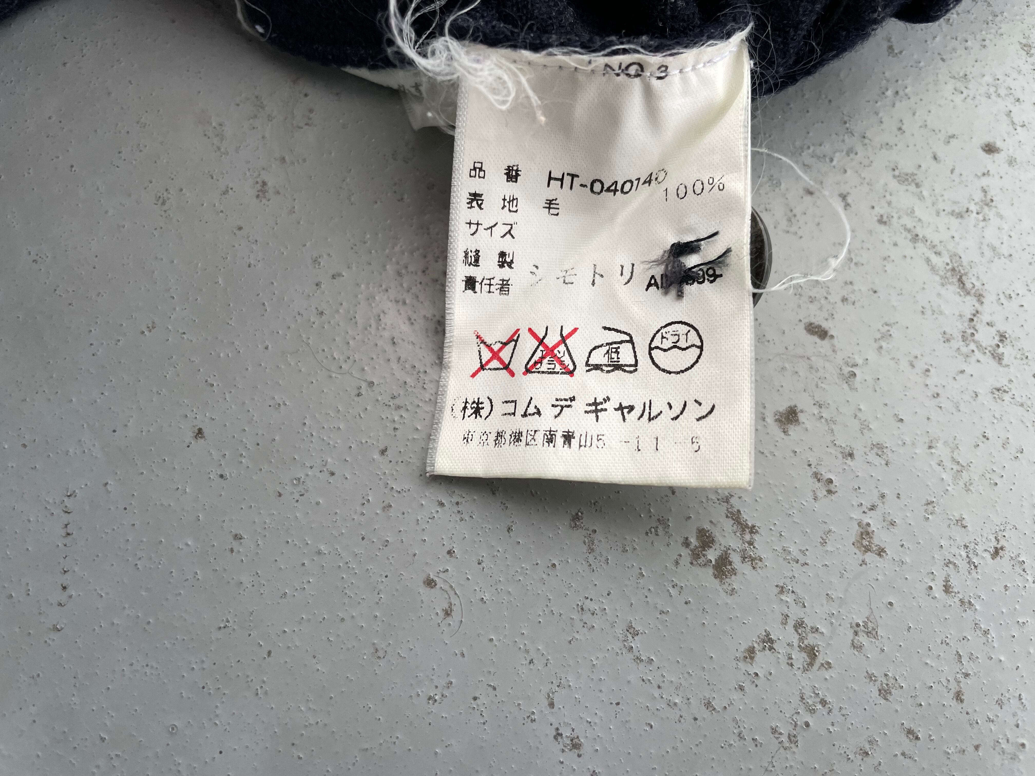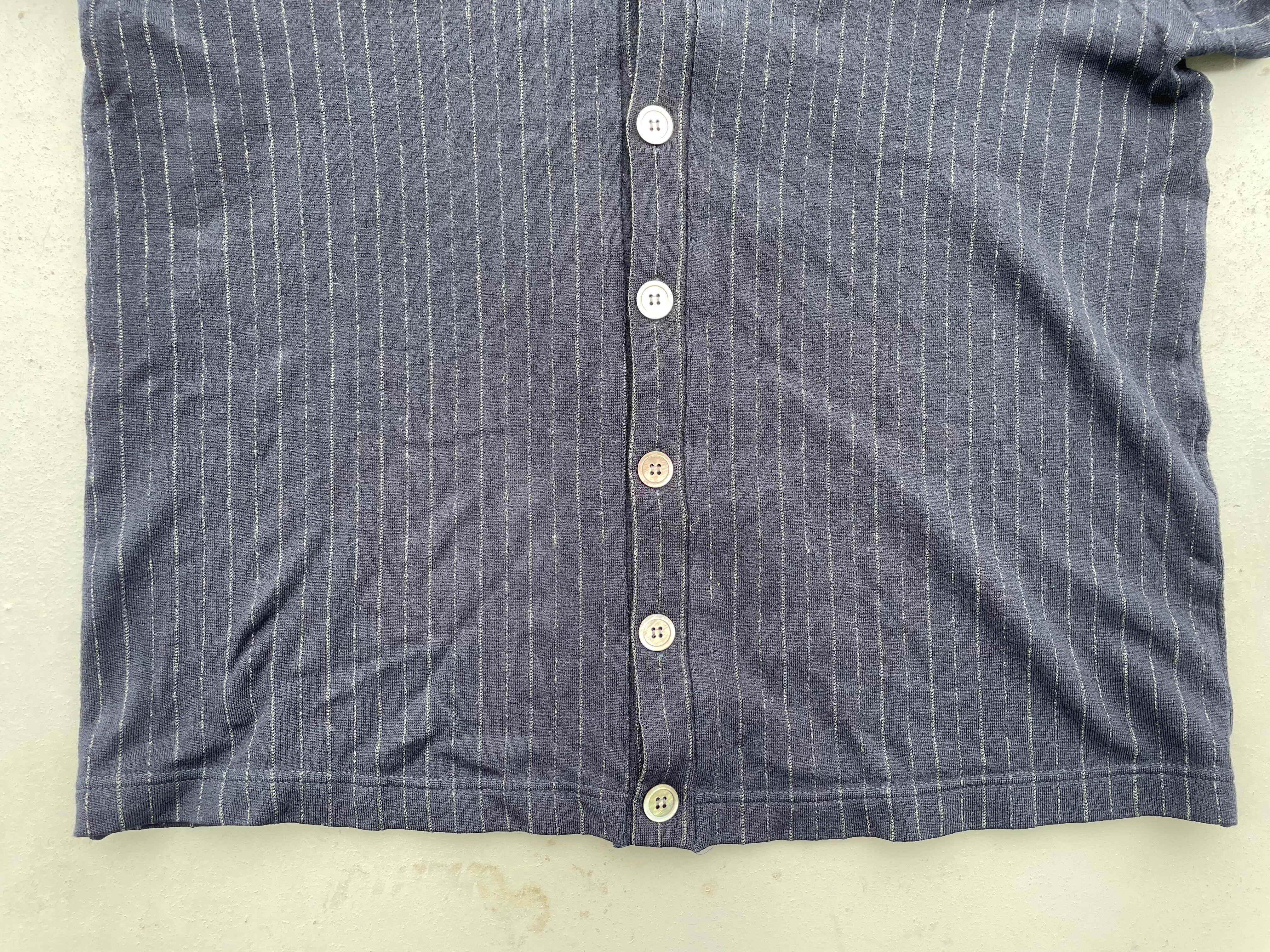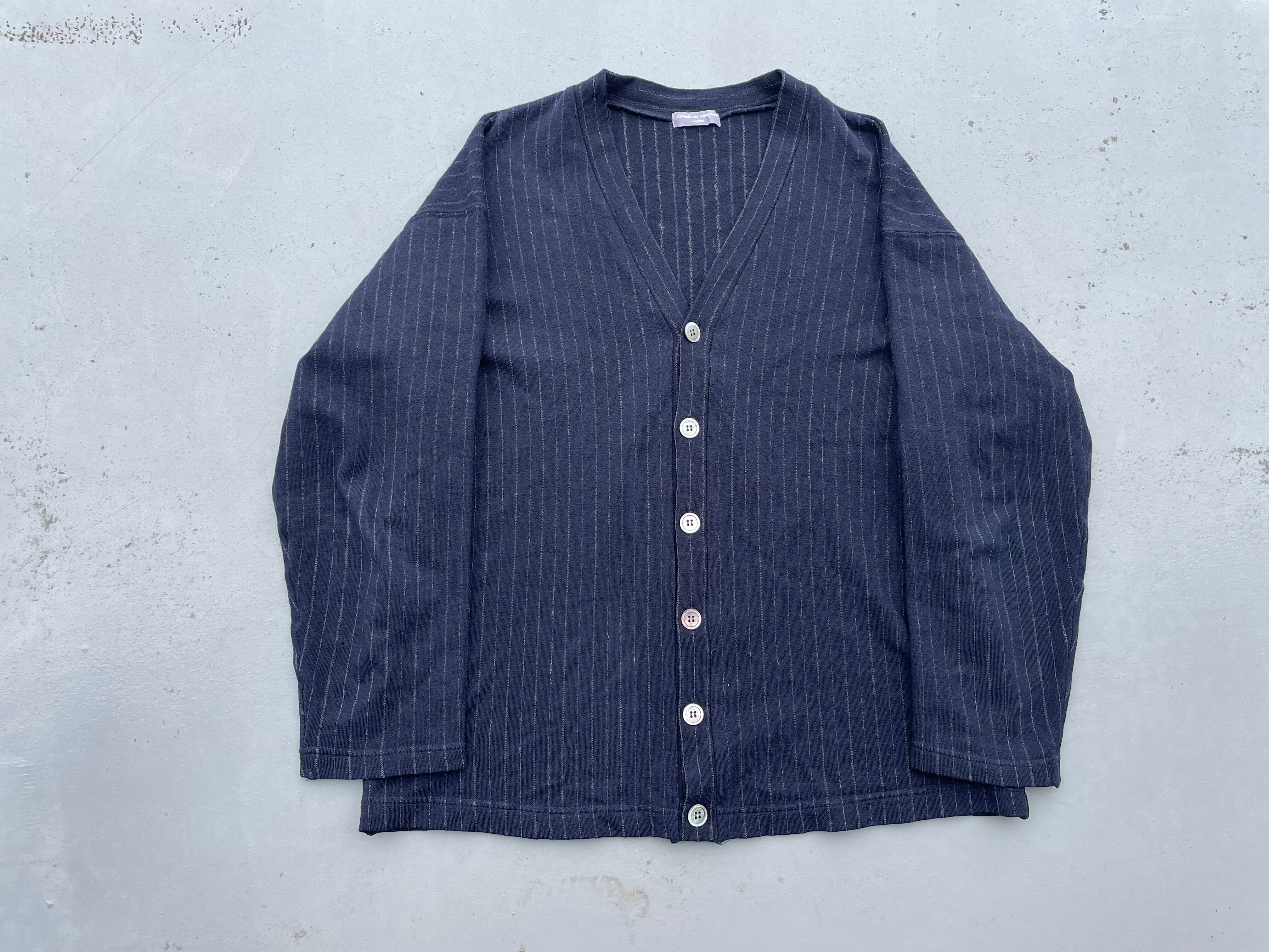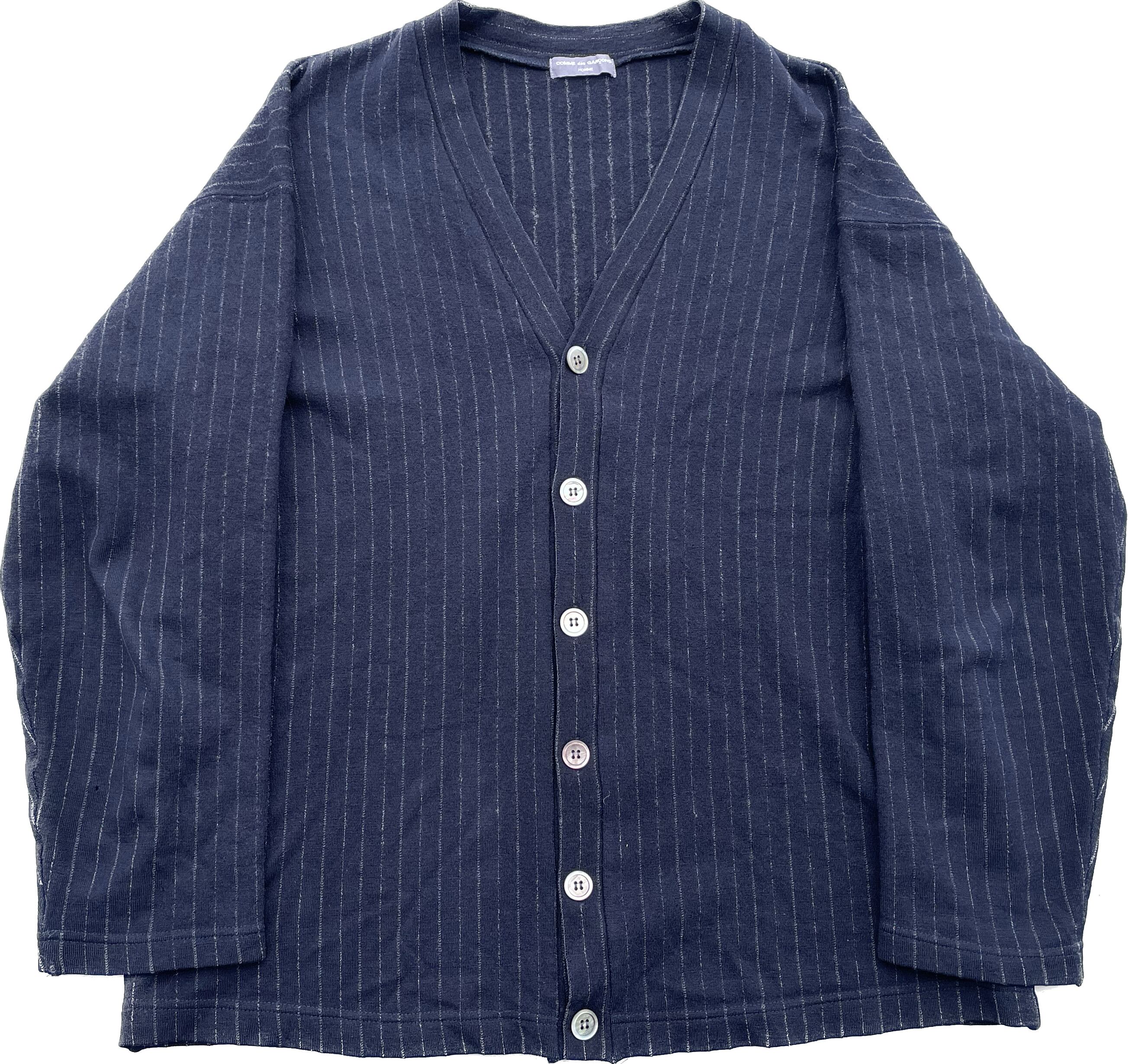 【商品詳細】コムデギャルソンオムのウールチョークストライプカーディガン。サイズはフリー。カラーはネイビーボディにホワイトストライプ。99年日本製。大人なチョークストライプパターンのカーディガン。オムらしいありそうで無いデザイン。肩幅・身幅も比較的大きめでゆったり着用いただけるかと。右袖に小穴ありますが言われないと分からない程度だと思います。まだまだ寒いのでバッグインして持ち歩くのも良いですね。