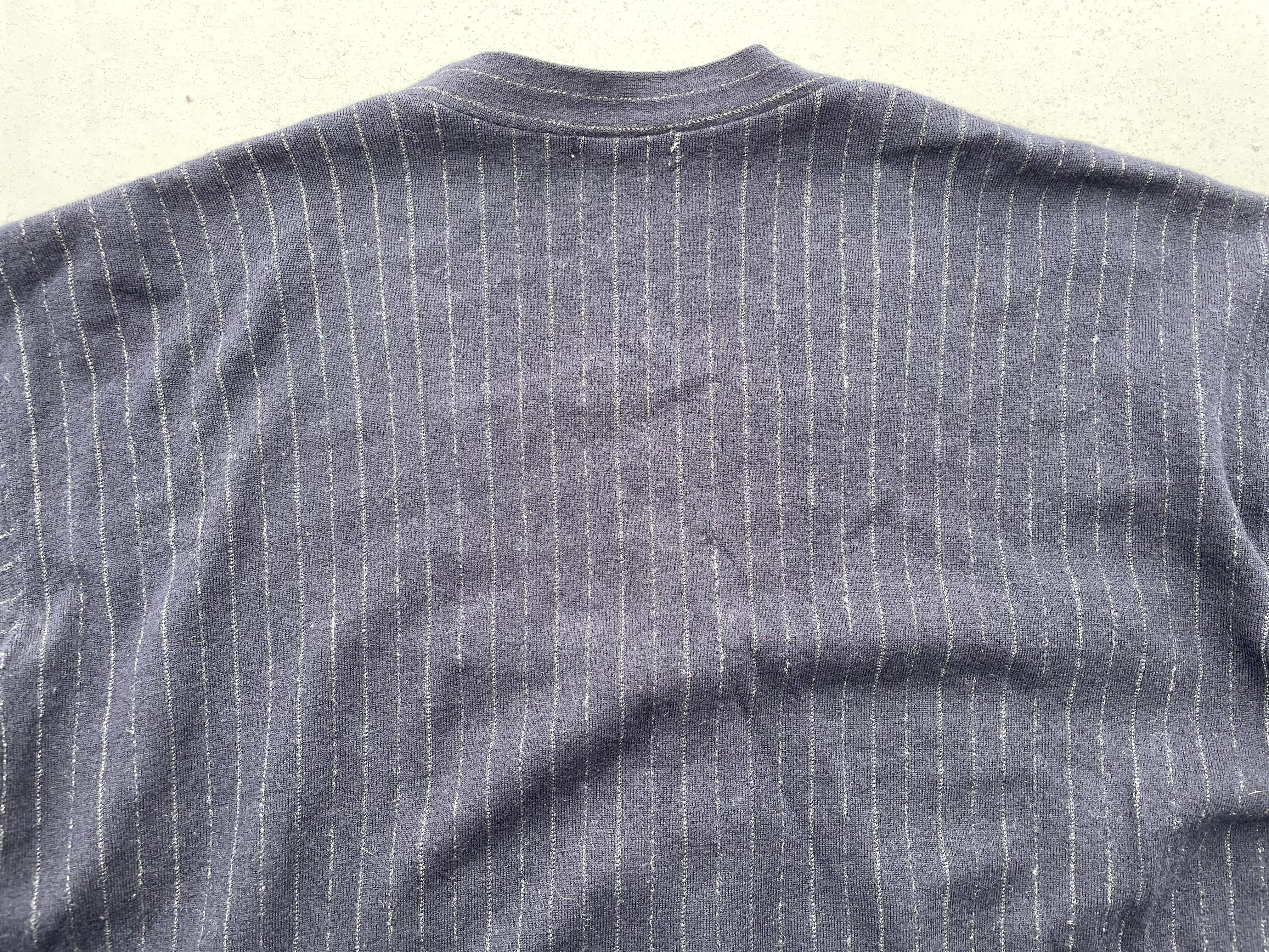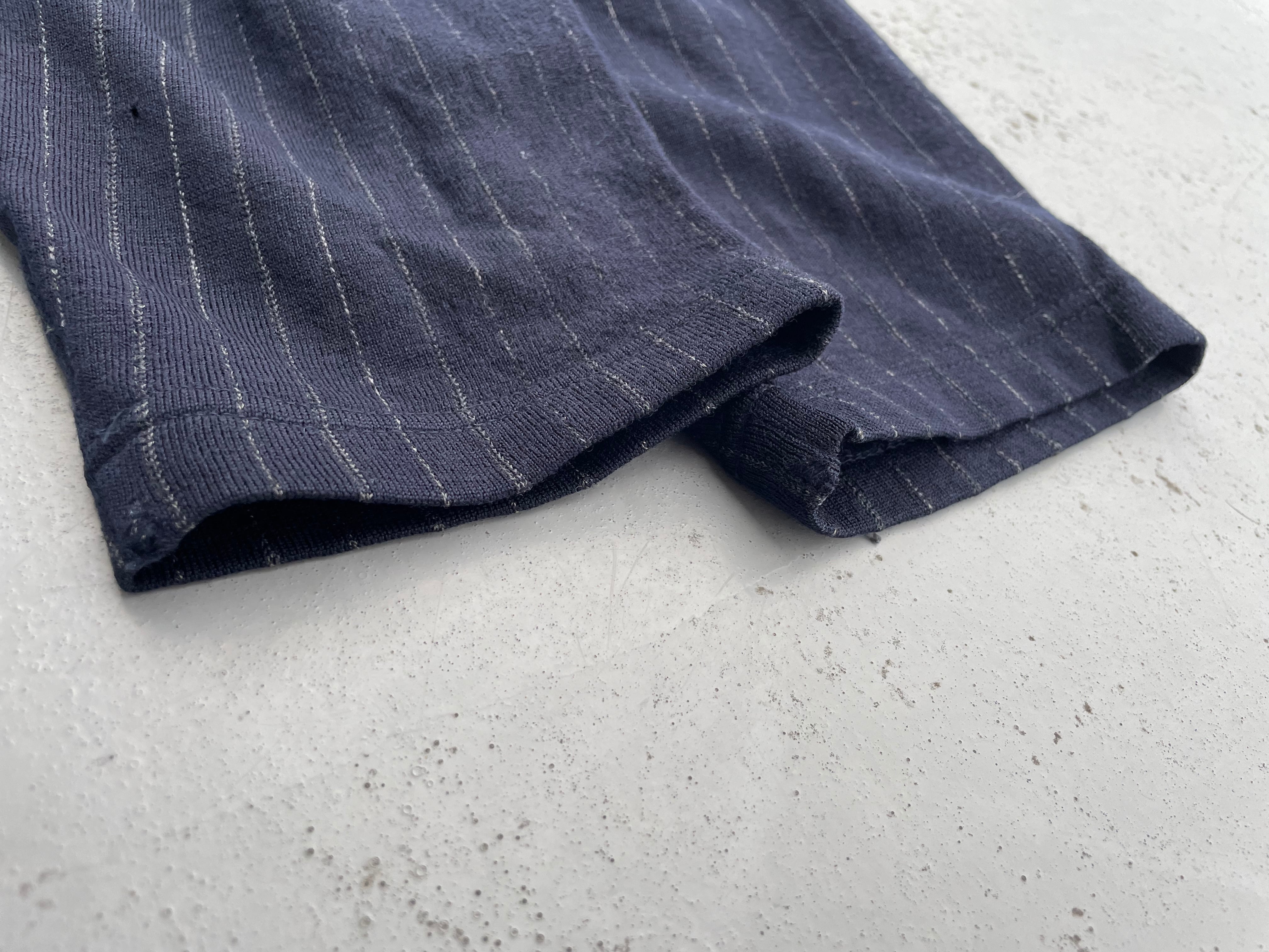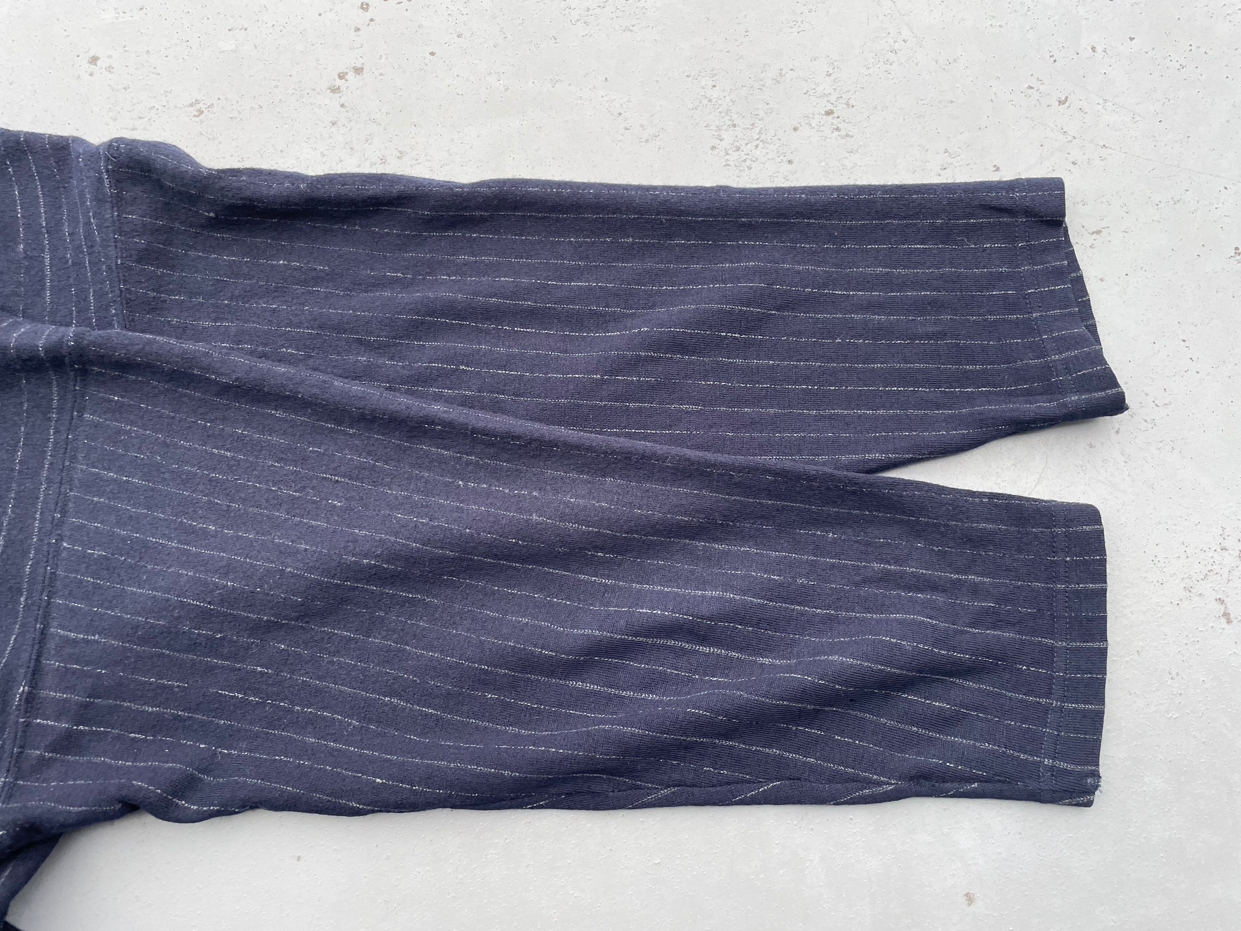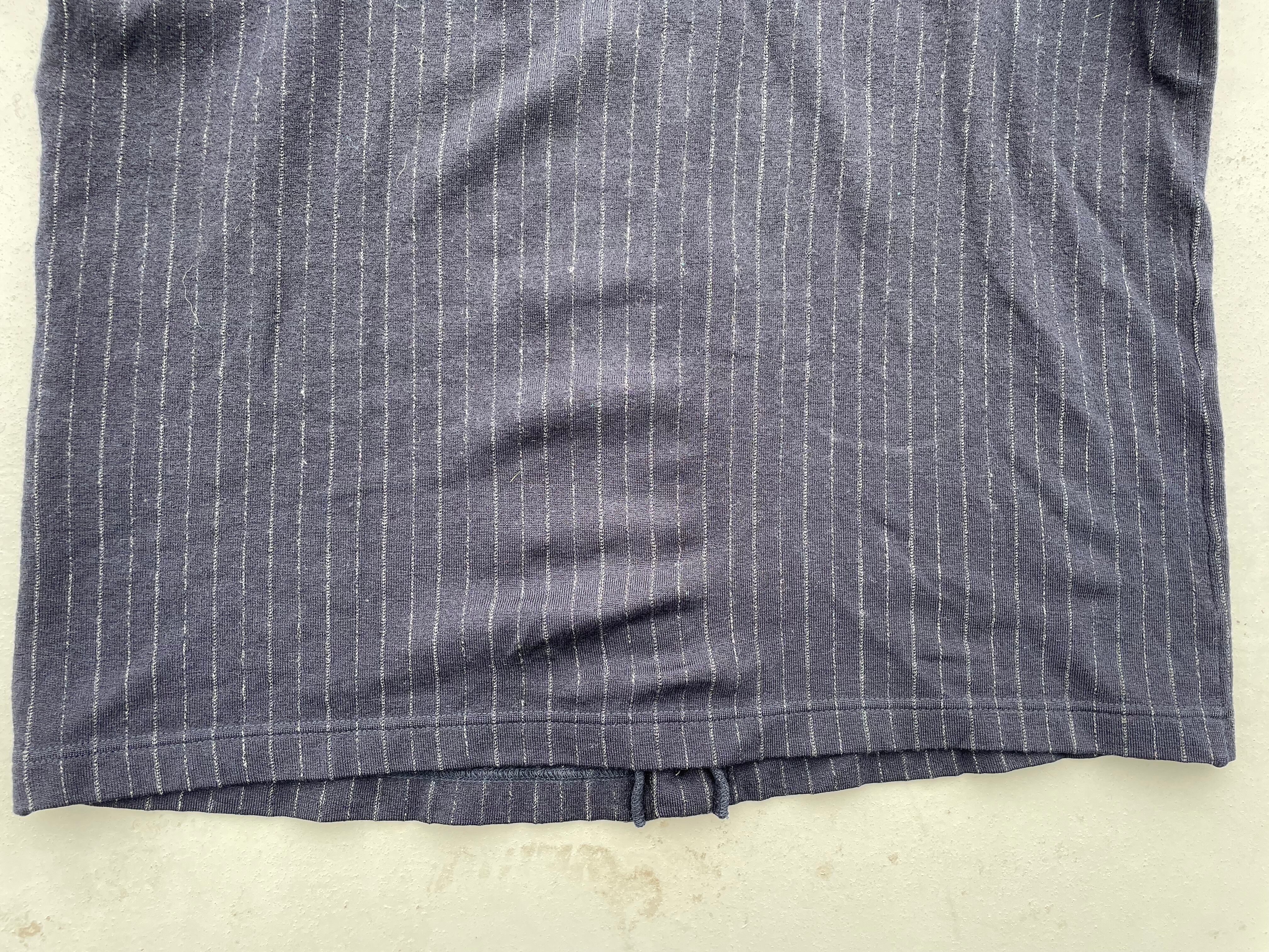 【商品詳細】コムデギャルソンオムのウールチョークストライプカーディガン。サイズはフリー。カラーはネイビーボディにホワイトストライプ。99年日本製。大人なチョークストライプパターンのカーディガン。オムらしいありそうで無いデザイン。肩幅・身幅も比較的大きめでゆったり着用いただけるかと。右袖に小穴ありますが言われないと分からない程度だと思います。まだまだ寒いのでバッグインして持ち歩くのも良いですね。