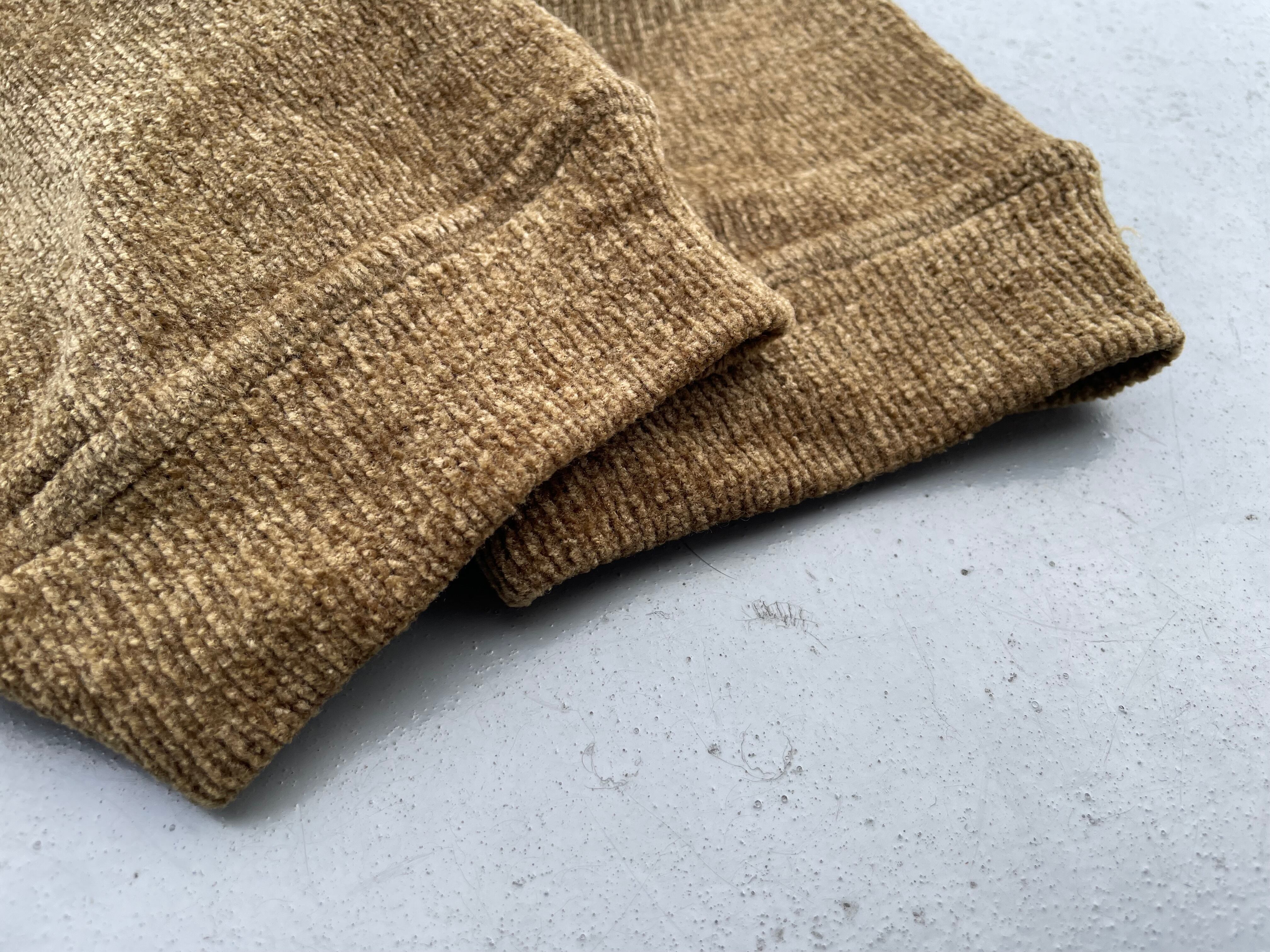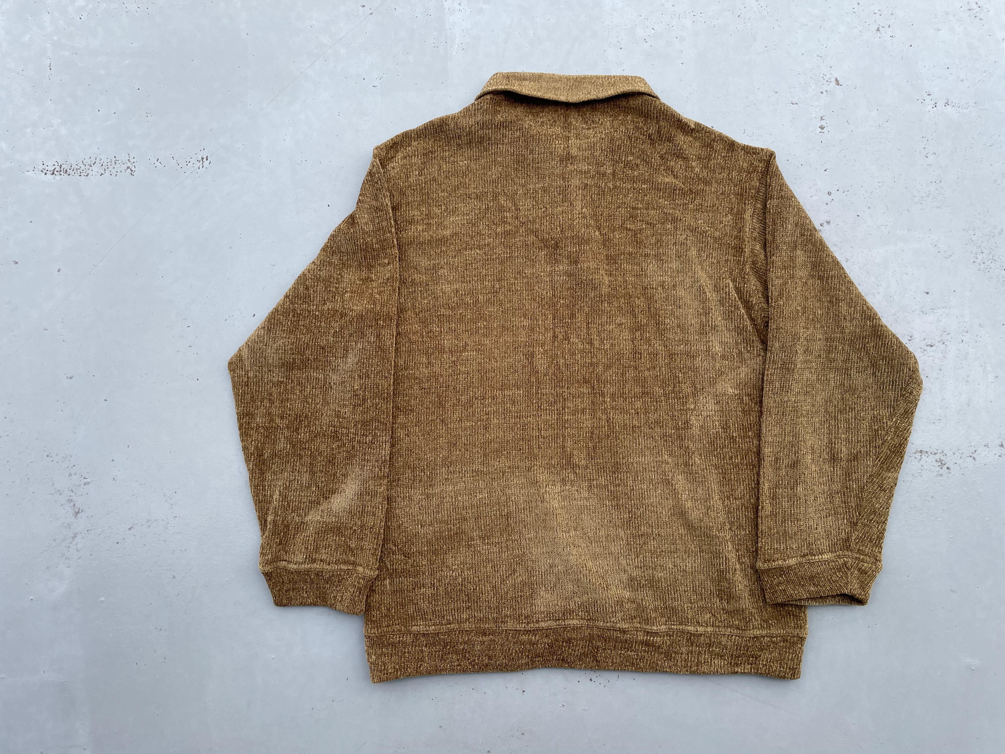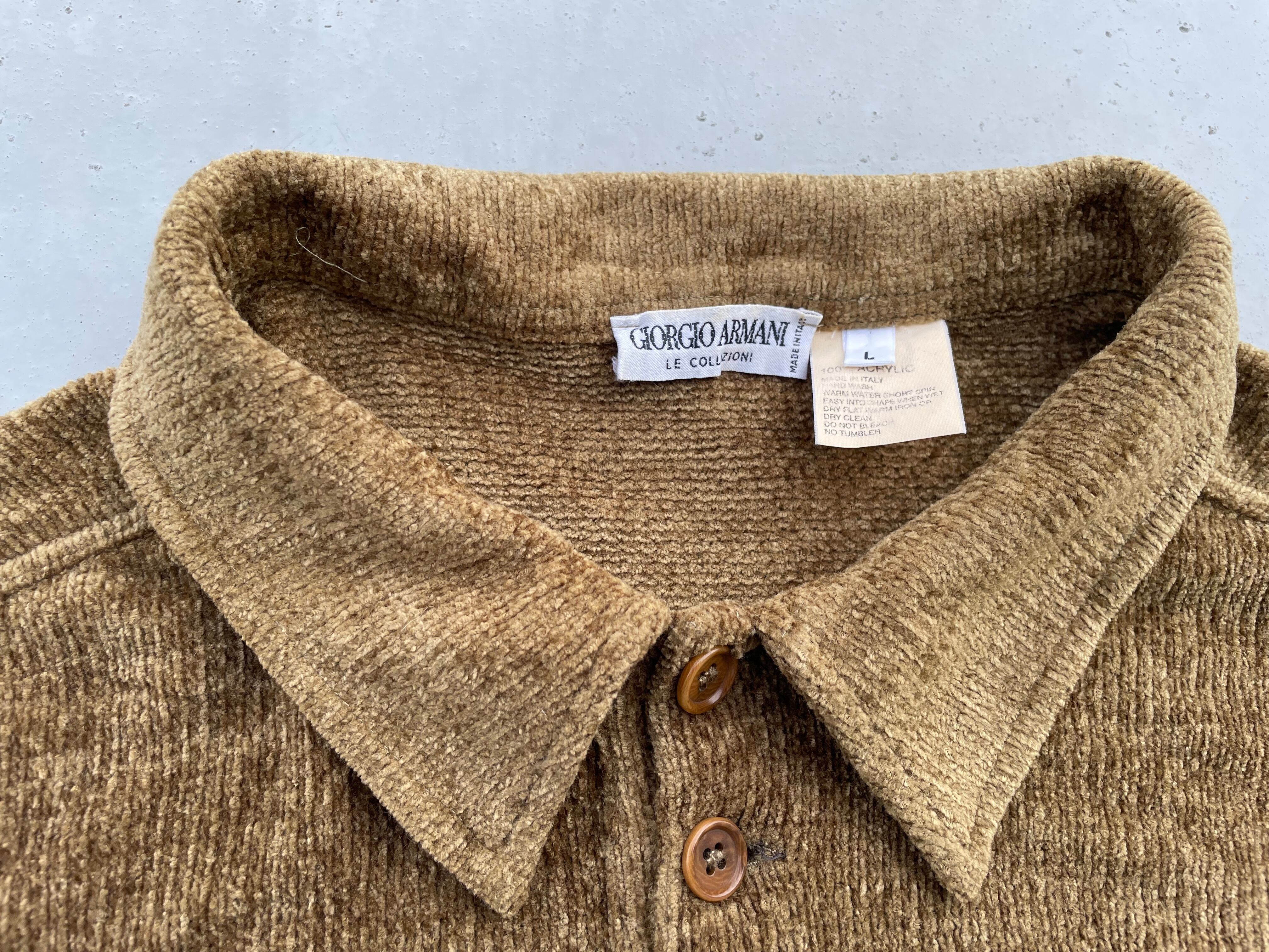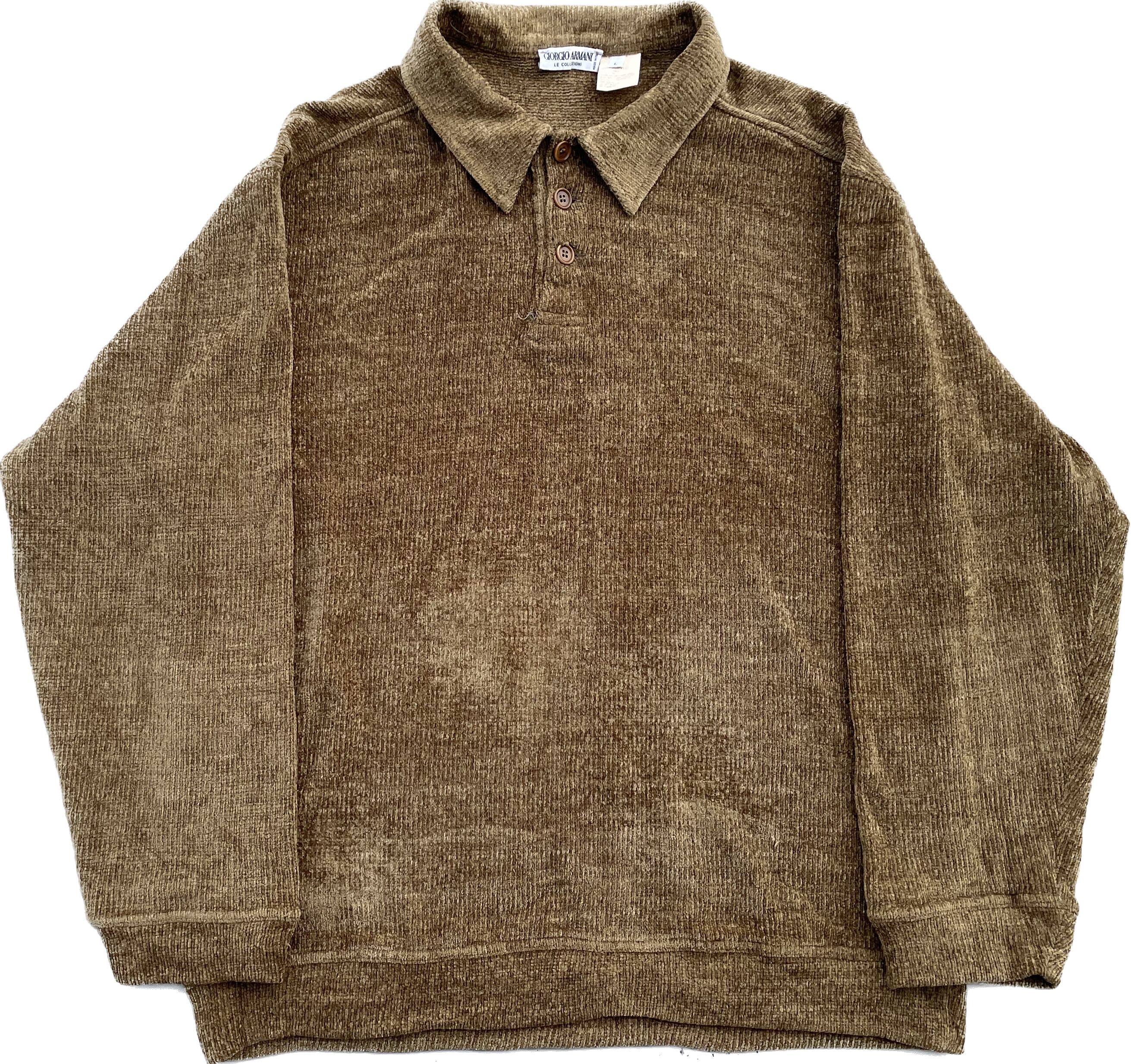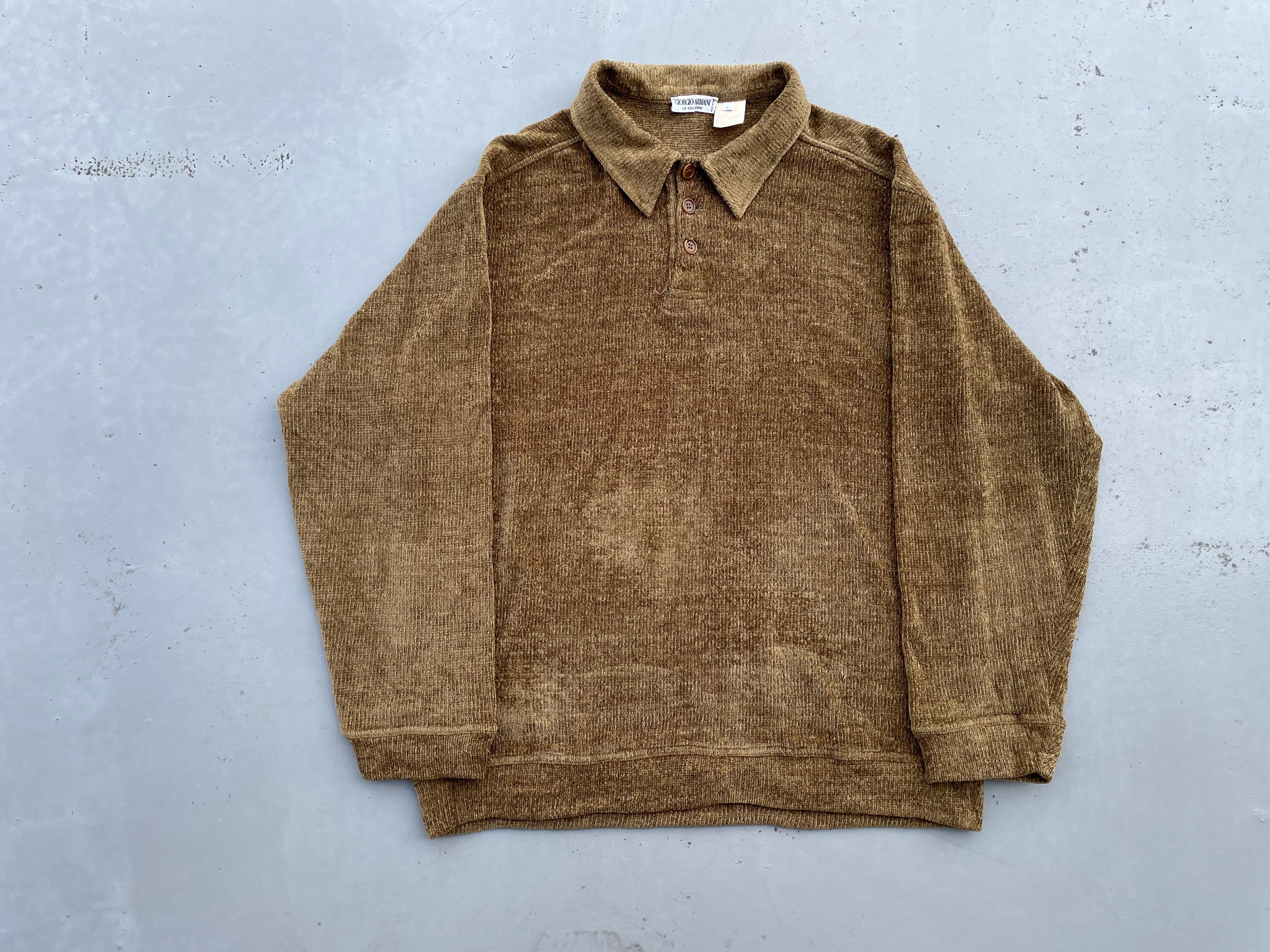【商品詳細】ジョルジオアルマーニのプルオーバーニットポロシャツ。サイズはL。カラーはシャンパンゴールドを思わせるイエロー味のあるブラウン。80-90年代頃イタリア製。アクリル地の編みの表情が良い雰囲気を醸し出している1着。ゴールドと言っても良い好カラーで派手すぎないのにどこか存在感あります。ふわっと触り心地の良いアクリル地でこれからの季節重宝しそうです。個人的にこれは欲しいです。