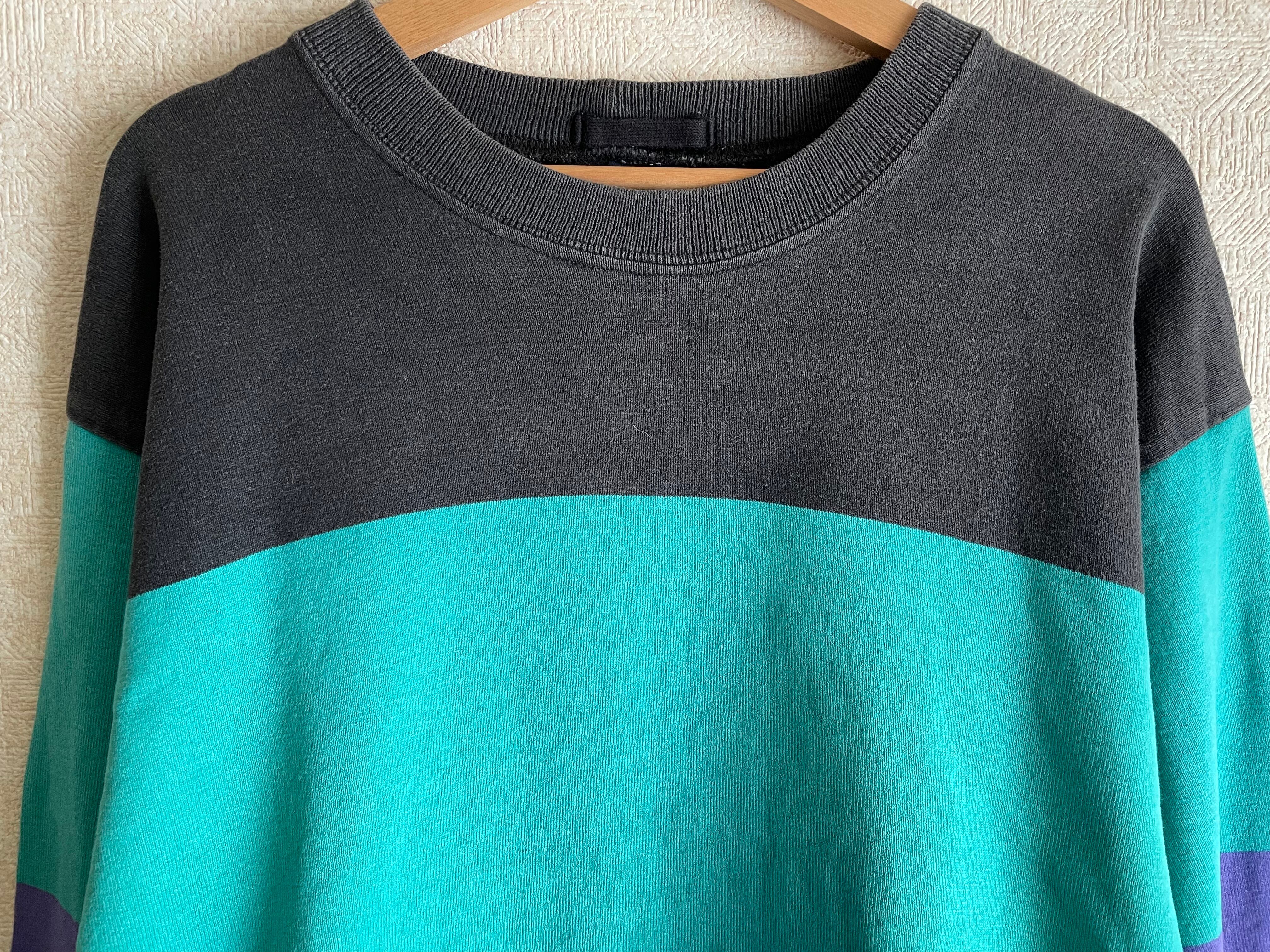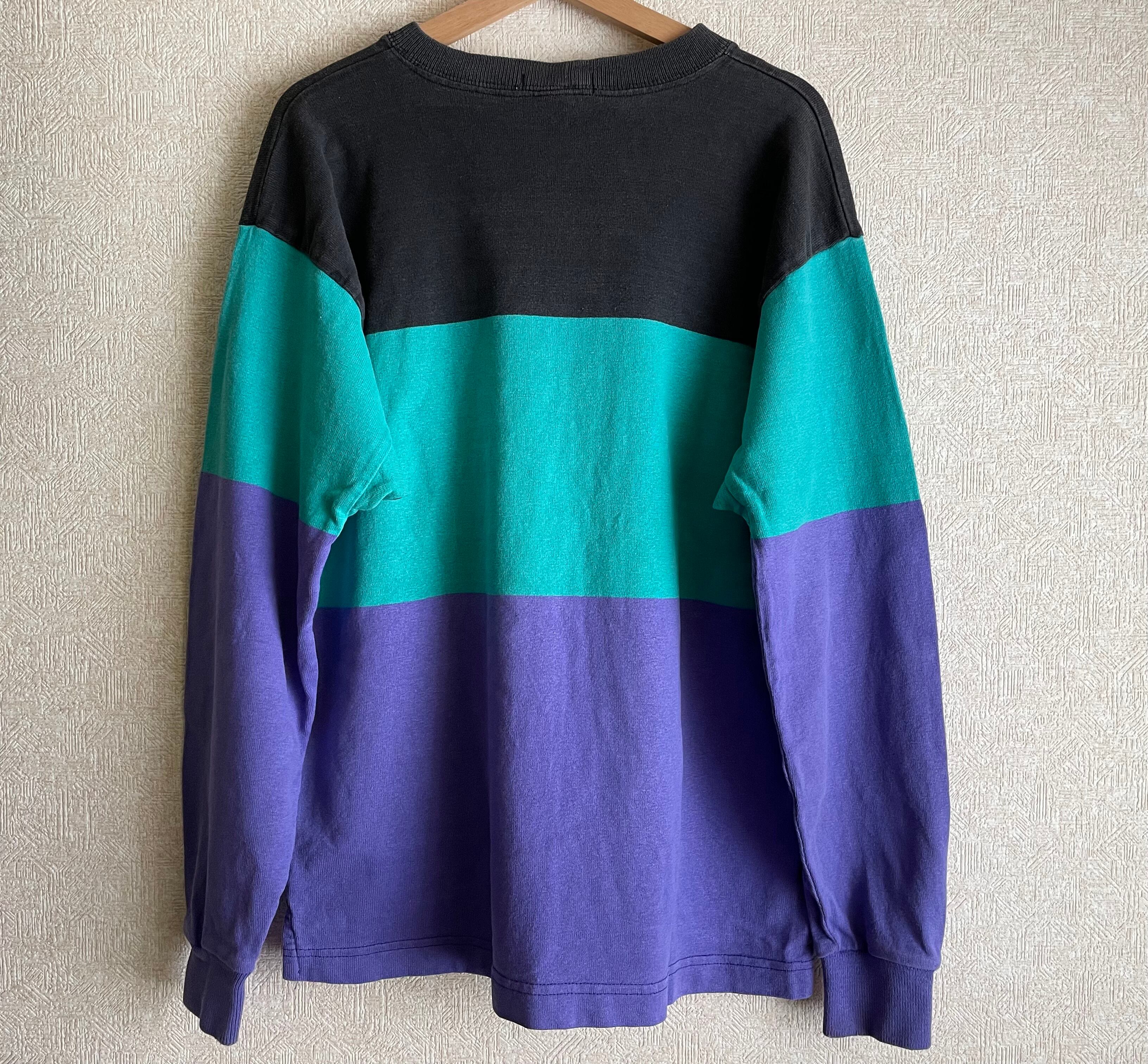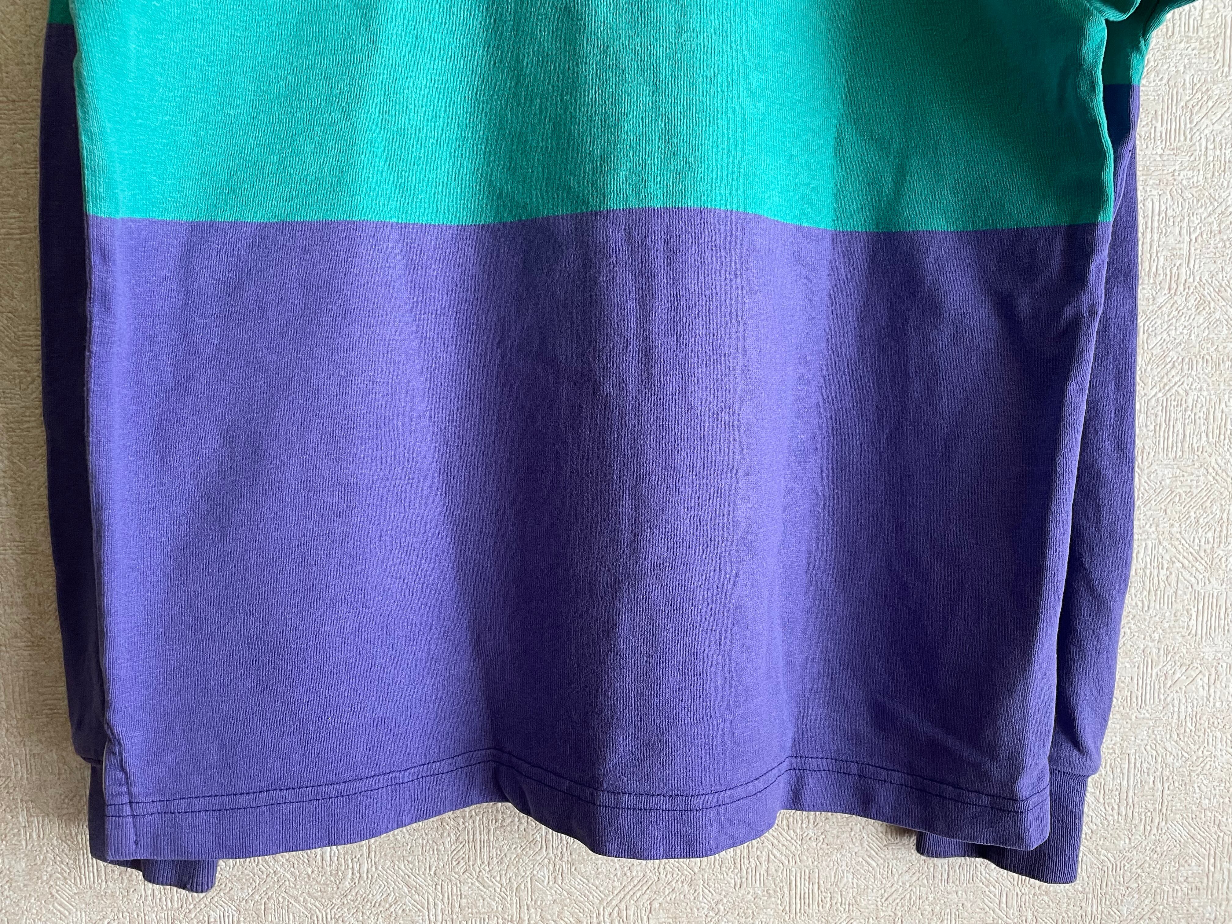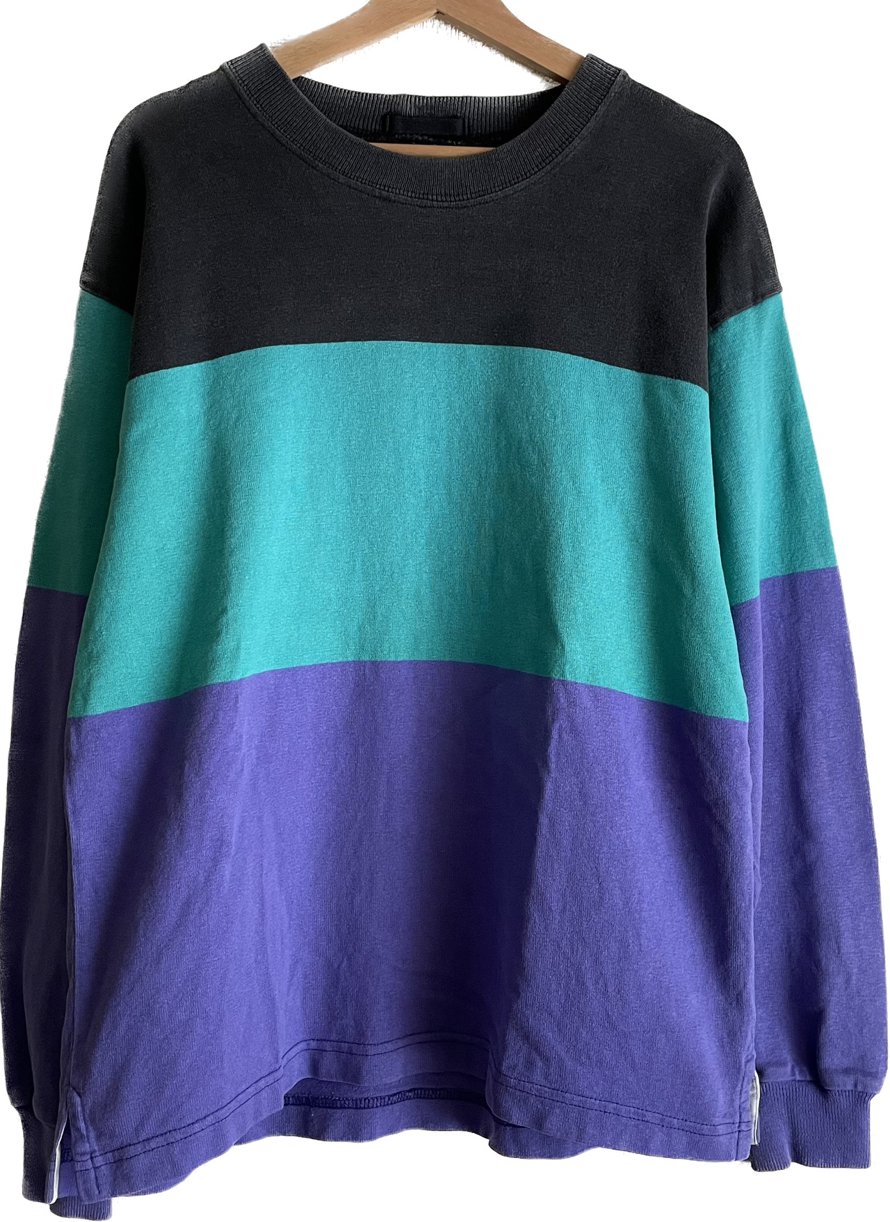 【商品詳細】ランズエンドのマルチボーダースウェットシャツ。サイズはM。カラーはパープル×ターコイズ×ブラックのマルチボーダー仕様。90年代頃USA製。太いピッチのボーダーで存在感あります。悪めなカラーリングが目を惹きます。Mサイズですが大きめ。