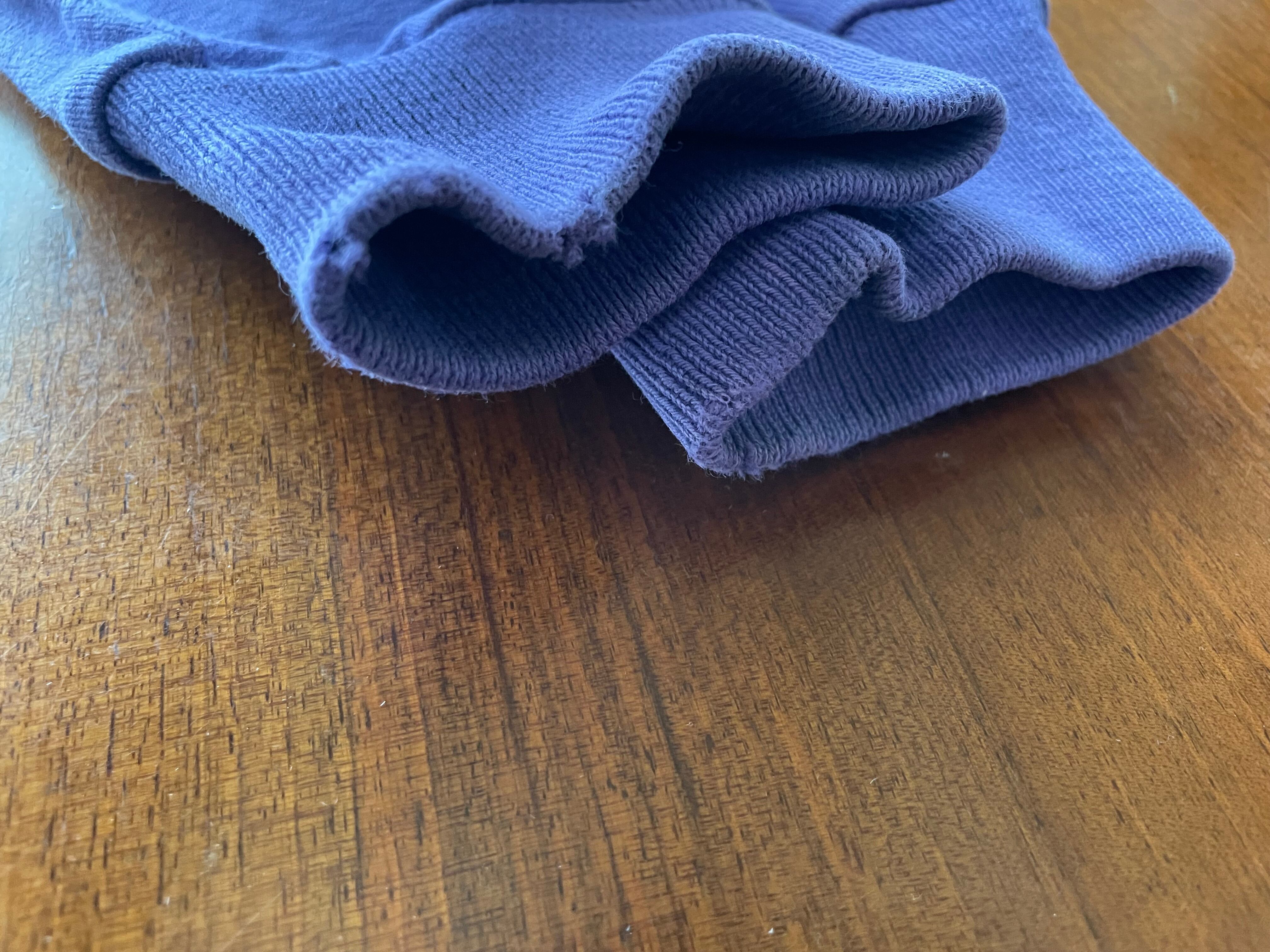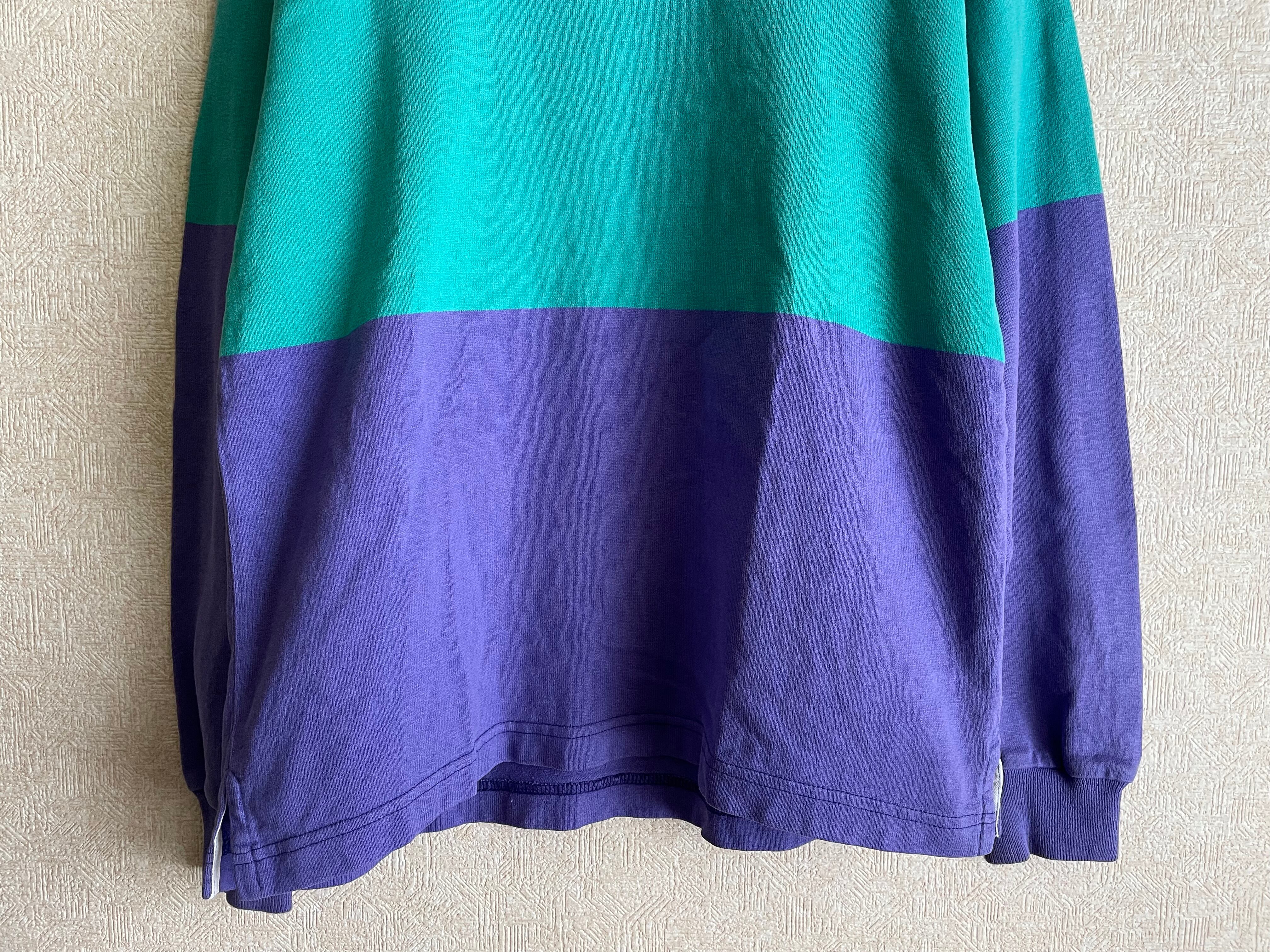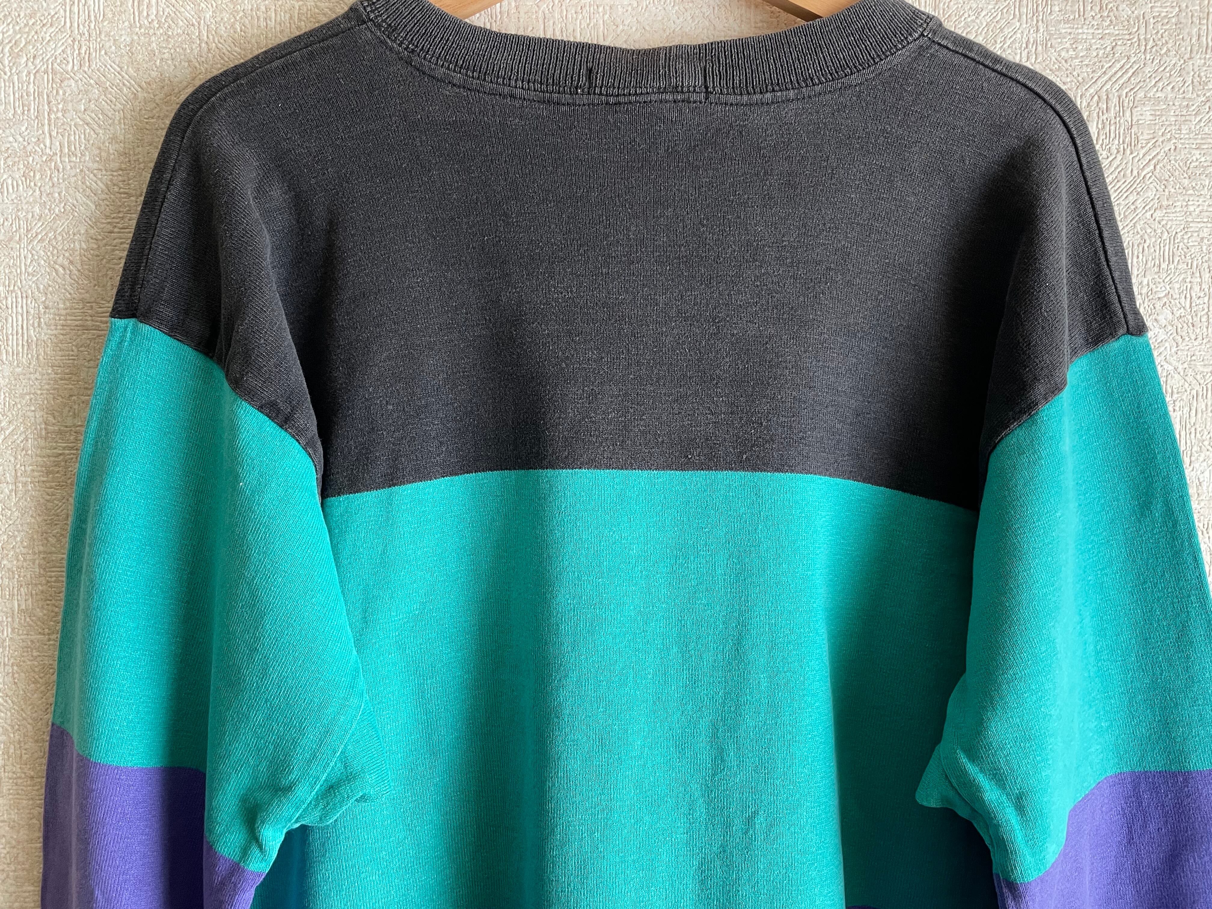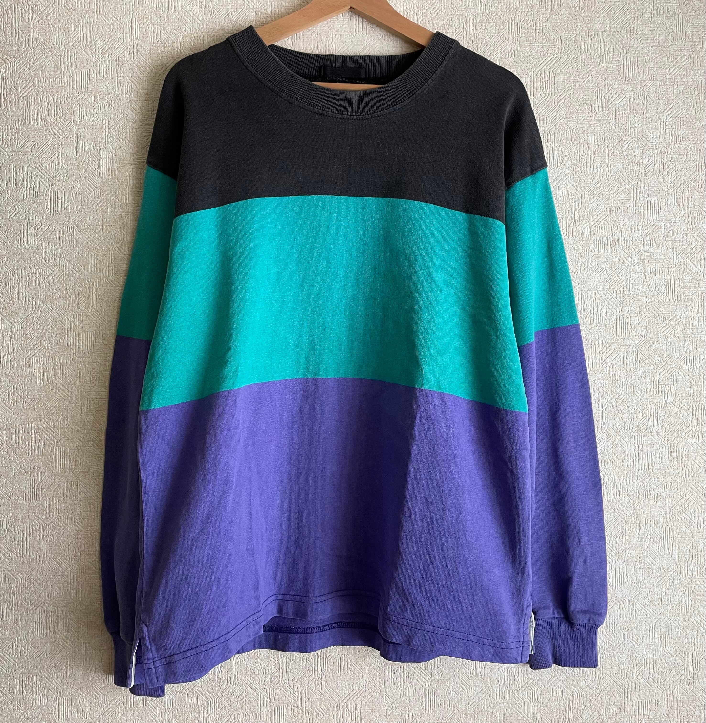 【商品詳細】ランズエンドのマルチボーダースウェットシャツ。サイズはM。カラーはパープル×ターコイズ×ブラックのマルチボーダー仕様。90年代頃USA製。太いピッチのボーダーで存在感あります。悪めなカラーリングが目を惹きます。Mサイズですが大きめ。