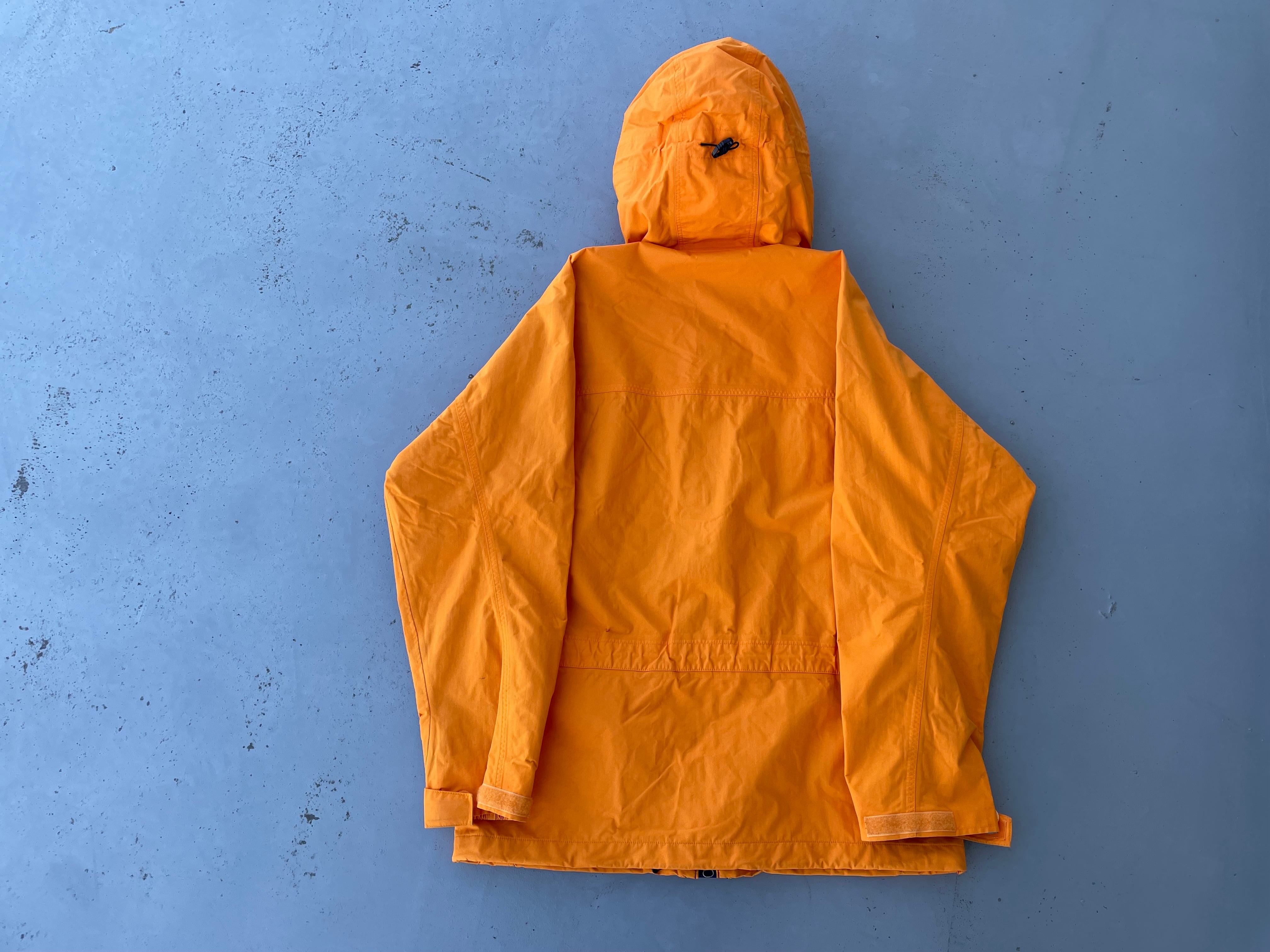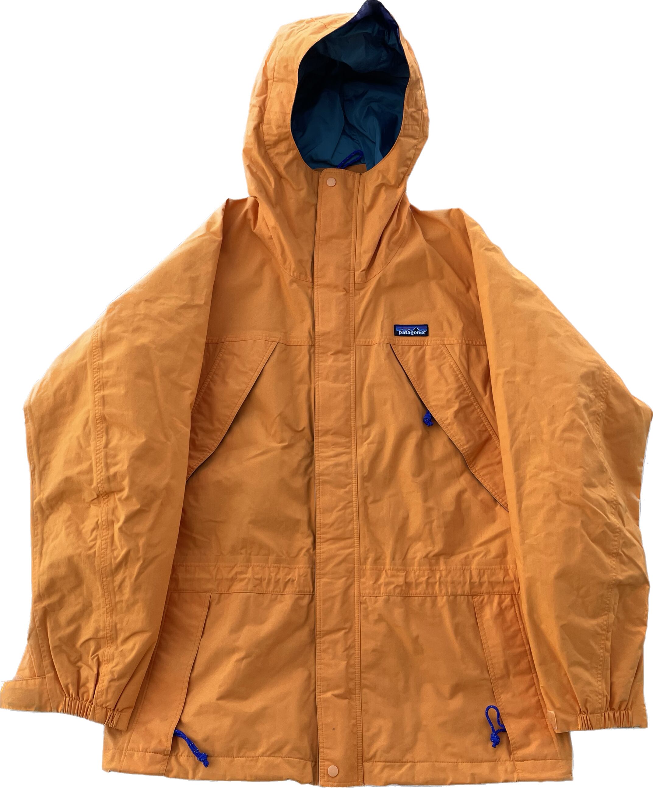 【商品詳細】パタゴニアのストームジャケット。サイズはS。カラーはオレンジベースのマンゴー。96年中国製。パタゴニア定番マウテンパーカーのストームジャケット。こちらはその中でも人気カラーのマンゴー。発色の良いオレンジカラーが目を惹きます。ライニングカラーも手が凝ってますね。現状コーティングがポロポロ落ちてきておらず、しっかり前線で活躍する個体かと。サイズSですが実寸の通り大きめ。