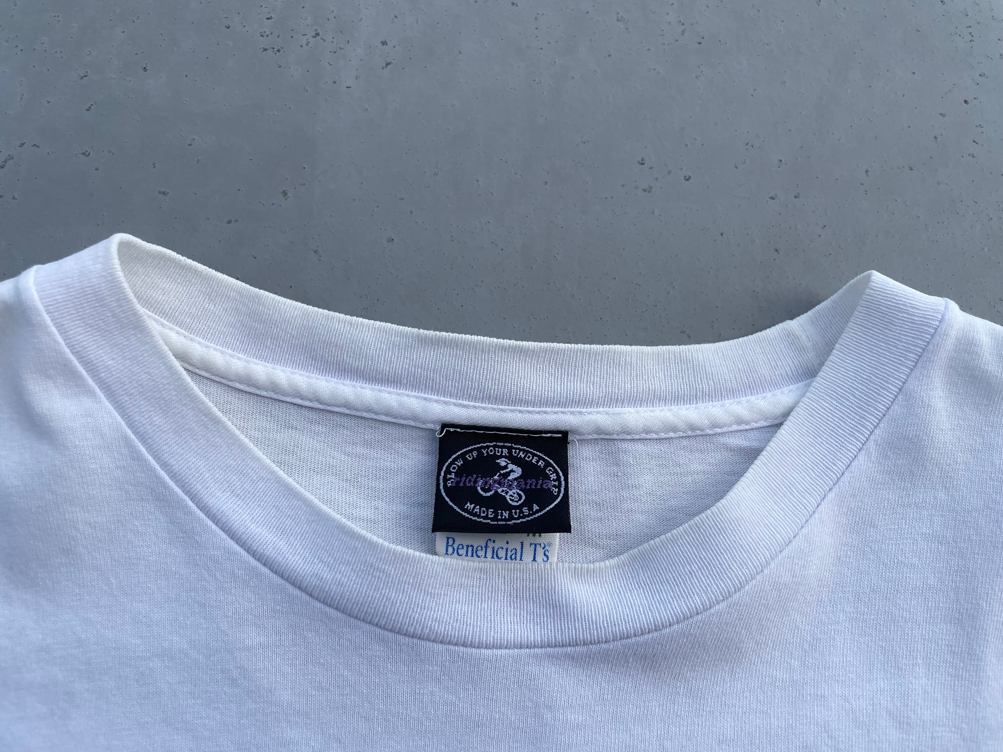 【商品詳細】ライディングマニア半袖Tシャツ。サイズはM。カラーはホワイト。90年代USA製。袖・裾ダブルステッチ。Beneficial T’sボディ。どこかパタゴニアのロゴを感じる所謂パロディプリント。横に寝そべる女性を山脈に重ねた秀逸デザイン。同デザインですとライディングマンと言われる自転車を漕ぐキャラクターがプリントされた個体が多いですがこちらは珍しい不在パターンのデザイン。メッセージ等は置いておいてシンプルにかっこいい1着だと思います。右肩付近に小穴ありますがあまり気にならないと思います。白タグBeneficial T’sボディは大きめの作りが多くこちらも大きめサイズです。