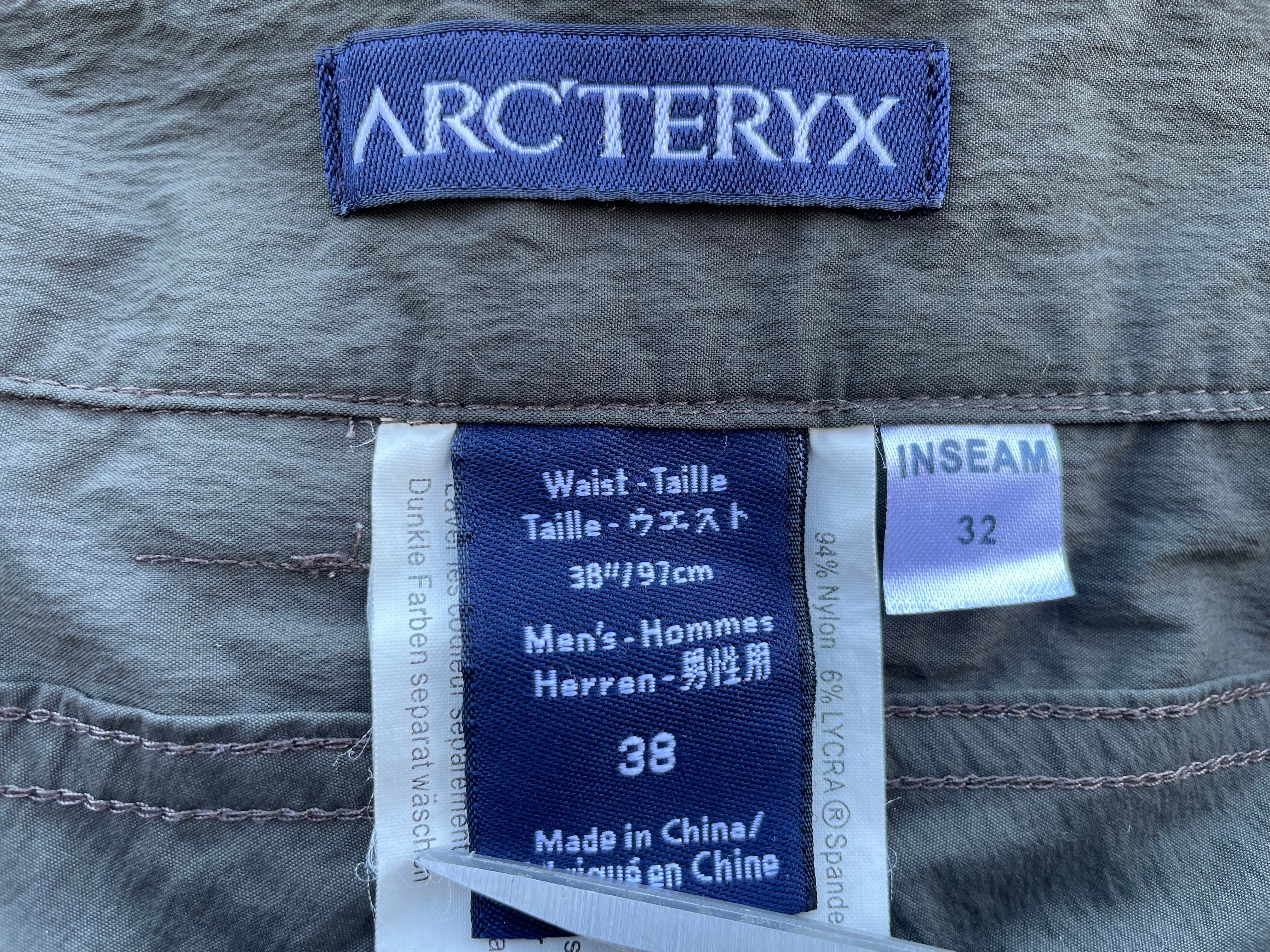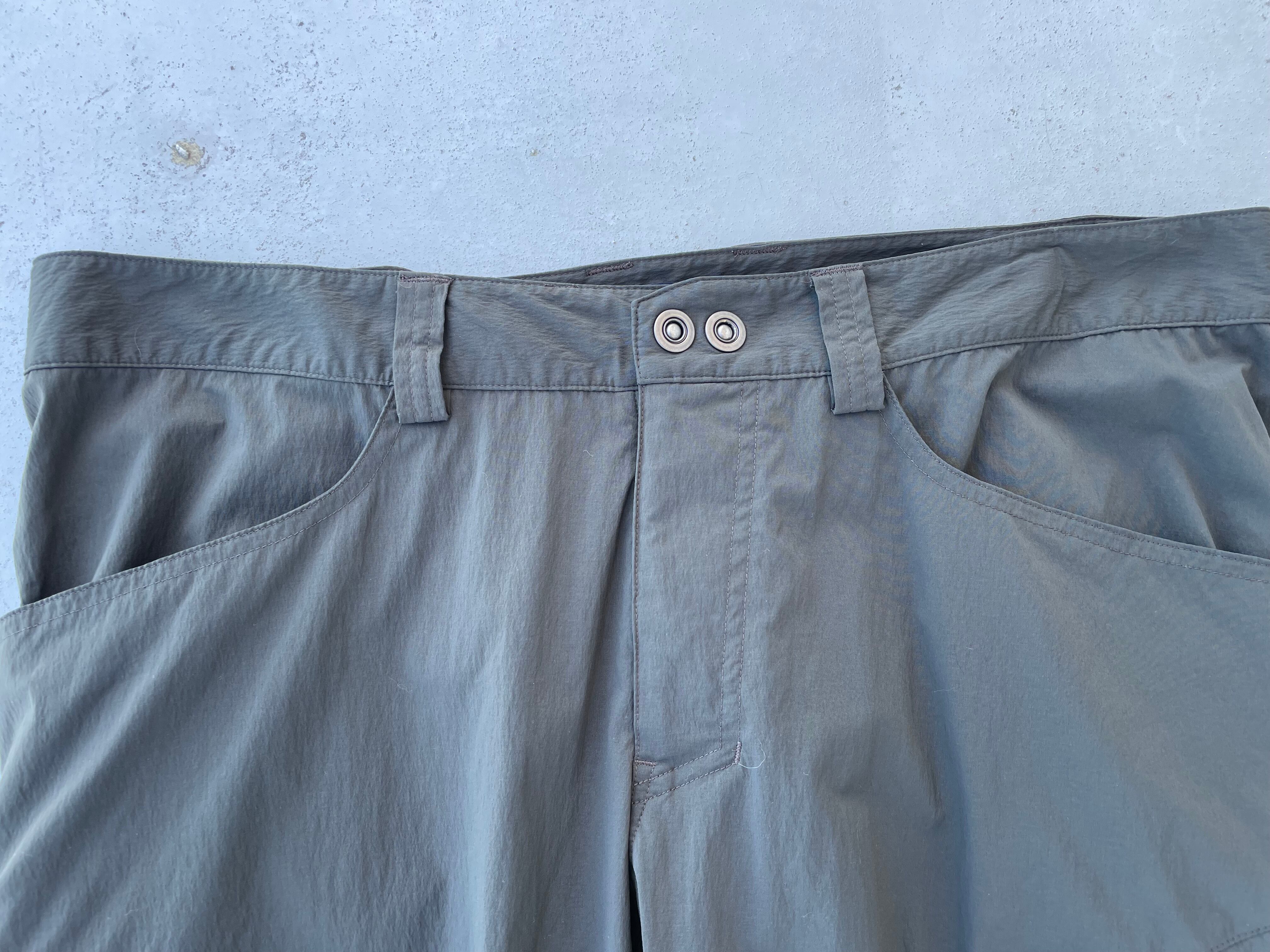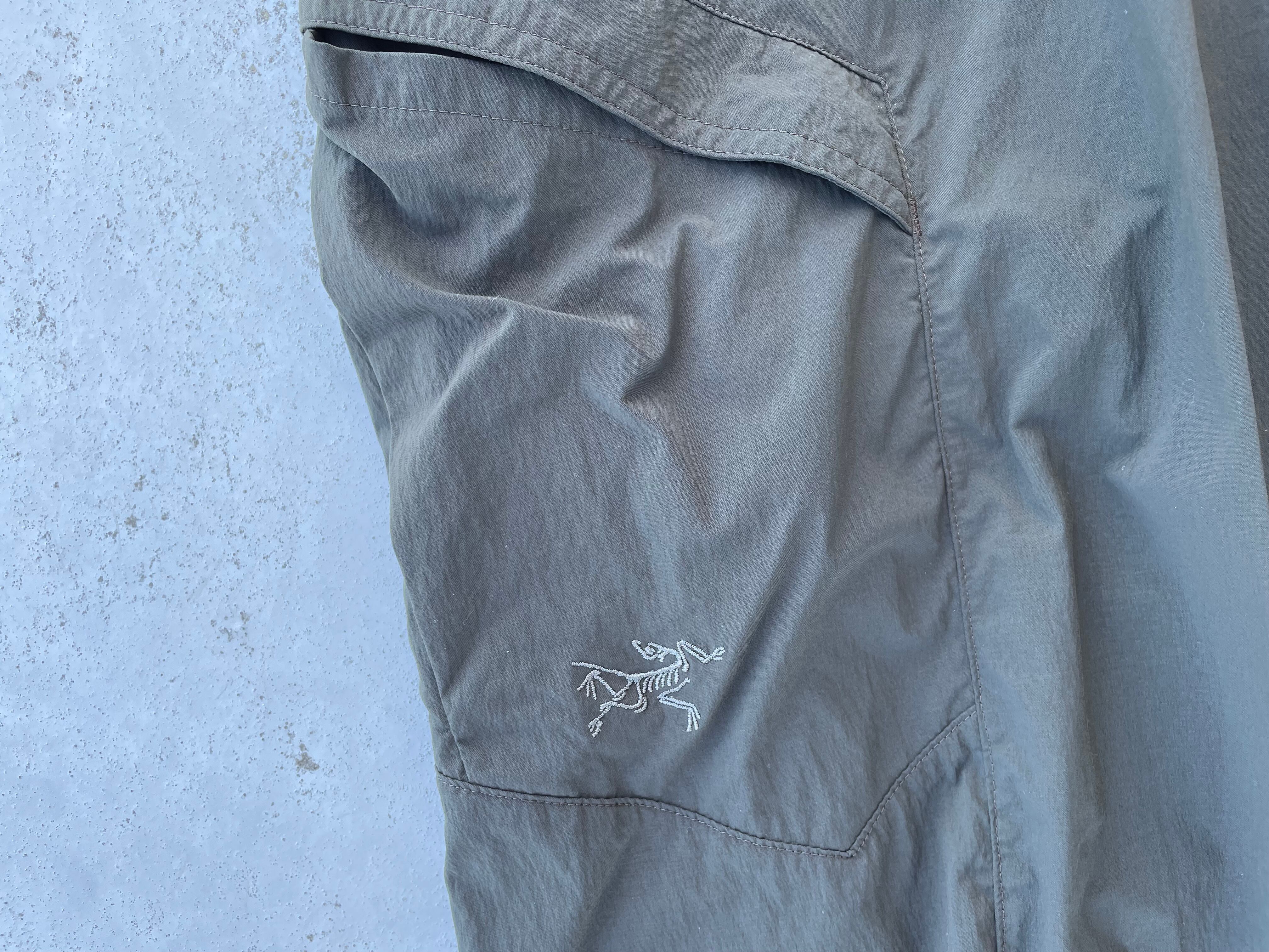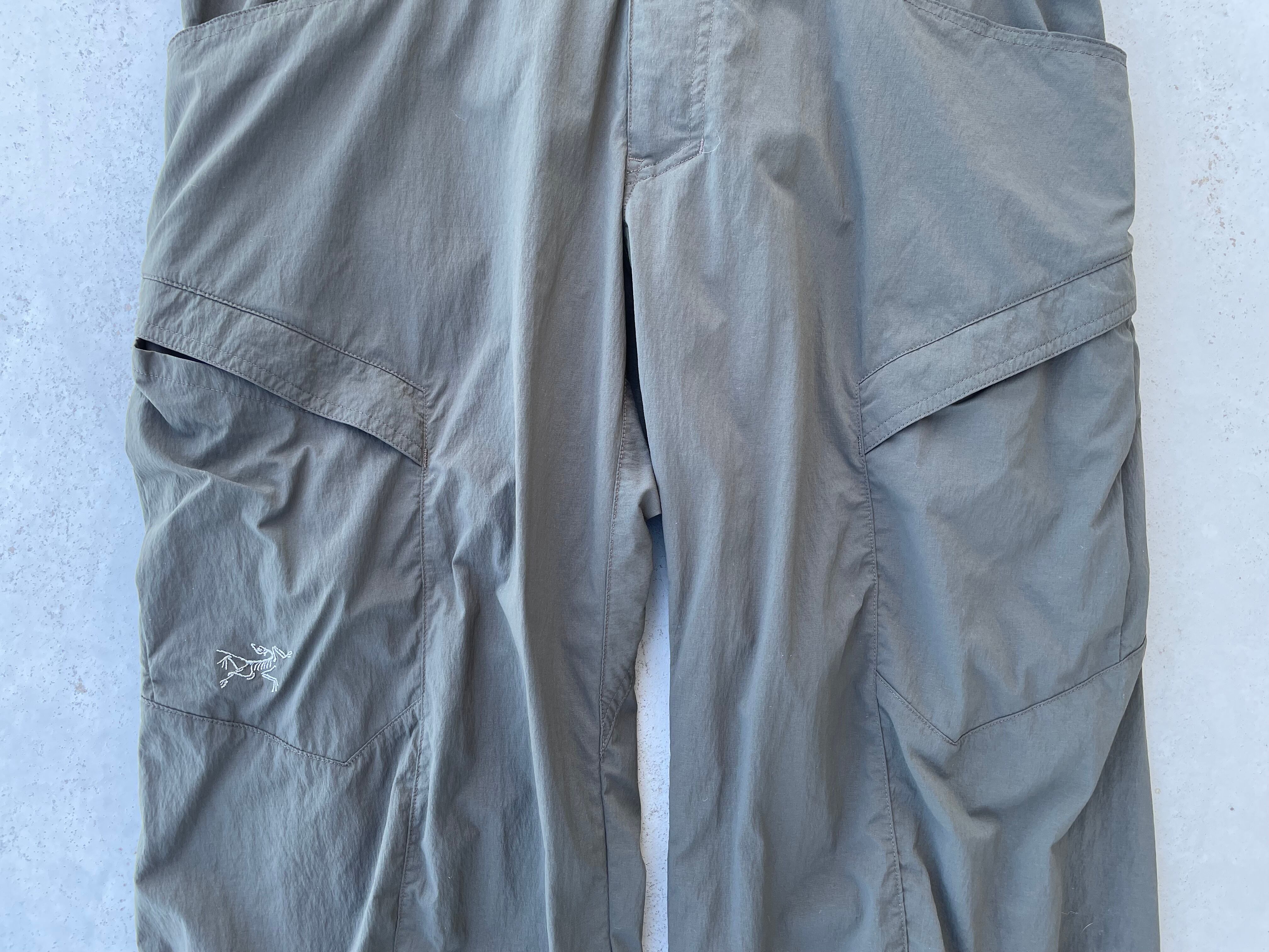 【商品詳細】アークテリクスのランパートパンツ。カラーはダークカーキ。サイズは38。90-00年代頃中国製。アークテリクス定番のランパートパンツ。こちらは紺タグが付く初期モデル。程よい厚みのナイロン地でこれからの季節活躍するかと。カーゴパンツのようなポケットが付き収納力も兼ね備えております。サイズ大きめですがベルトループ付なので、ぜひベルトで縛って着用されて下さい。