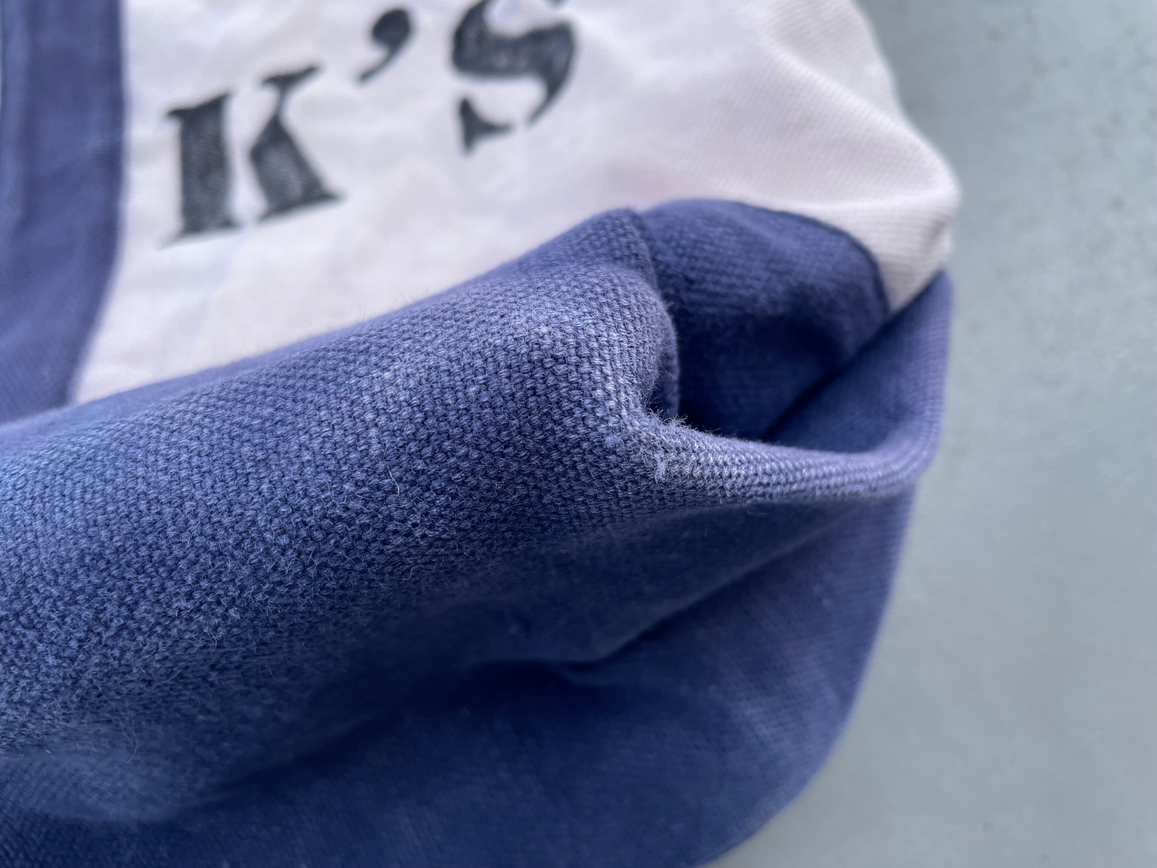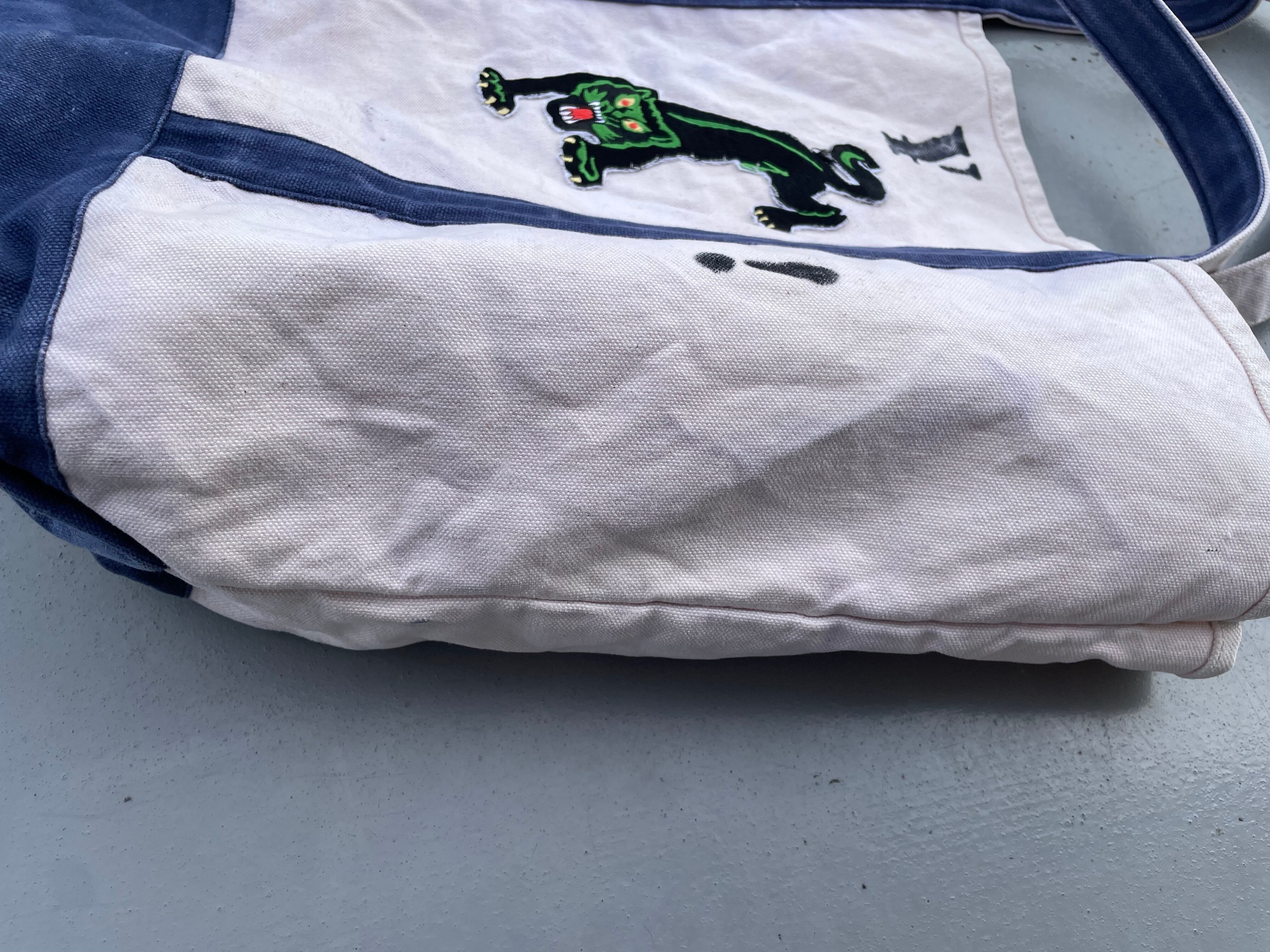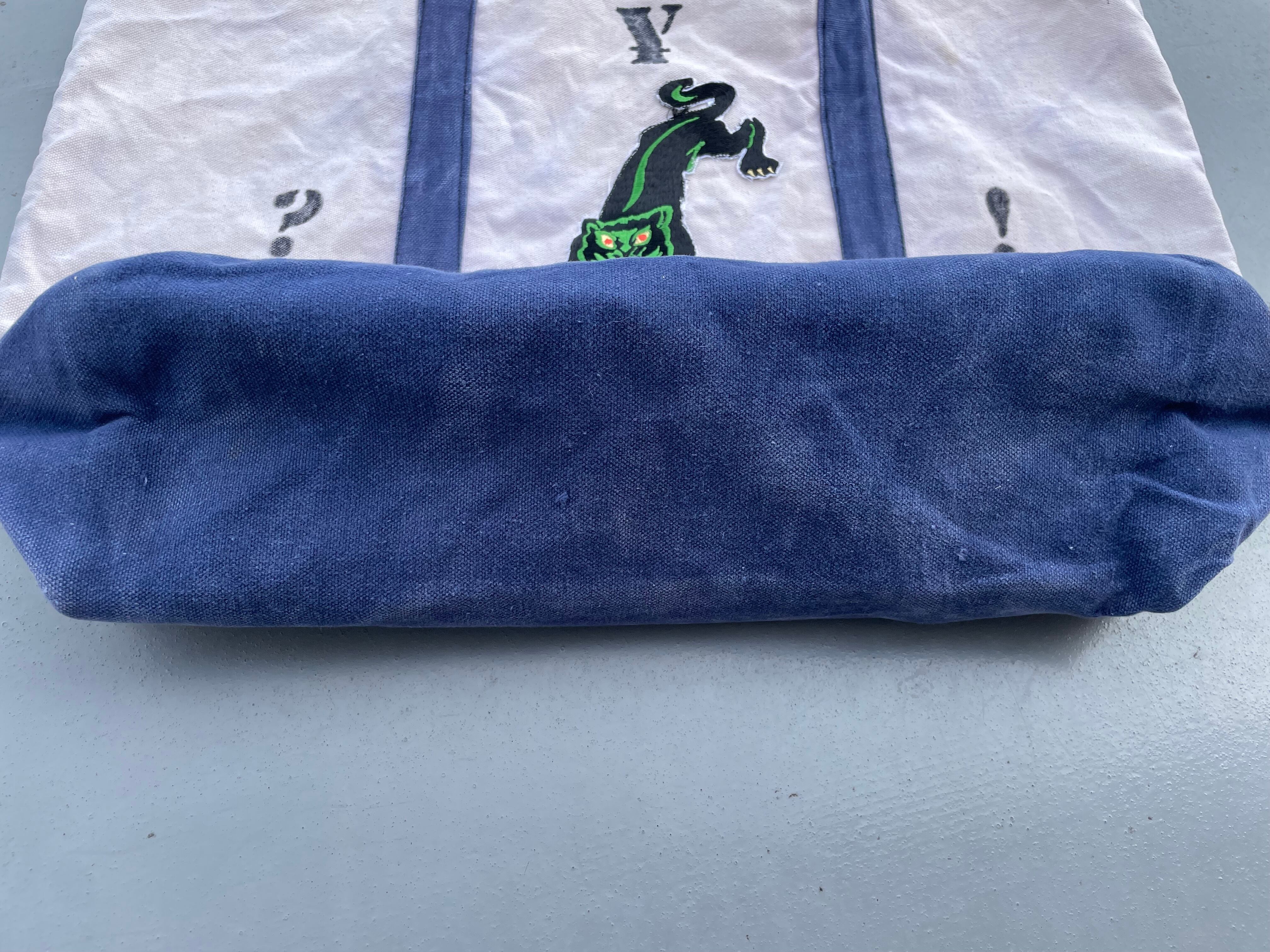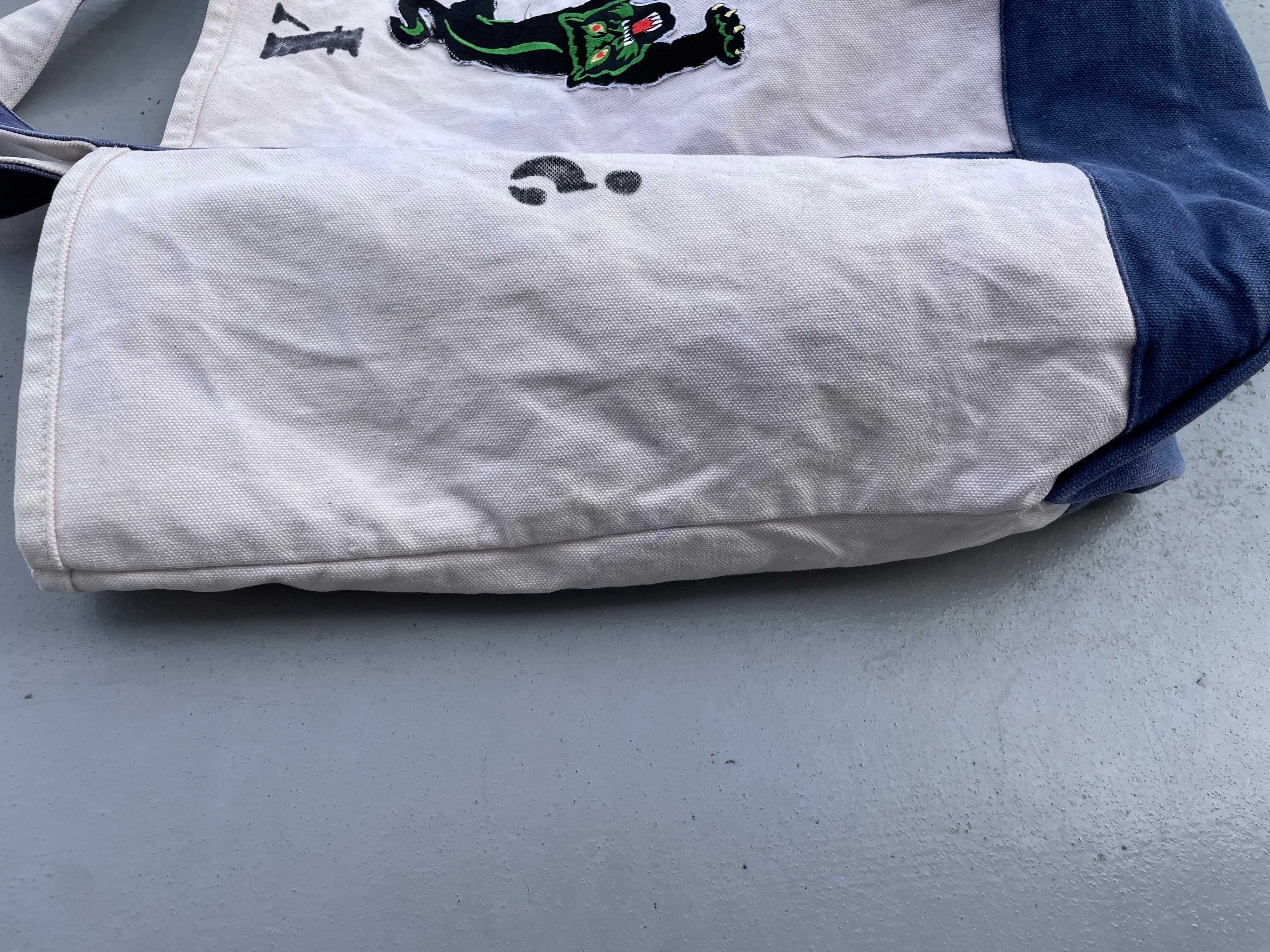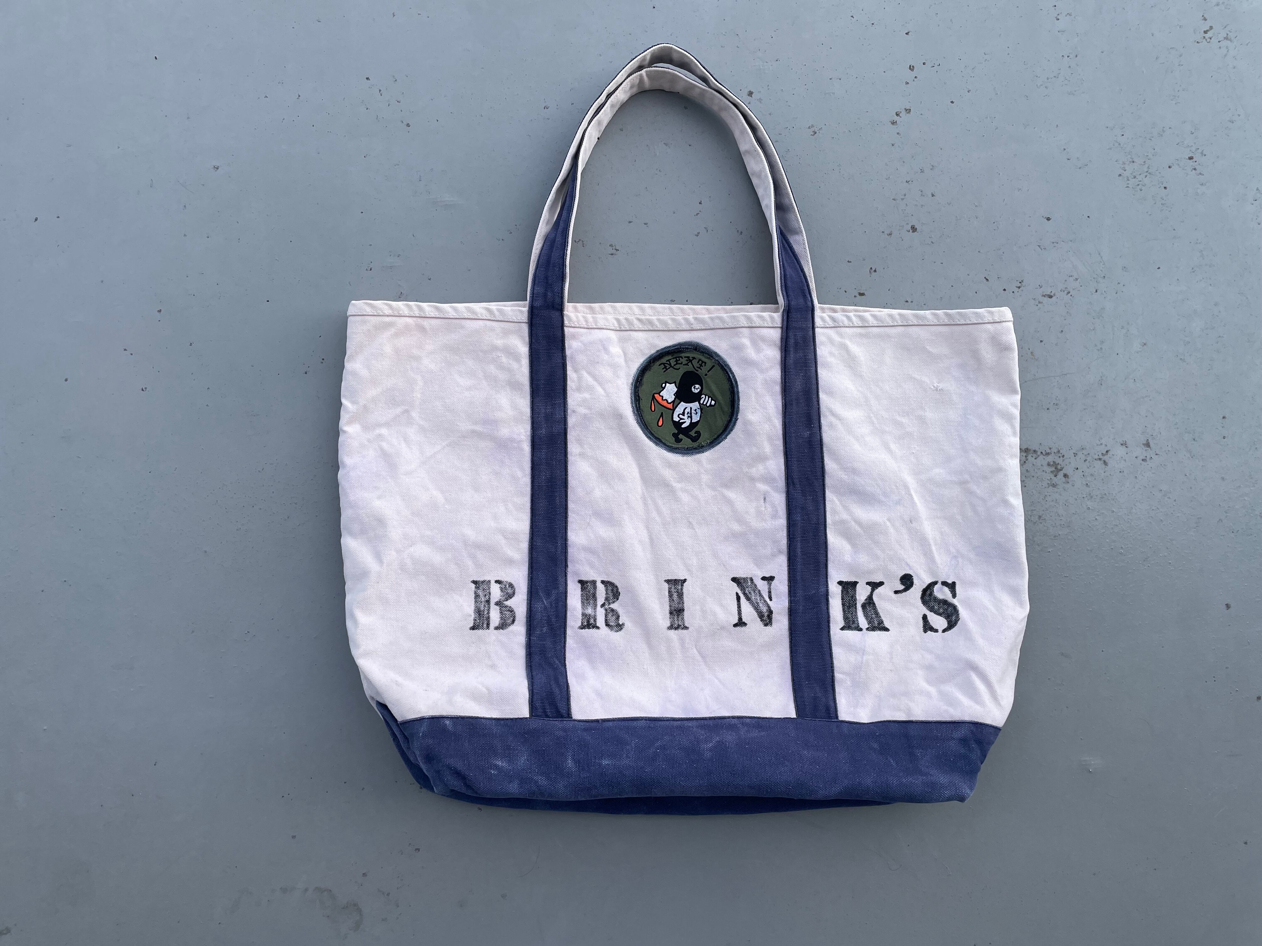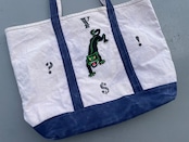 【商品詳細】UNKNOWNのトートバッグ。カラーはナチュラル×ブルー。柔らかいキャンバス地に人気のBRINK'Sステンシルやパンサーワッペンが貼られたカスタムモデル。丁度良い大きめサイズで収納力抜群でありながら持ち運びも可能なグッドサイズ。詳細不明ですが良い雰囲気です。