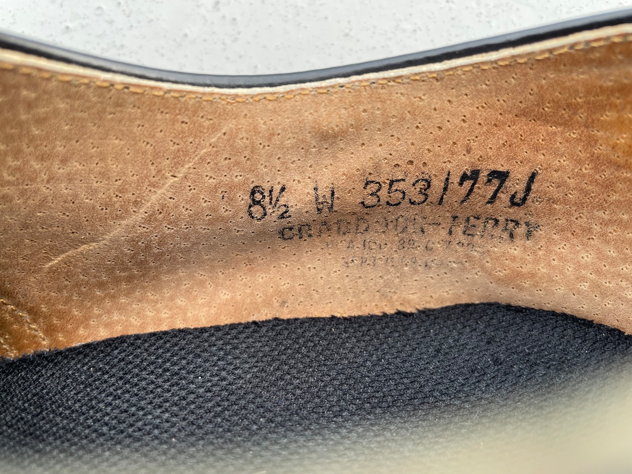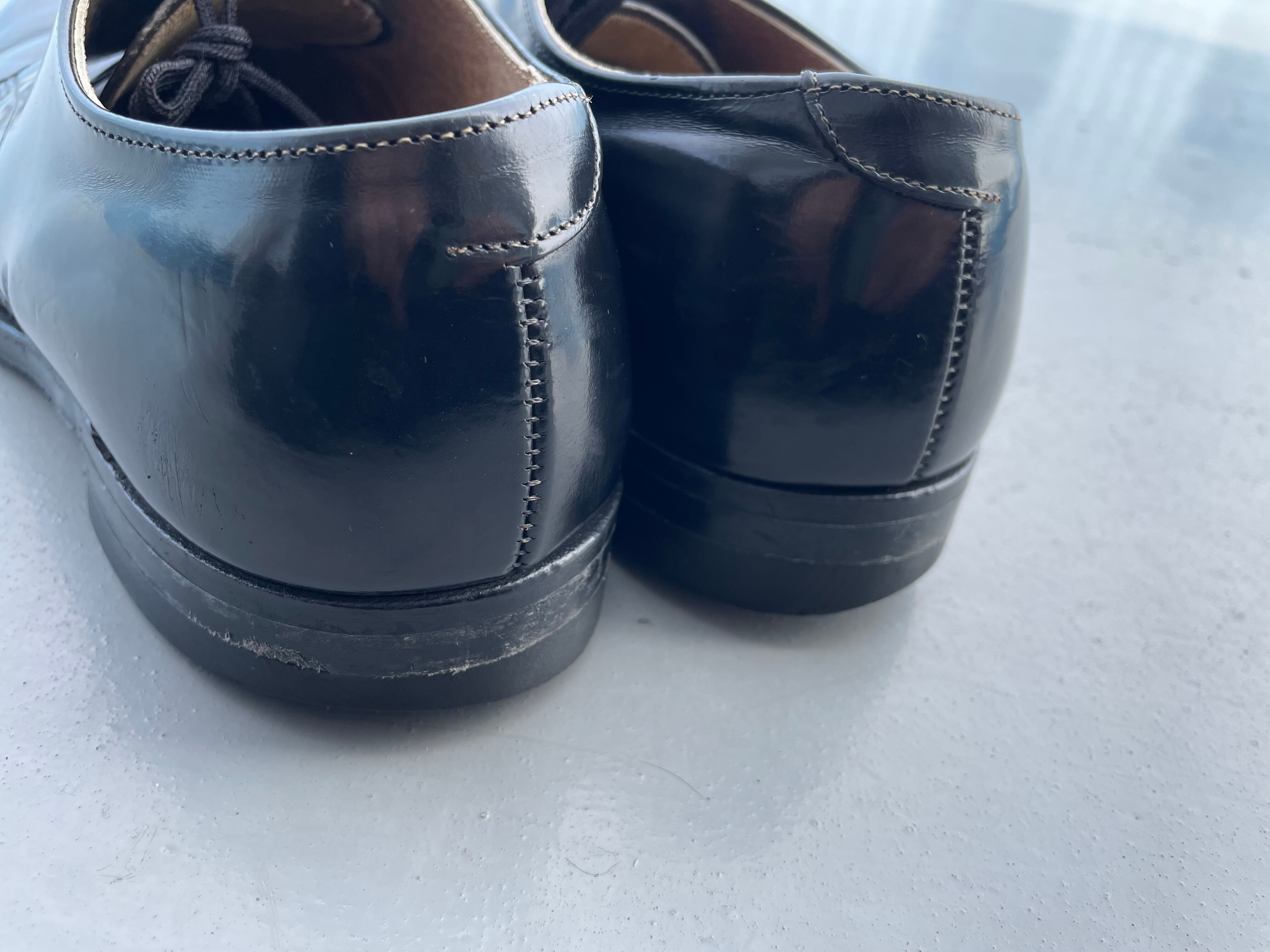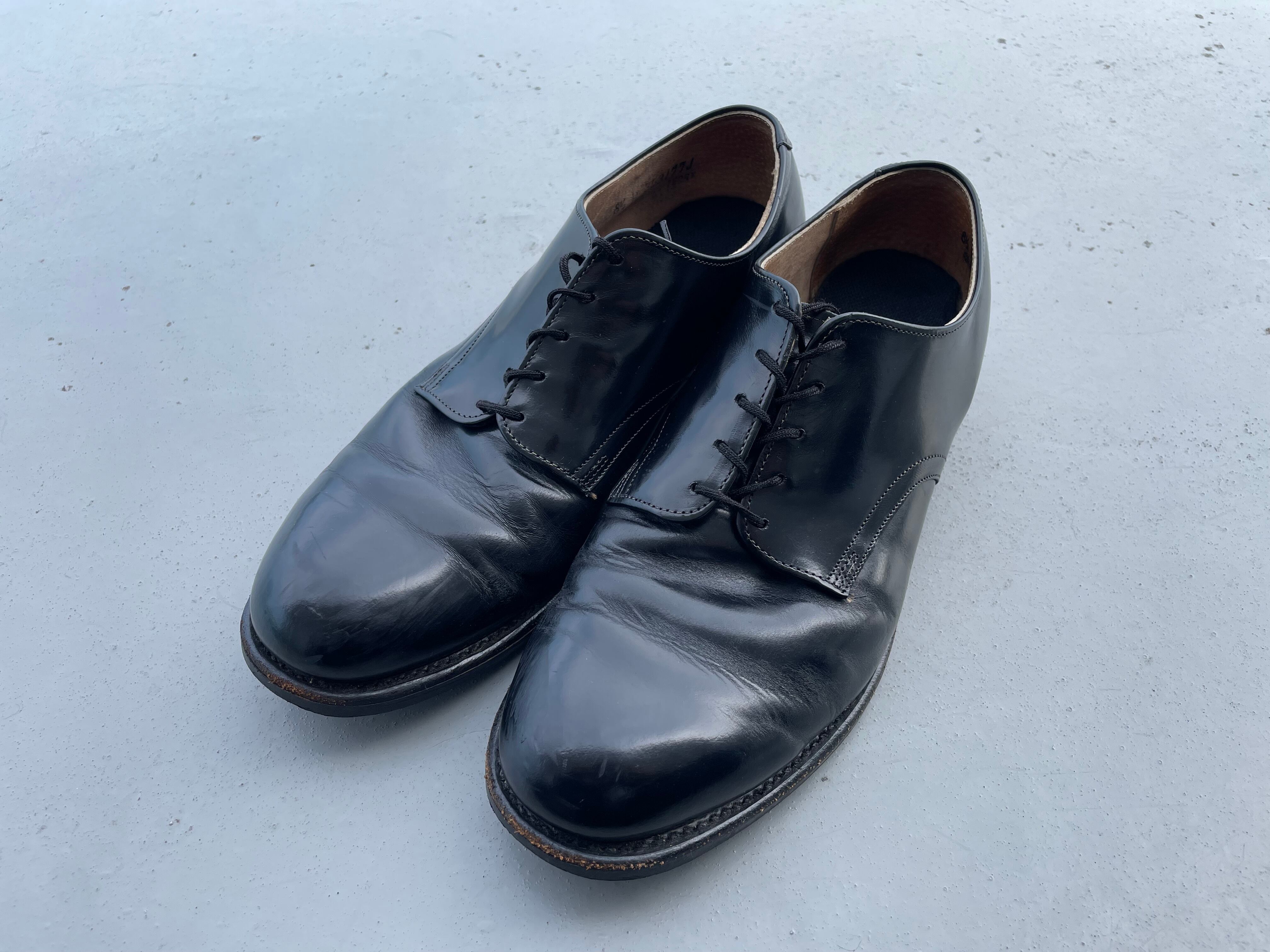 【商品詳細】U.S.NAVYのサービスシューズ。カラーはブラック。サイズはゴールデンの8 1/2。89年CRADDOCK-TERRY社製。Oldのガラスレザー仕様で雰囲気あります。履きシワや踵減り等使用感はございますがまだまだ前線で活躍する個体だと思います。インソール貼られてます。