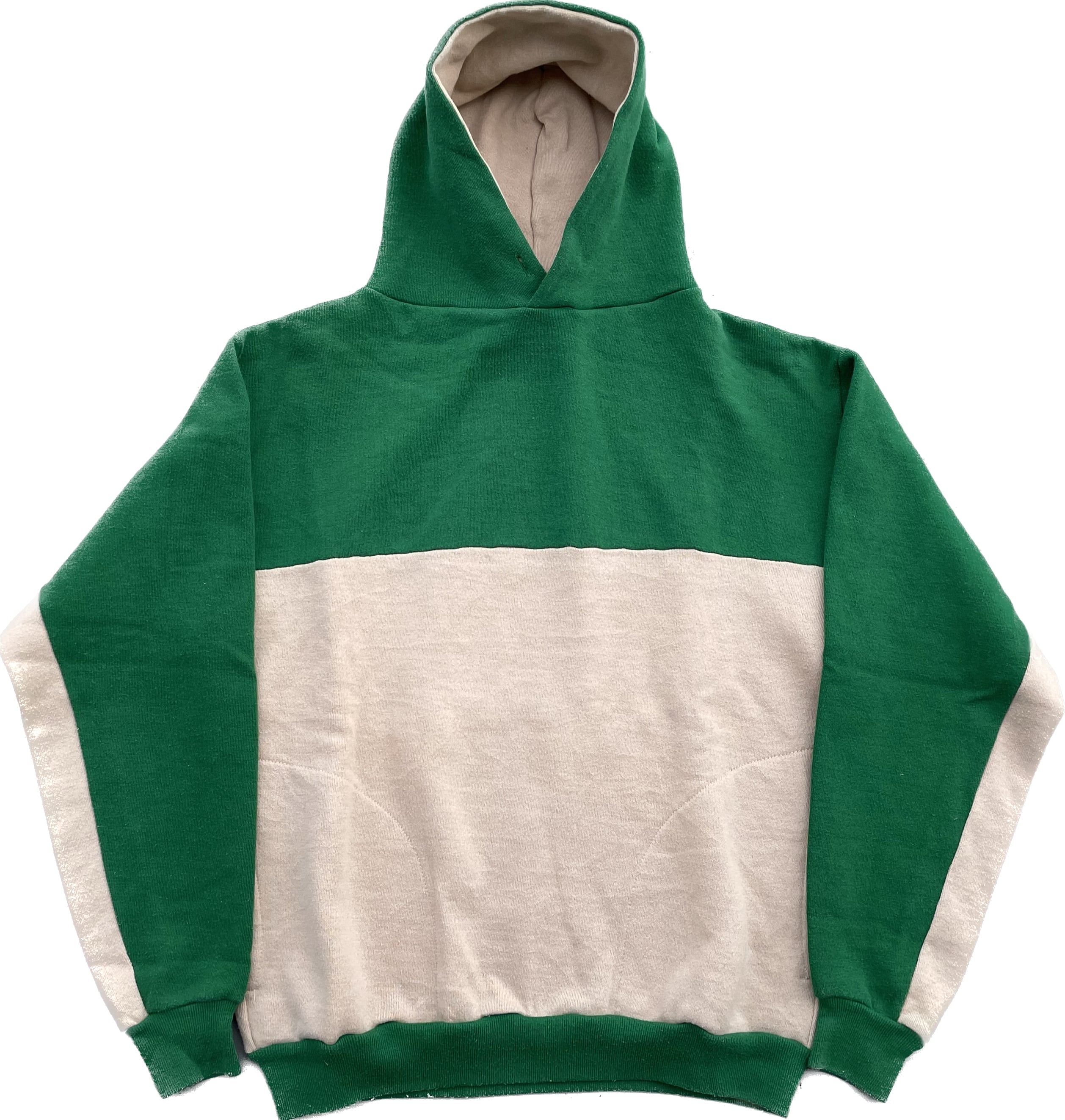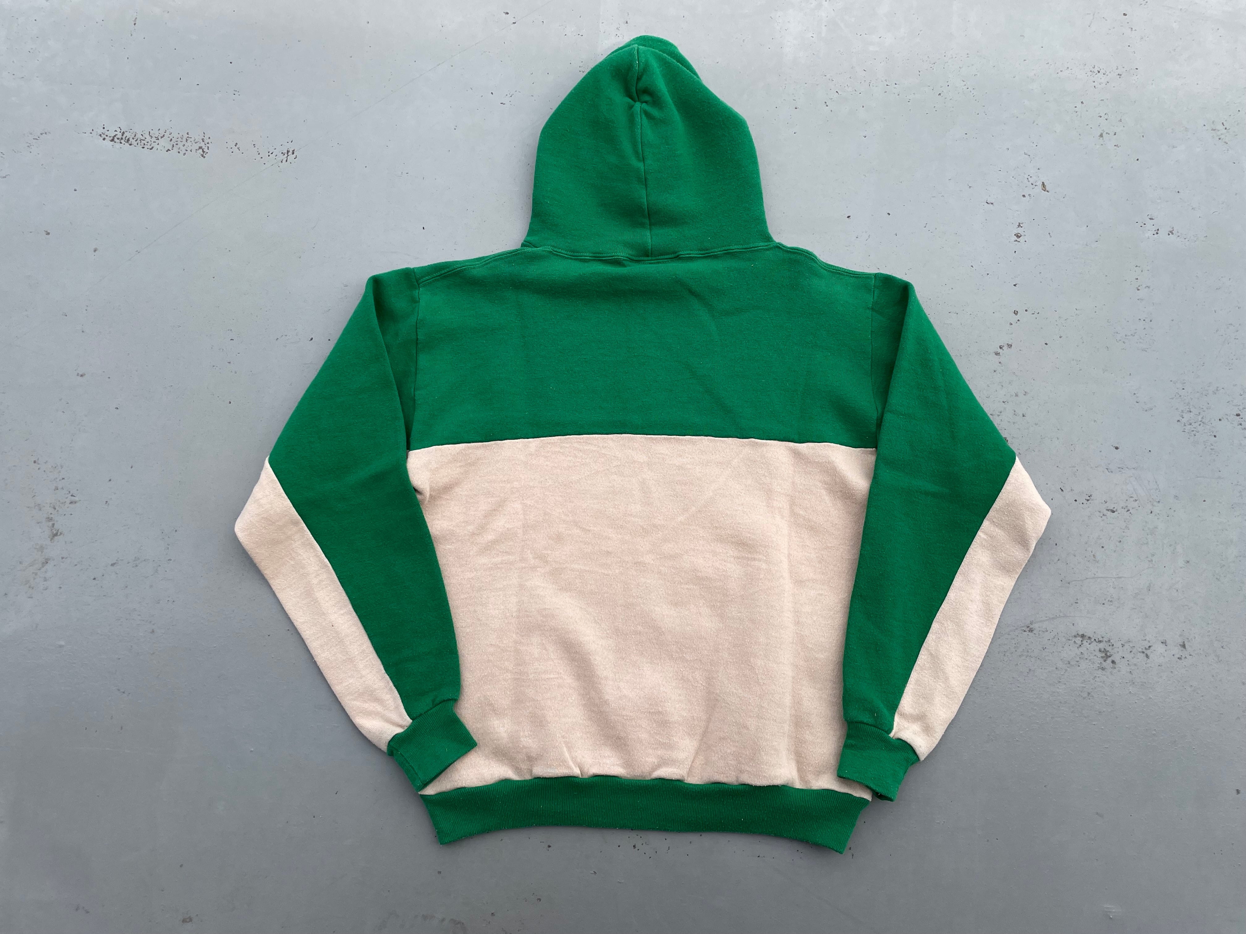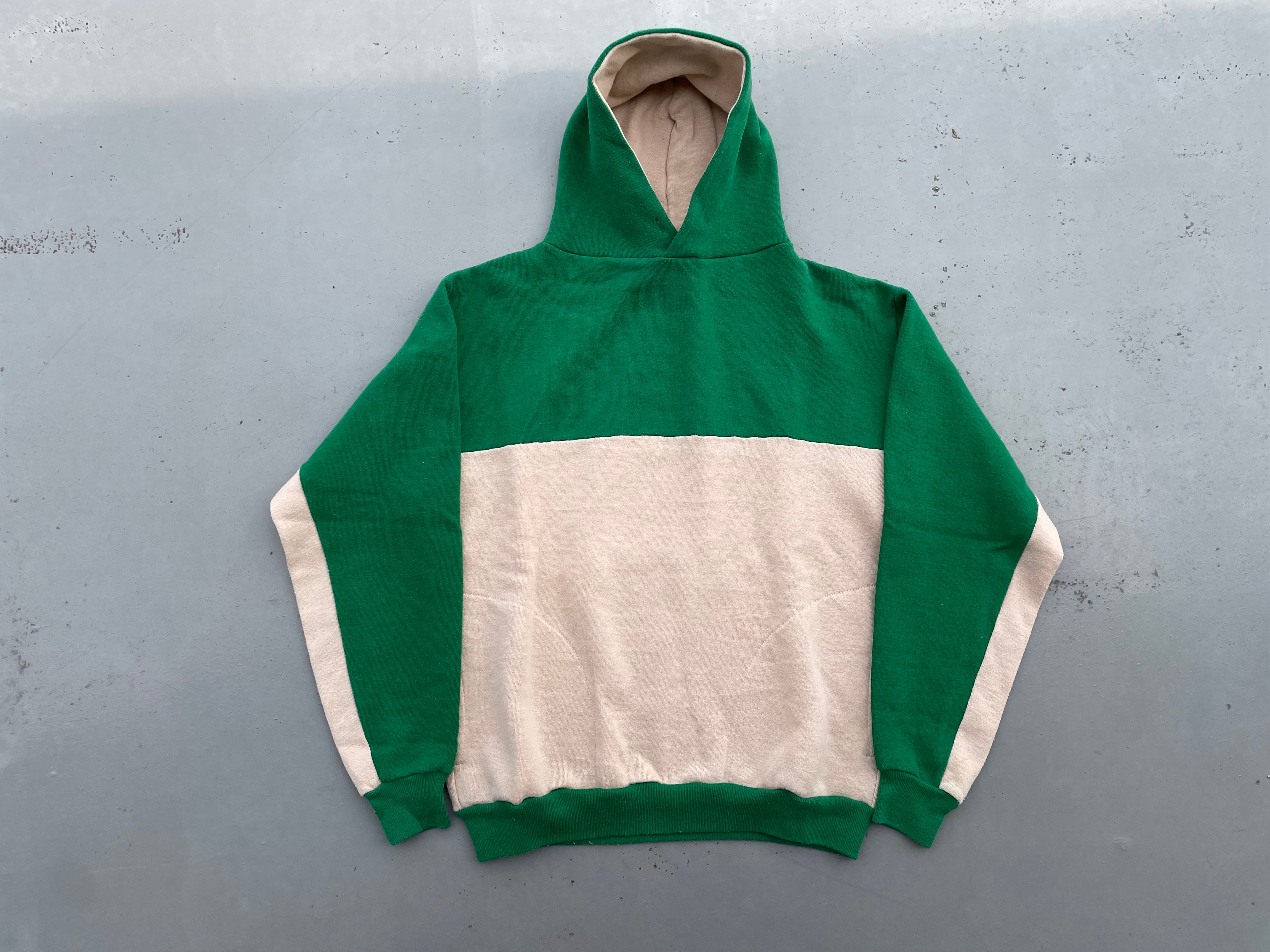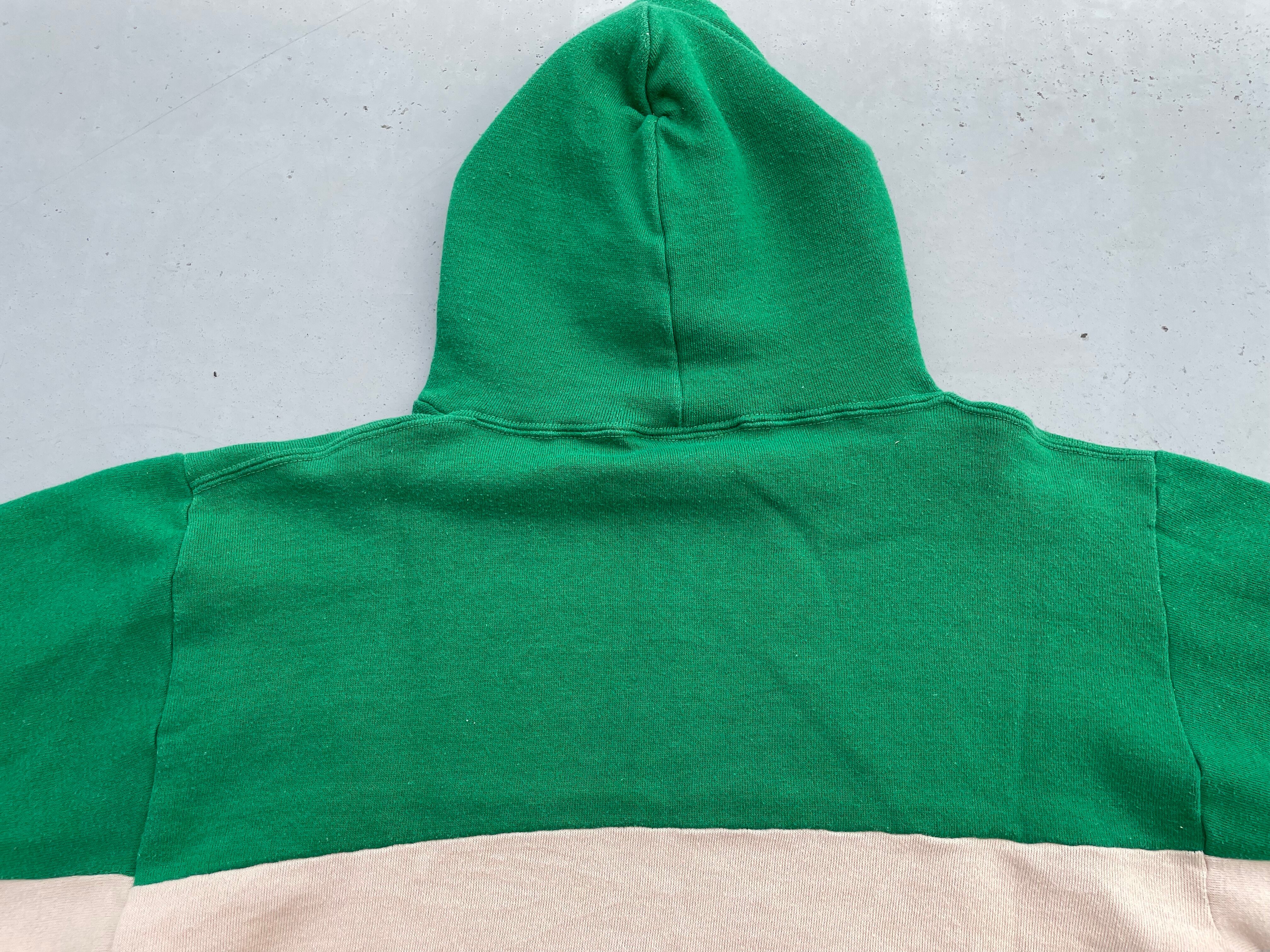 【商品詳細】ラッセルアスレチックのツートーン プルオーバーパーカー。サイズはM。カラーはグリーン×ベージュのツートーン。80年代USA製。ラッセル定番のスウェットパーカー。こちらは珍しいツートーンパターン。色使いがレトロな印象で古着とよく合います。地味にダブルフェイス仕様。着丈短め・身幅のある今どきシルエットで需要の高いディテール。希少な赤タグ。