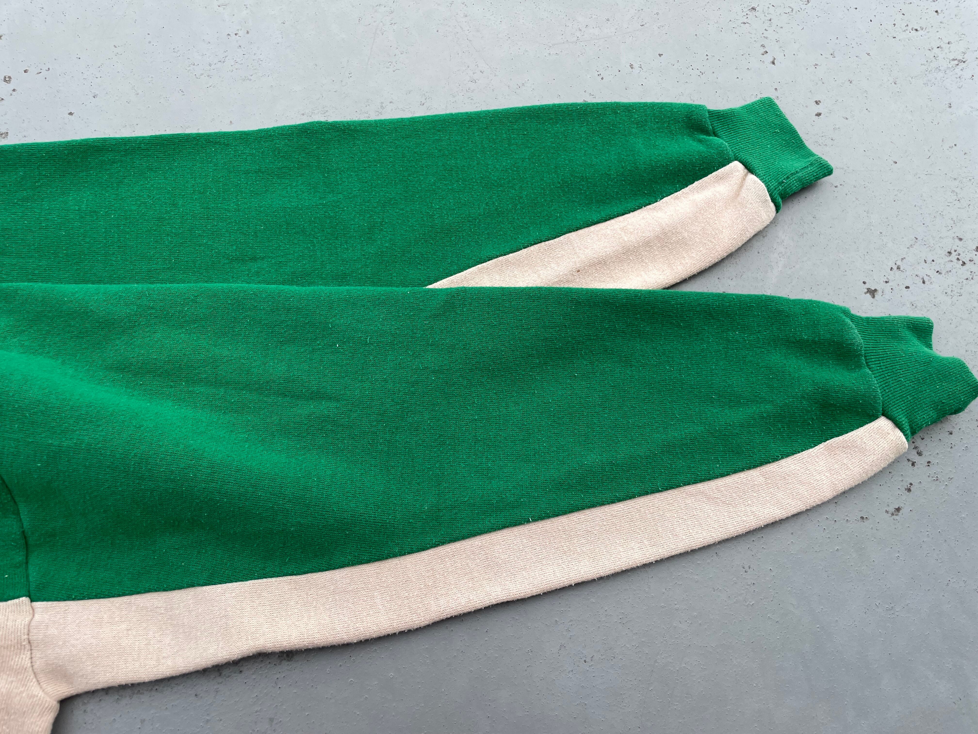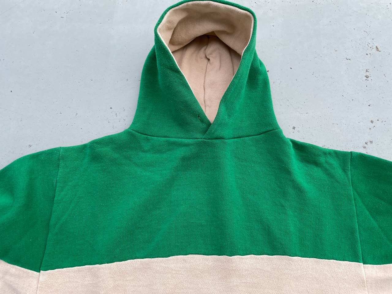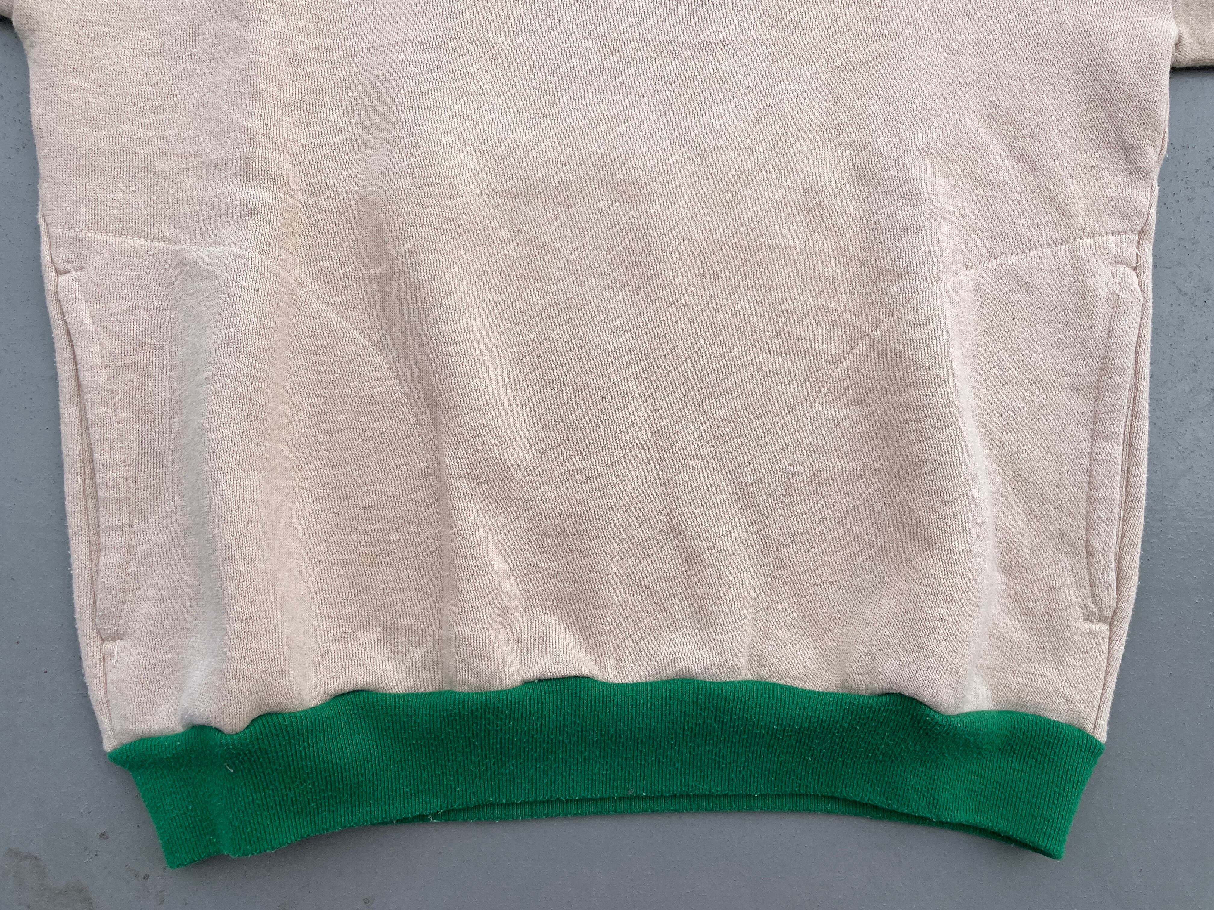 【商品詳細】ラッセルアスレチックのツートーン プルオーバーパーカー。サイズはM。カラーはグリーン×ベージュのツートーン。80年代USA製。ラッセル定番のスウェットパーカー。こちらは珍しいツートーンパターン。色使いがレトロな印象で古着とよく合います。地味にダブルフェイス仕様。着丈短め・身幅のある今どきシルエットで需要の高いディテール。希少な赤タグ。
