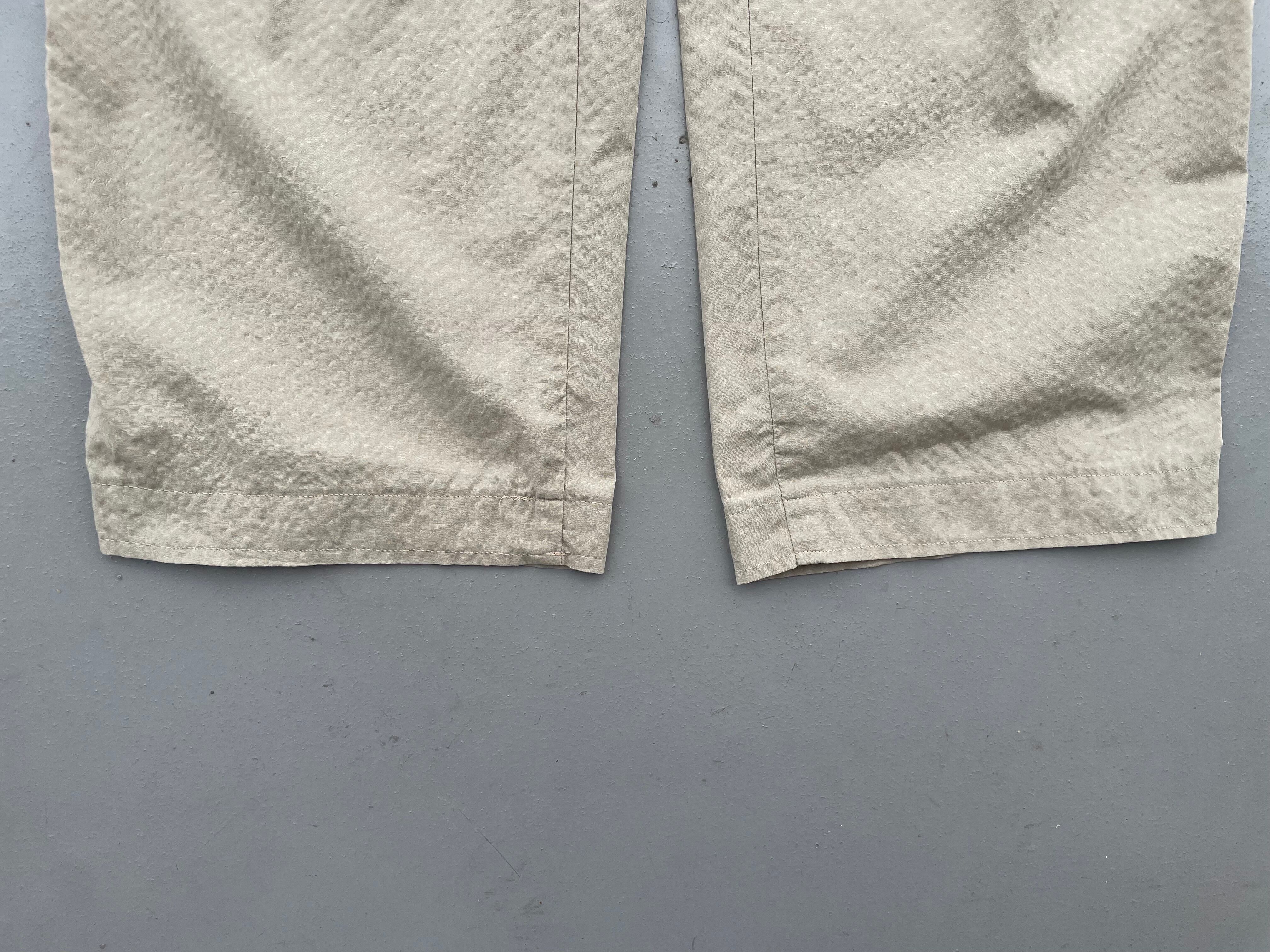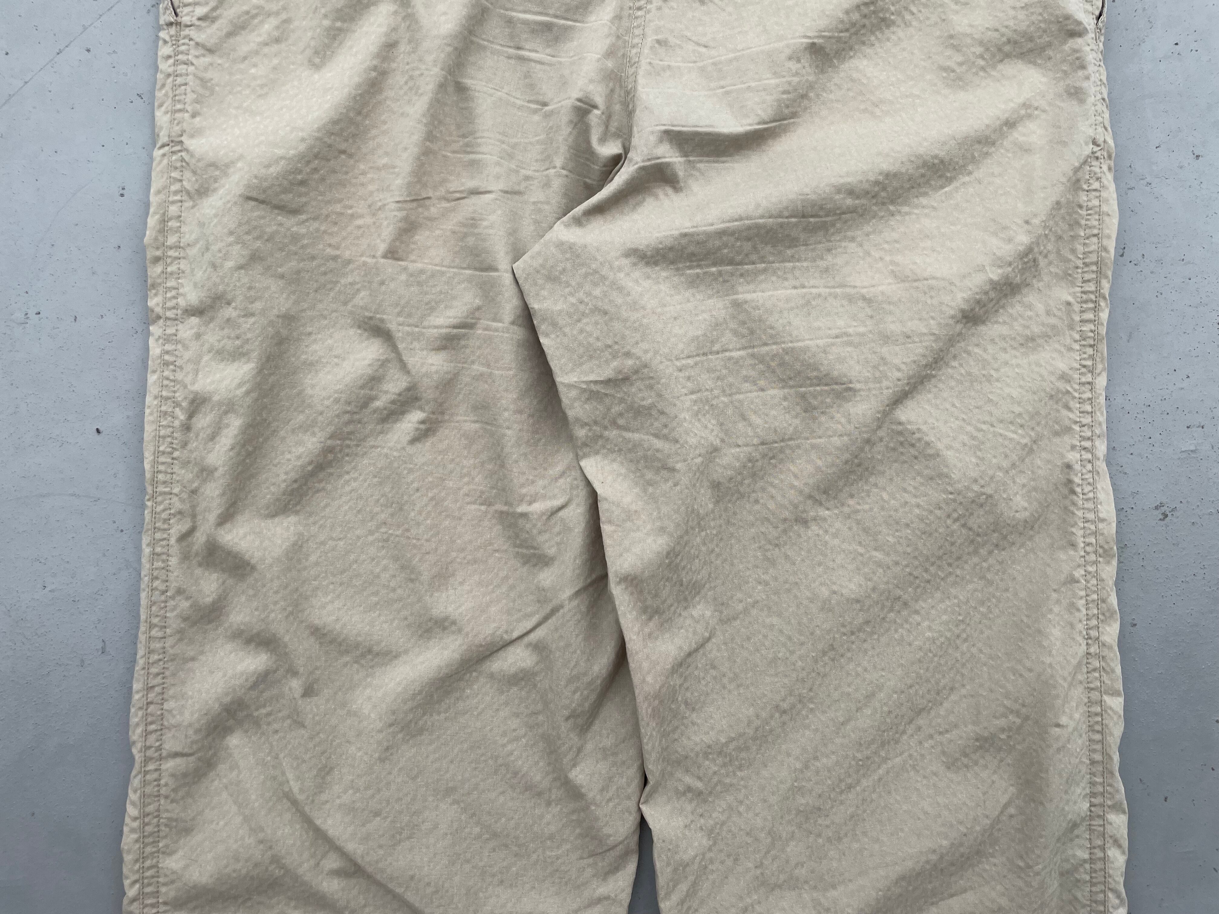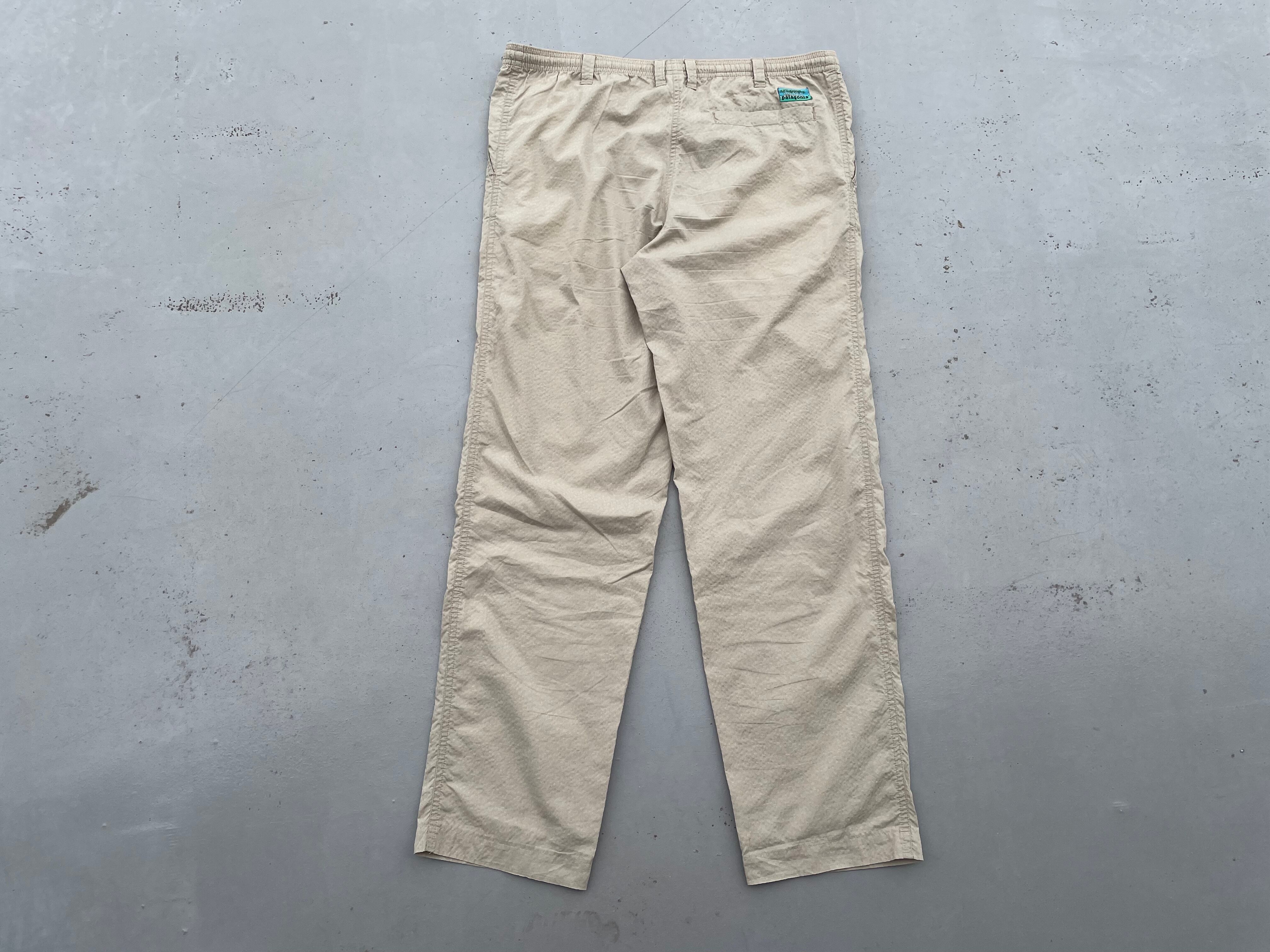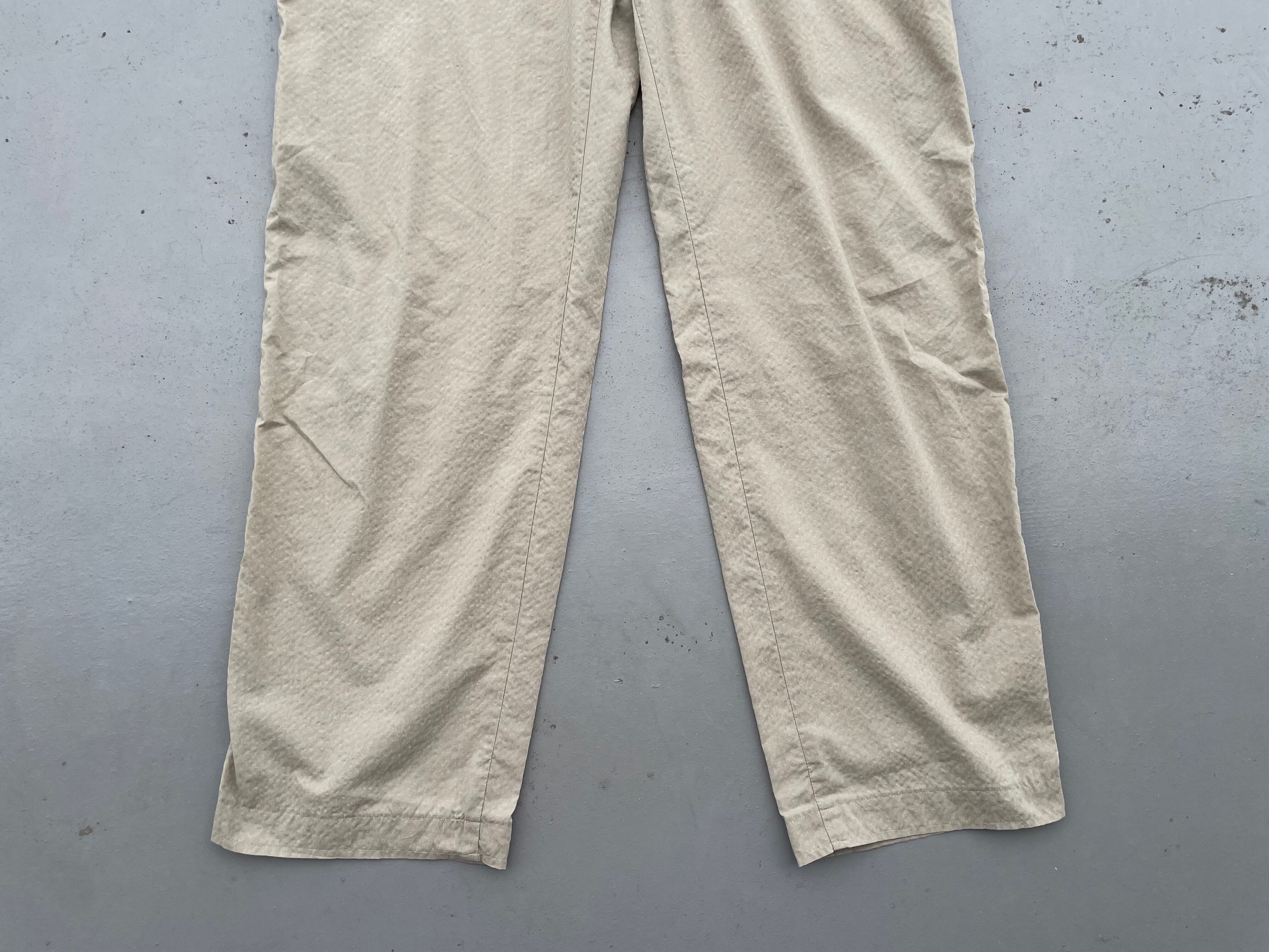 【商品詳細】パタゴニアのトロピックパンツ。カラーはベージュ。サイズはS。05年コロンビア製。以前お出ししたトロピカルフラッツパンツ同様に出回りの少ないトロピックパンツ。コットンポリのサラッとした滑らかな生地にシアサッカーの様な凹凸が入る変わり種。裏地がつかない仕様なのでロングパンツでありながら夏場でも活躍するモデルかと。ウエストゴムに加えベルトループがつくのでおおよそのサイズ調整可能です。Sサイズですが実寸の通り大きめの作り。このヤシの木タグ見るだけで気分良いですね。