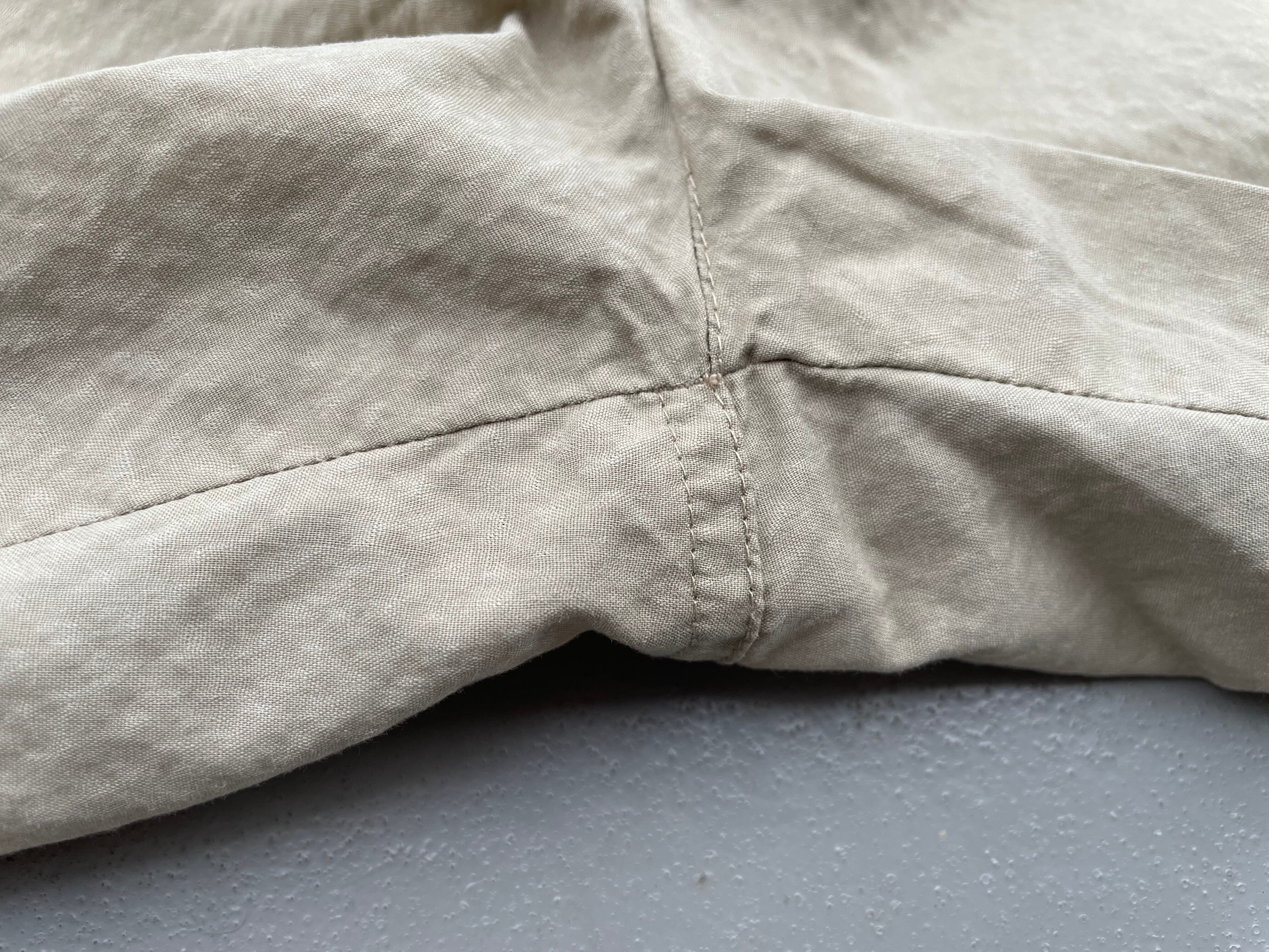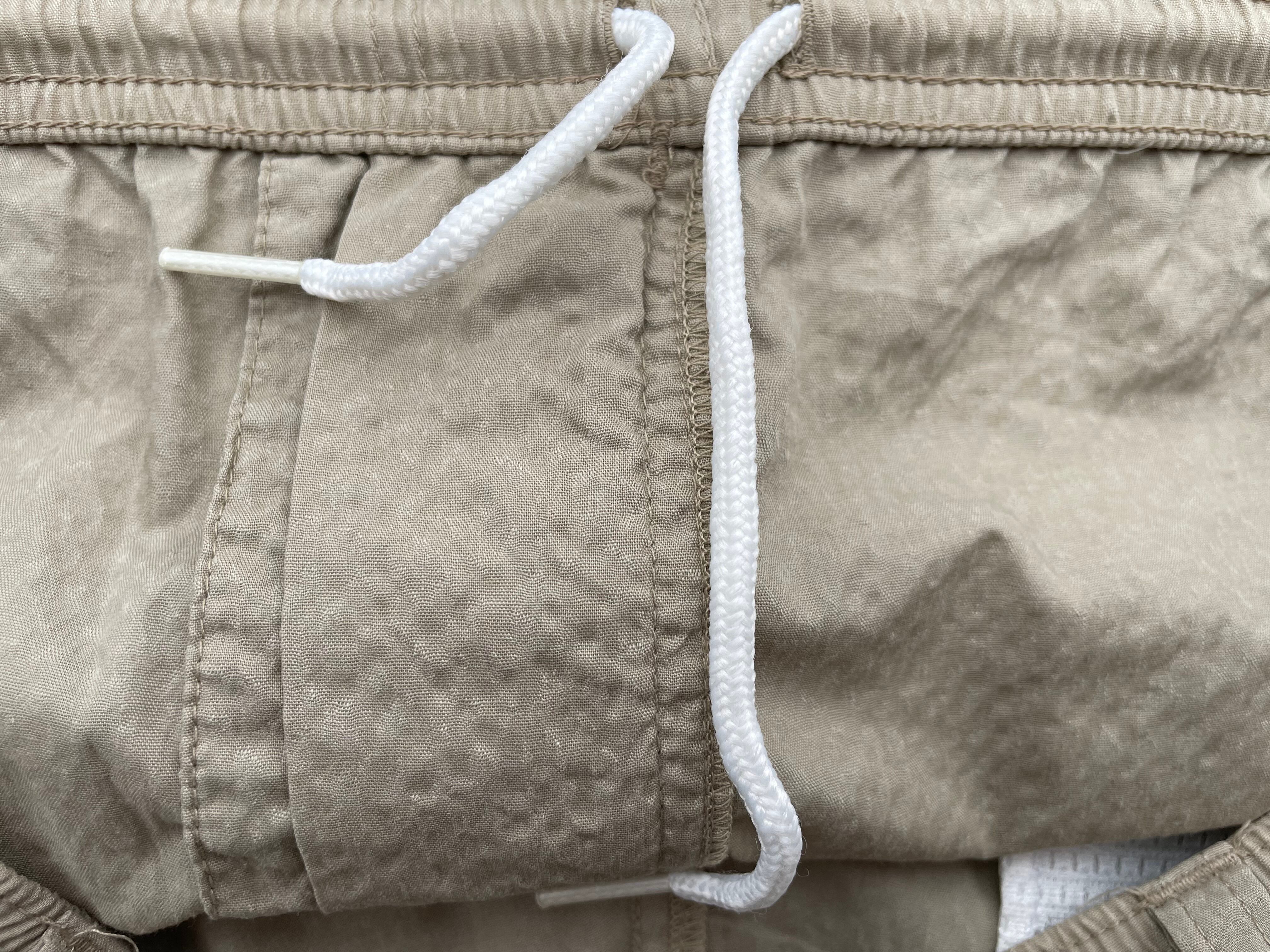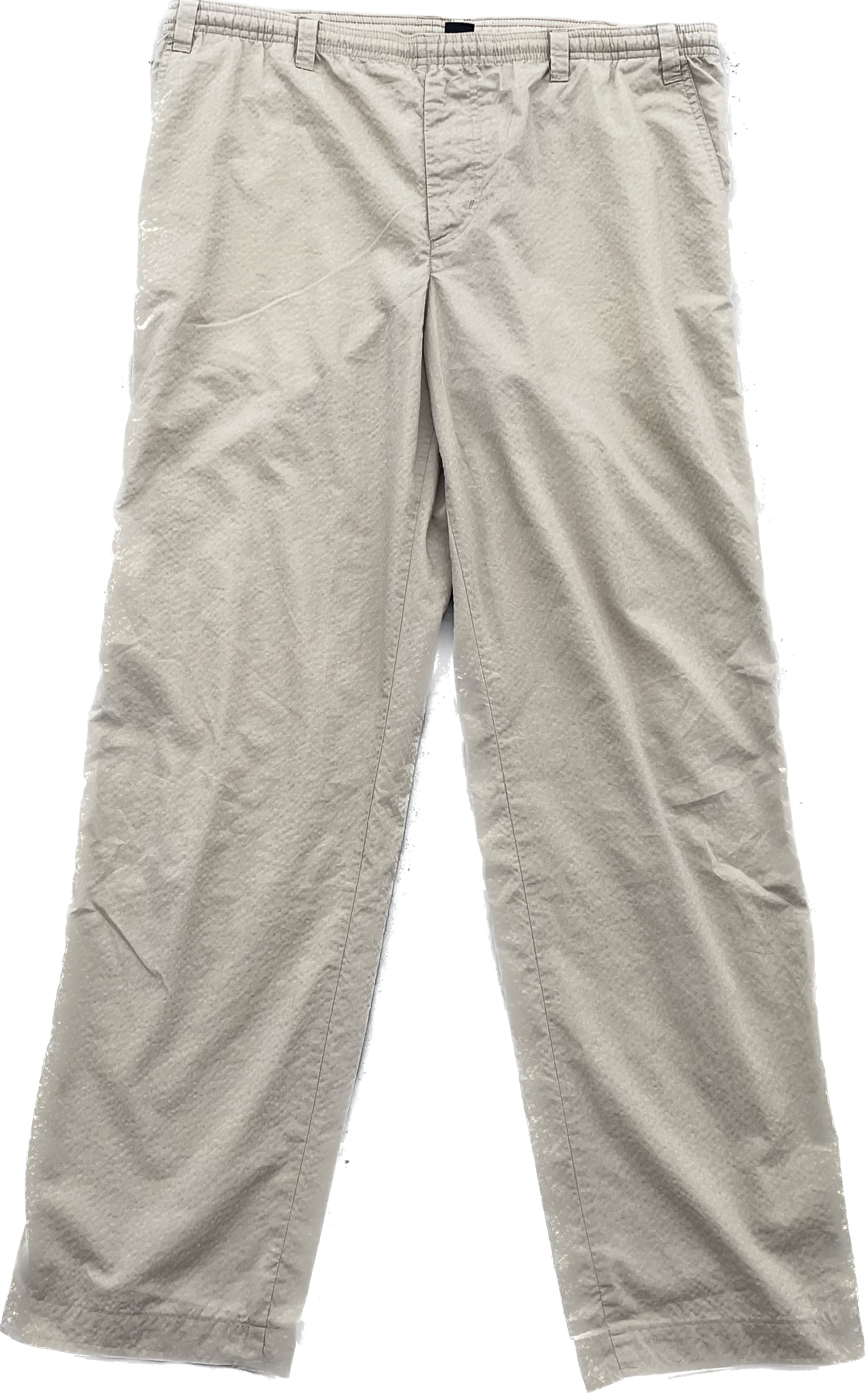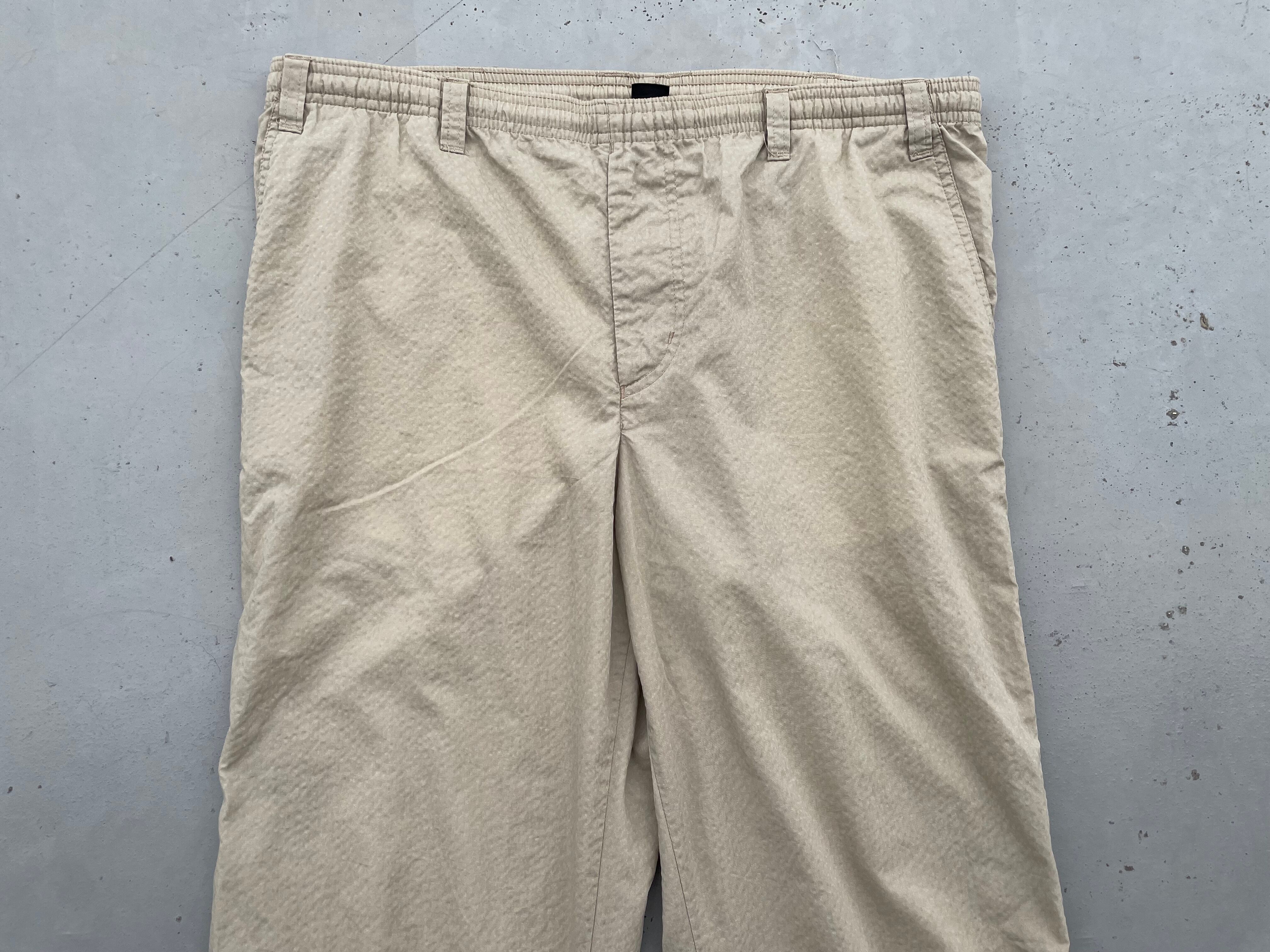 【商品詳細】パタゴニアのトロピックパンツ。カラーはベージュ。サイズはS。05年コロンビア製。以前お出ししたトロピカルフラッツパンツ同様に出回りの少ないトロピックパンツ。コットンポリのサラッとした滑らかな生地にシアサッカーの様な凹凸が入る変わり種。裏地がつかない仕様なのでロングパンツでありながら夏場でも活躍するモデルかと。ウエストゴムに加えベルトループがつくのでおおよそのサイズ調整可能です。Sサイズですが実寸の通り大きめの作り。このヤシの木タグ見るだけで気分良いですね。