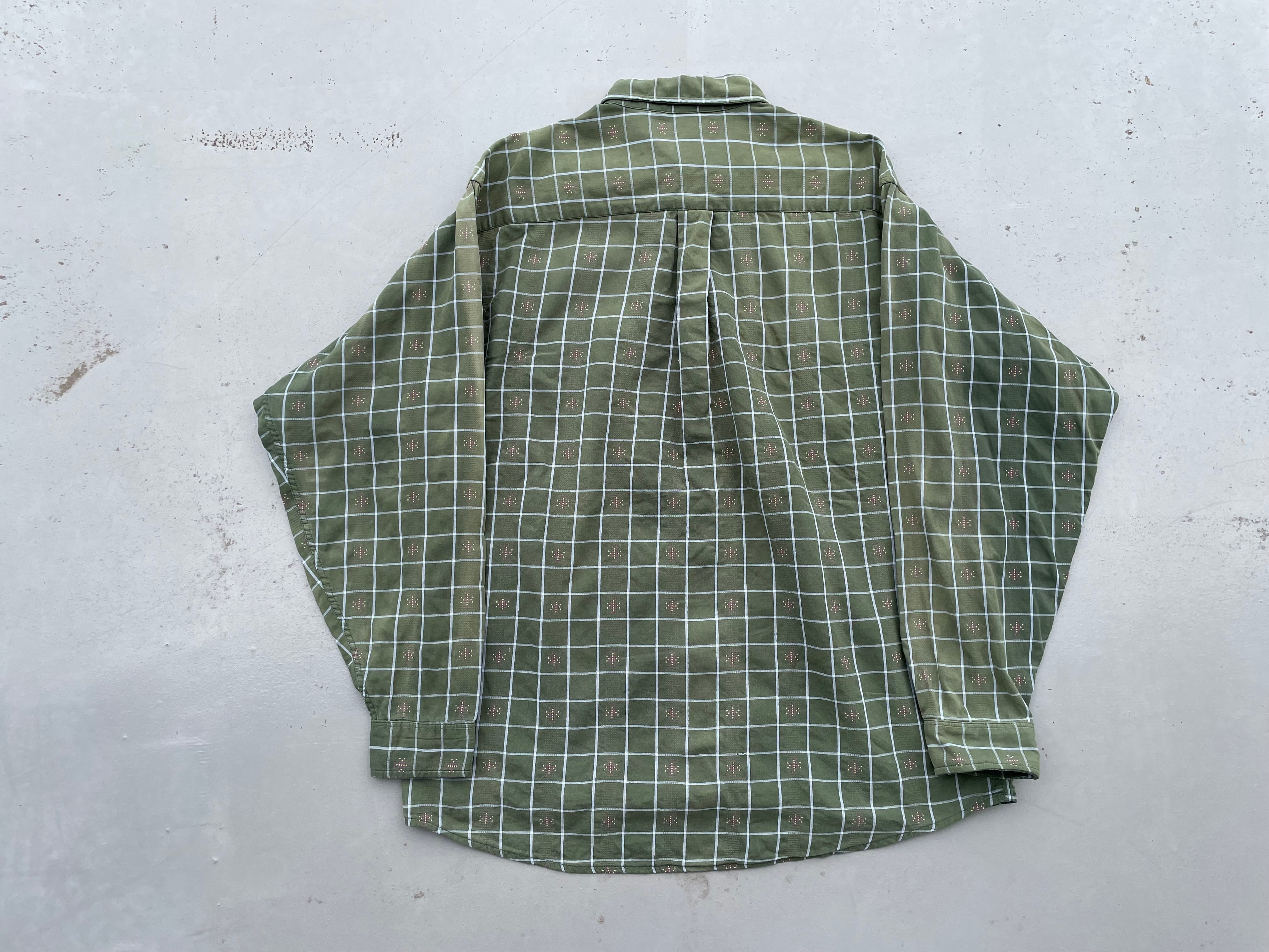 【商品詳細】パタゴニアのコットンチェックシャツ。カラーはグリーンベースのホワイトボックスチェックパターン。サイズはL。90年代ポルトガル製。グリーンベースにホワイトボックスチェックと幾何学的模様の入るアウトドアブランドらしからぬ洒落た1着。部分毎でフェードの強弱があり良い意味で表情があり雰囲気あります。サイズも大きめで需要の高い個体。