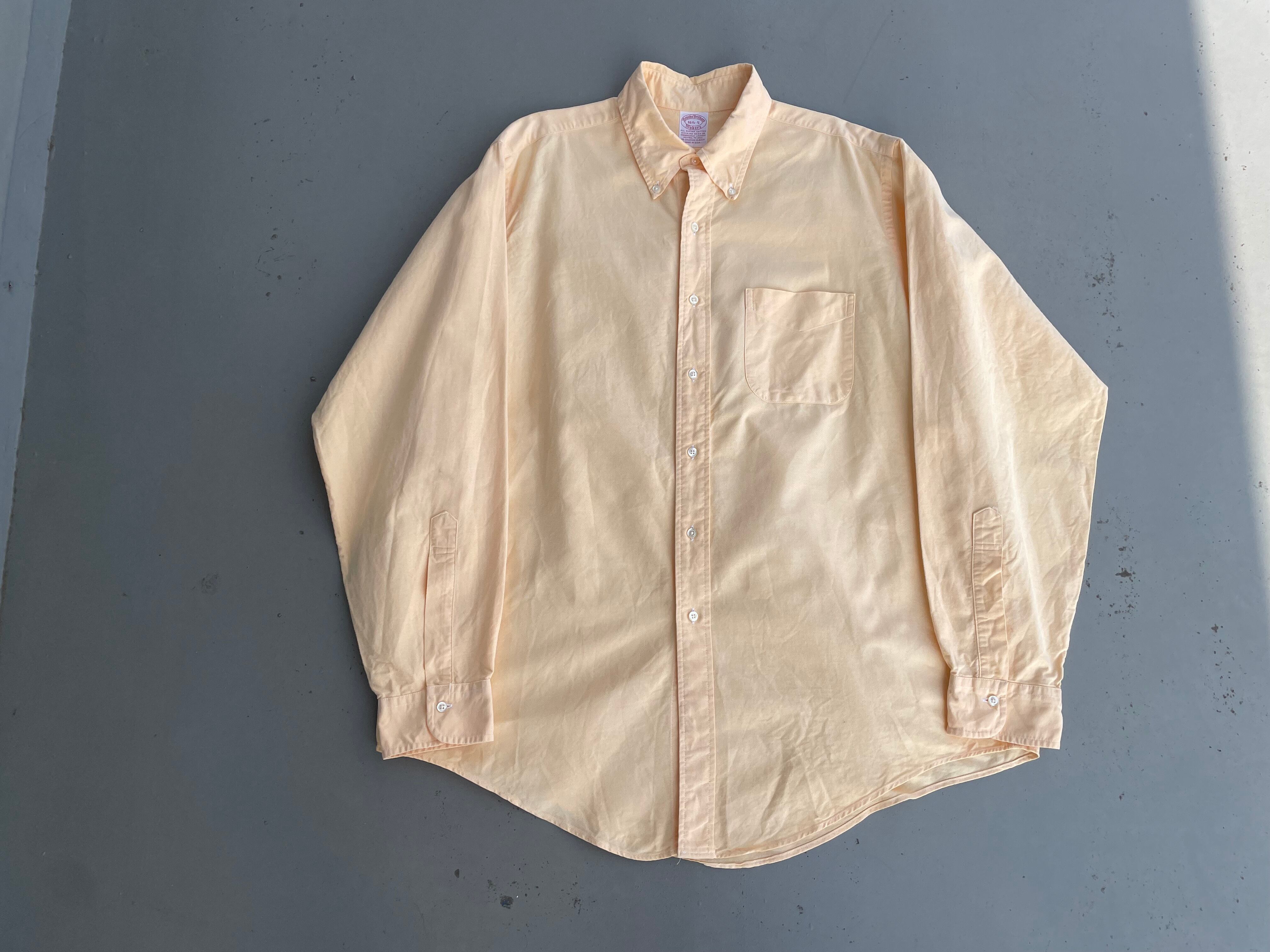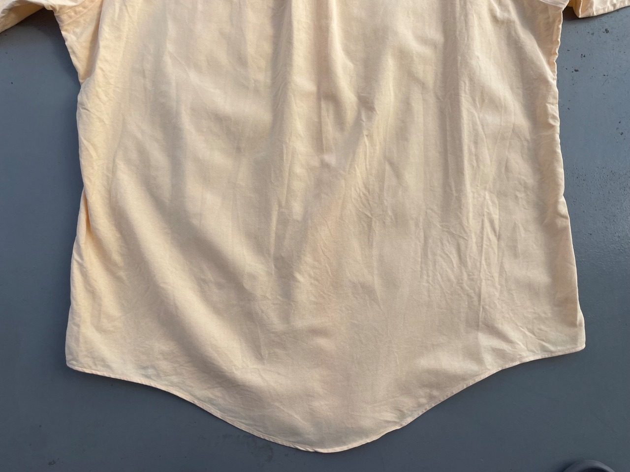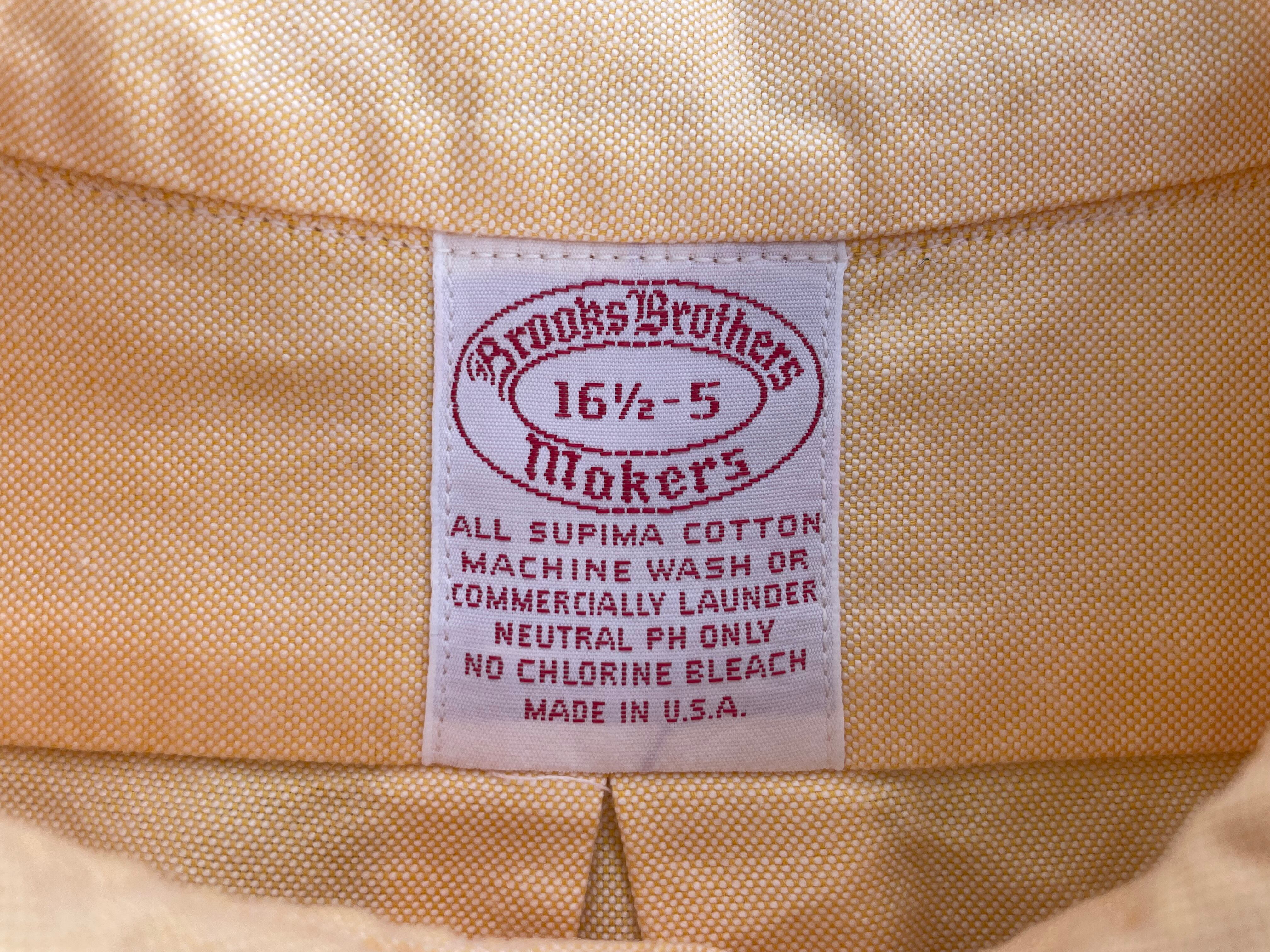 【商品詳細】ブルックスブラザーズのメーカーズオックスフォードシャツ。サイズは16 1/2-5。7つボタン。カラーはイエロー。80年代USA製。ビビットではないどこか大人感のあるイエローカラー。L〜XLのサイズ程のゆったり感で着用時の綺麗なラウンドシルエットが美しいです。もちろん袖部分のギャザーも健在。私的にもこのカラー大好きで着用してますが良い気分です。この辺は今後更に人気が出てきそうですね。