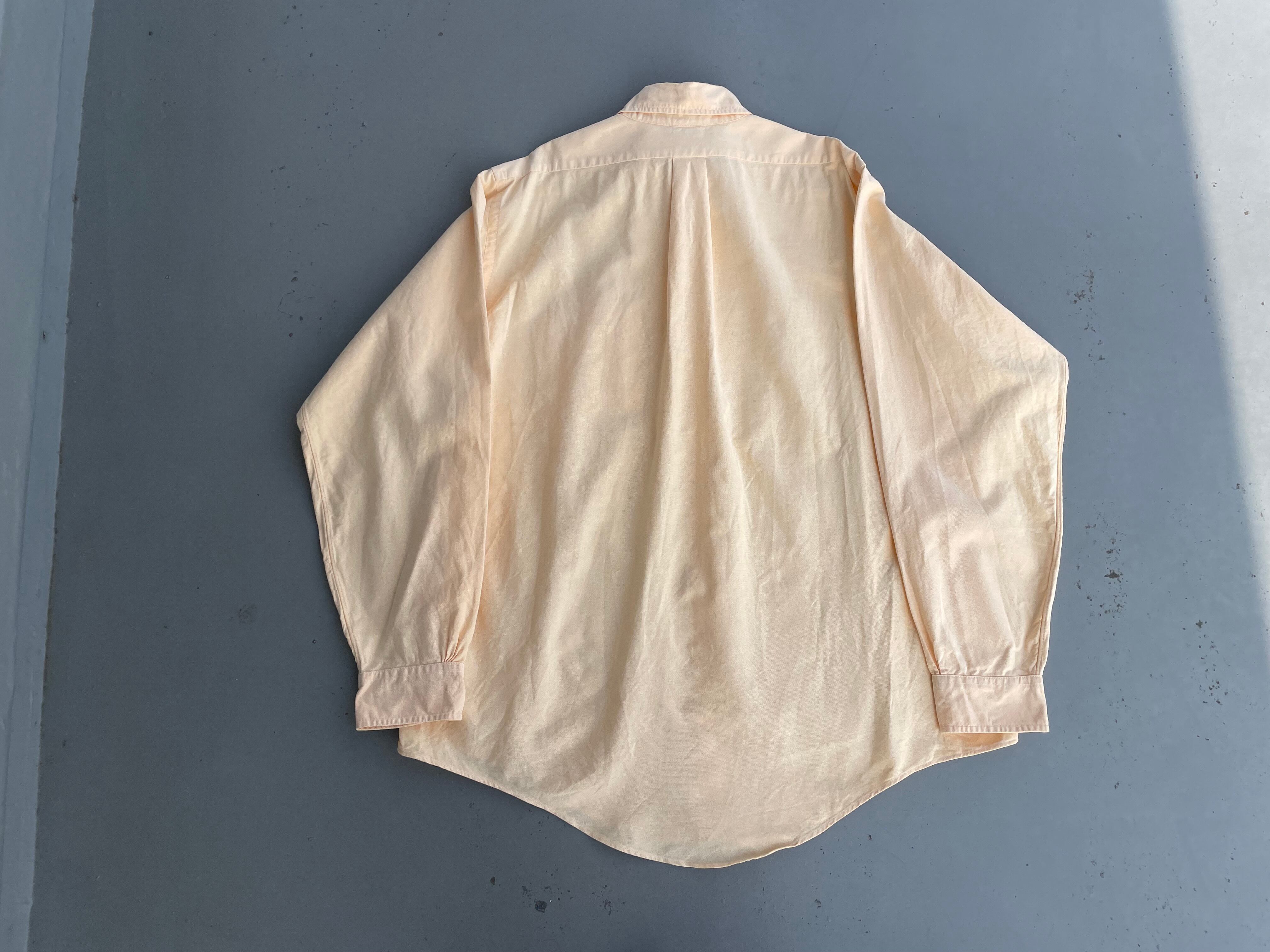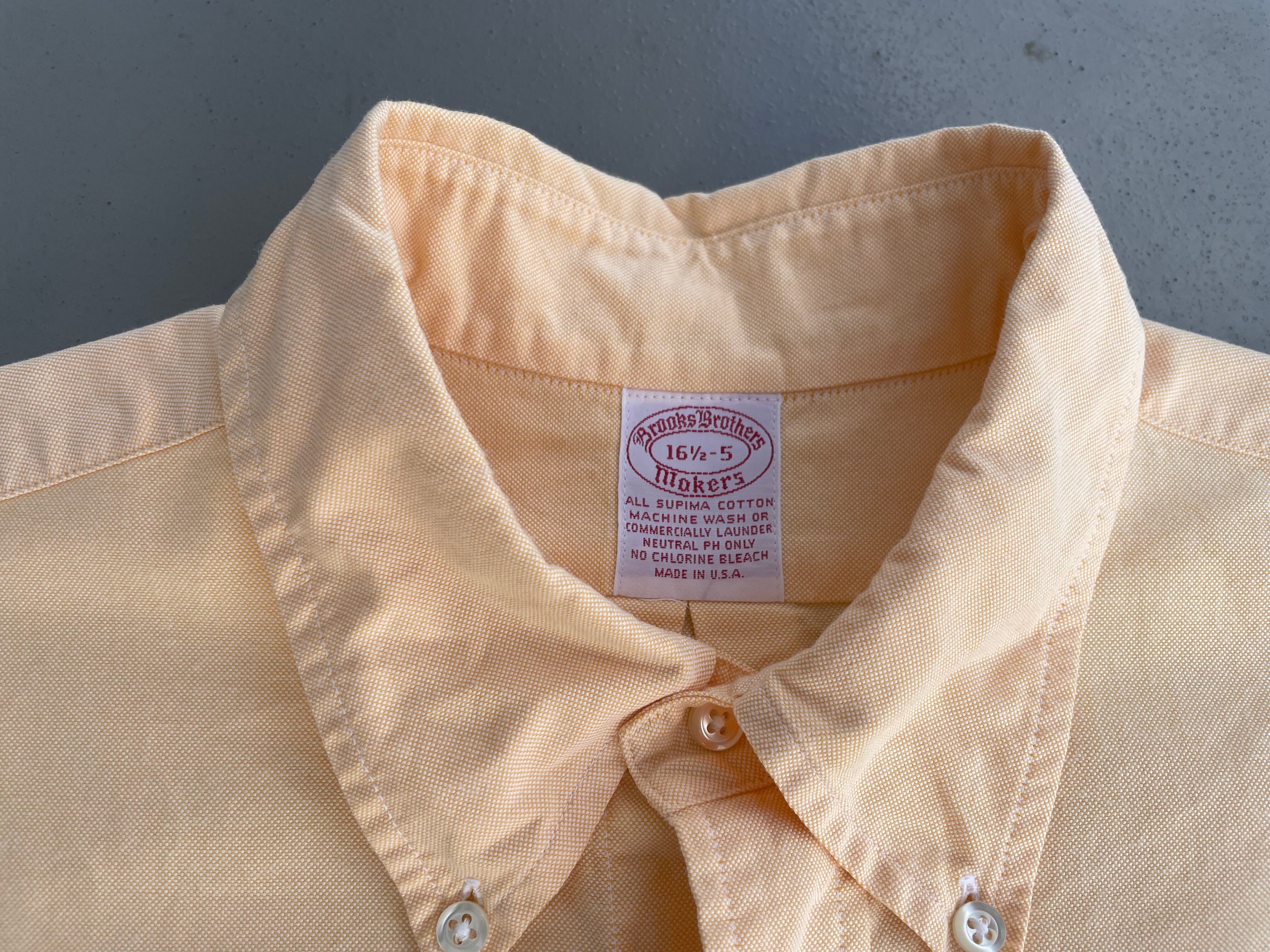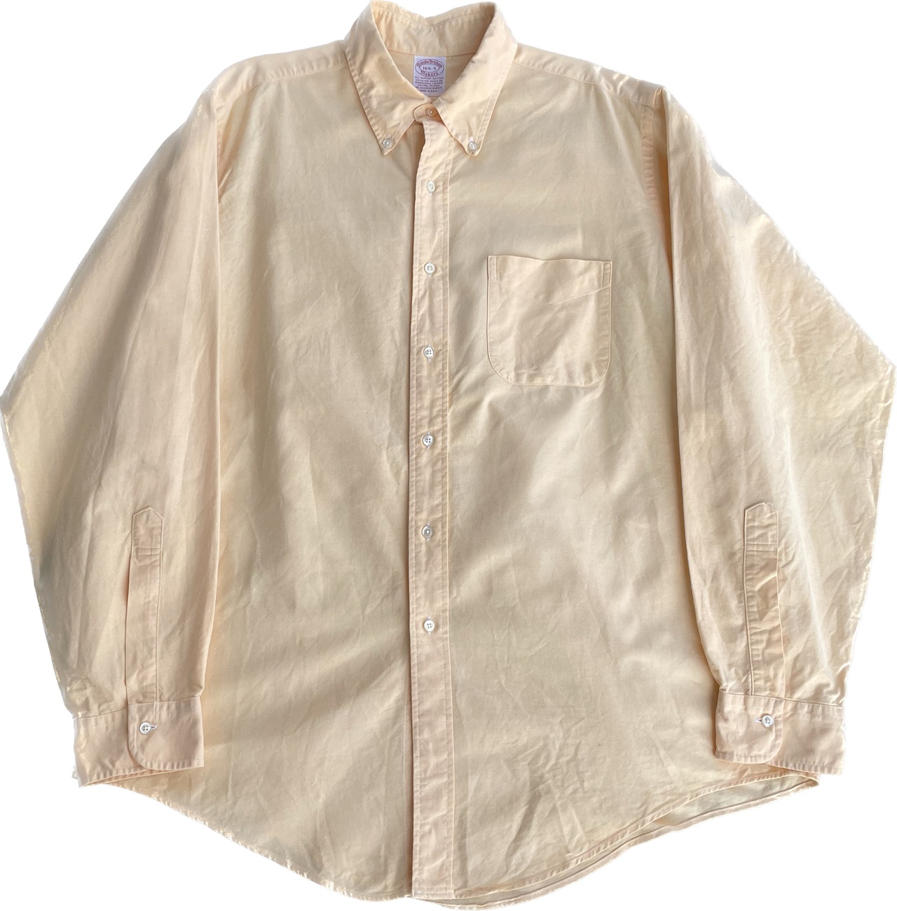 【商品詳細】ブルックスブラザーズのメーカーズオックスフォードシャツ。サイズは16 1/2-5。7つボタン。カラーはイエロー。80年代USA製。ビビットではないどこか大人感のあるイエローカラー。L〜XLのサイズ程のゆったり感で着用時の綺麗なラウンドシルエットが美しいです。もちろん袖部分のギャザーも健在。私的にもこのカラー大好きで着用してますが良い気分です。この辺は今後更に人気が出てきそうですね。