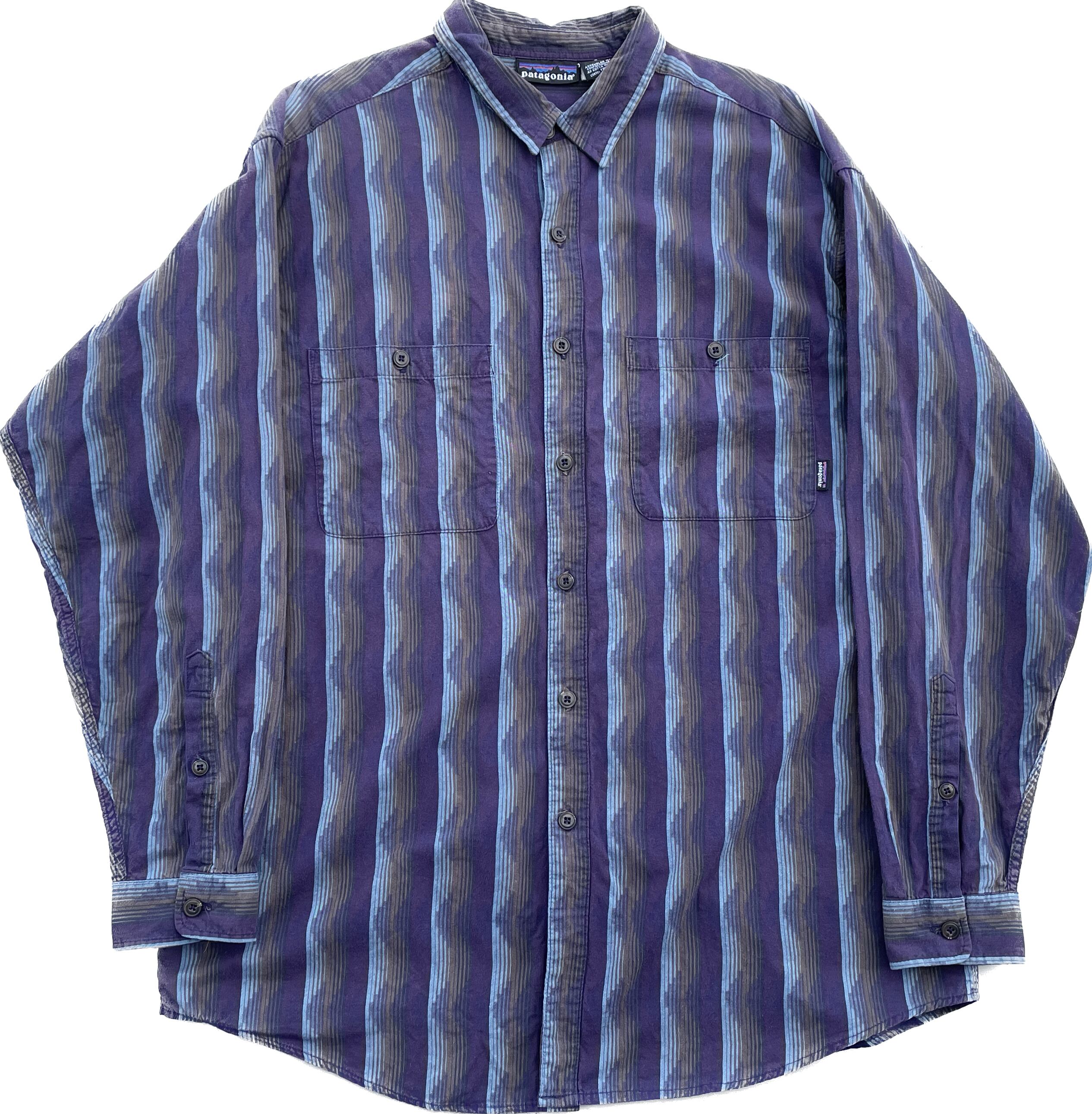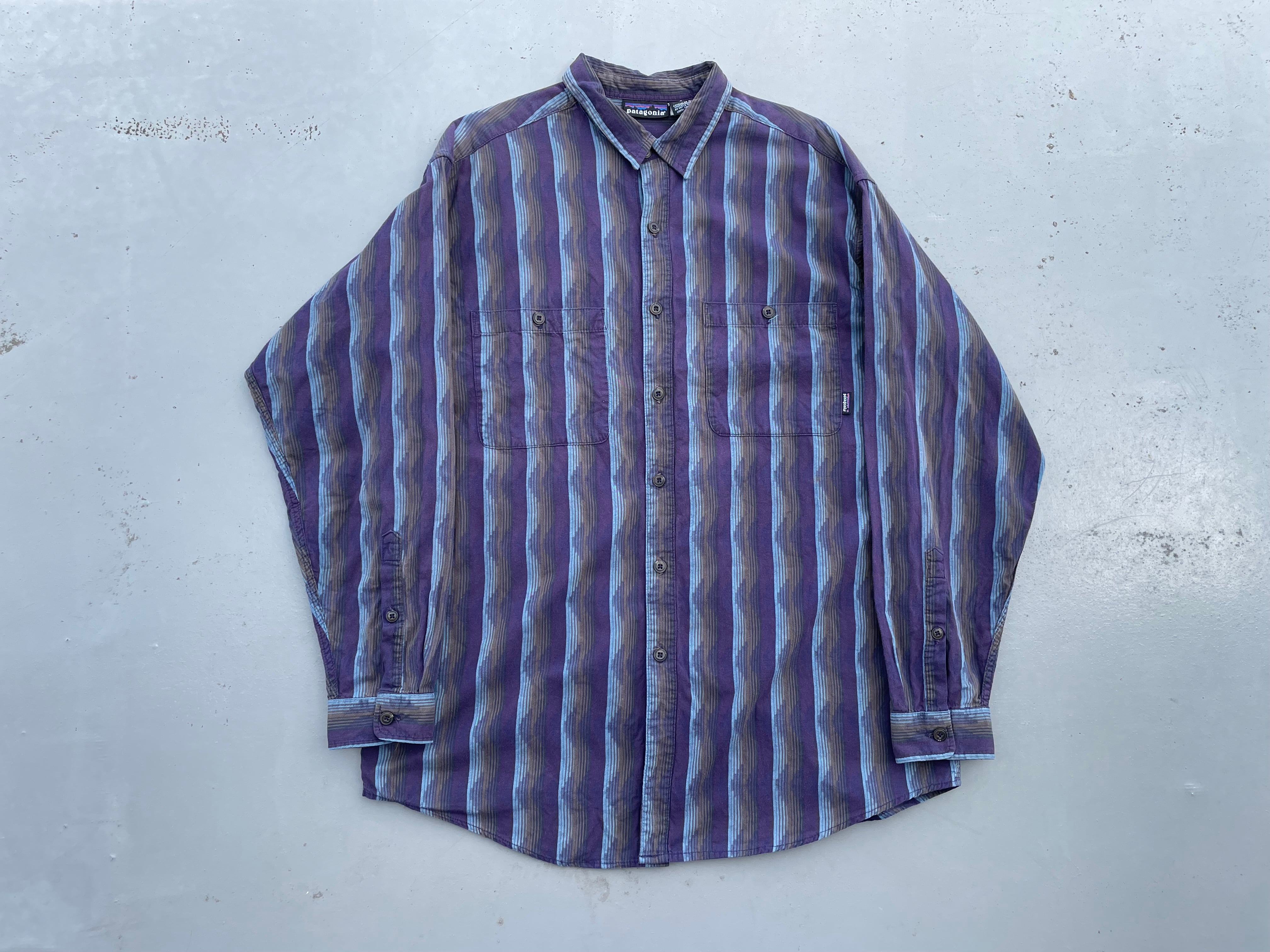 【商品詳細】パタゴニアのコットンストライプシャツ。カラーパープル×ブルー×ブラウン等のストライプパターン。サイズはL。93年コスタリカ製。ストライプベースに矢印に近い三角模様が総柄で入る洒落た1着。年代物ですが状態も良いです。サイズも大きめで需要の高い個体。