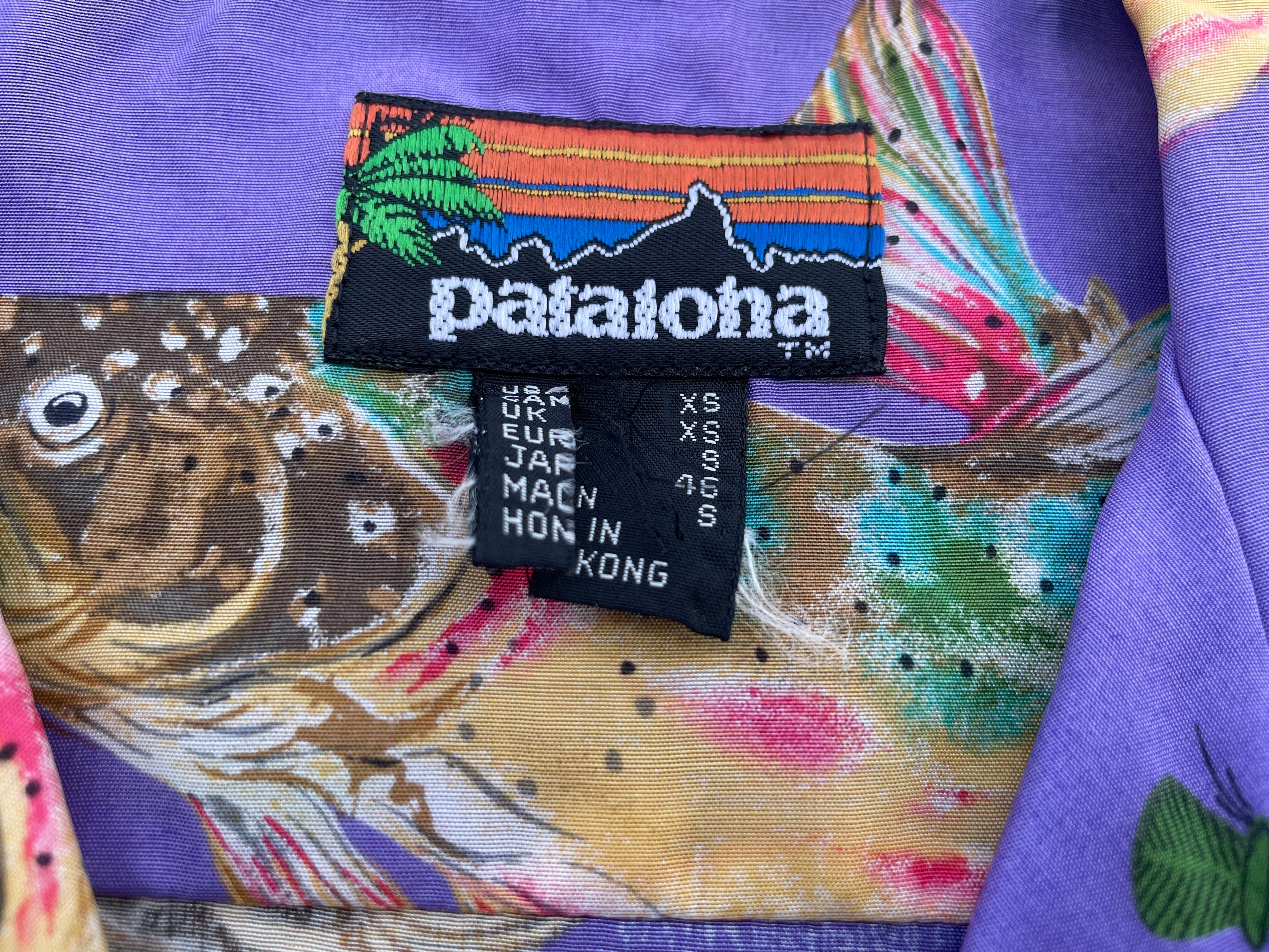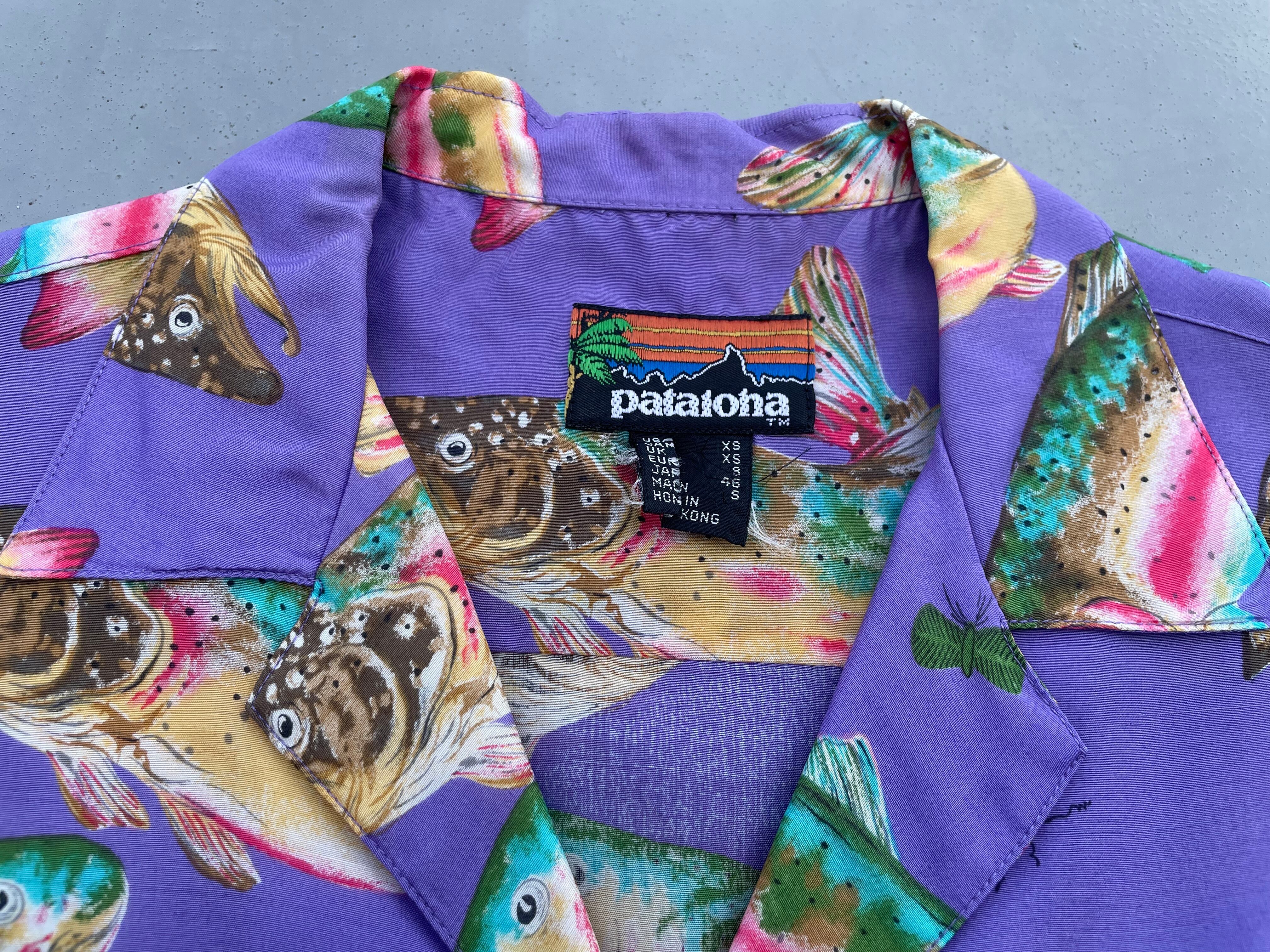 【商品詳細】パタゴニアの半袖アロハシャツ。カラーはパープル。サイズはS。80年代香港製。パタゴニアのアロハシャツシリーズ「Pataloha」の最初期”TROUT”。今では考えられないオールレーヨン地の個体。パープルカラーに鮮やかなトラウトが映えるデザイン。数あるパタゴニアのアロハシャツの中でも最高峰の1着だと思います。大きめなサイズが多い印象ですが、こちらは希少なSサイズでなかなか出ないと思います。Sサイズですがしっかりサイズもあります。シミ汚れありますが写真の通りあまり気にならない程度かと。