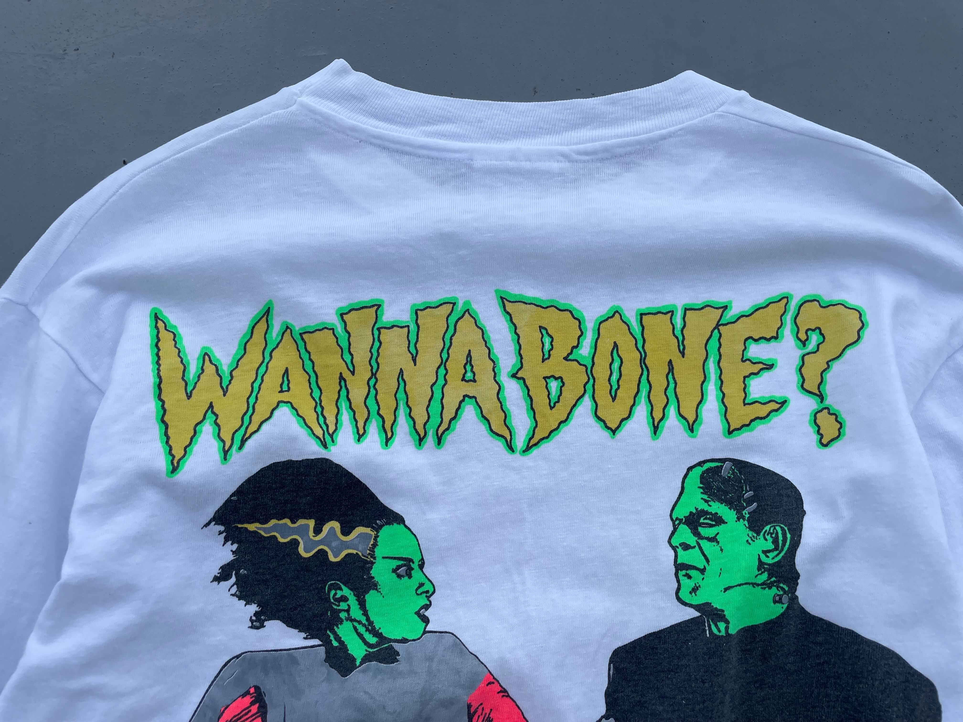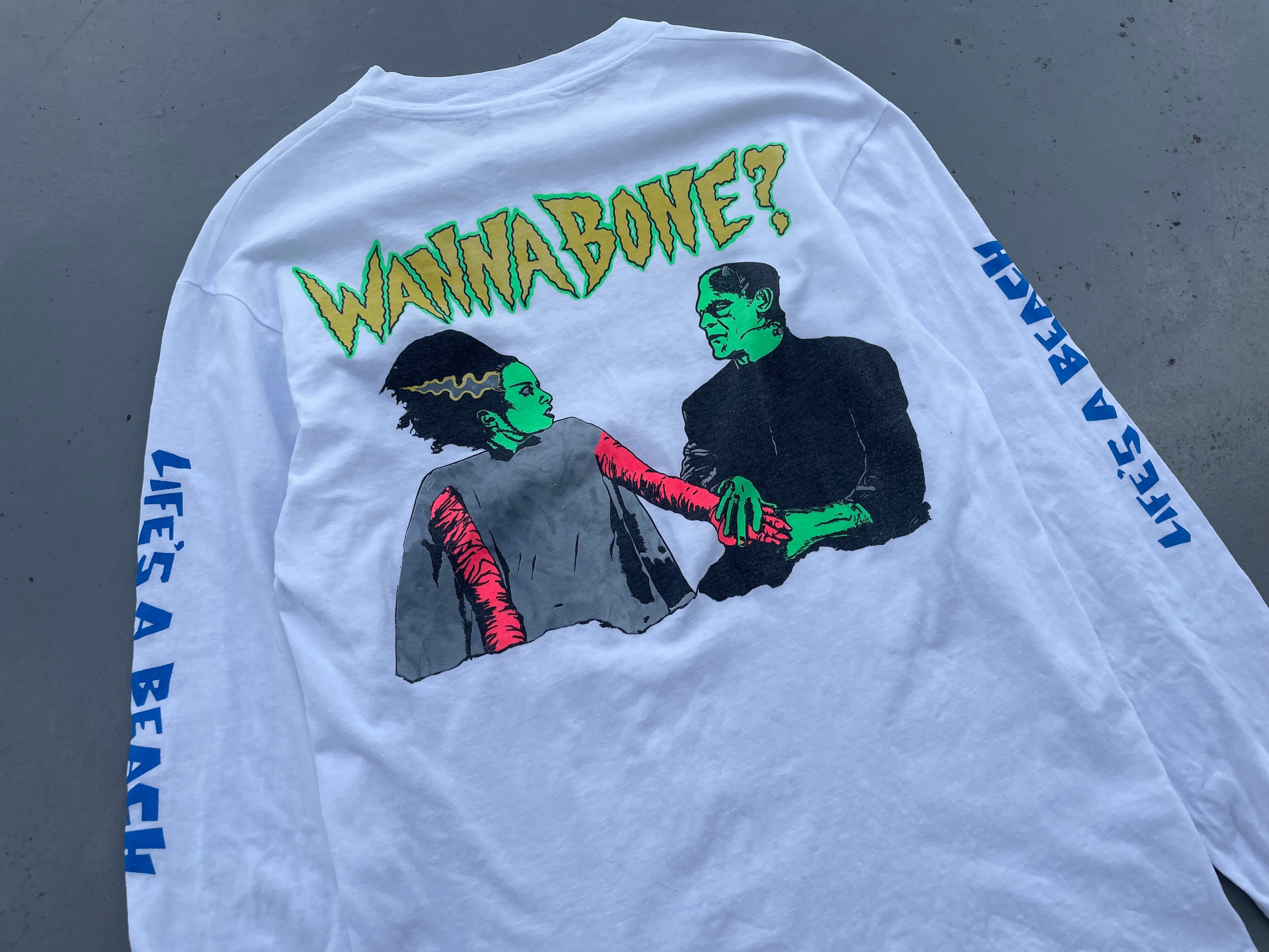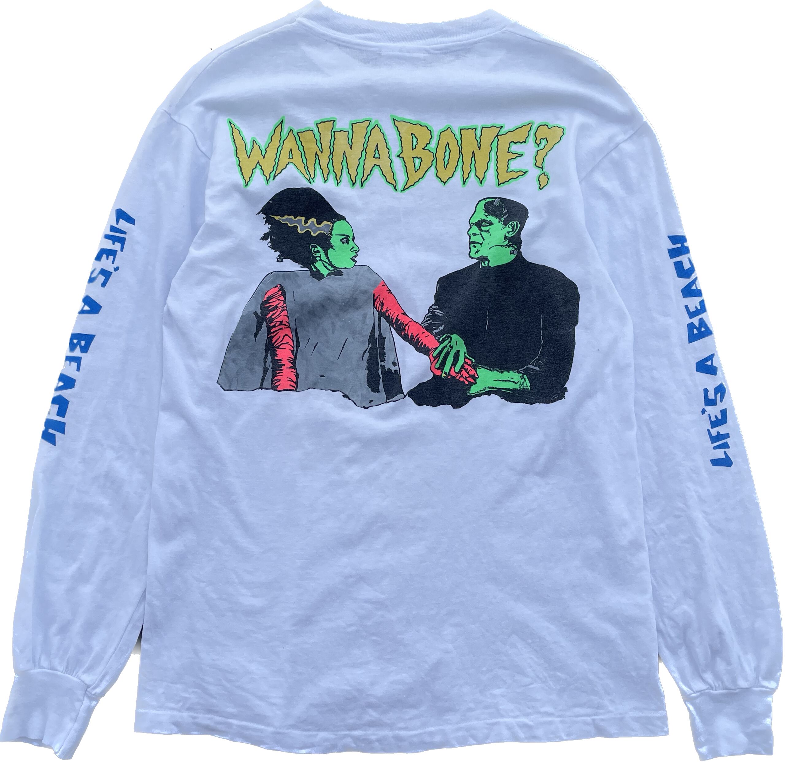 【商品詳細】ライフズアビーチの長袖Tシャツ。サイズはM。カラーはホワイト。90年代USA製。Hanesボディ。1935年に制作されたアメリカのホラー映画「Bride of Frankenstein(フランケンシュタインの花嫁)」の登場人物であるフランケンシュタインと花嫁が映る映画のワンシーンがプリントされたデザイン。両袖にはブランドロゴがプリントされた豪華な仕様。これは良いです。