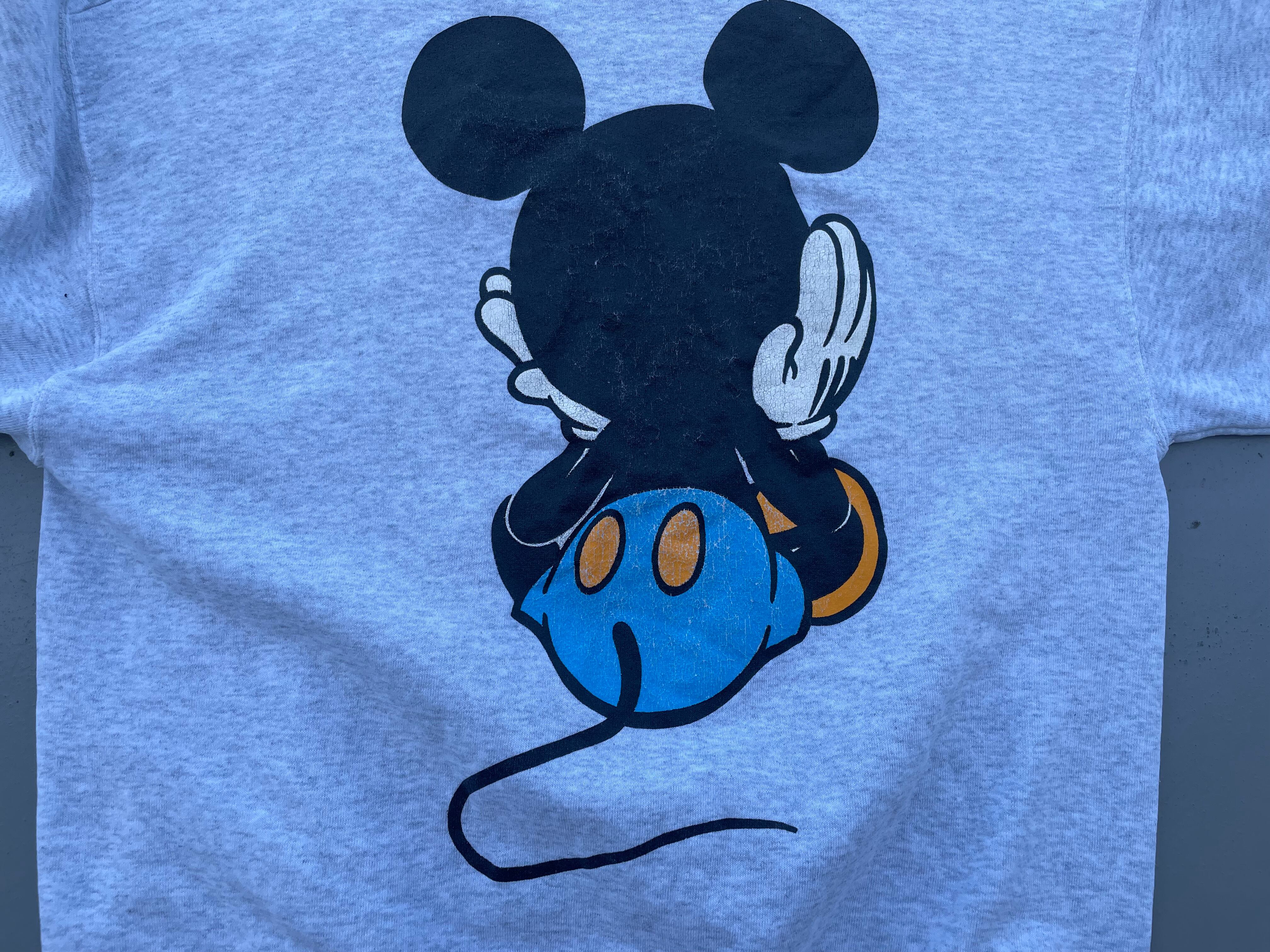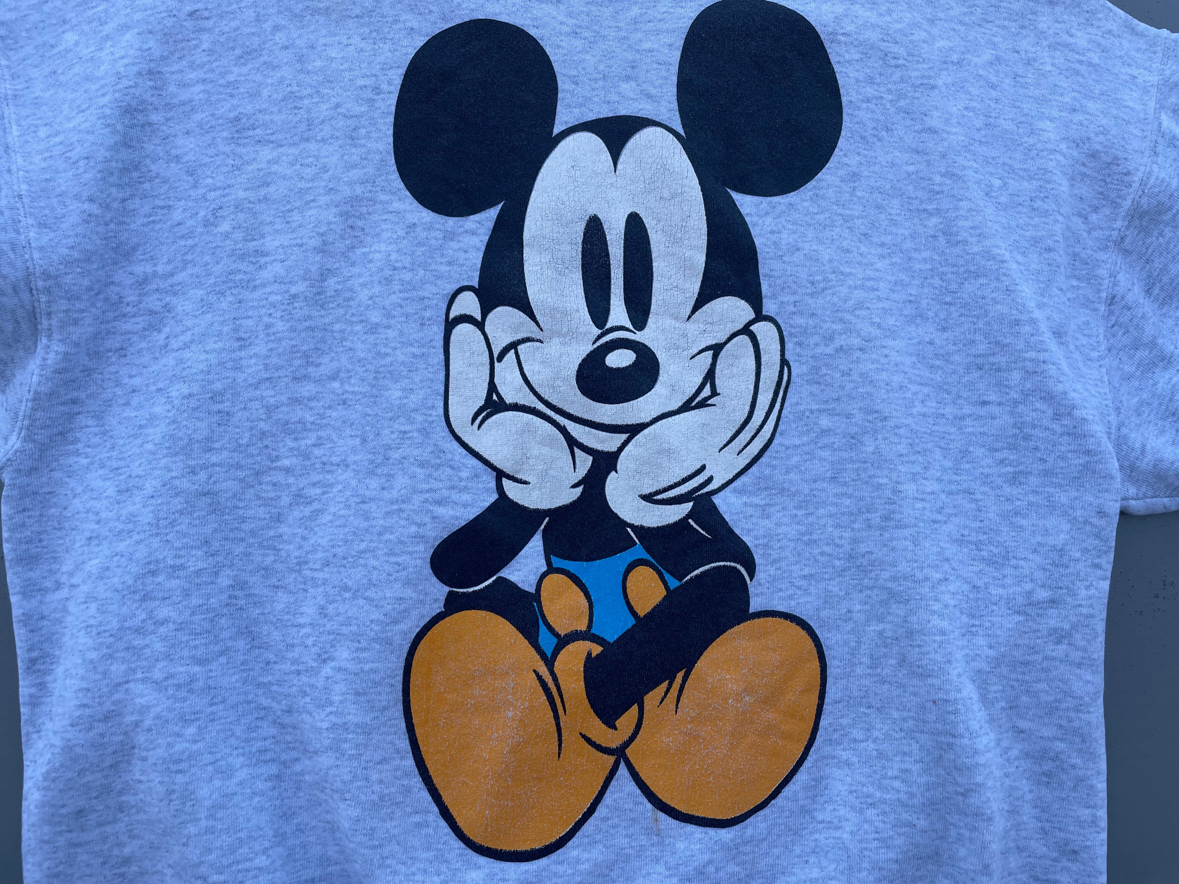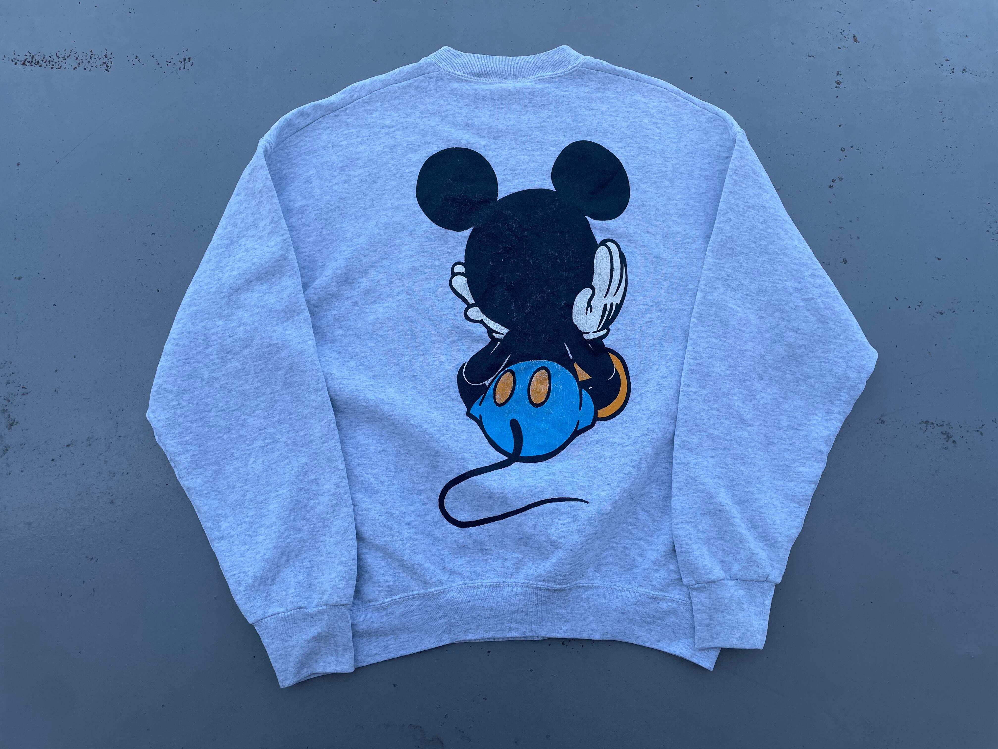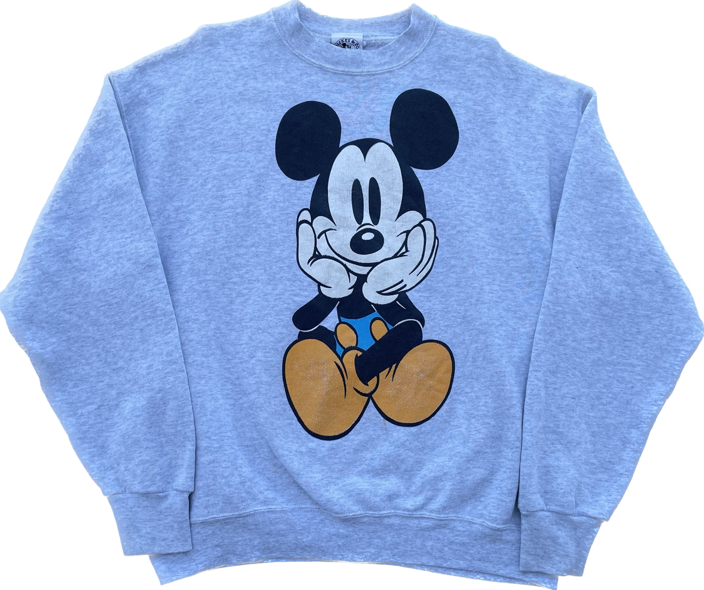 【商品詳細】ディズニーデザインズの長袖スウェットシャツ。サイズは実寸XL程。90年代製。カラーはヘザーグレー。人気の青パンミッキープリント物。豪華な両面プリント仕様。Tシャツよりも見ないですね。年々人気と価格が上がっているデザイン。良い具合にプリントも擦れており良い雰囲気です。