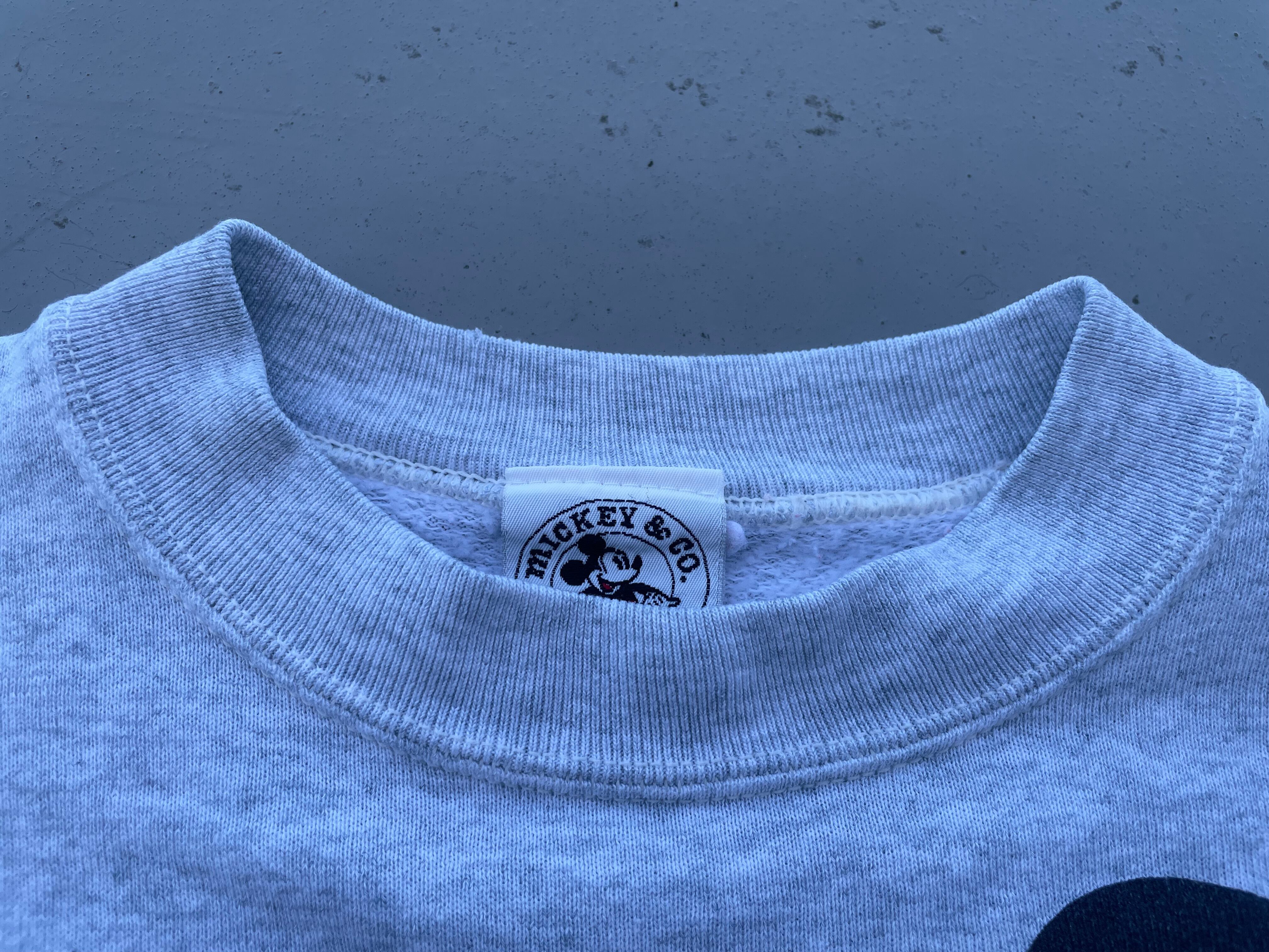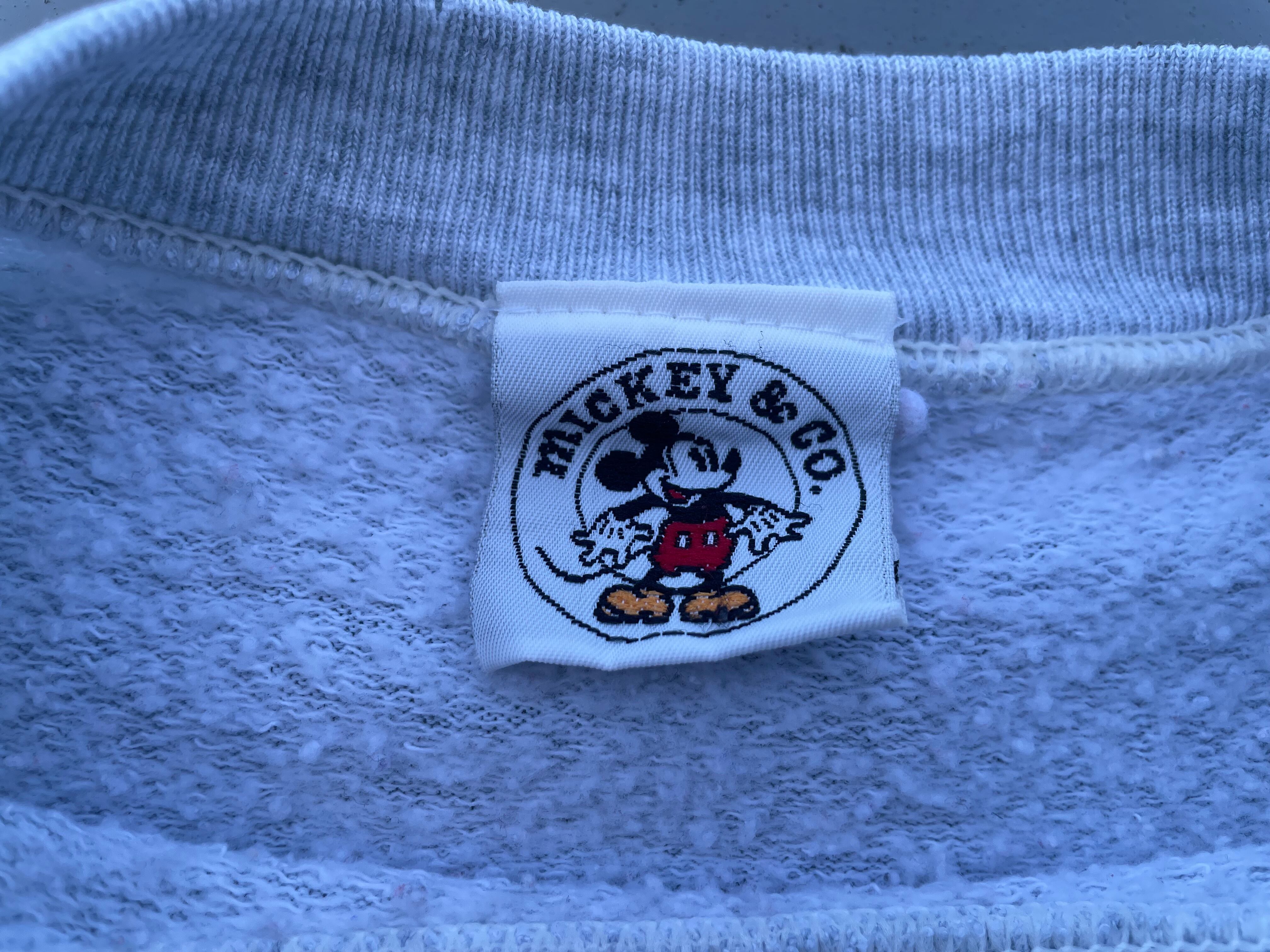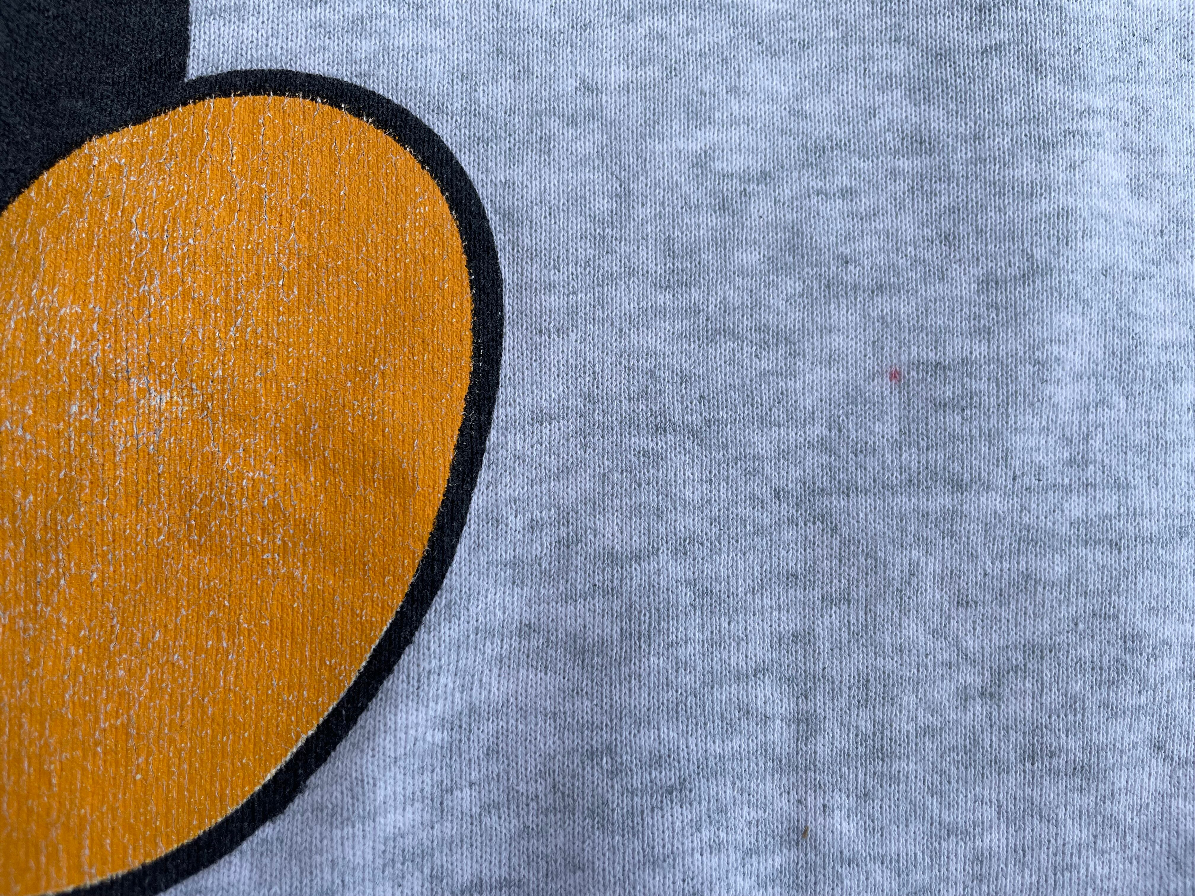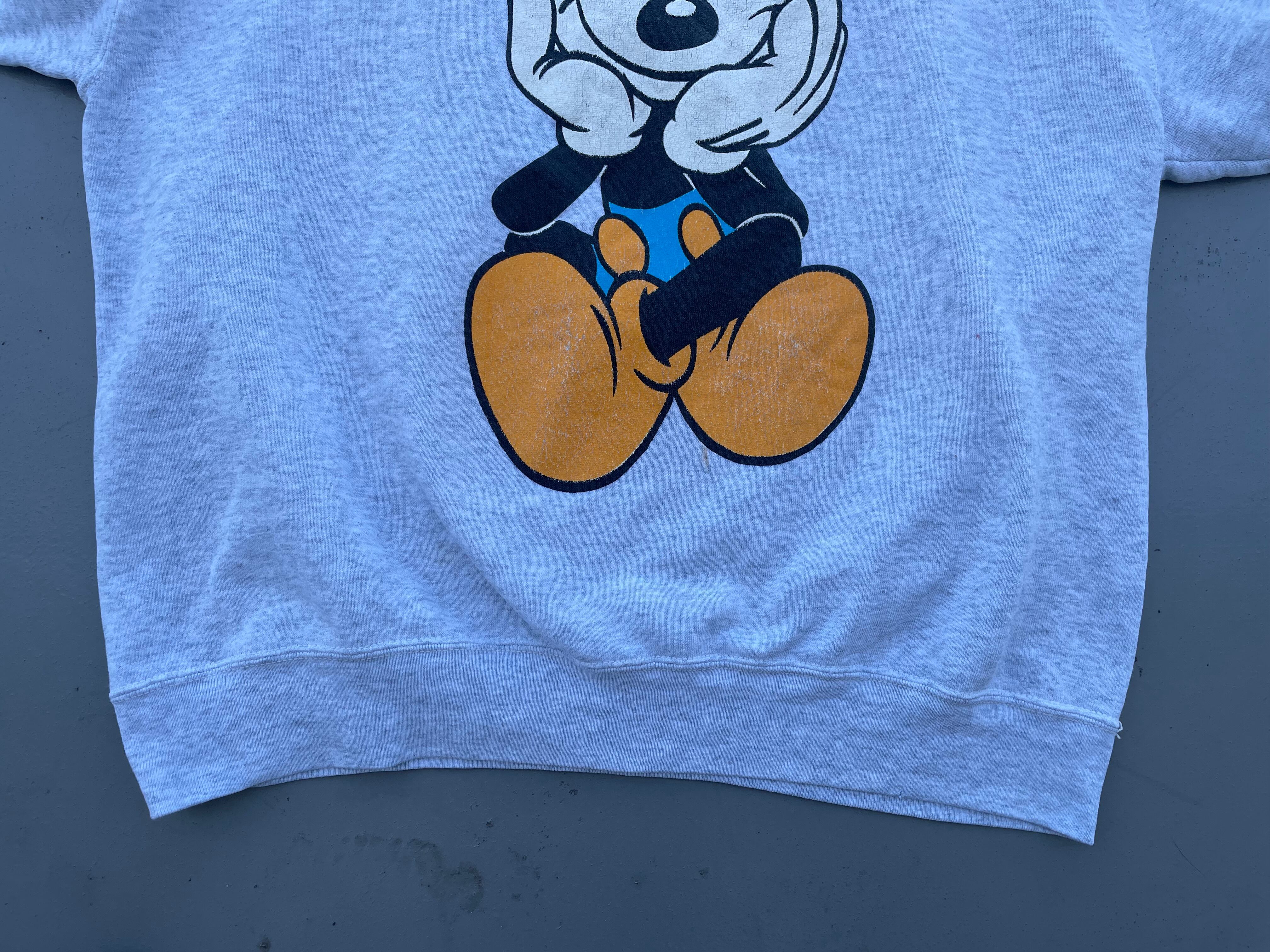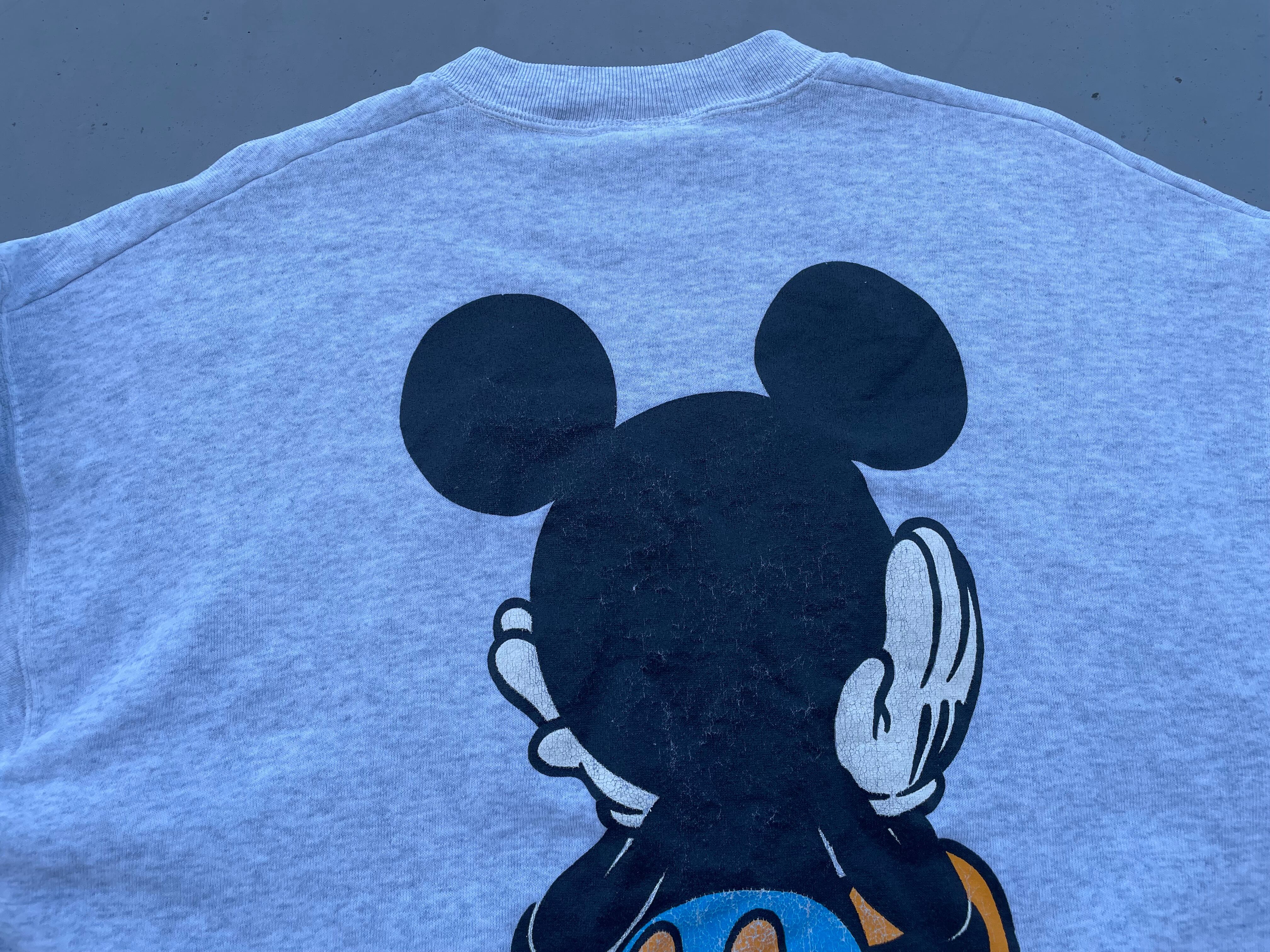 【商品詳細】ディズニーデザインズの長袖スウェットシャツ。サイズは実寸XL程。90年代製。カラーはヘザーグレー。人気の青パンミッキープリント物。豪華な両面プリント仕様。Tシャツよりも見ないですね。年々人気と価格が上がっているデザイン。良い具合にプリントも擦れており良い雰囲気です。