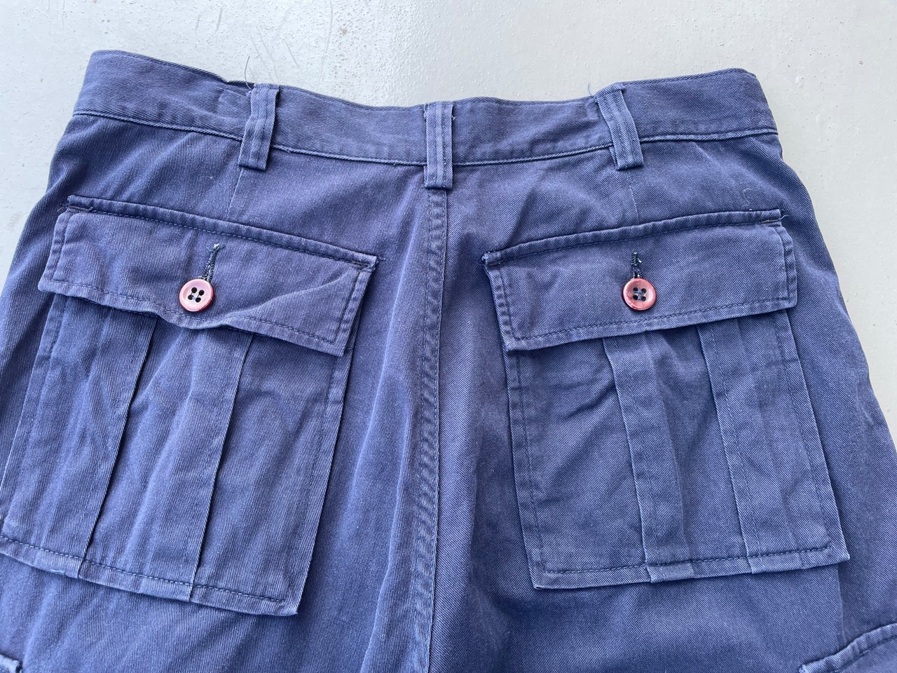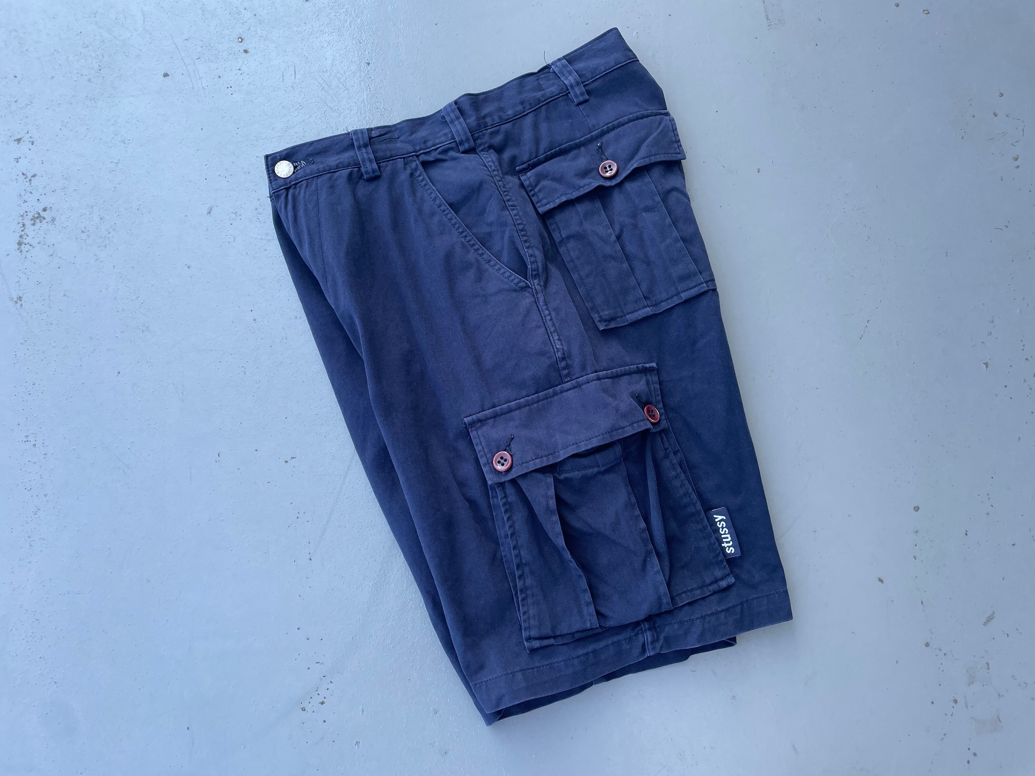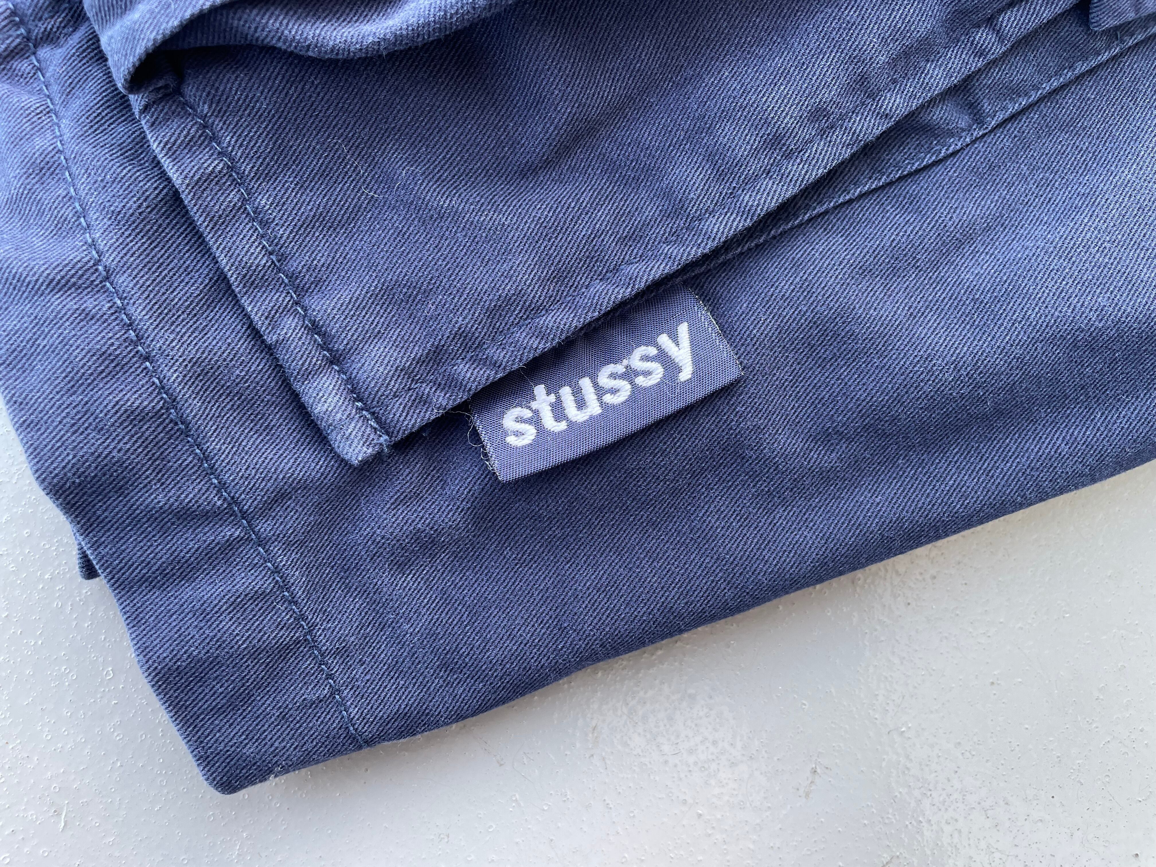 【商品詳細】ステューシーのカーゴショートパンツ。カラーは茄子紺。90年代USA製。色気のあるパープルカラーと男気あるカーゴパンツを組み合わせたグッとくる一本。ボタンも赤みの強いパープルカラーで存在感あります。色も残っておりこれから色落ちも楽しめそうです。
