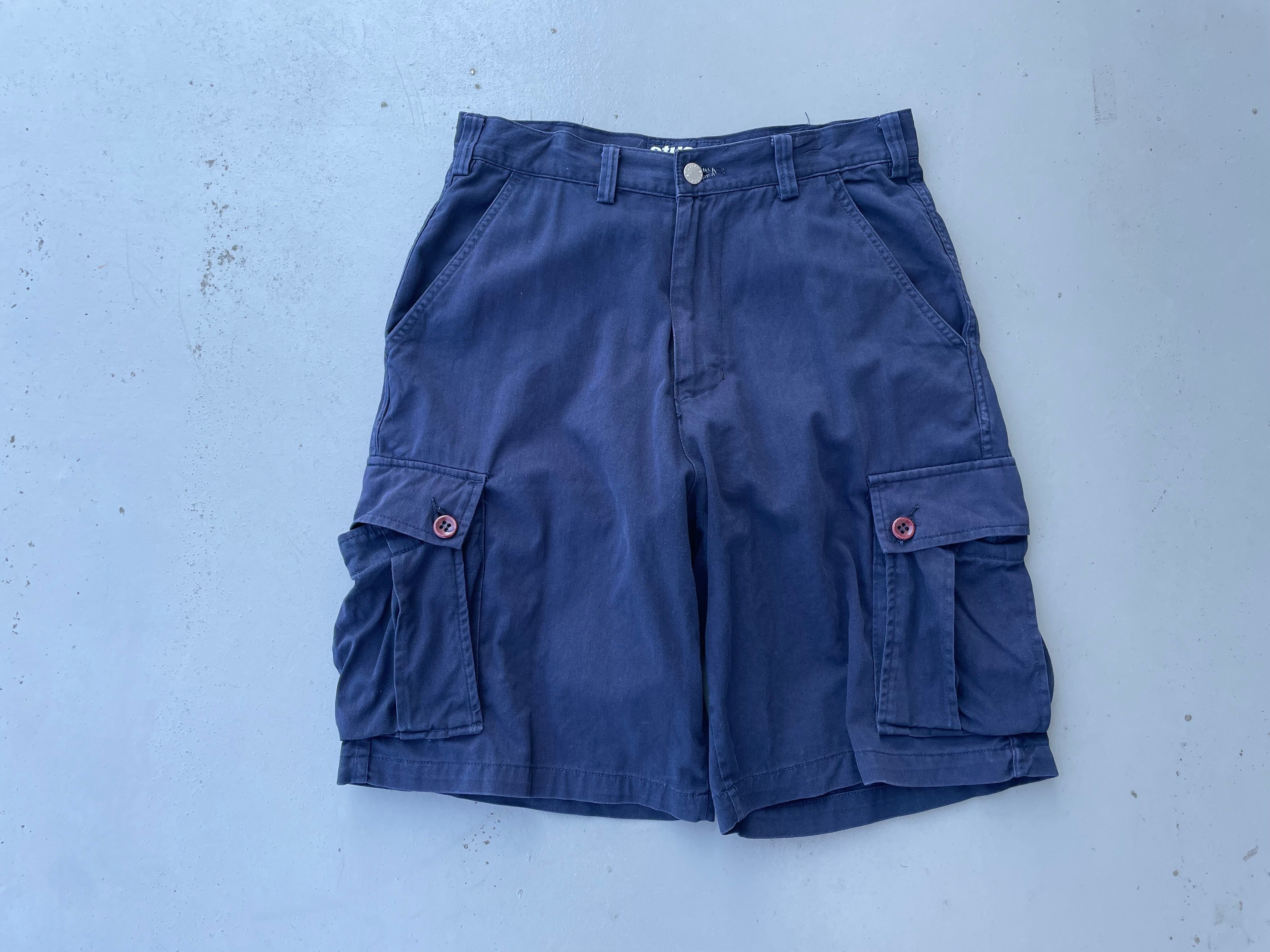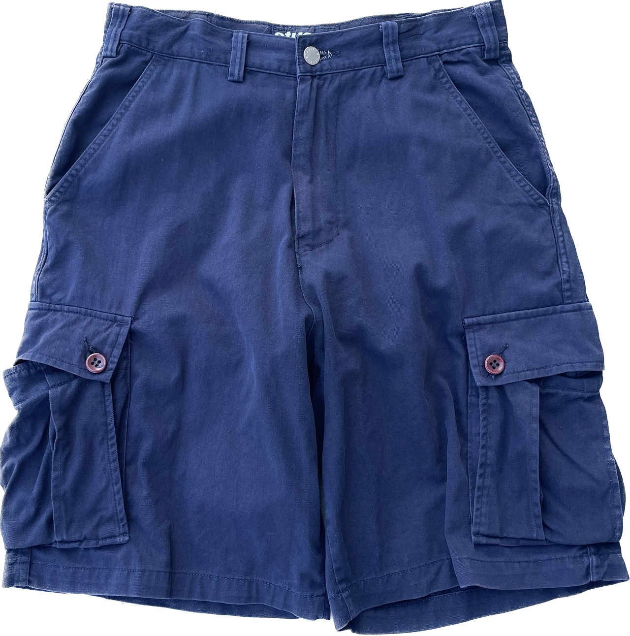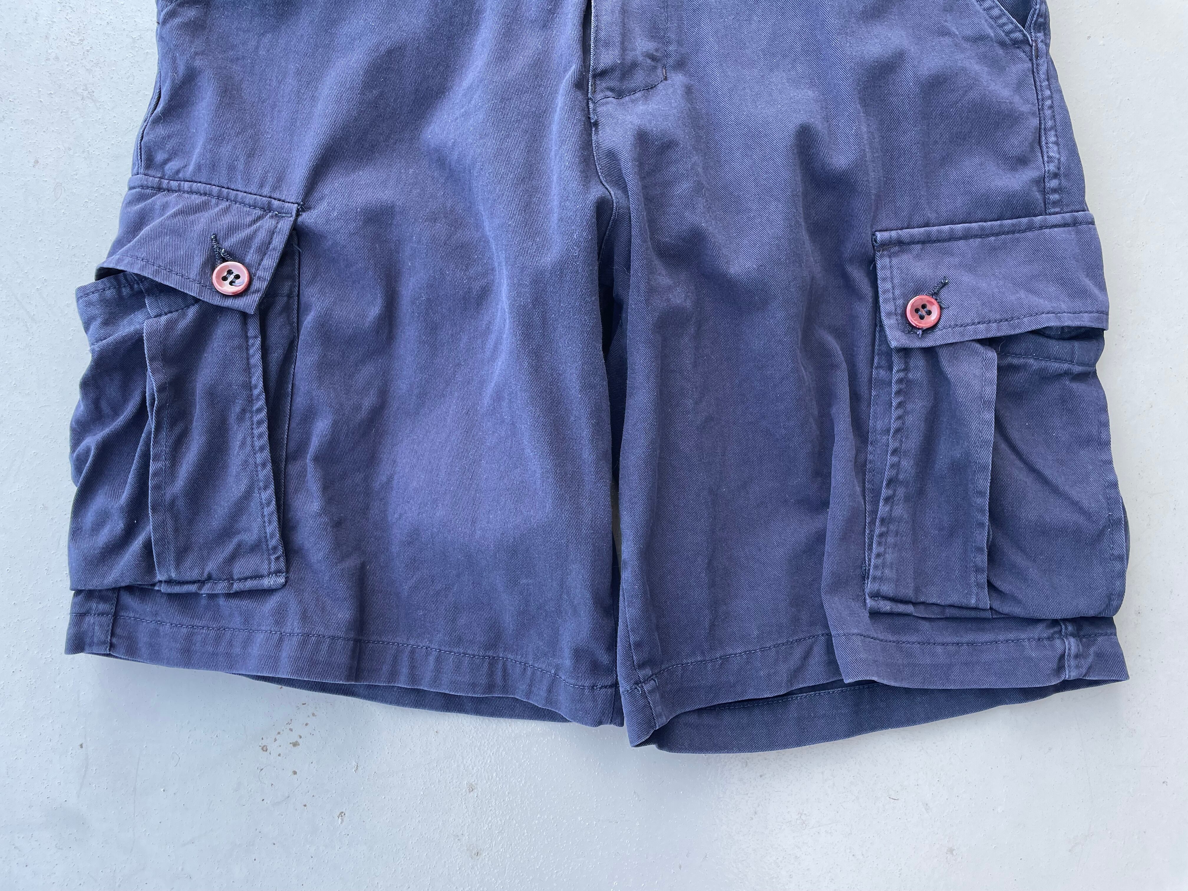 【商品詳細】ステューシーのカーゴショートパンツ。カラーは茄子紺。90年代USA製。色気のあるパープルカラーと男気あるカーゴパンツを組み合わせたグッとくる一本。ボタンも赤みの強いパープルカラーで存在感あります。色も残っておりこれから色落ちも楽しめそうです。