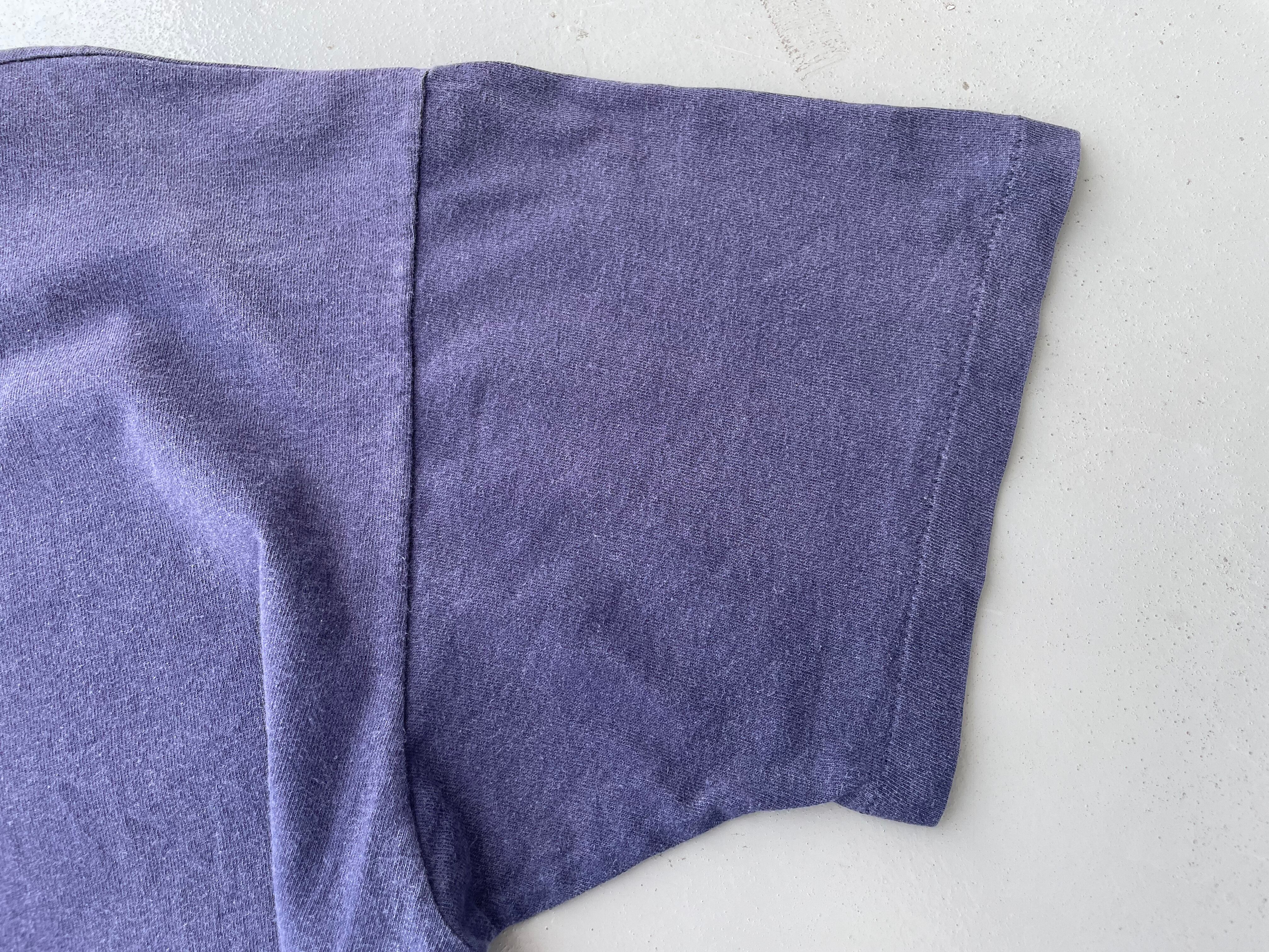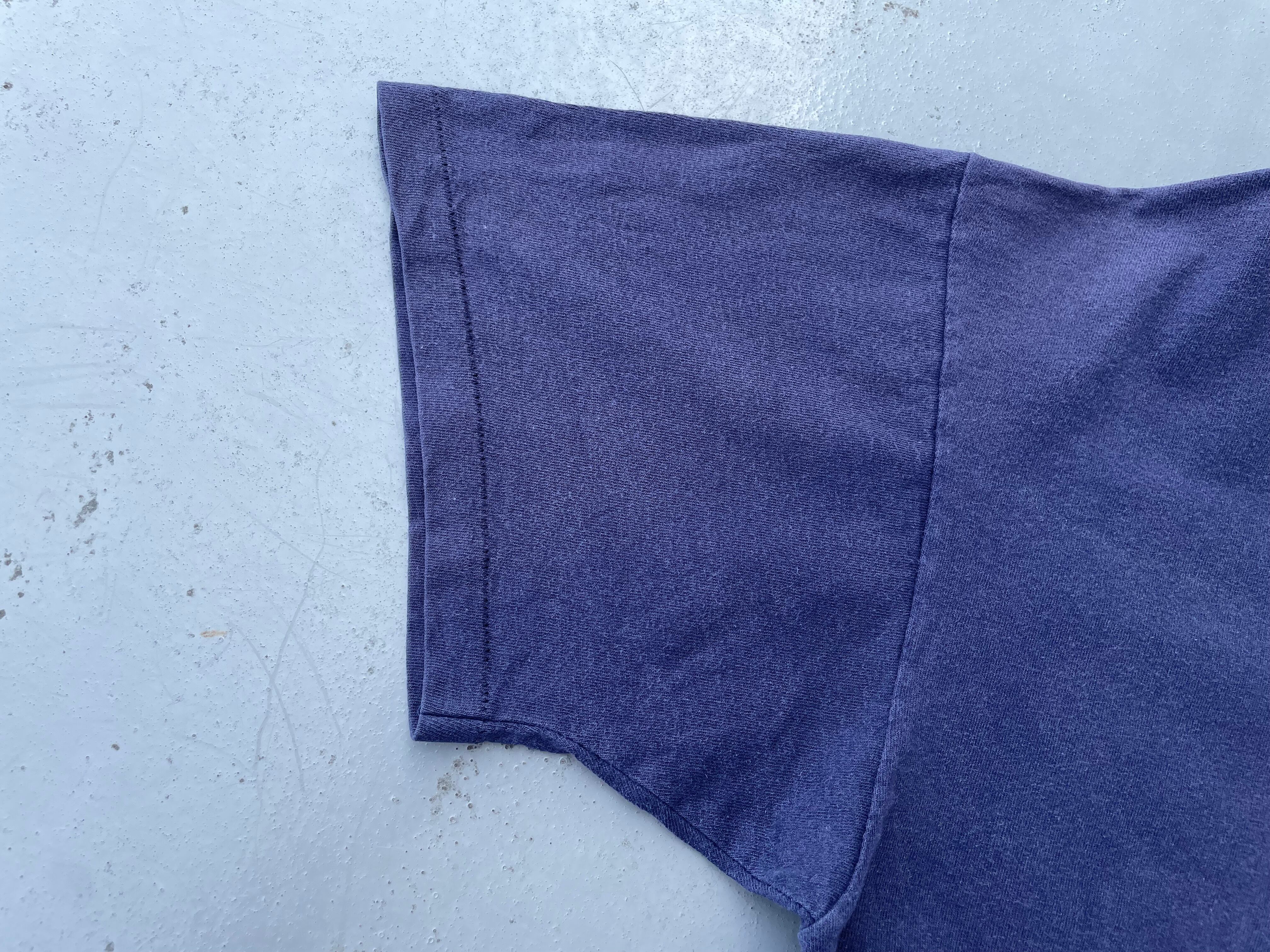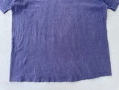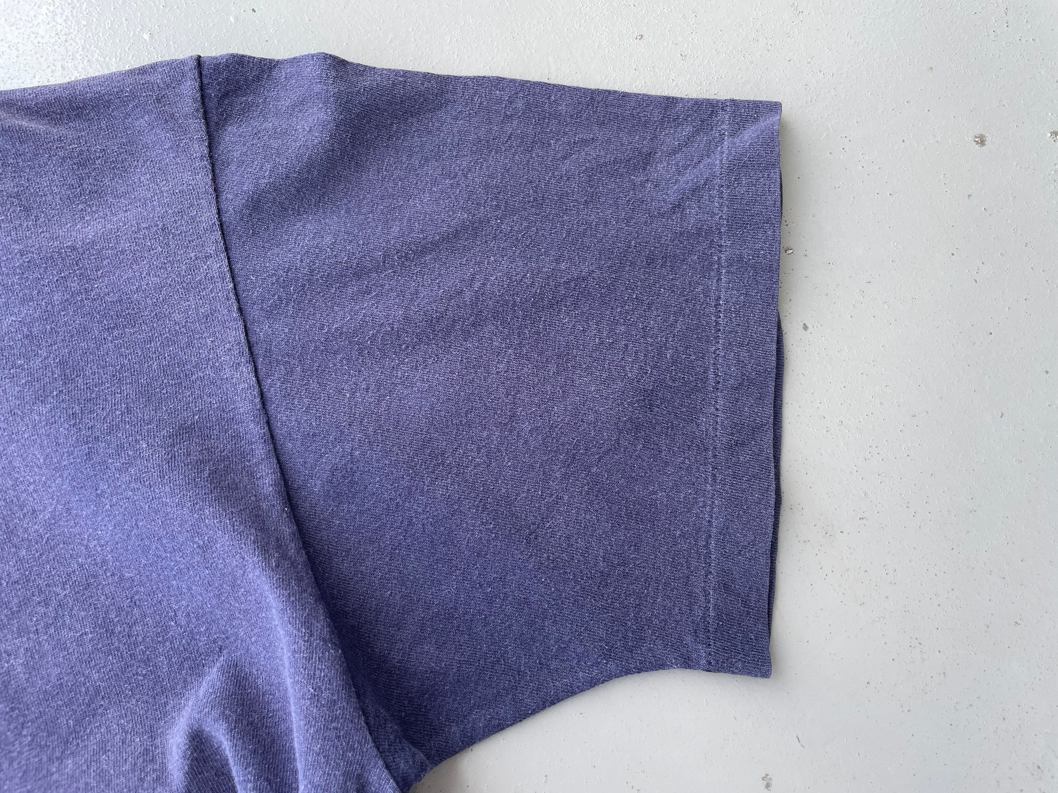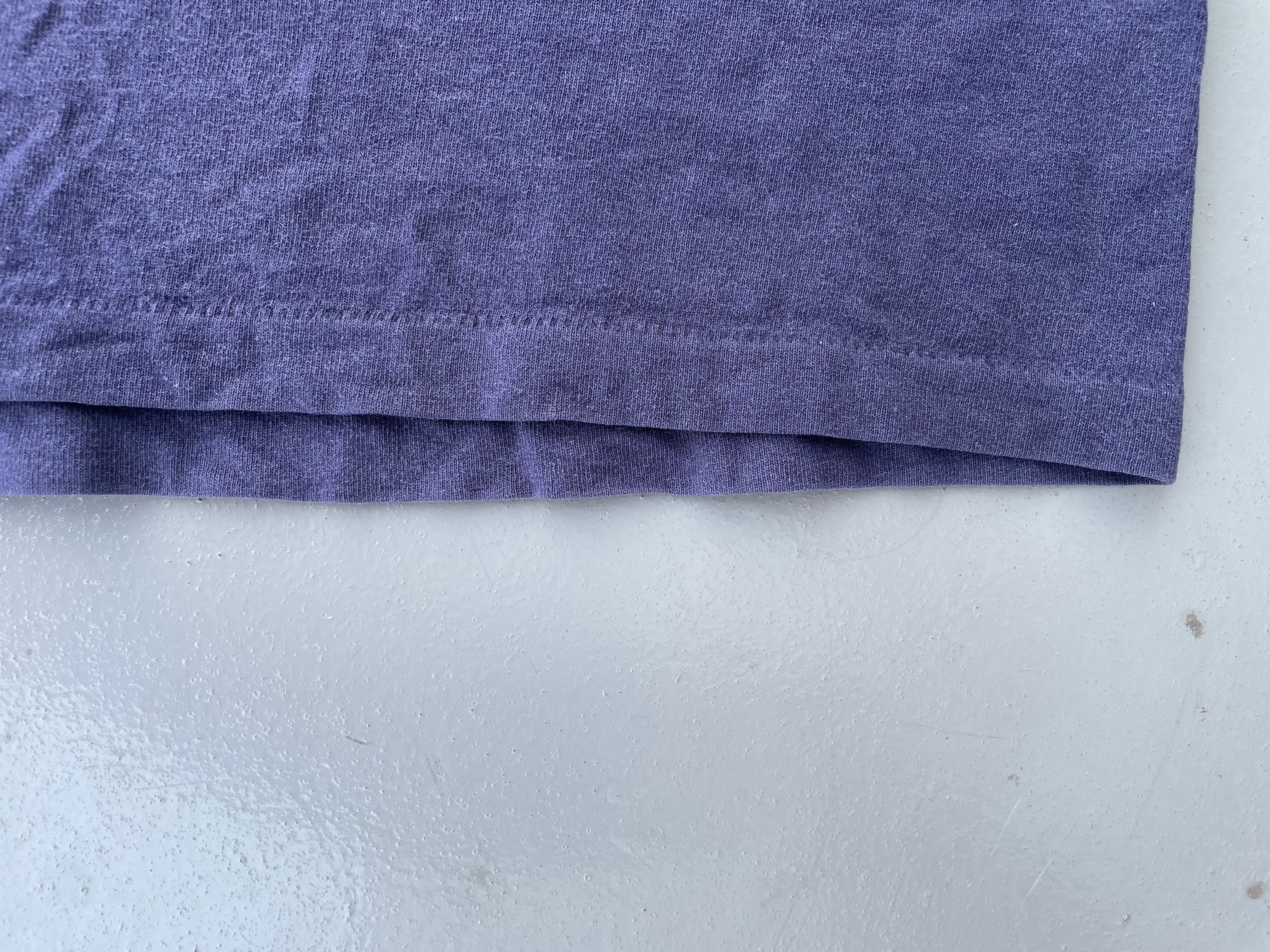 【商品詳細】アンビルの半袖Tシャツ。サイズはXL。カラーは茄子紺。90年代USA製。裾・袖シングルステッチ。セサミストリートの作中に出演するキャラクターのエルモがデニムパンツを履いたファッショナブルなプリント。エルモの表情がどこか哀愁やサイコ感を感じます。ボディのカラーがとにかく良いです。しっかりサイズ大きめ。
