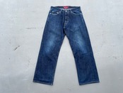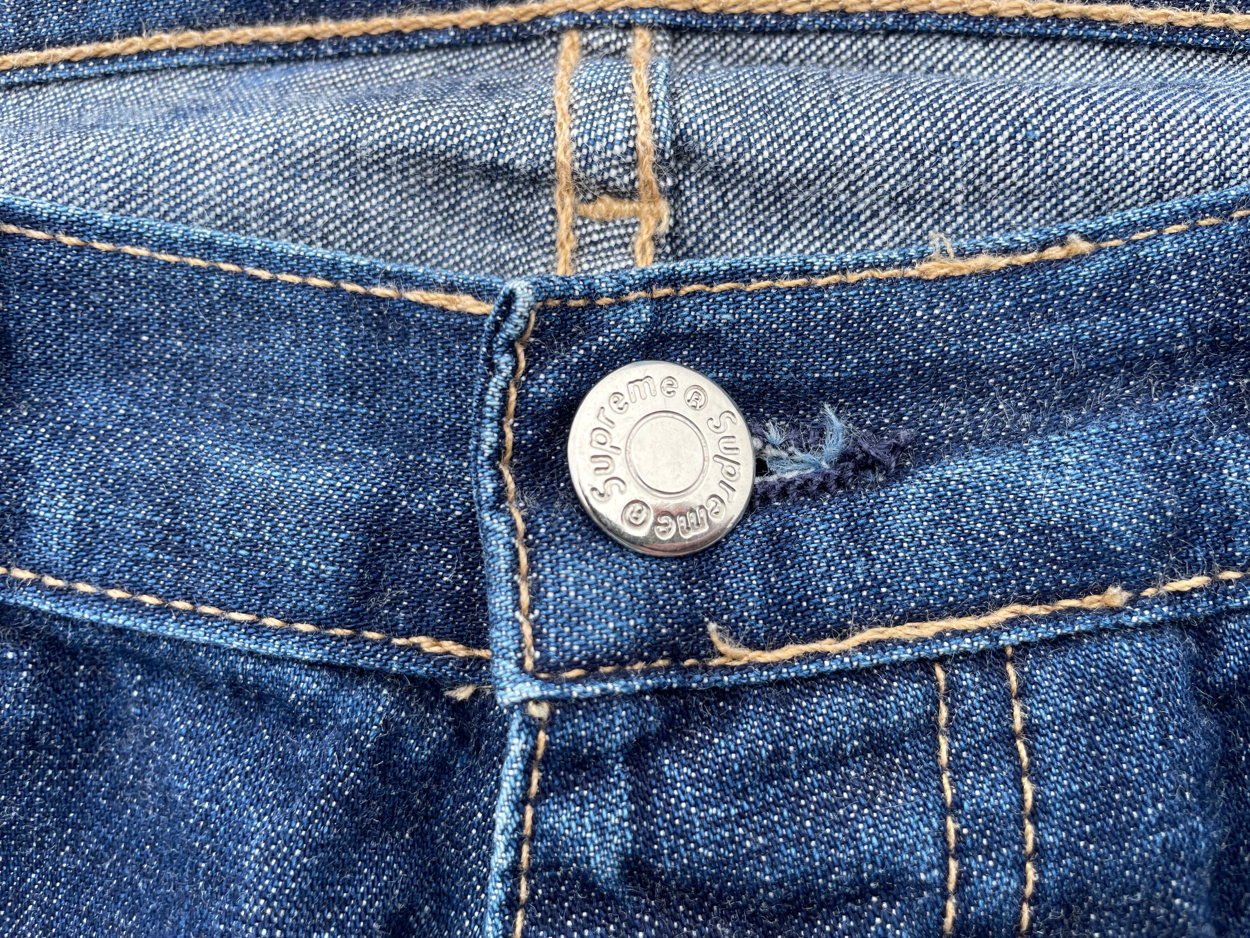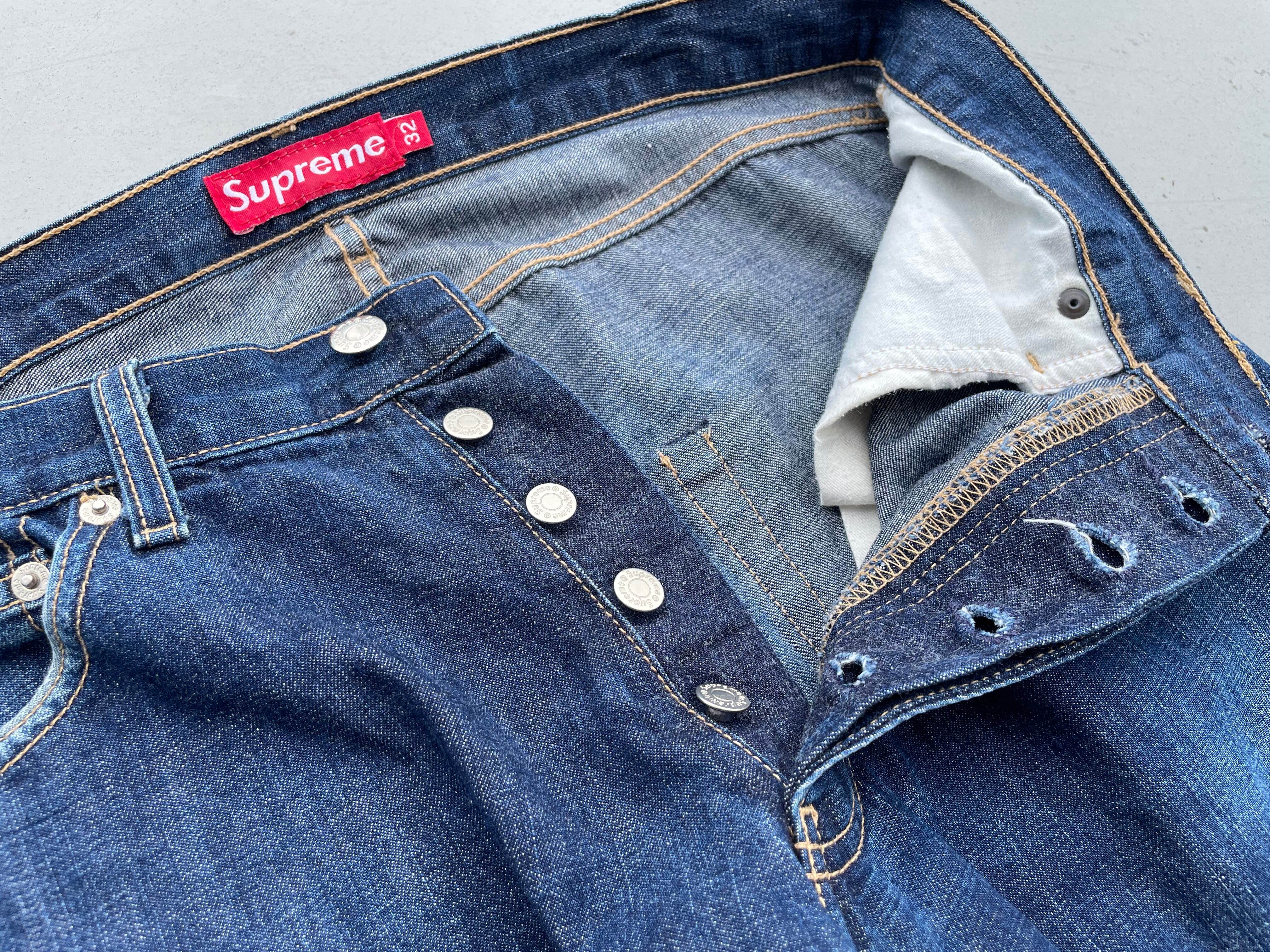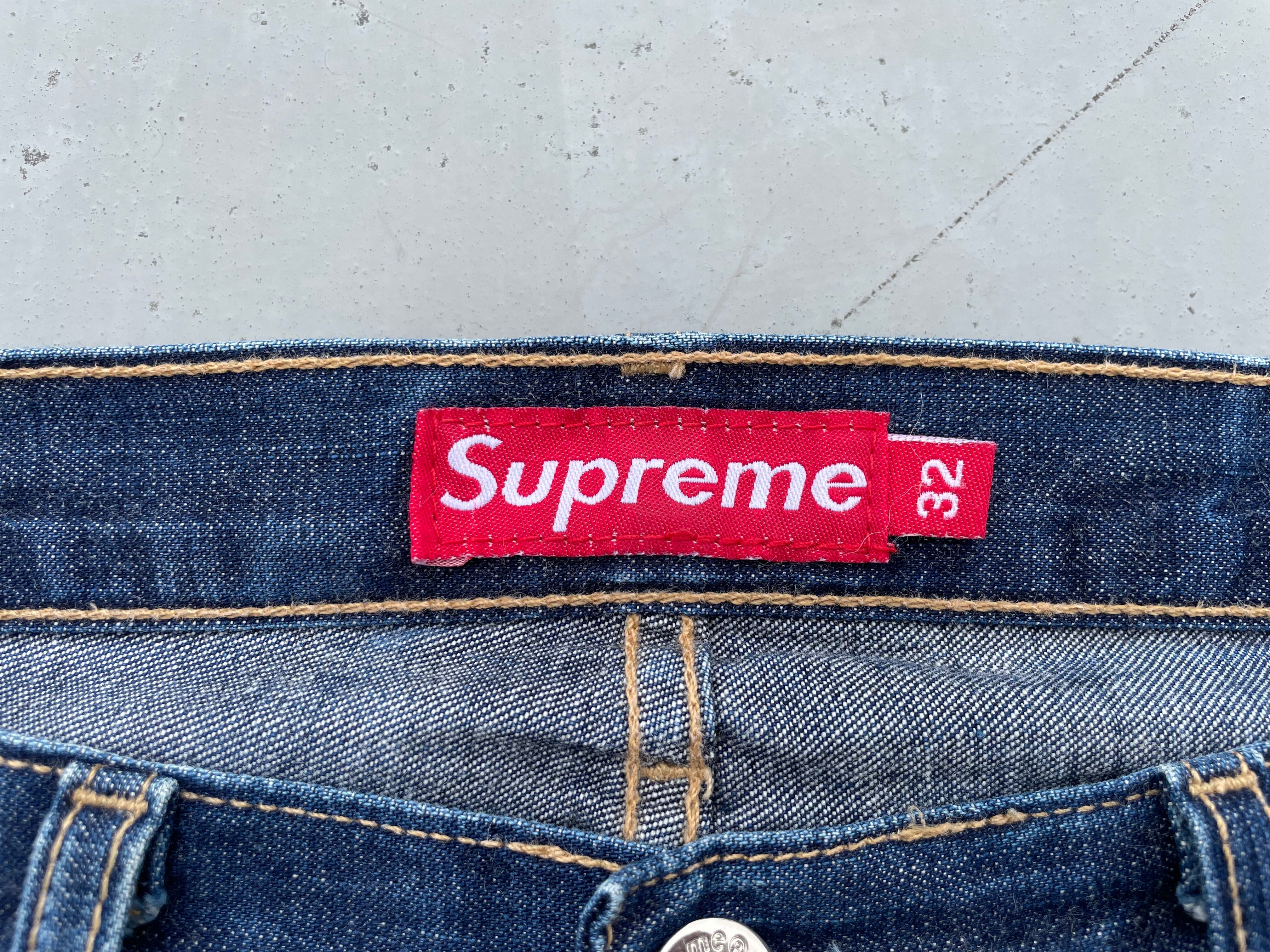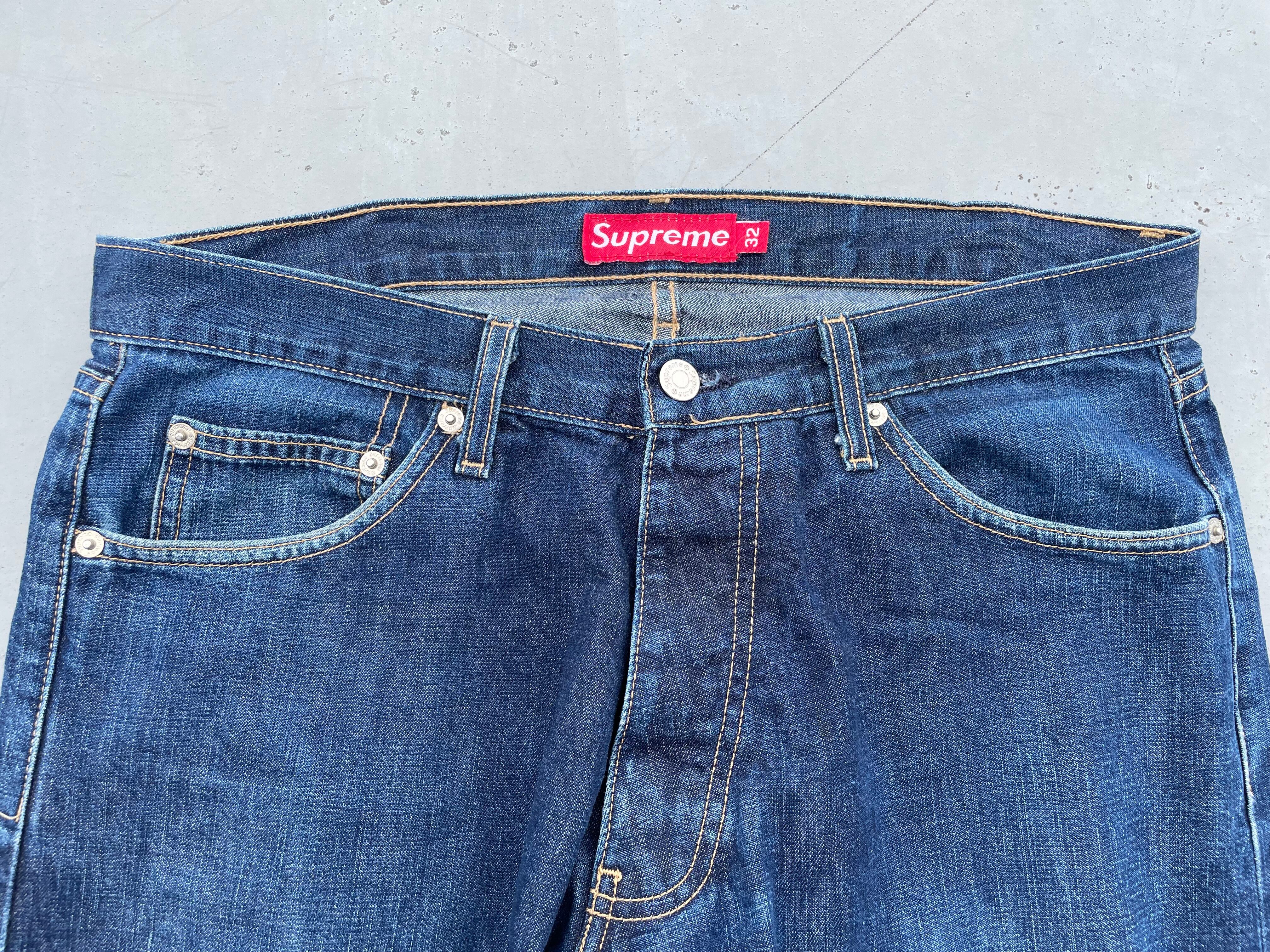 【商品詳細】シュプリームのデニムパンツ。カラーはブルー。サイズは32。90年代USA製。赤耳付。人気のオールドシュプリームのデニムパンツ。ストンと落ちる綺麗なシルエットですがどこかリラックス感のある印象のディテール◎太もも〜膝付近が良い塩梅にエイジングしており雰囲気あります。全体的に色も残っているのでこれから色落ちも楽しめると思います。おすすめ。
