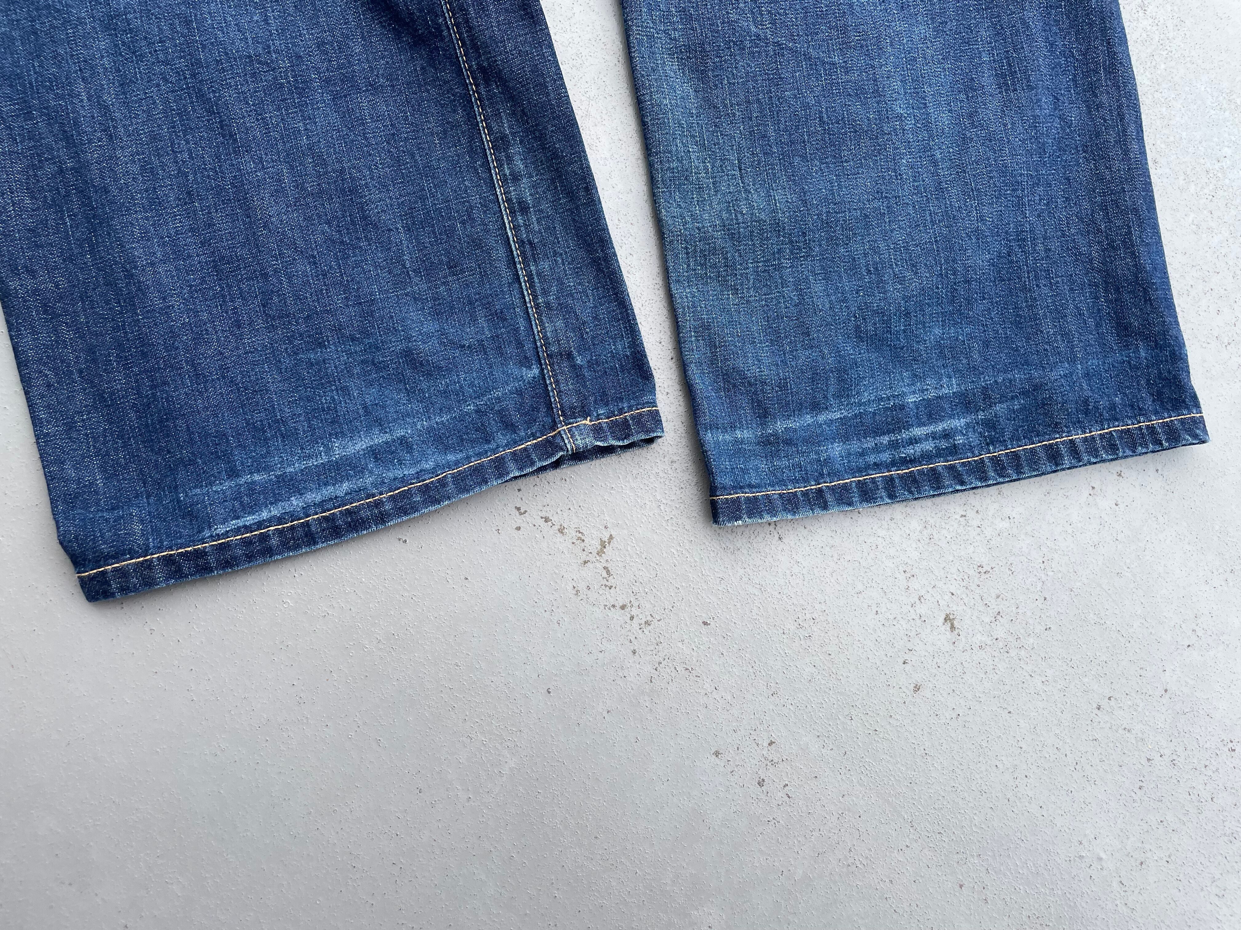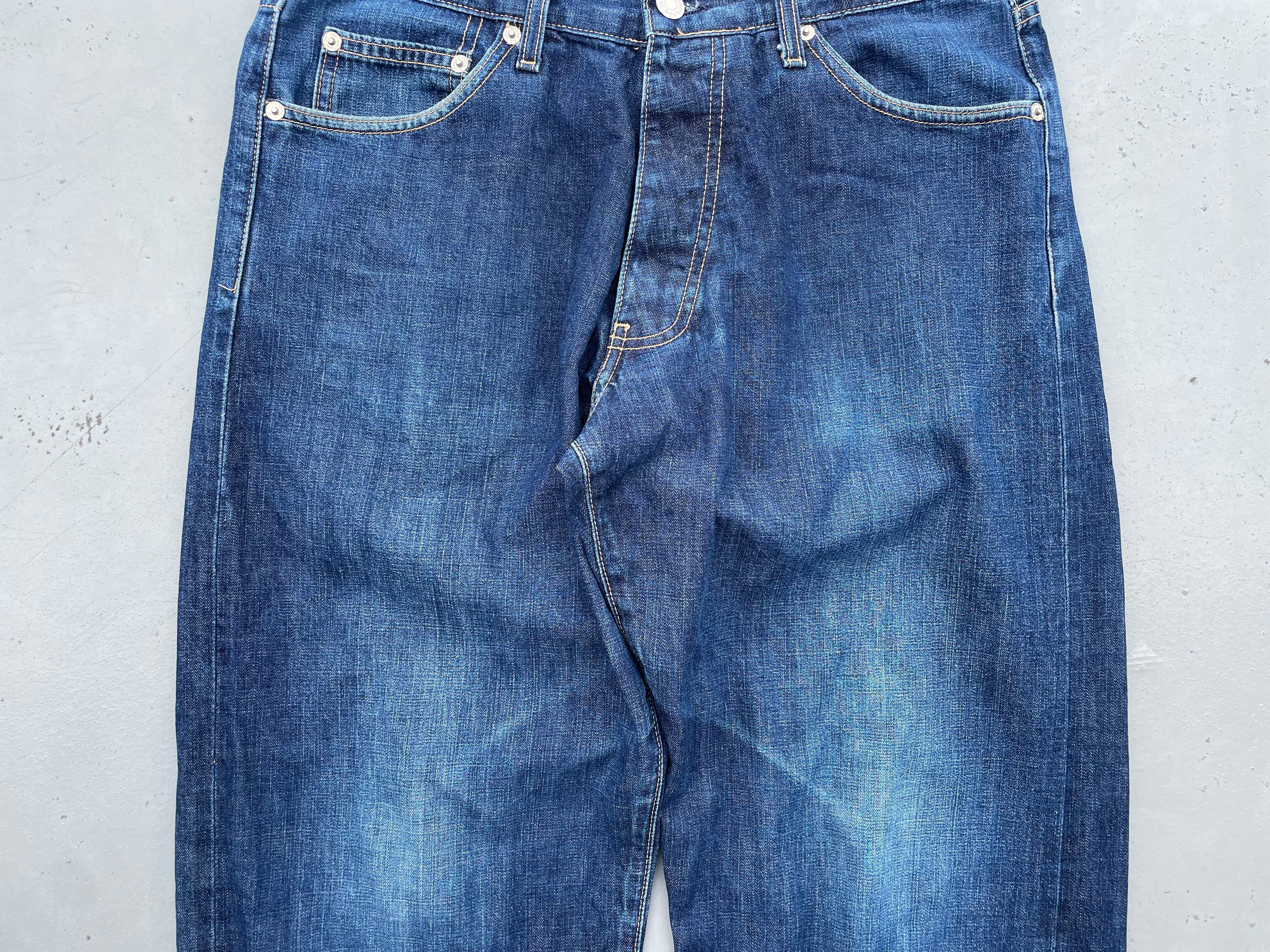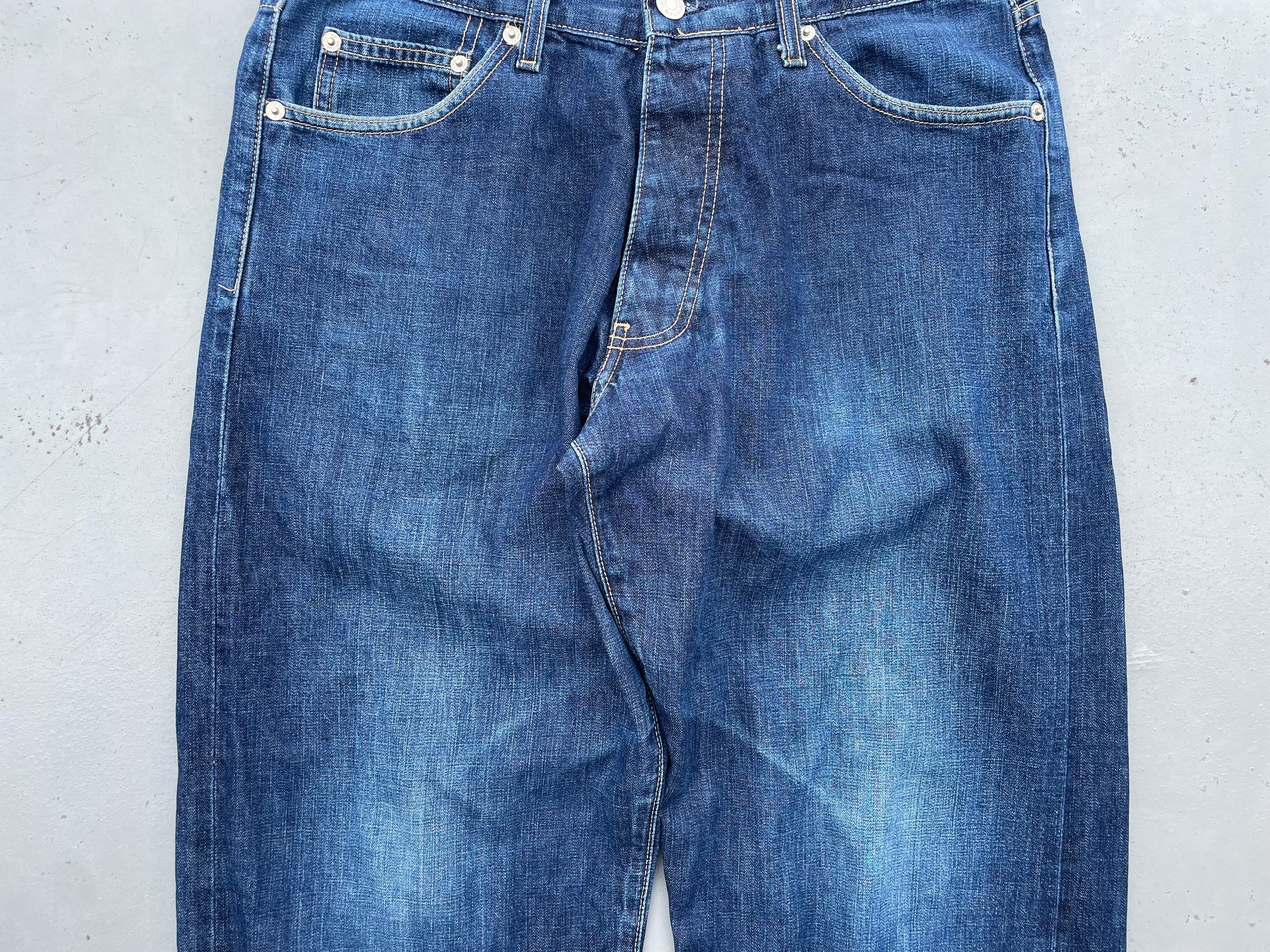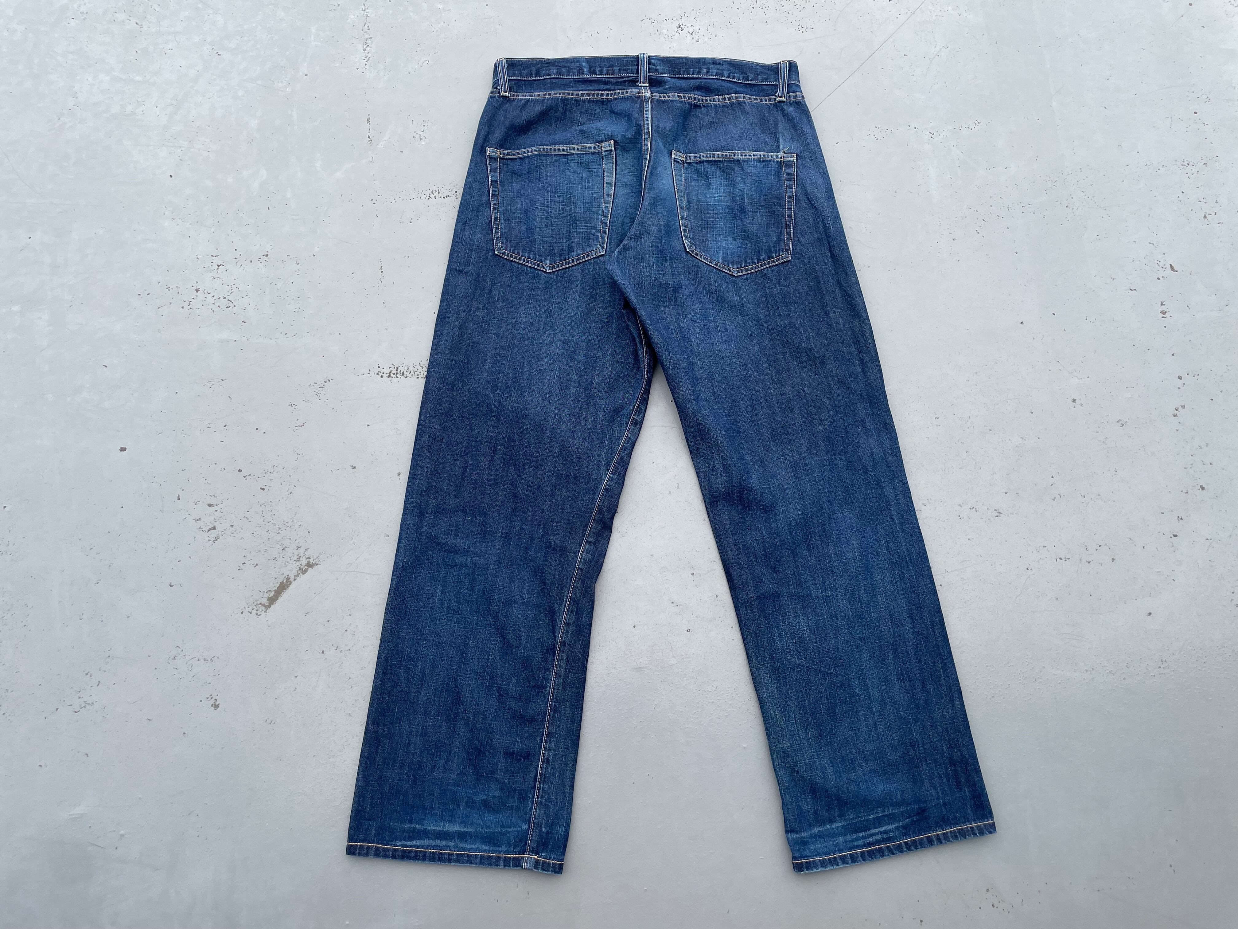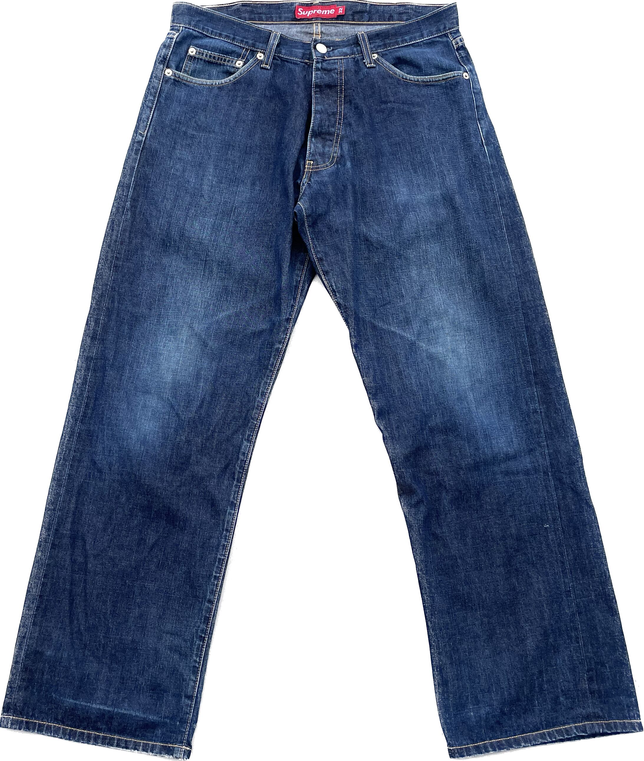 【商品詳細】シュプリームのデニムパンツ。カラーはブルー。サイズは32。90年代USA製。赤耳付。人気のオールドシュプリームのデニムパンツ。ストンと落ちる綺麗なシルエットですがどこかリラックス感のある印象のディテール◎太もも〜膝付近が良い塩梅にエイジングしており雰囲気あります。全体的に色も残っているのでこれから色落ちも楽しめると思います。おすすめ。