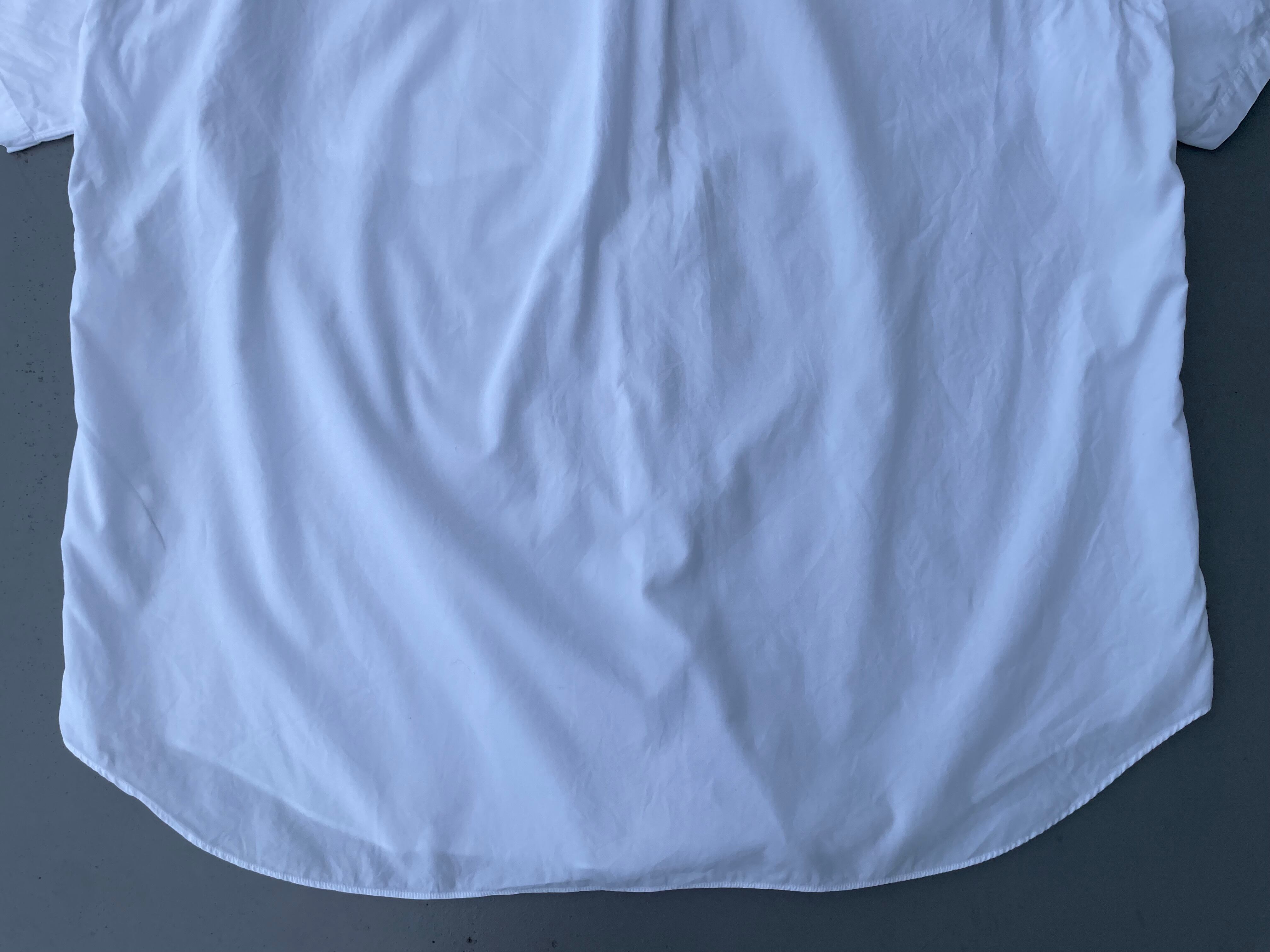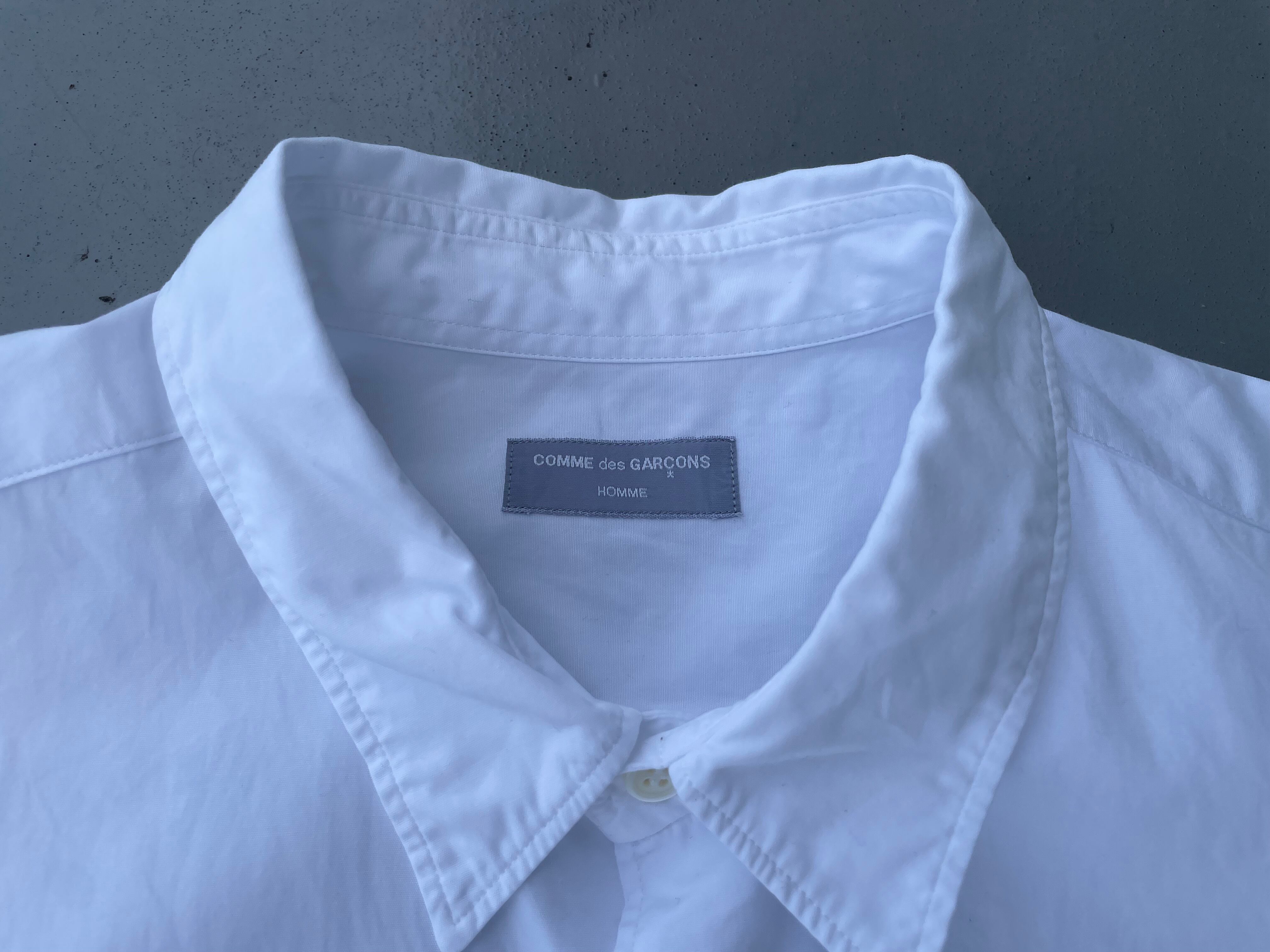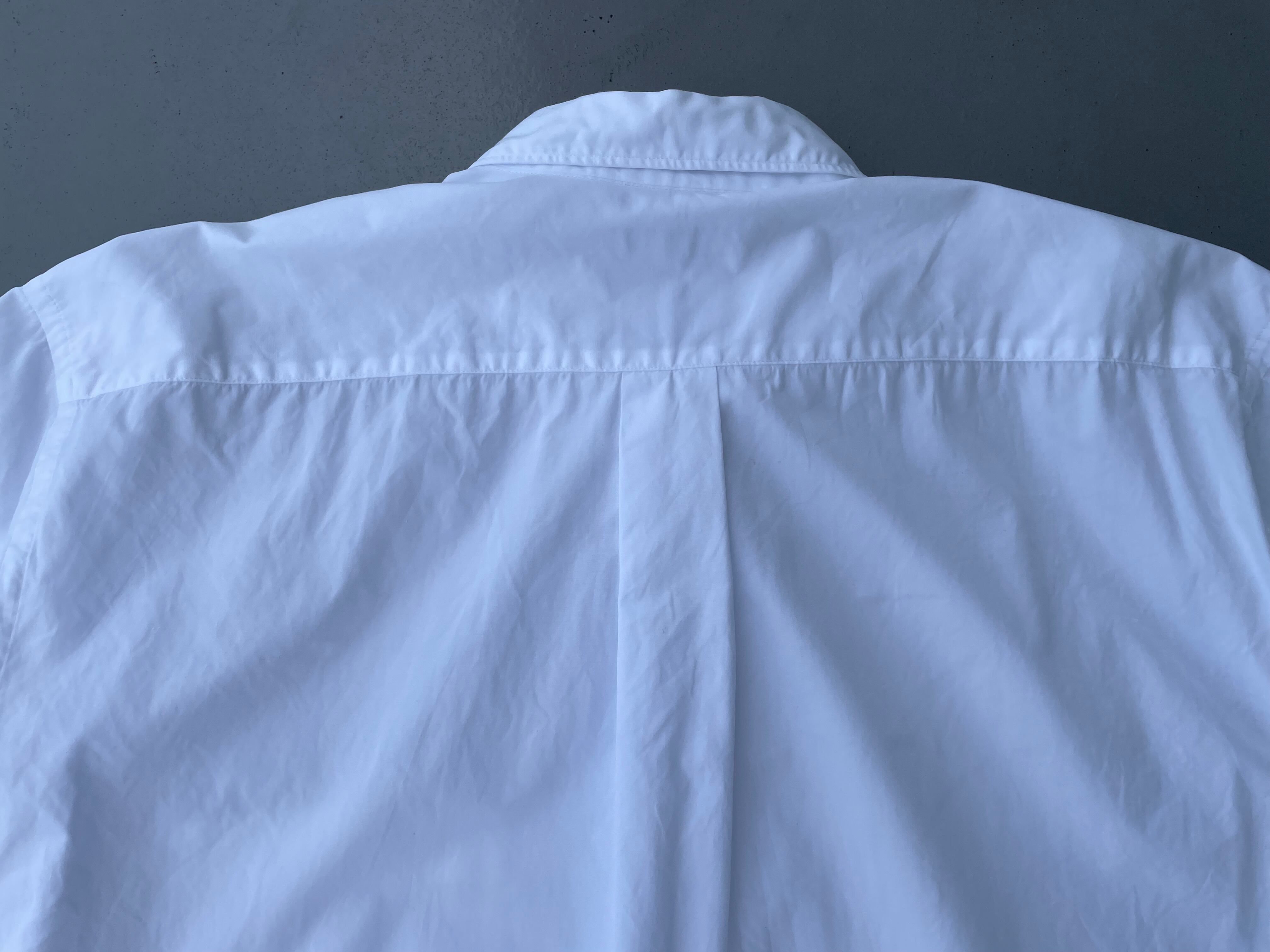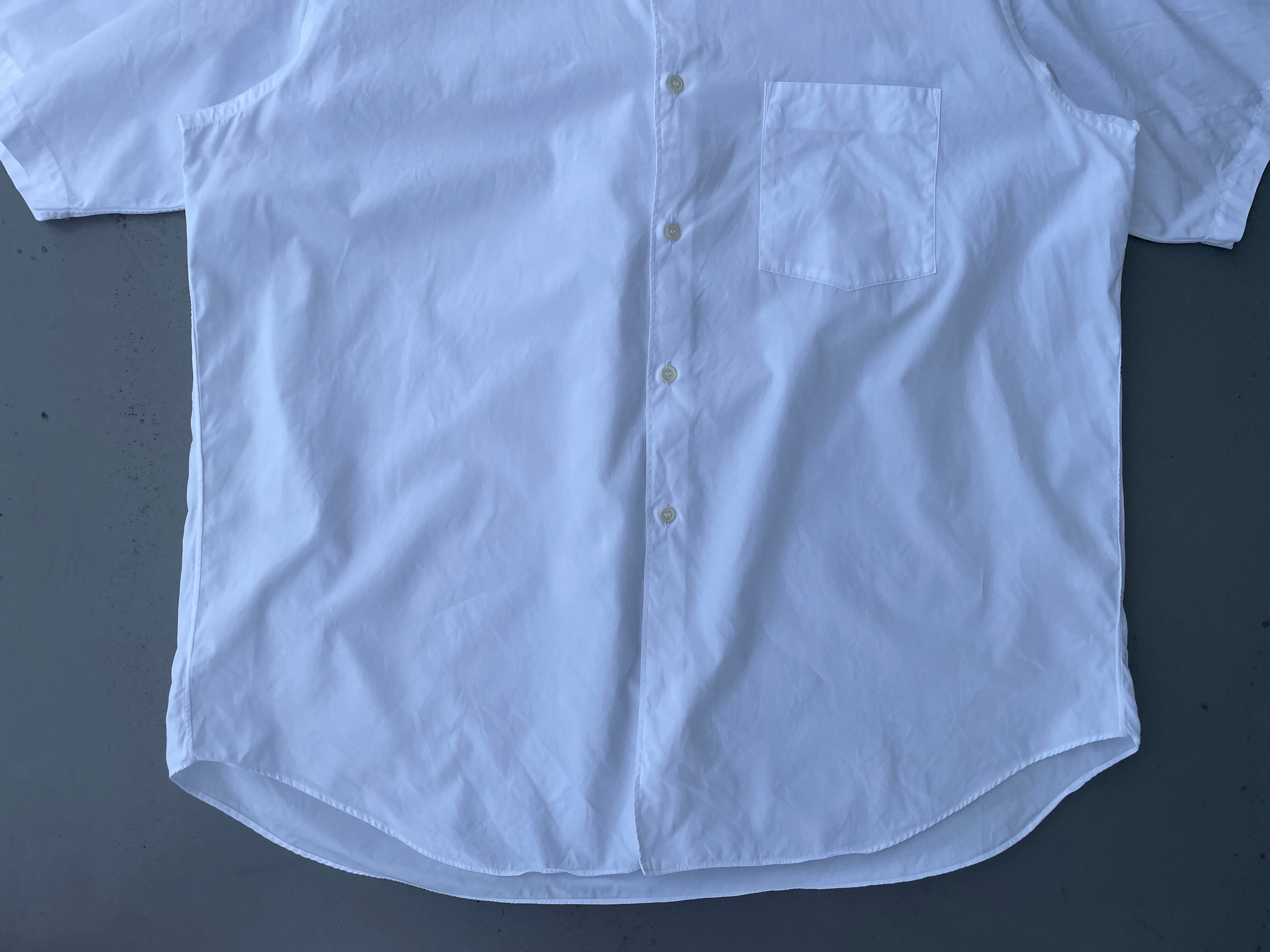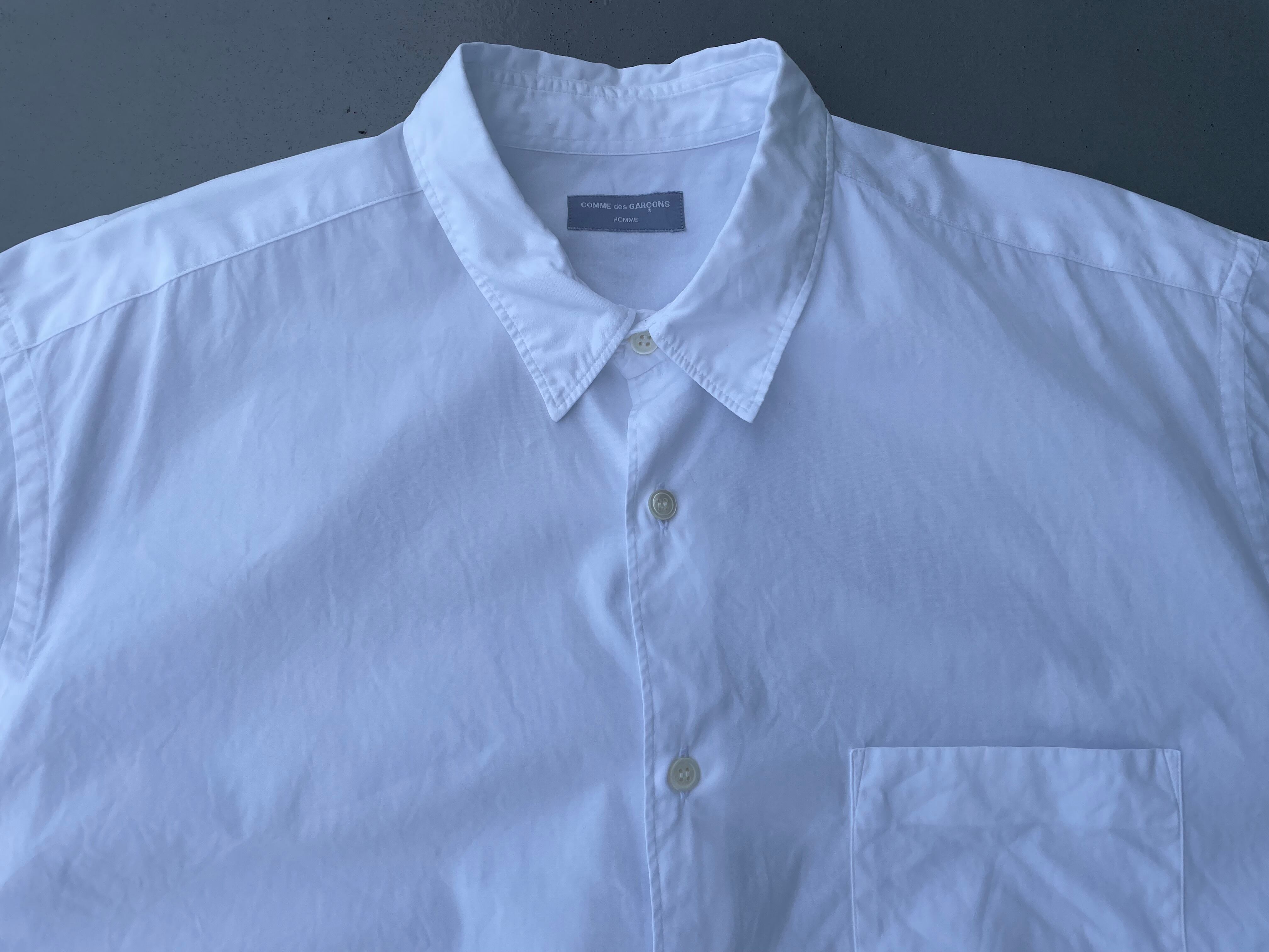 【商品詳細】コムデギャルソン オムのオーバー半袖シャツ。カラーはホワイト。90年代日本製。田中オム期人気のシャツシリーズからこちらは一見シンプルな半袖シャツに見えますが全体的なディーテールが大きく取られており、所謂ギャルソンシルエットなドレープ感のあるディテールになってます。レギュラーカラーな仕様も個人的にはポイント高いです。シンプルこそ拘りたいと言う方ぜひ。