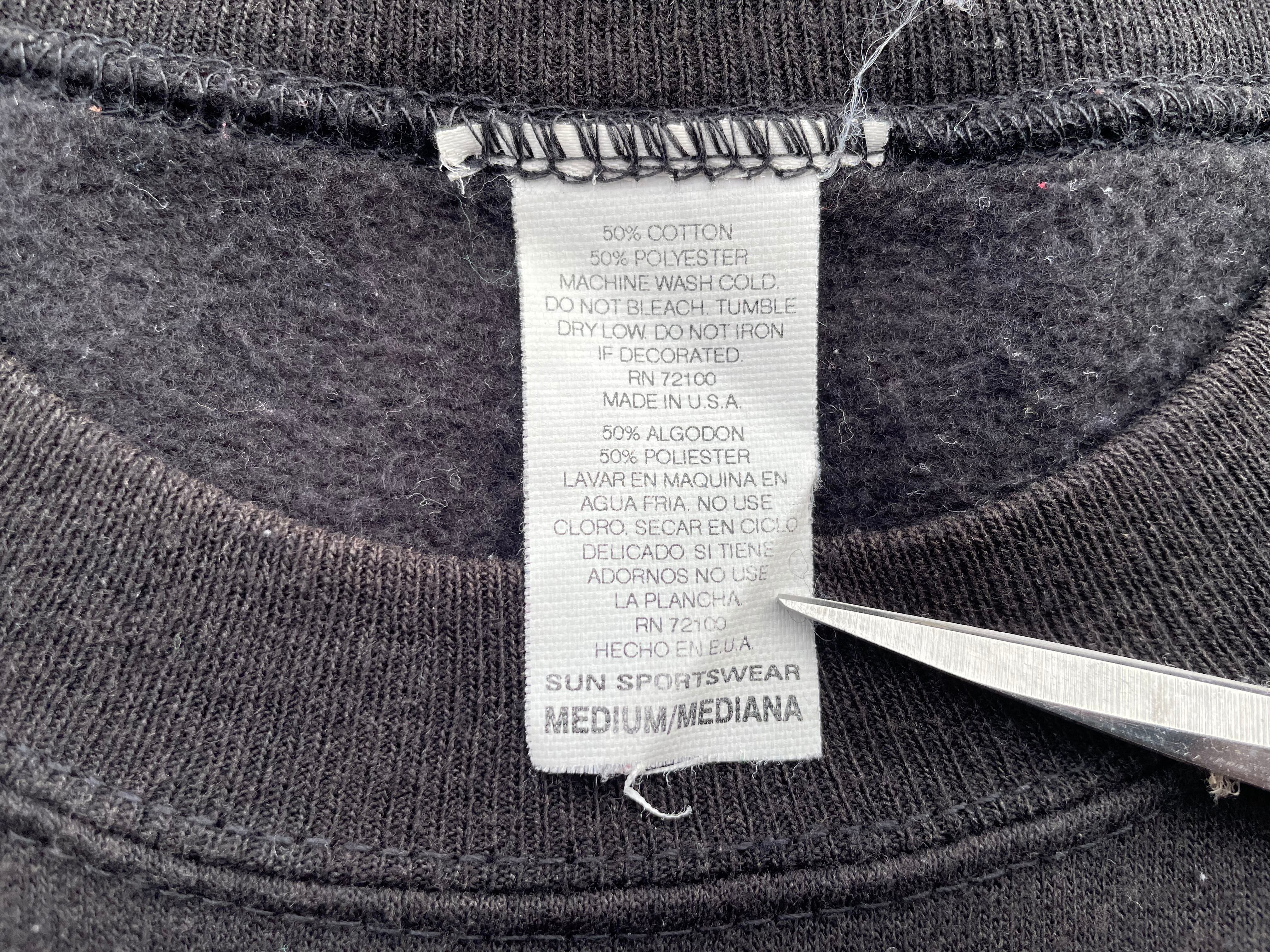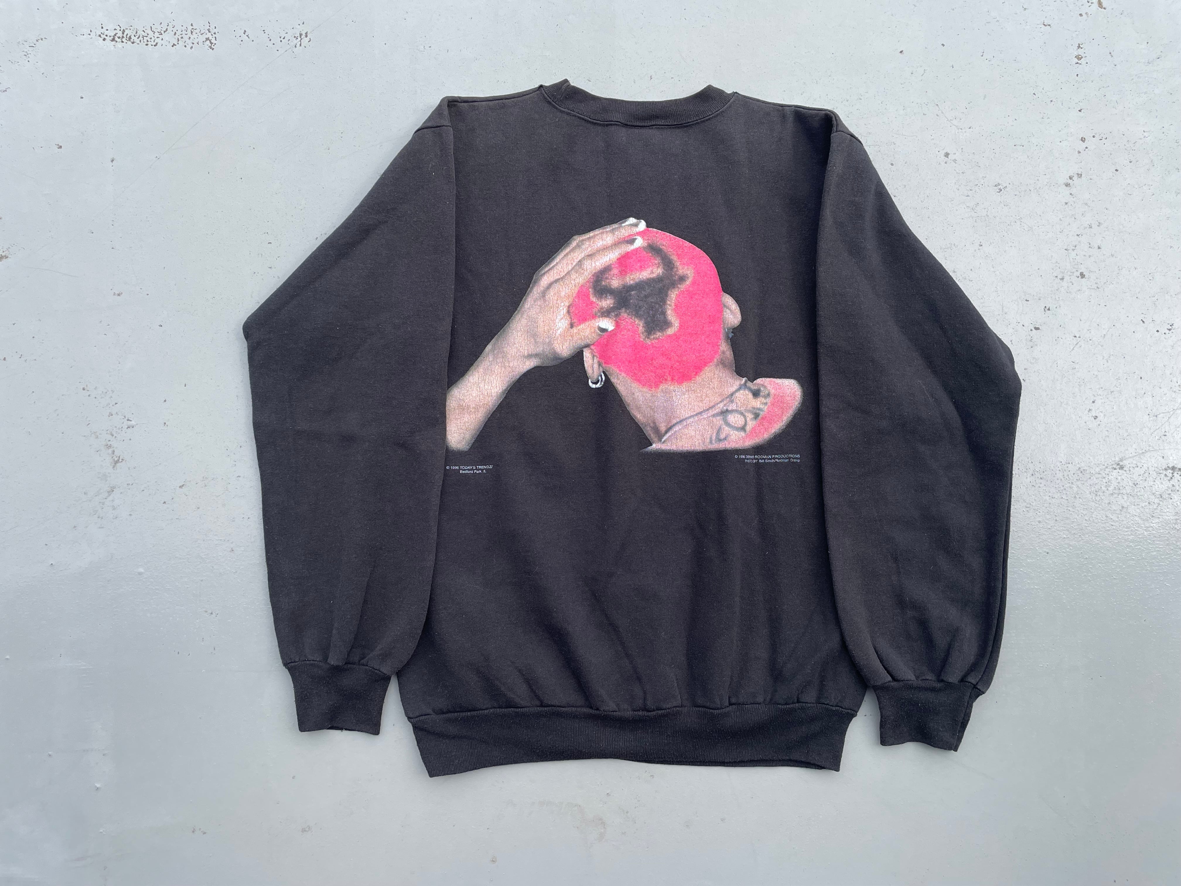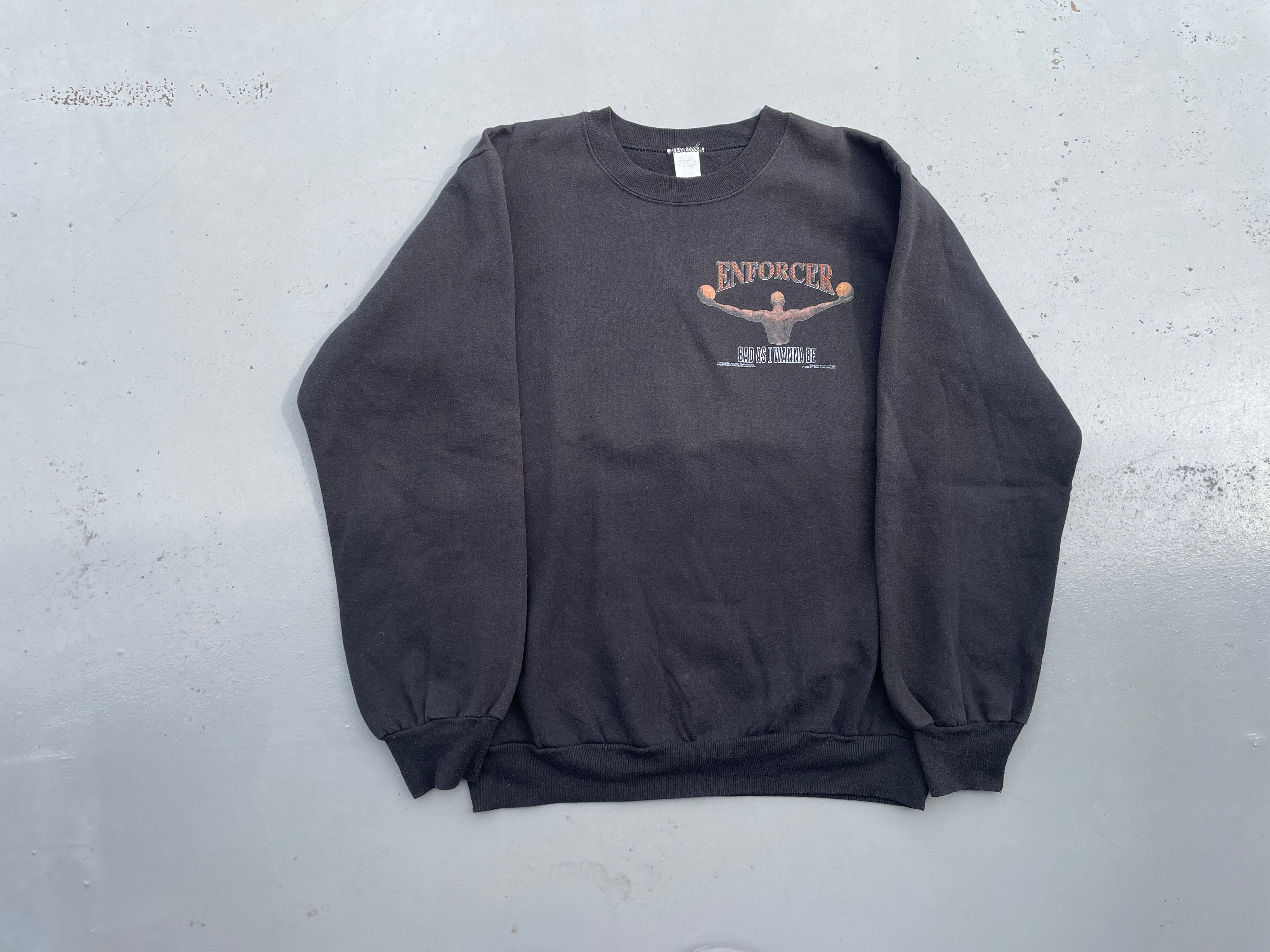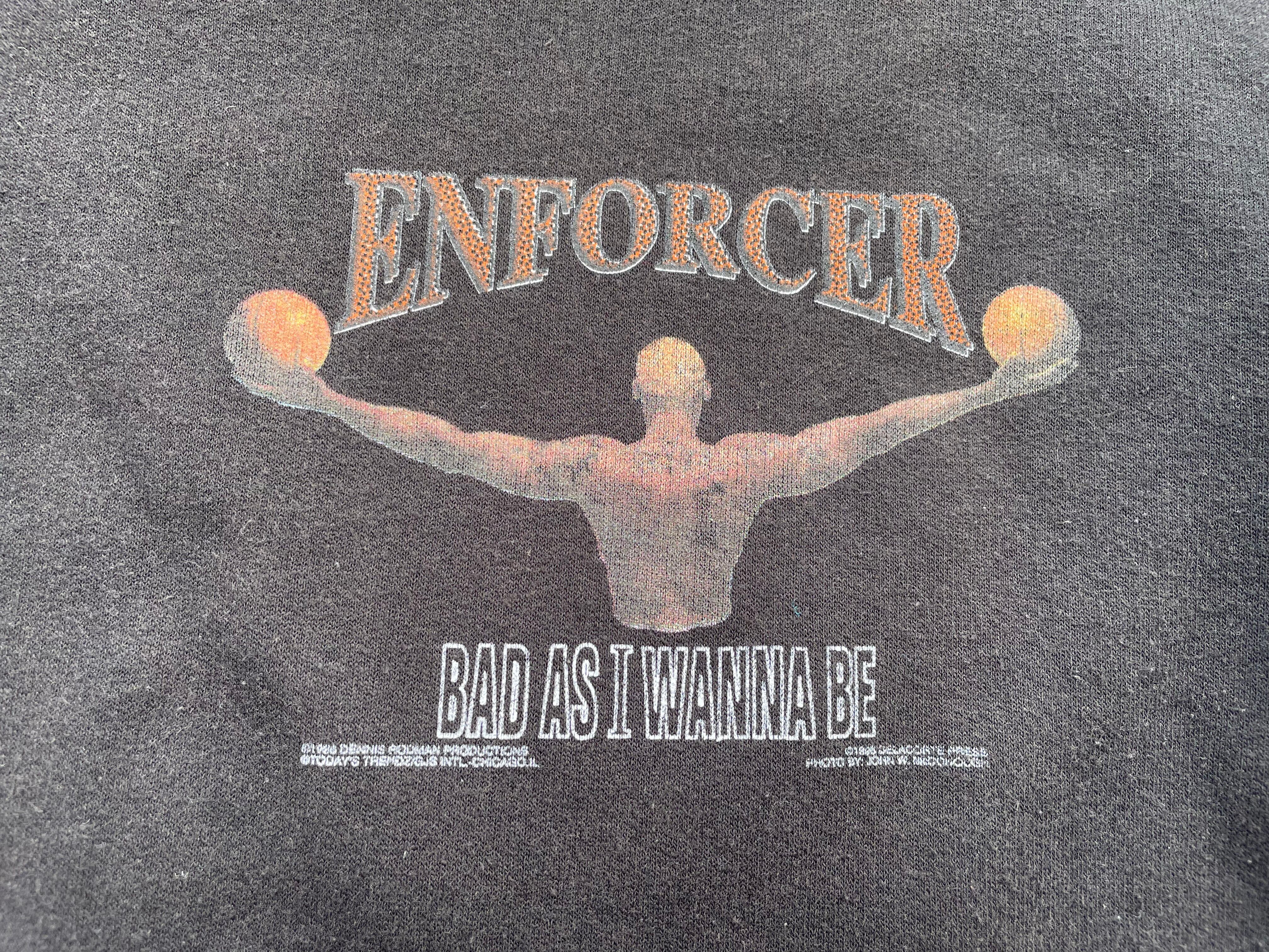 【商品詳細】ビンテージの長袖スウェット。サイズはM。カラーはブラック。96年USA製。古着市場でも人気の高いデニスロッドマン物。背面には当時所属していたNBAチームシカゴ・ブルズのアイコンをヘアスタイルに落とし込んだ本人プリント。フロントには本人を語る上で欠かせない「ENFORCER」・「BAD AS I WANNA BE」とプリントされたらしさが詰まった一着。既に高騰してますがロッドマン物は今後益々高騰しそうですね。