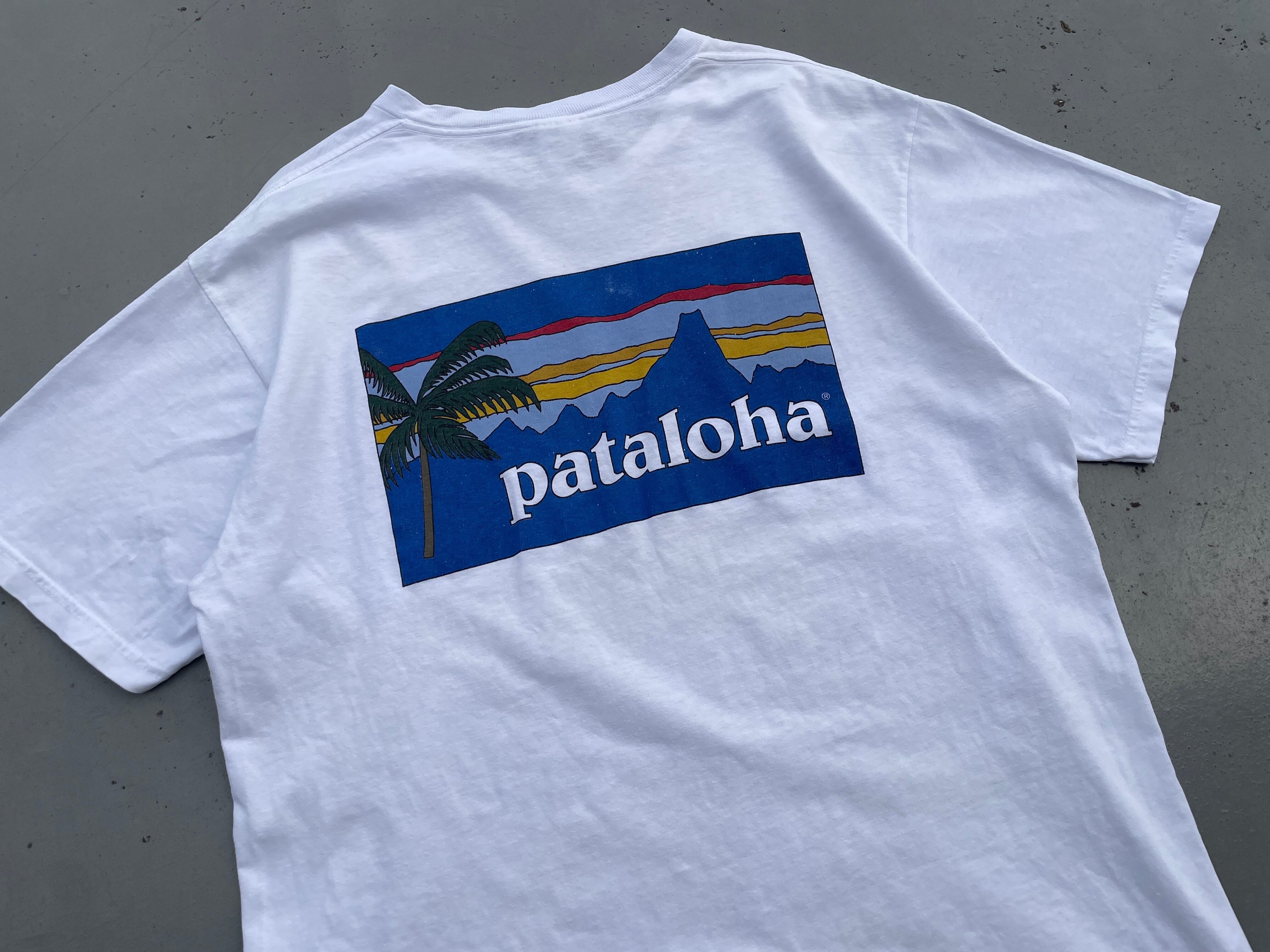 【商品詳細】パタゴニアの半袖Tシャツ。サイズはM。カラーはホワイト。00年代USA製。裾・袖ダブルステッチ。Beneficialボディ。背面に大きくpatalohaとプリントされたらしさを感じる一着。Mサイズですが白タグBeneficialが付く大きめな作り。