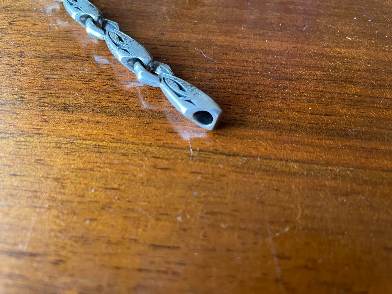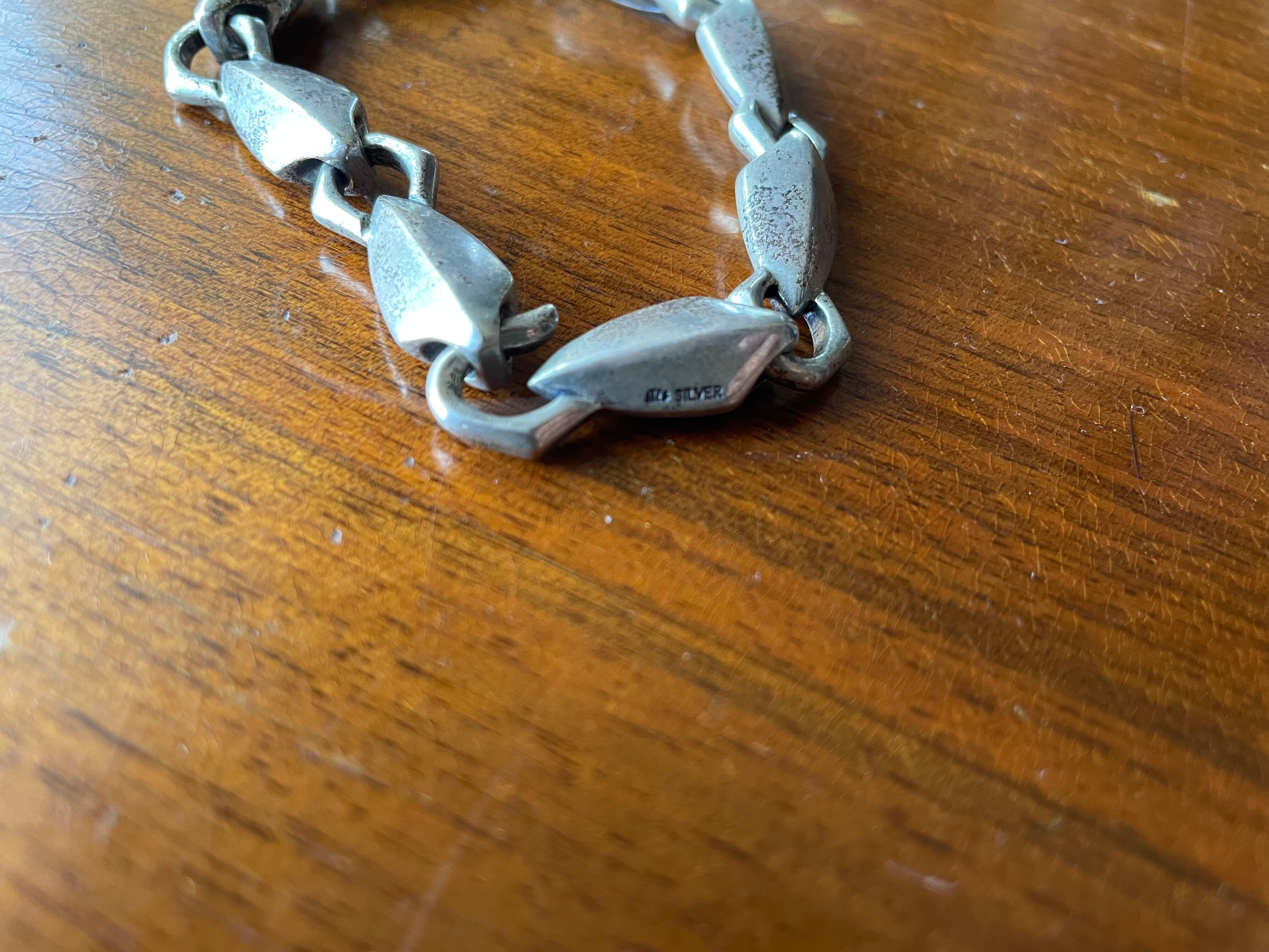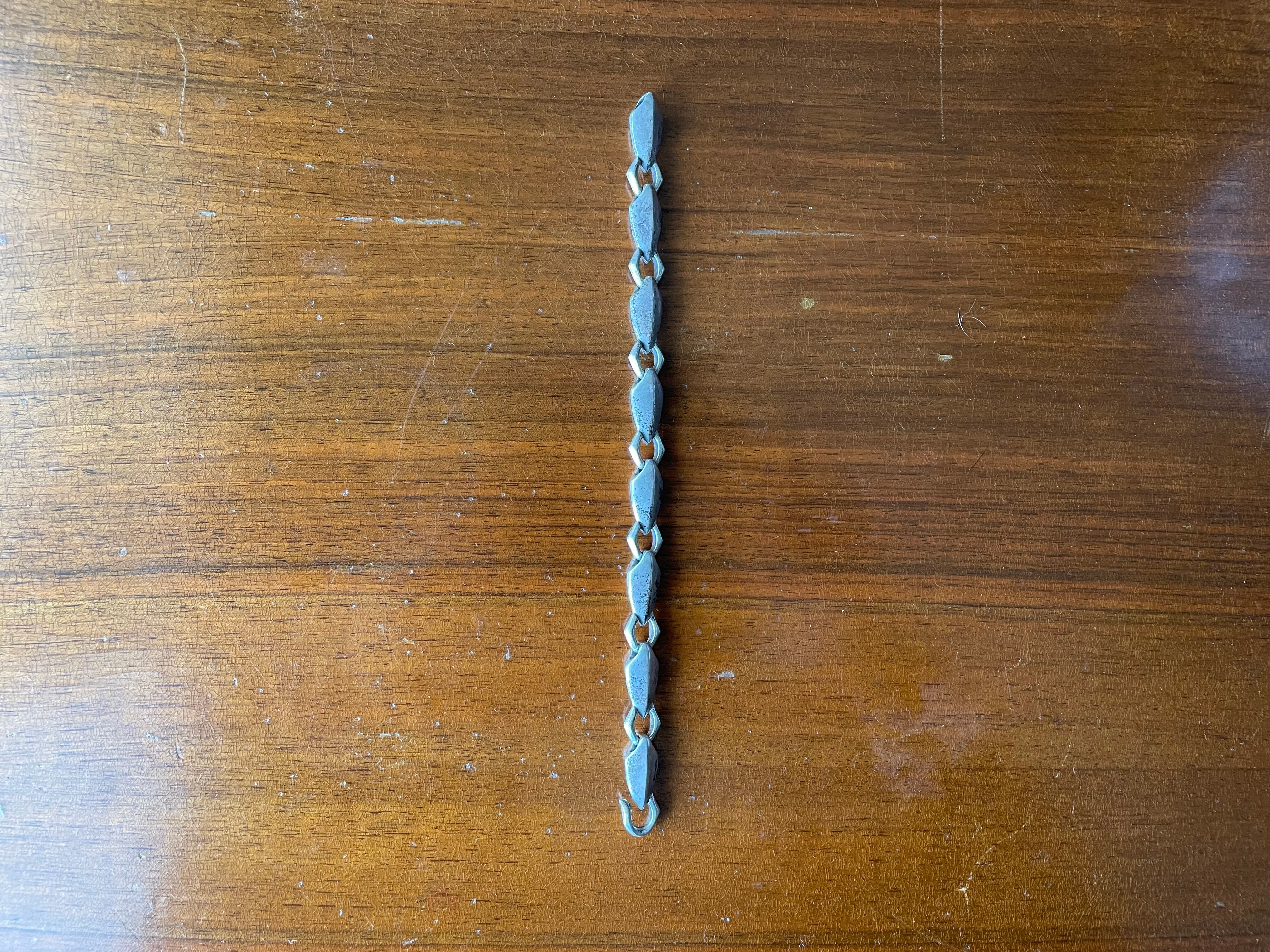 【商品詳細】UNKNOWNのシルバーブレスレット。Silver刻印あり。幾何学模様に彫られたダイヤ型ブレスレット。小ぶりな装いですが雰囲気のある洒落たデザインで存在感あります。普段アクセサリー付けない方でもこれなら挑戦しやすいと思います。