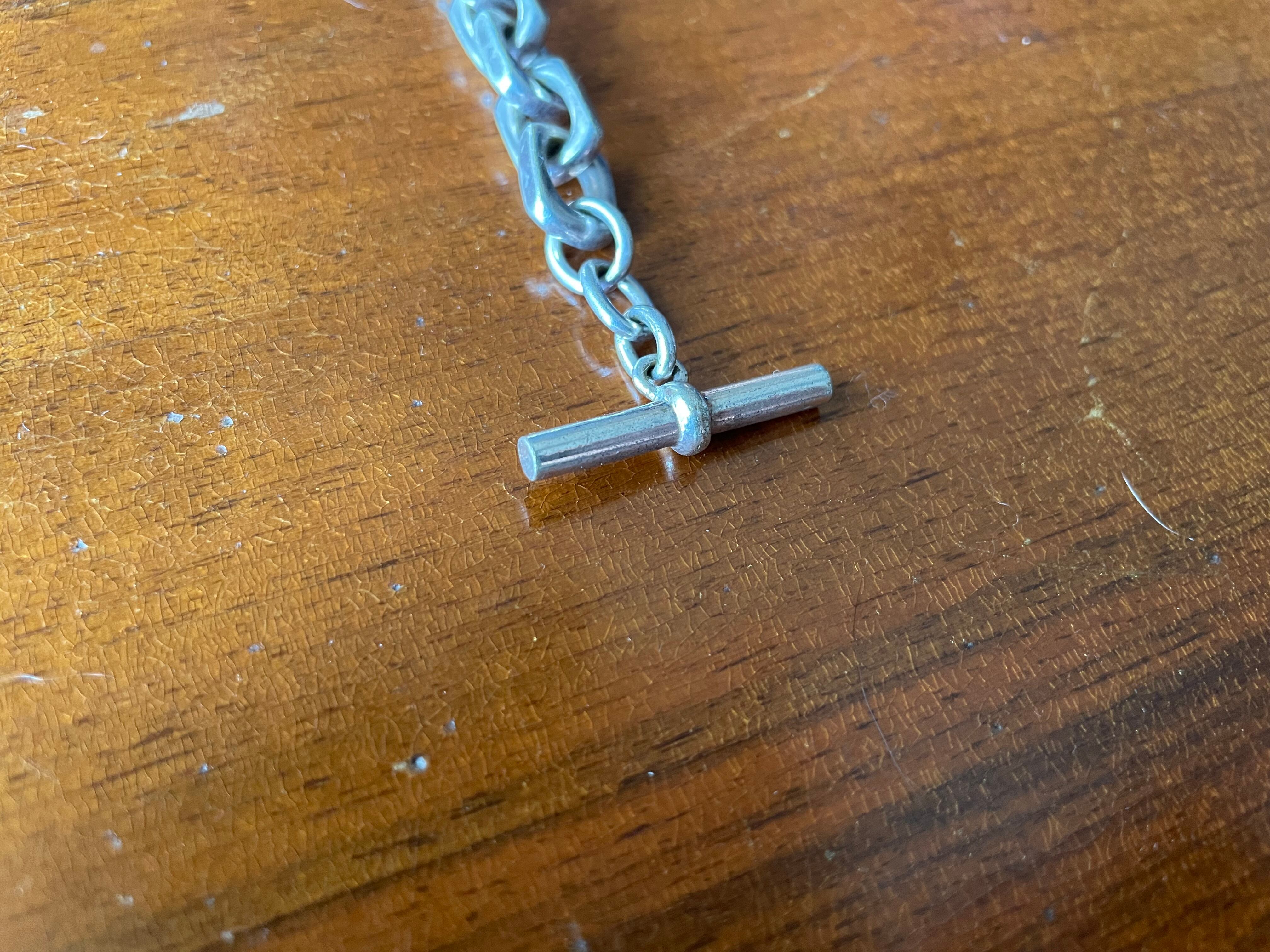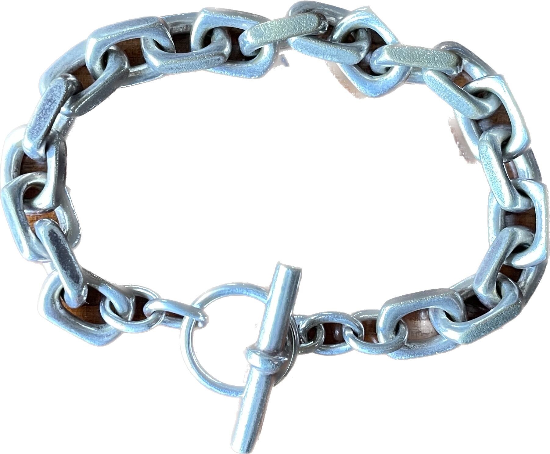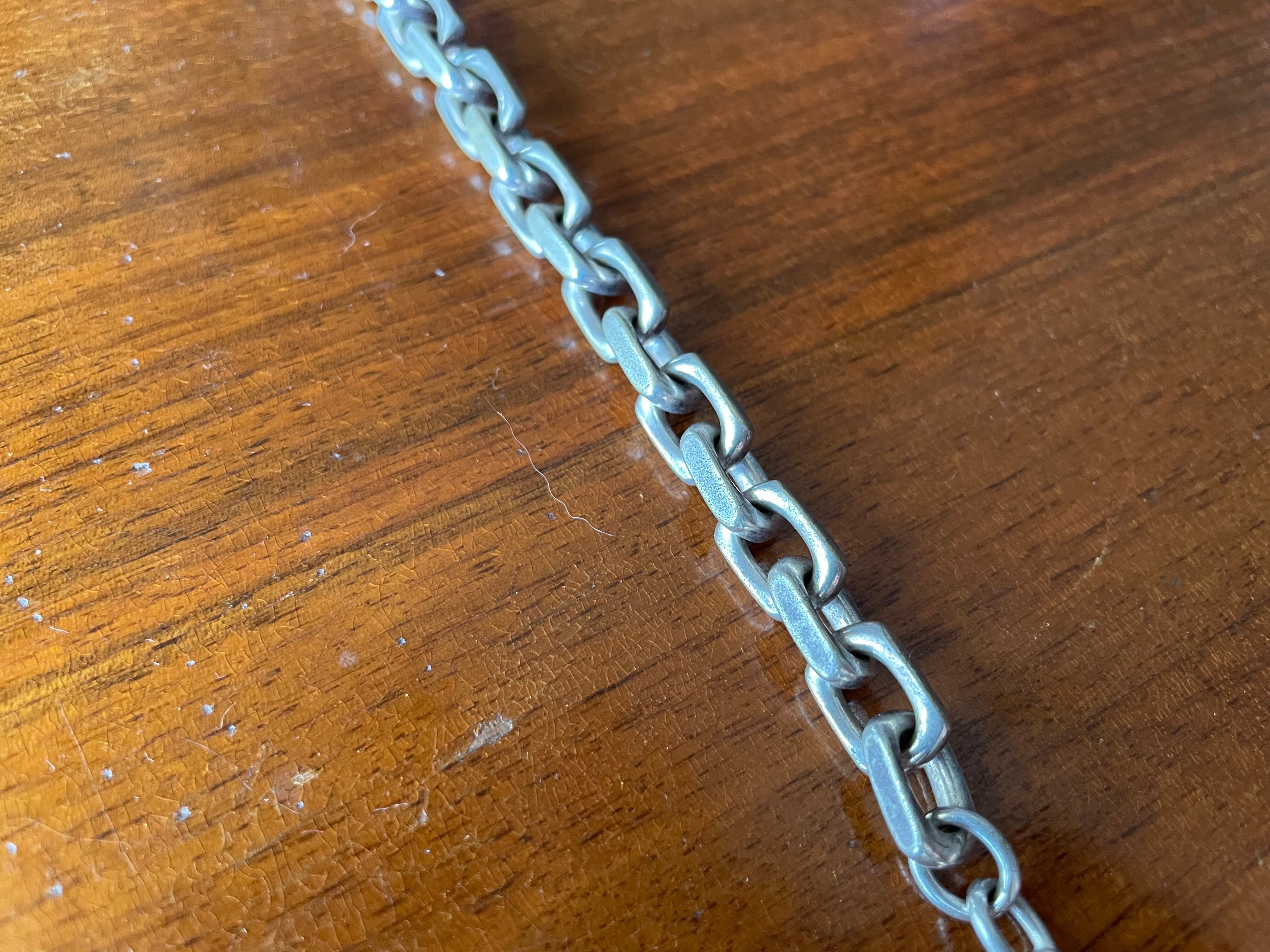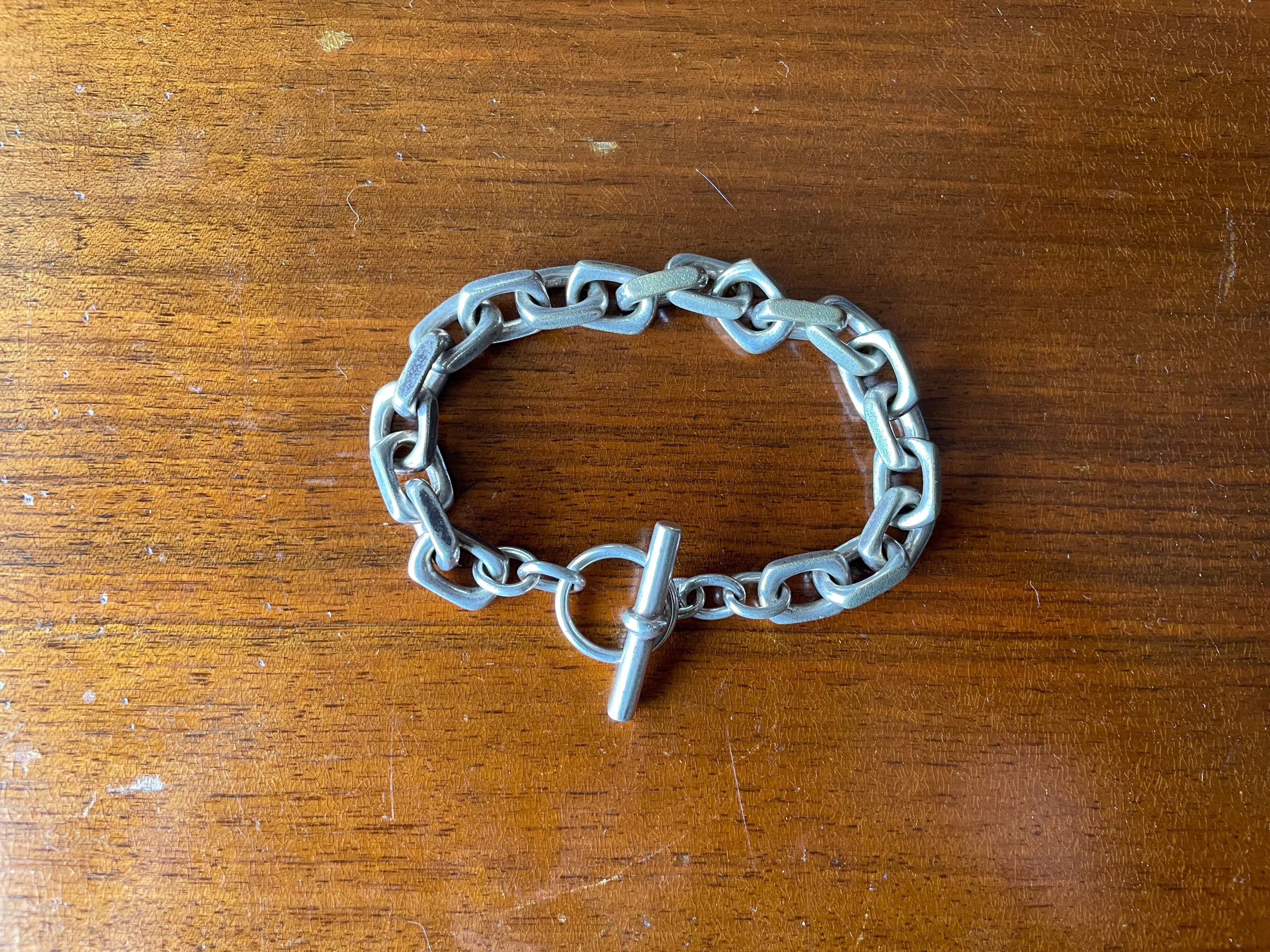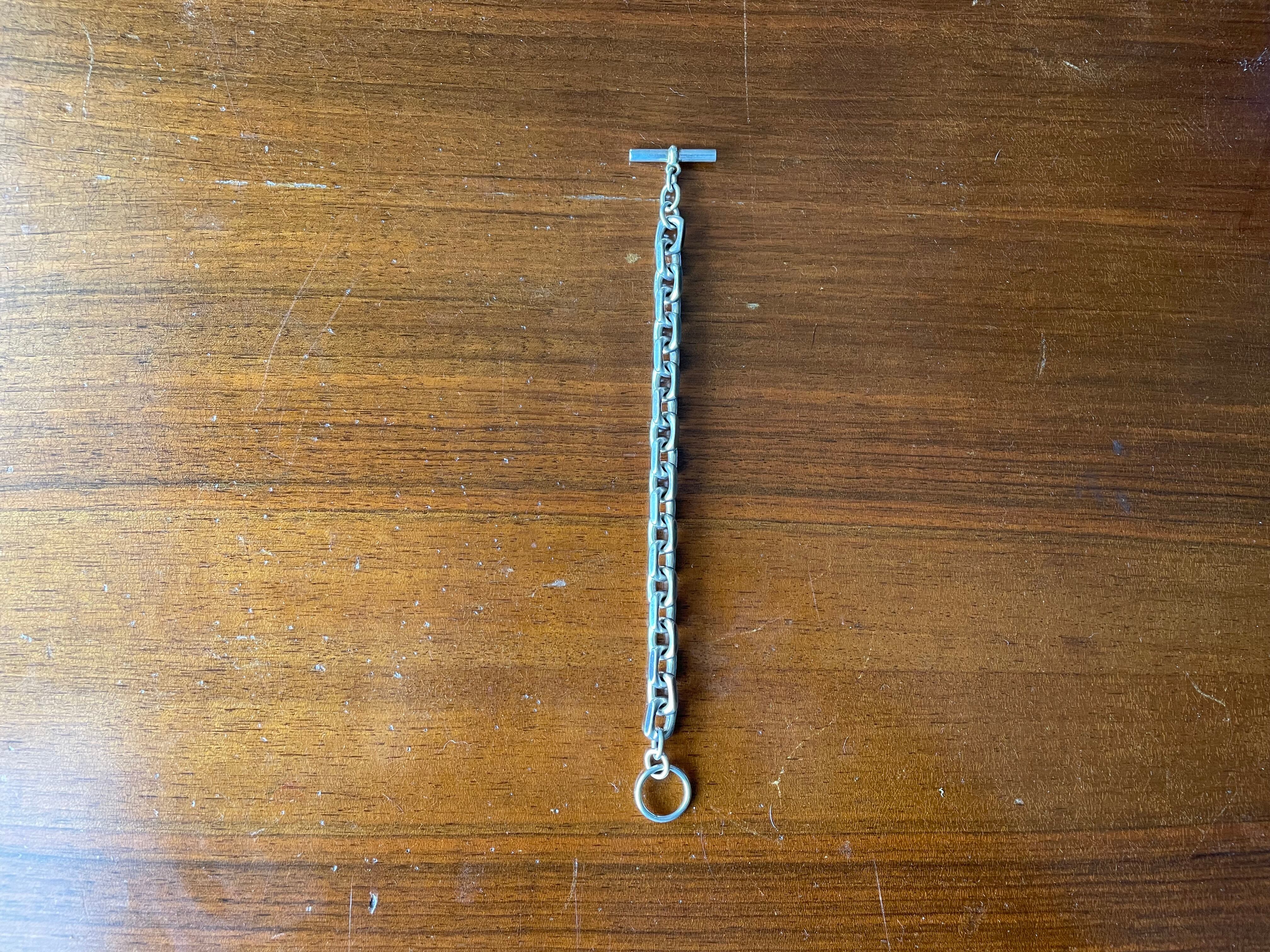 【商品詳細】UNKNOWNのシルバーチェーンブレスレット。刻印なし。鈍い輝きがインダストリアルな雰囲気のある本個体。小ぶりな装いですが立体的なコマが雰囲気のある洒落たデザイン。古いデンマーク製ブレスレットで見るデザインですが、本個体も買付の際にデンマーク製と聞いております。相場を考えると比較的お求めやすいかと思いますのでぜひご検討下さい。
