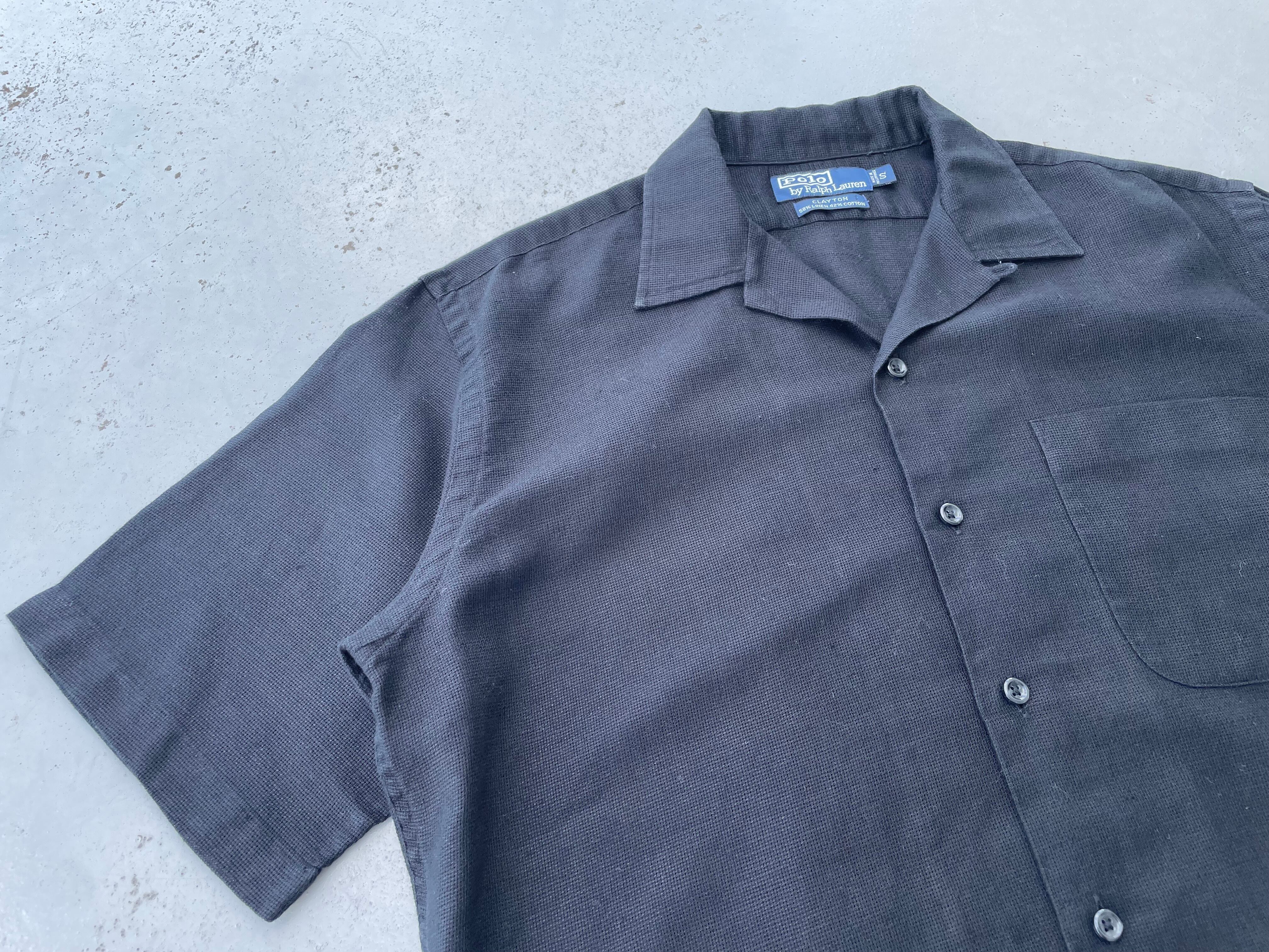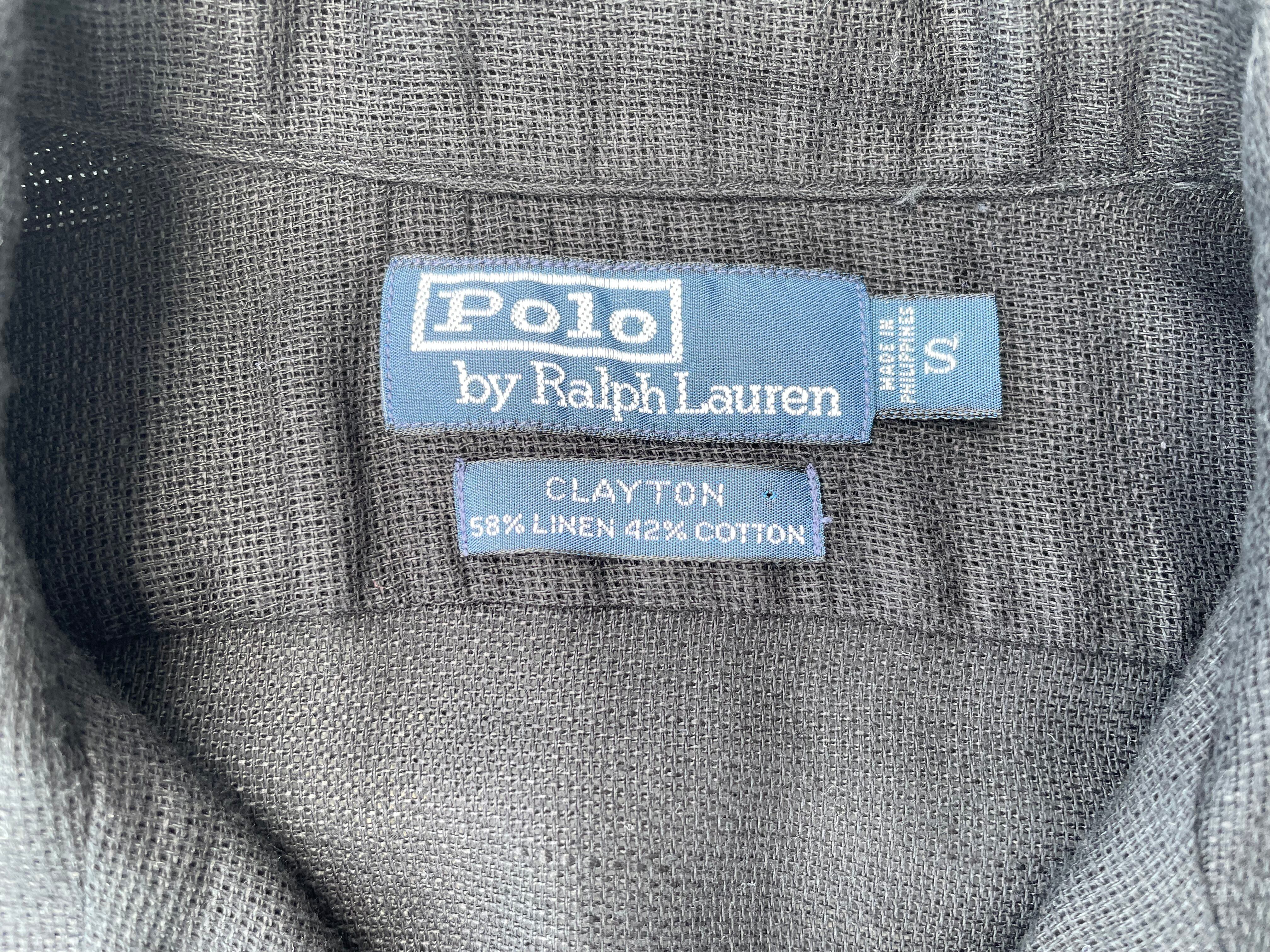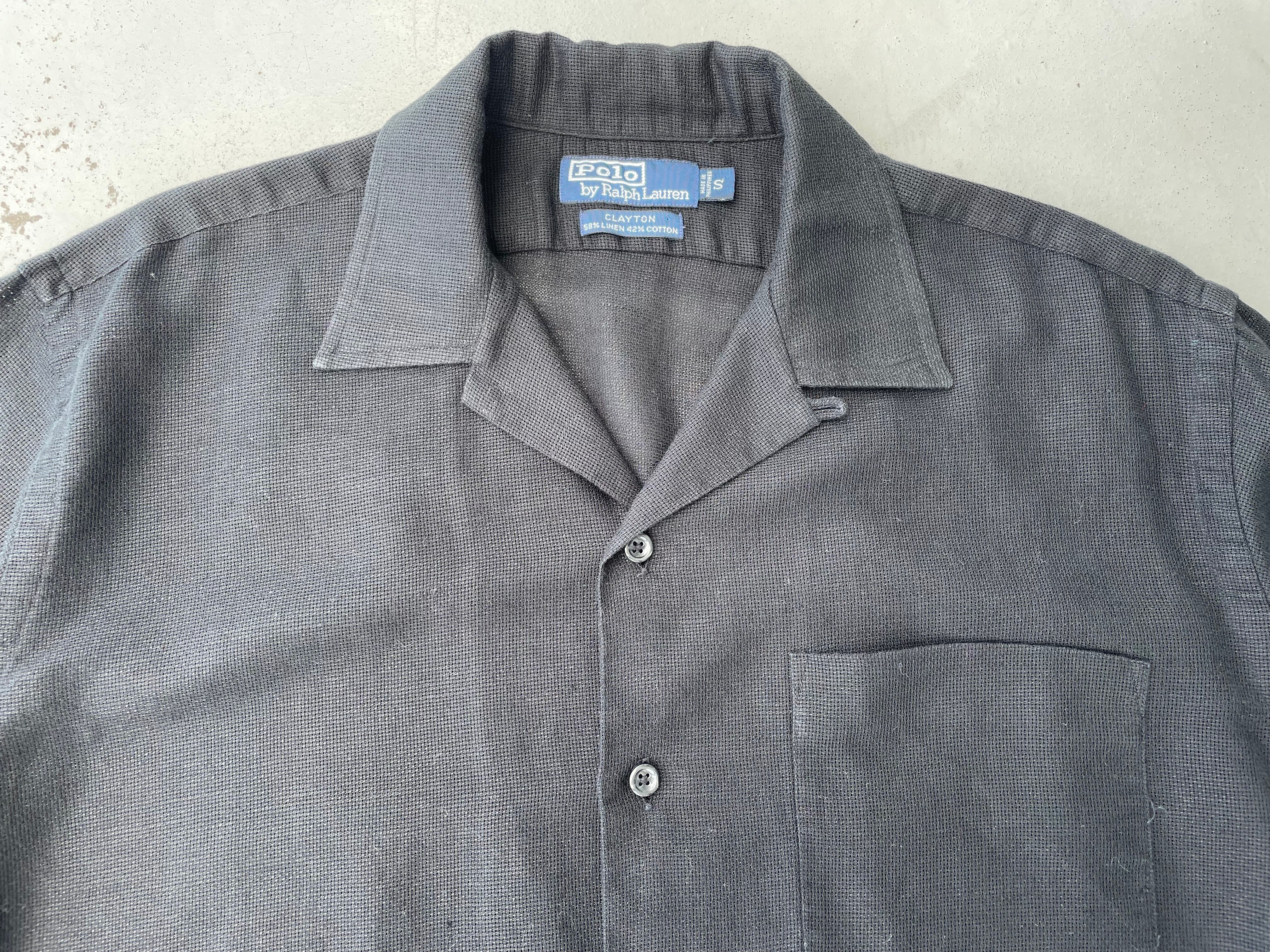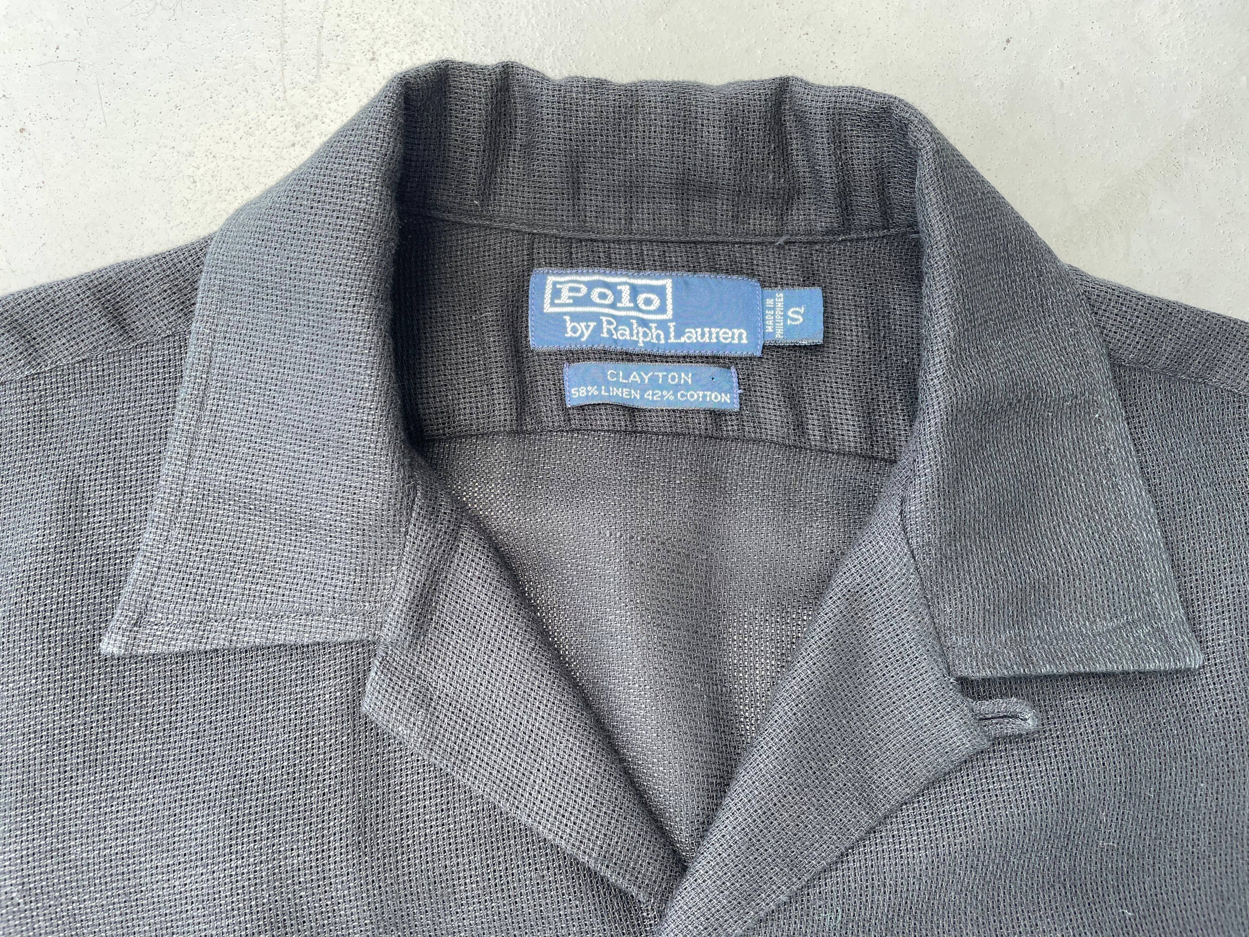 【商品詳細】ラルフローレンのオープンカラーシャツ。サイズはS。カラーはブラック。90年代頃フィリピン製。ラルフローレンの人気モデル”CLAYTON”のオープンカラーシャツ。人気のブラックカラー×開襟でお探しの方多いかと。加えて希少なSサイズ。実寸の通り着れる個体です。コットンリネン地の透け感のある見た目でこれからの季節活躍しそうです。ポニー無しなのもポイント高いです。