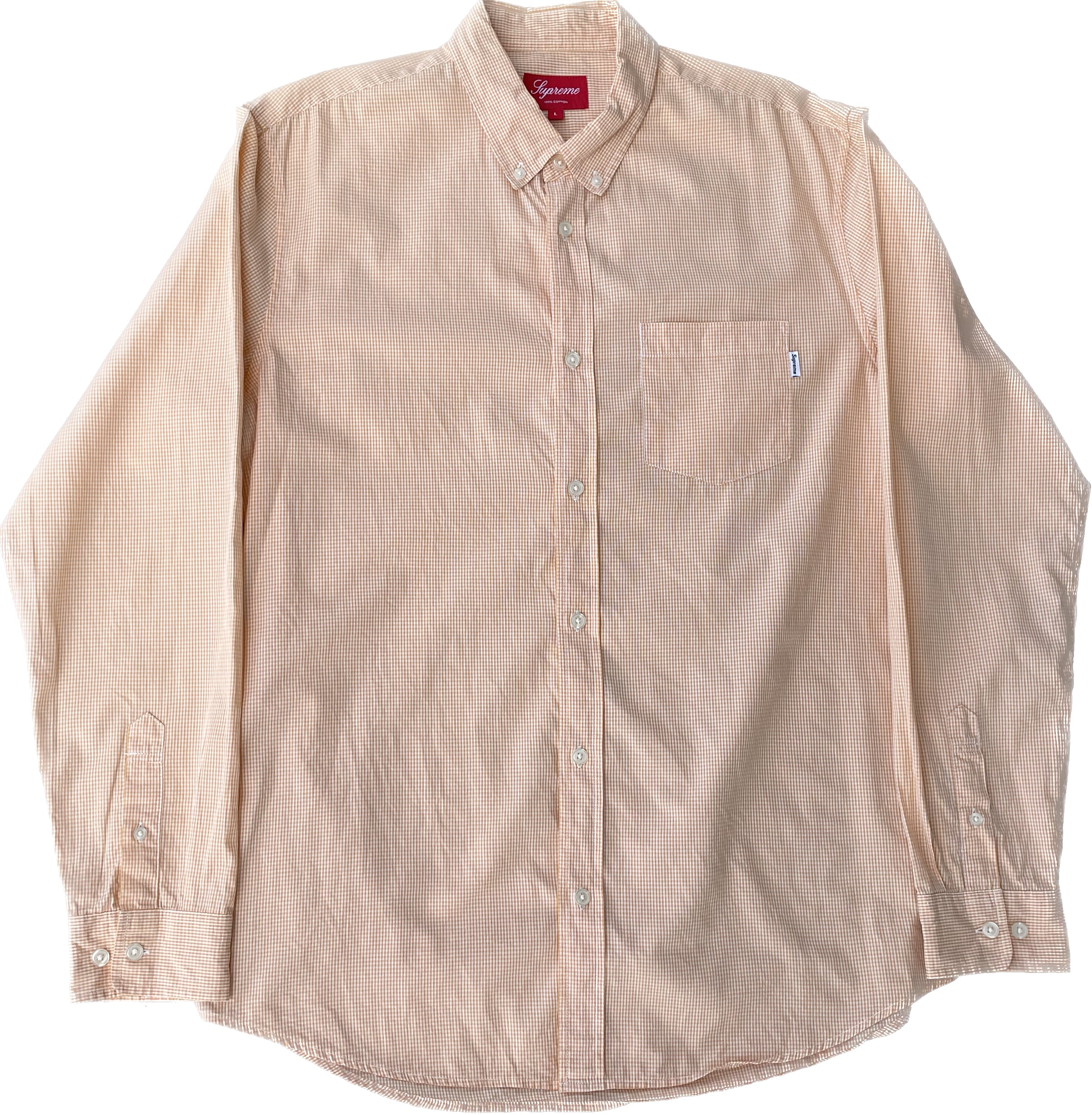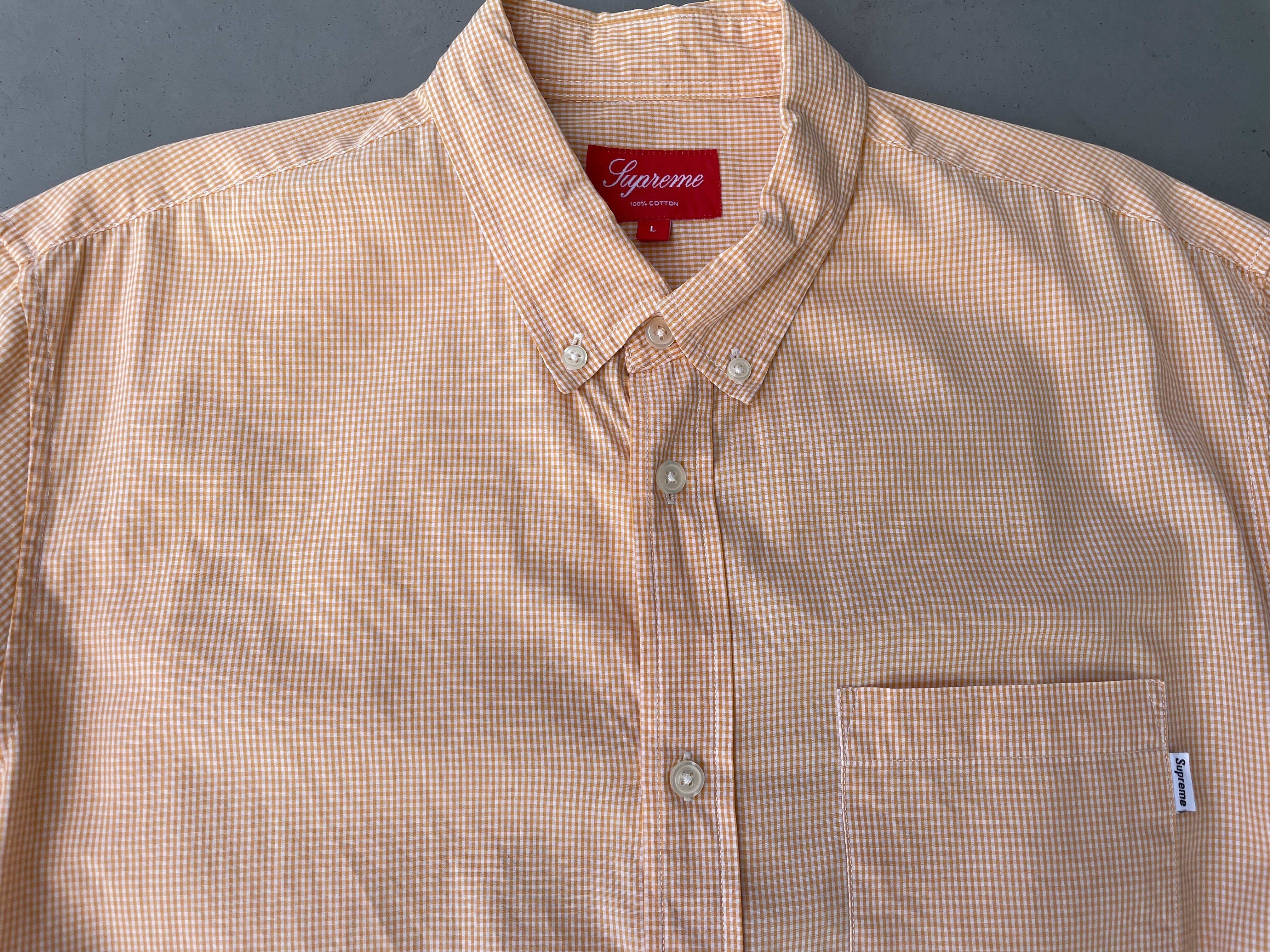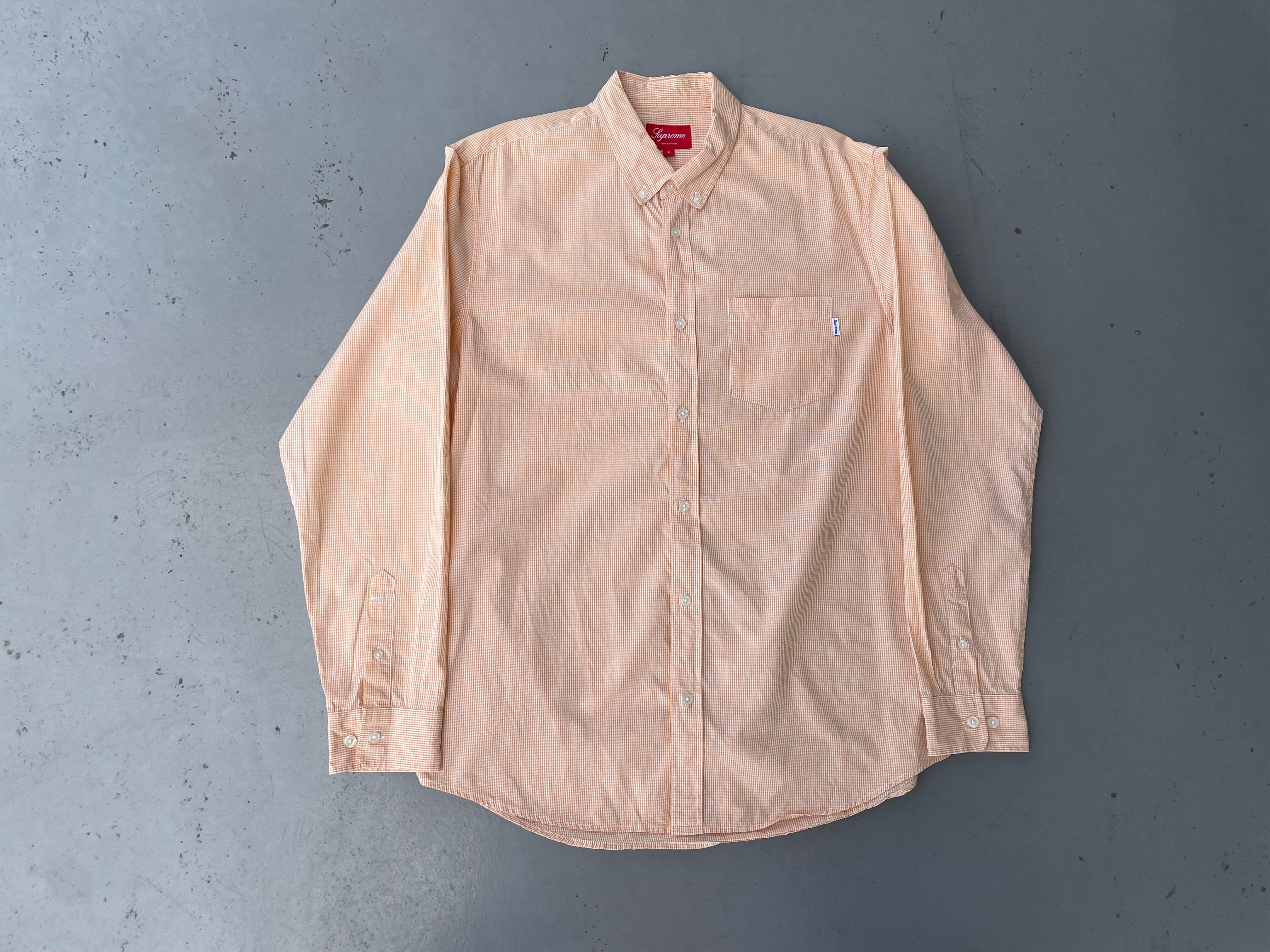 【商品詳細】シュプリームの長袖シャツ。サイズはL。カラーはオレンジ×ホワイトのギンガムチェックパターン。00-10年代中国製。爽やかなオレンジカラーが印象的な一着。意外とオレンジカラーのギンガムパターンって見ない気がします。大きめサイズでガバッと羽織れます。ボタンダウン仕様なのも個人的にポイント高いです。夏場はインナー着ずにこれ一枚でも良いですね。