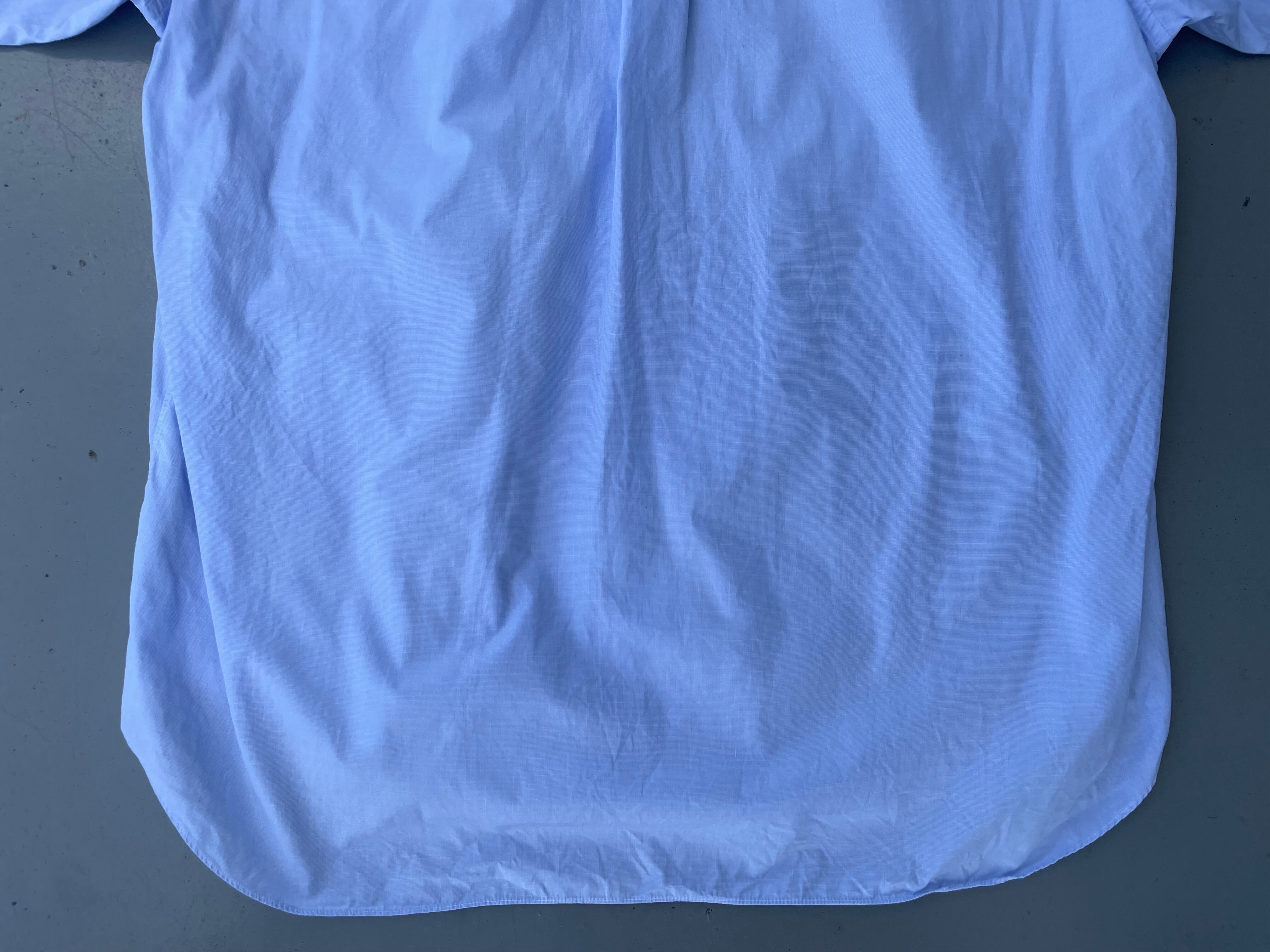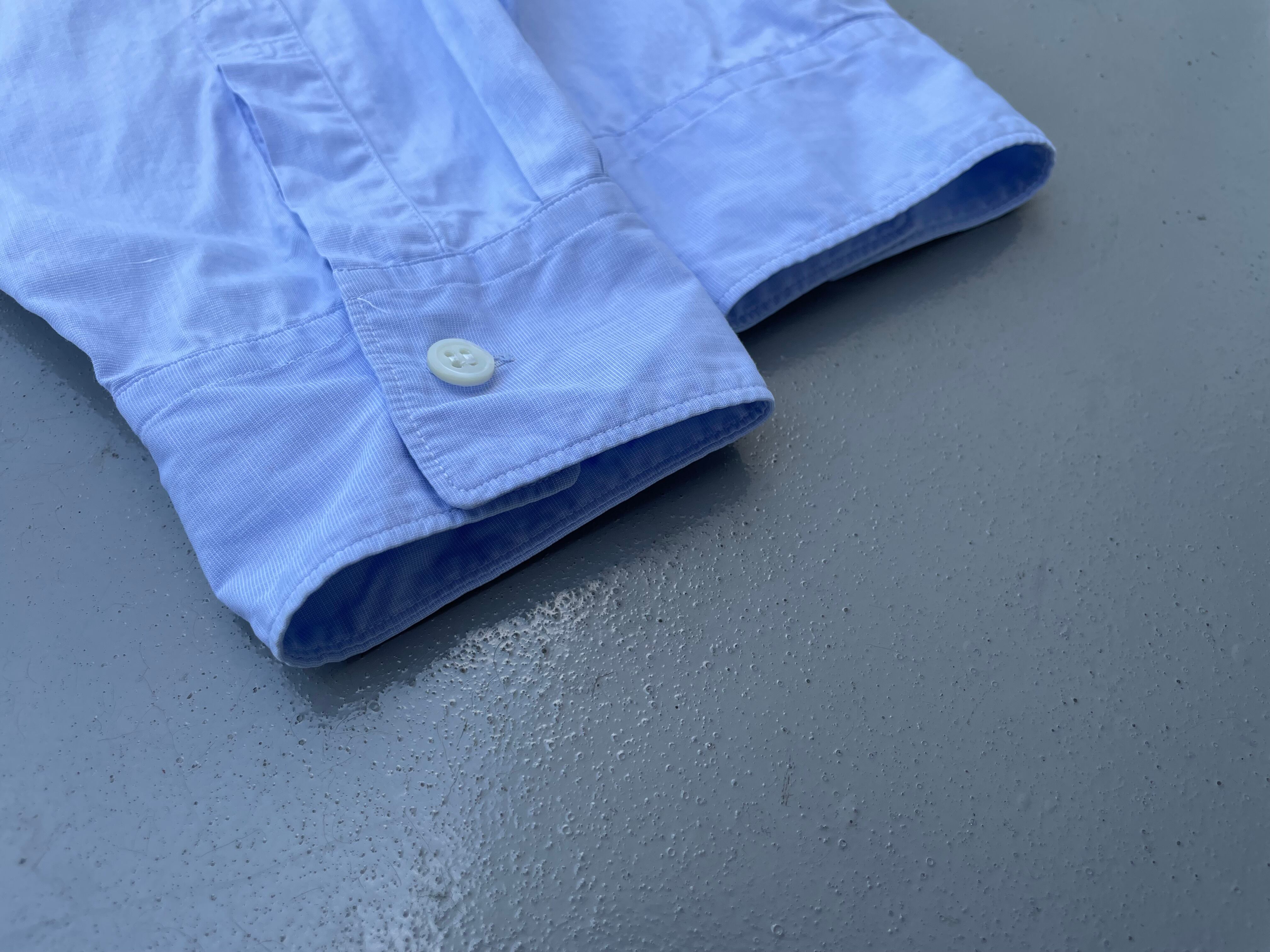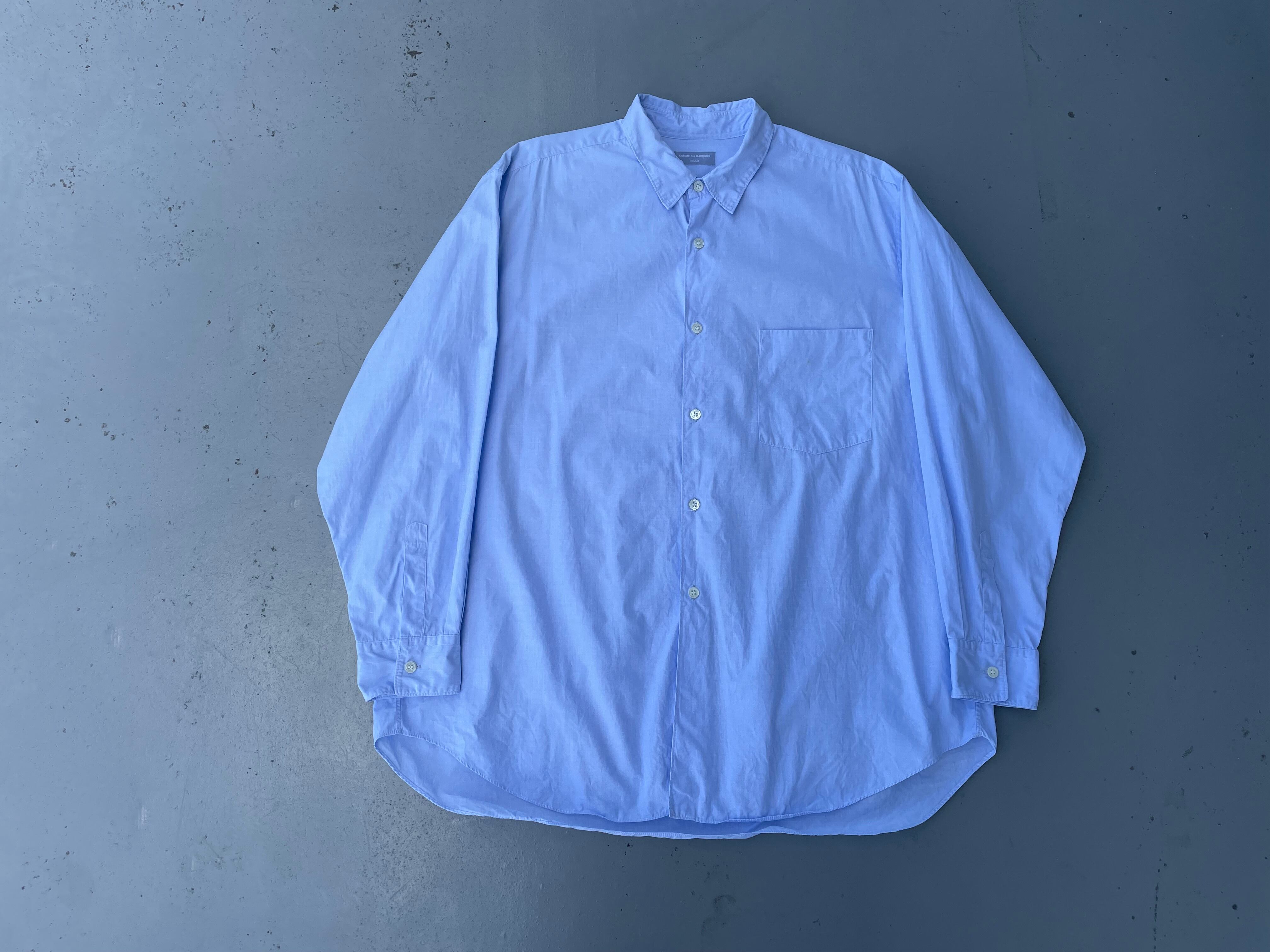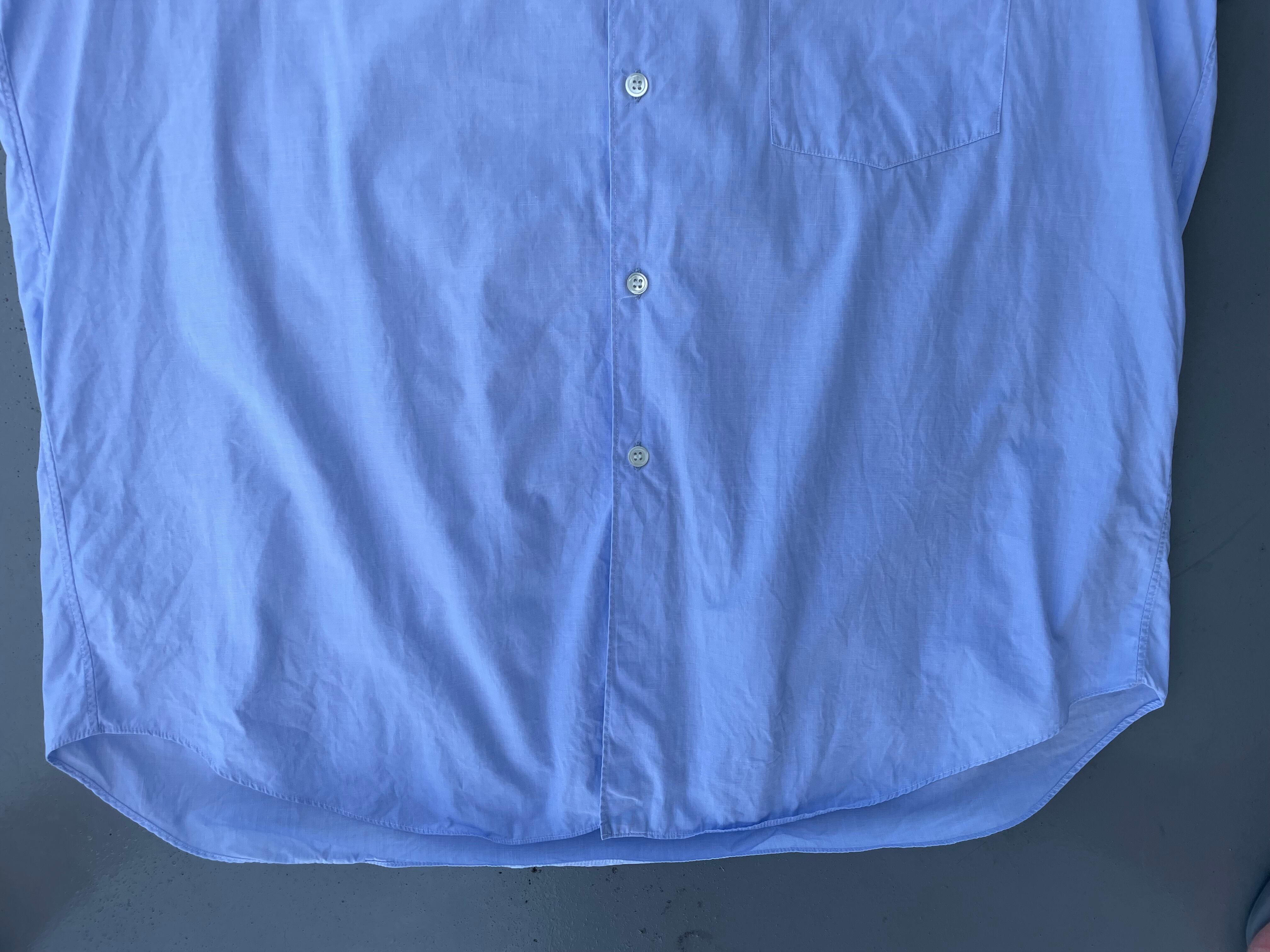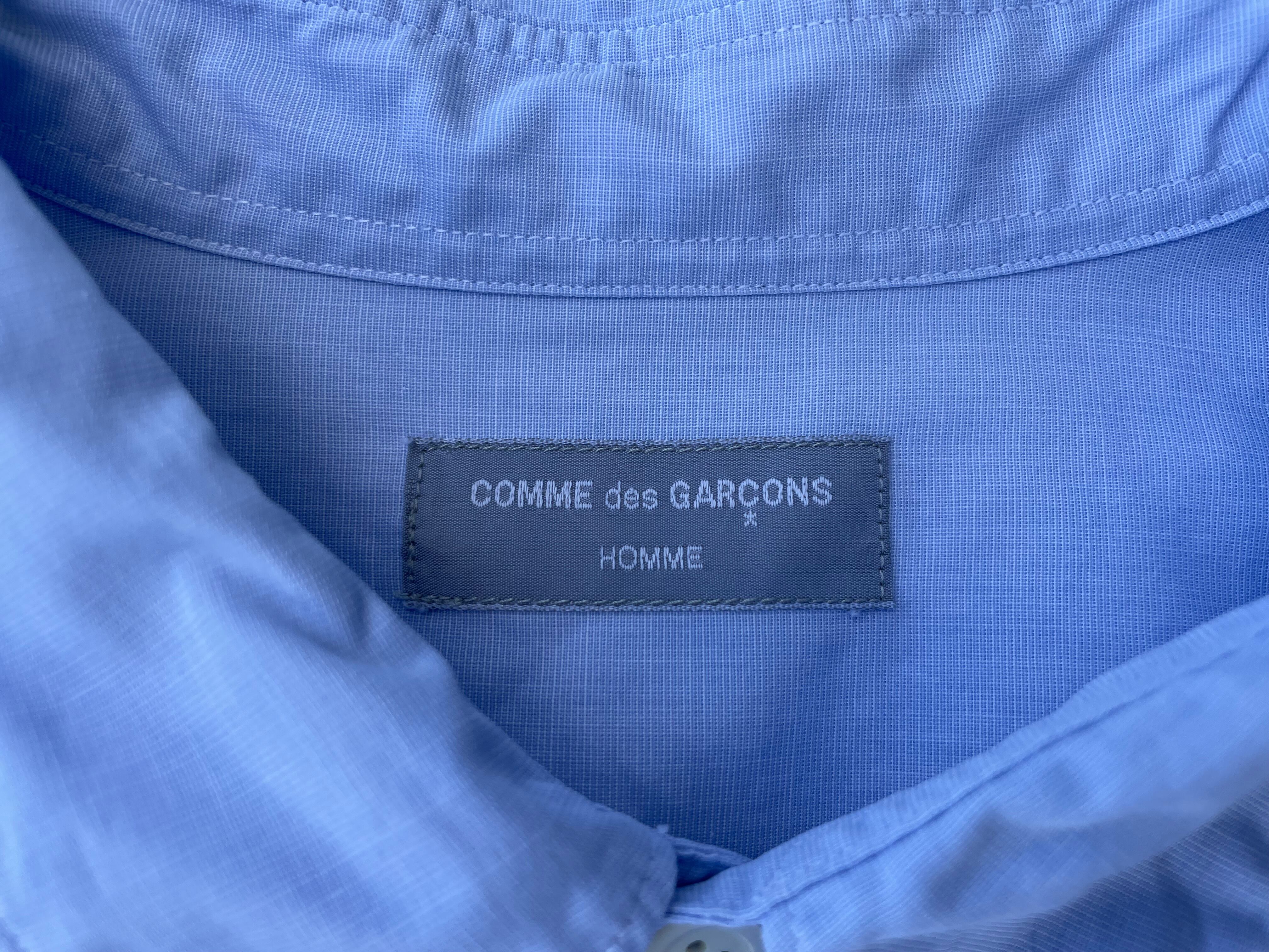 【商品詳細】コムデギャルソン オムのオーバーチェックシャツ。カラーはサックスブルー。90年代日本製。田中オム期の中でも人気なシャツシリーズからオーバーサイズシャツです。全体的なディーテールが大きく取られており、ドレープ感のあるギャルソンシルエット。軽い仕上がりのコットン地の為、暑い夏場でもサラッと着れそうです。