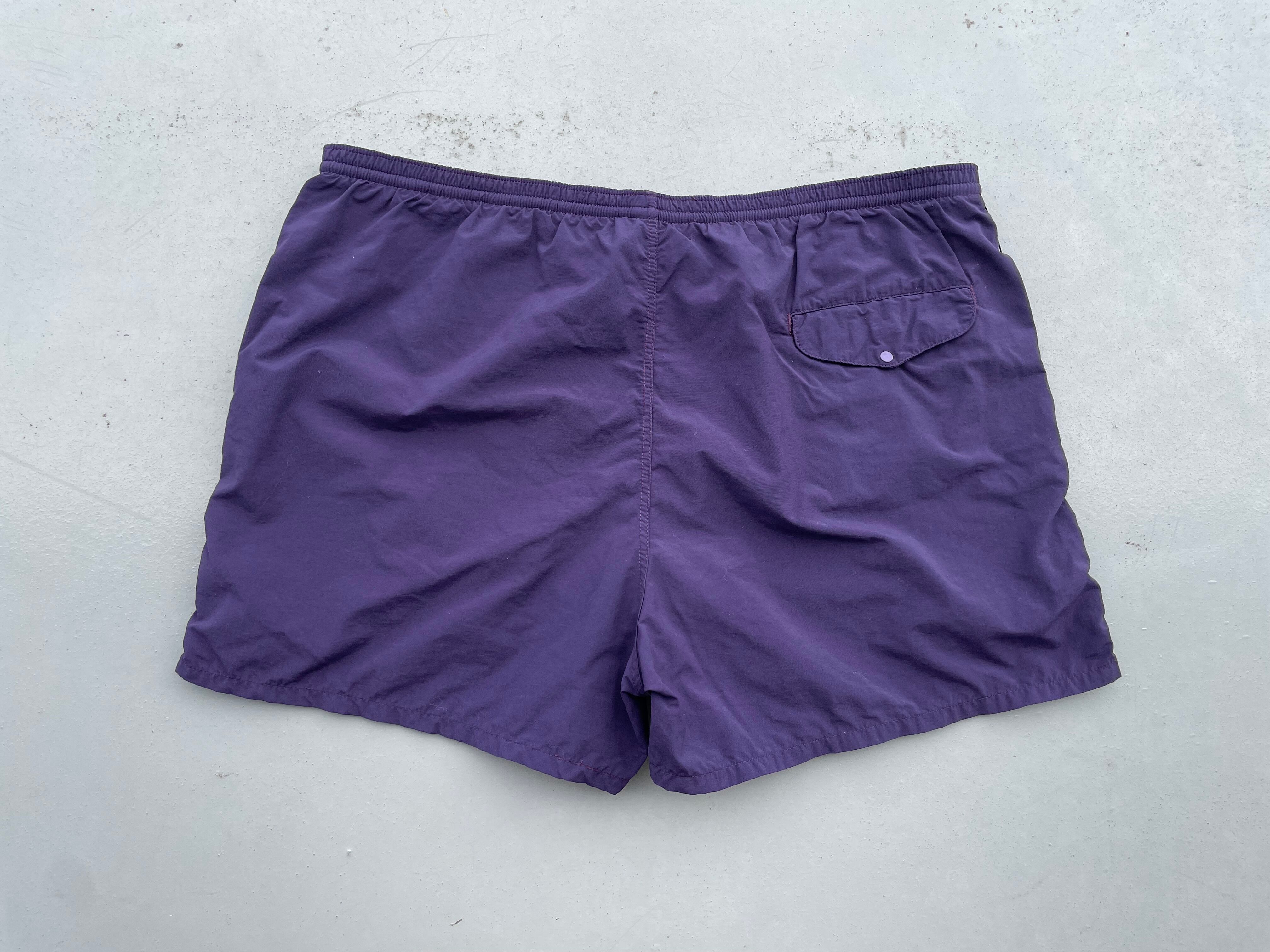 【商品詳細】パタゴニアのバギーズショーツ。サイズはL。カラーはパープル。96年ジャマイカ製。希少なオールドモデルのバギーズショーツ。この年代ならではのさつまいものような茄子紺カラー◎わたり・裾幅がしっかりあるバギーなシルエット。年代物ですが程度も良いです。おすすめ。
