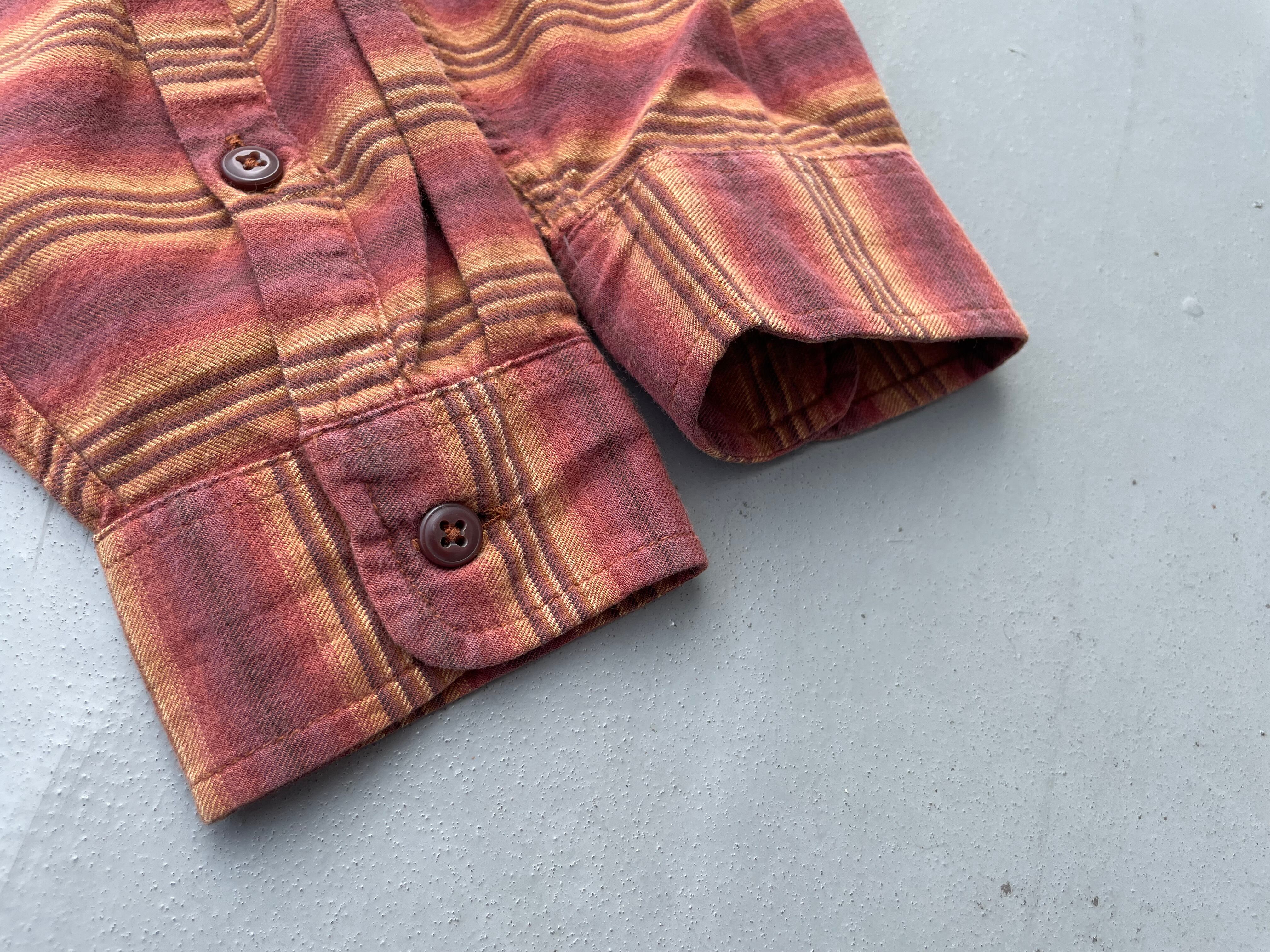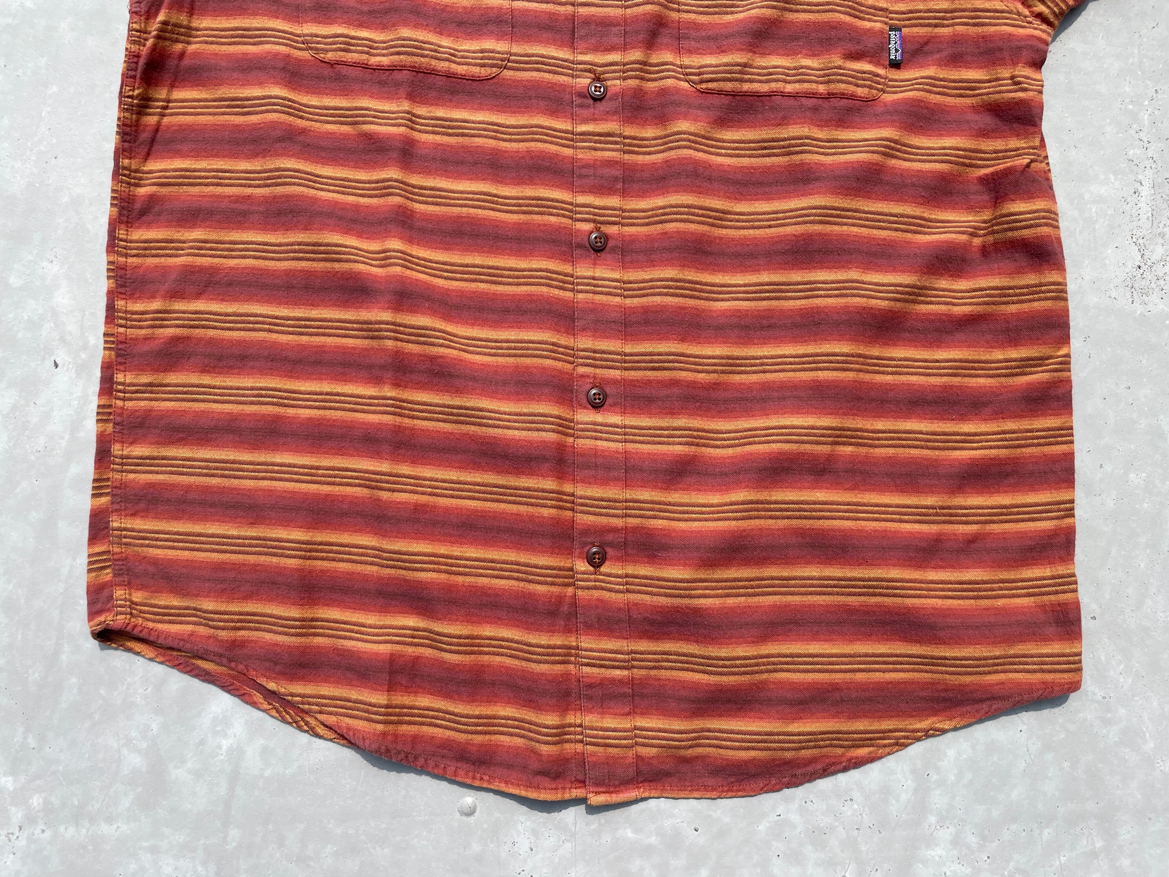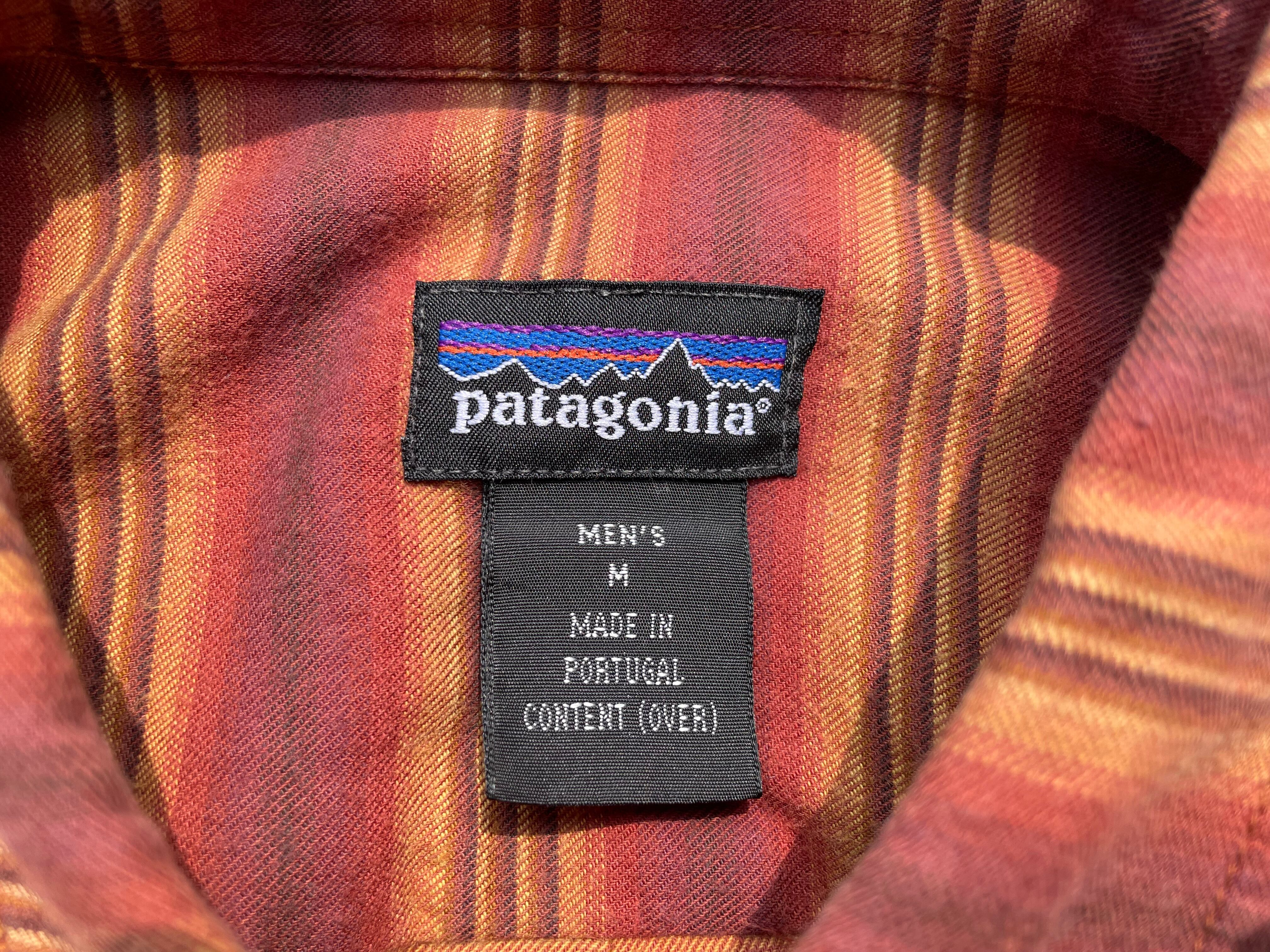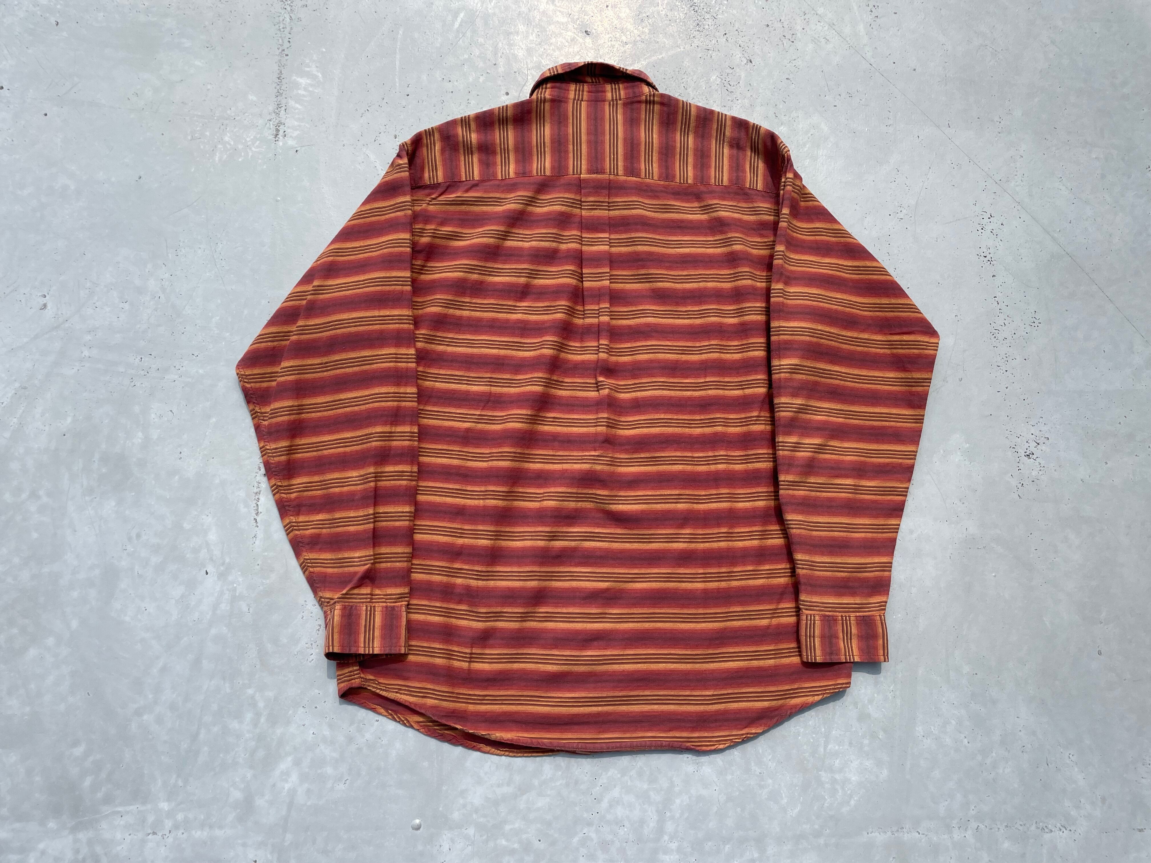 【商品詳細】パタゴニアの長袖シャツ。サイズはM。カラーはオレンジ×ブラウンベースのボーダーパターン。90-00年代ポルトガル製。珍しいオンブレベースのボーダーパターンを採用した洒落たデザイン。全体的なディーテールが大きく取られており、ドレープ感のあるシルエットになってます。おすすめ。