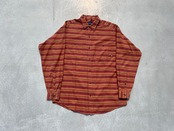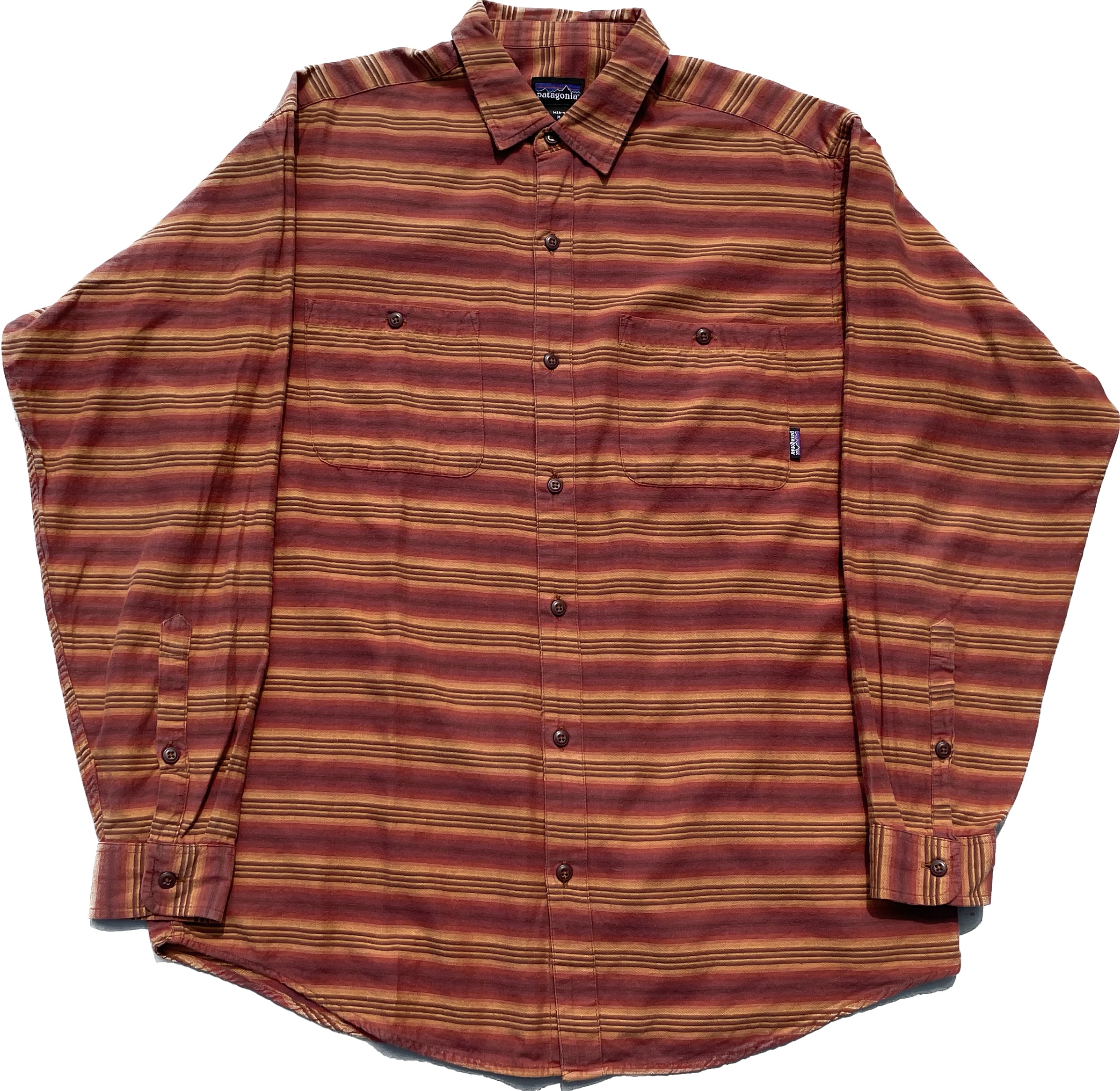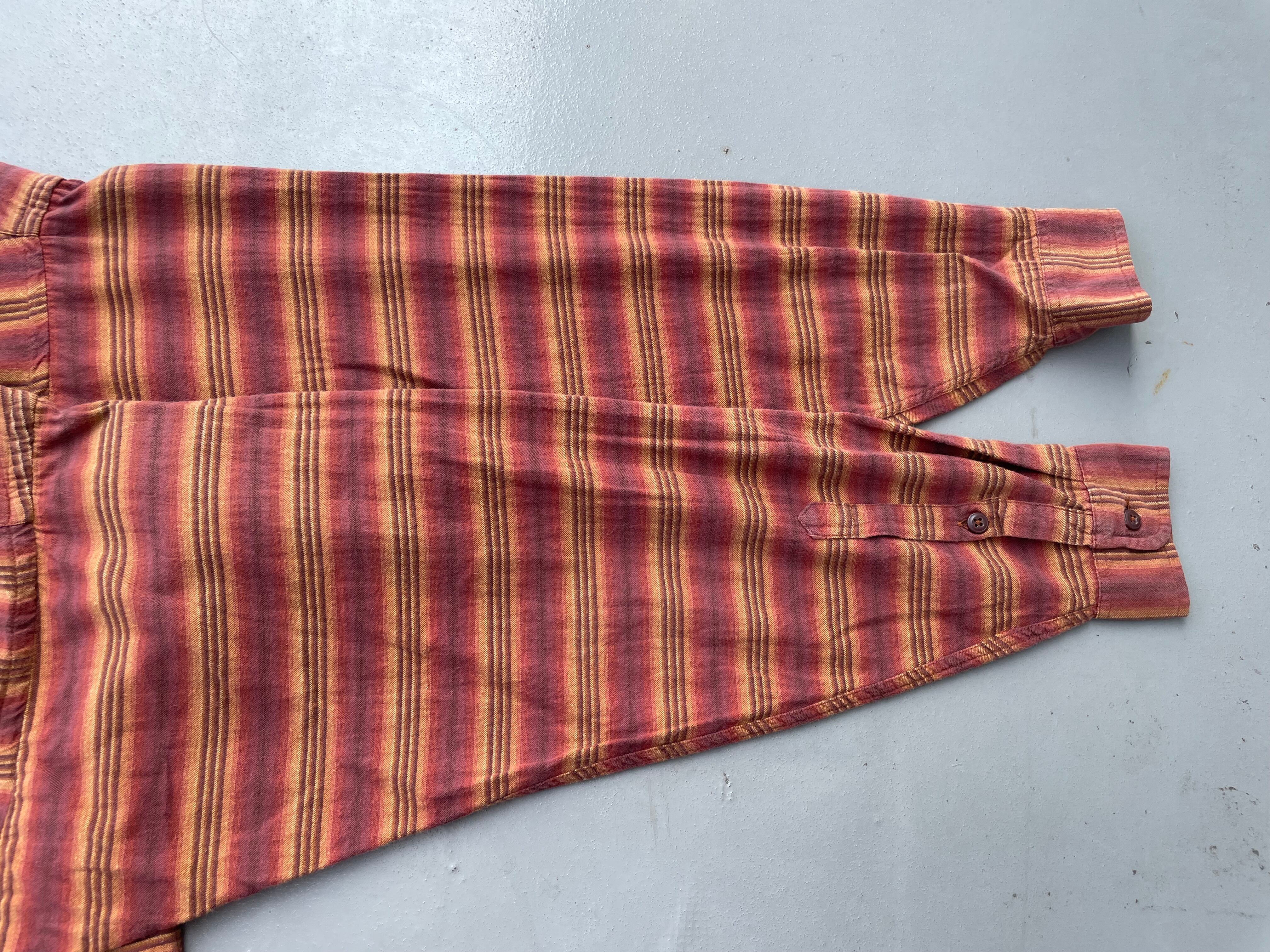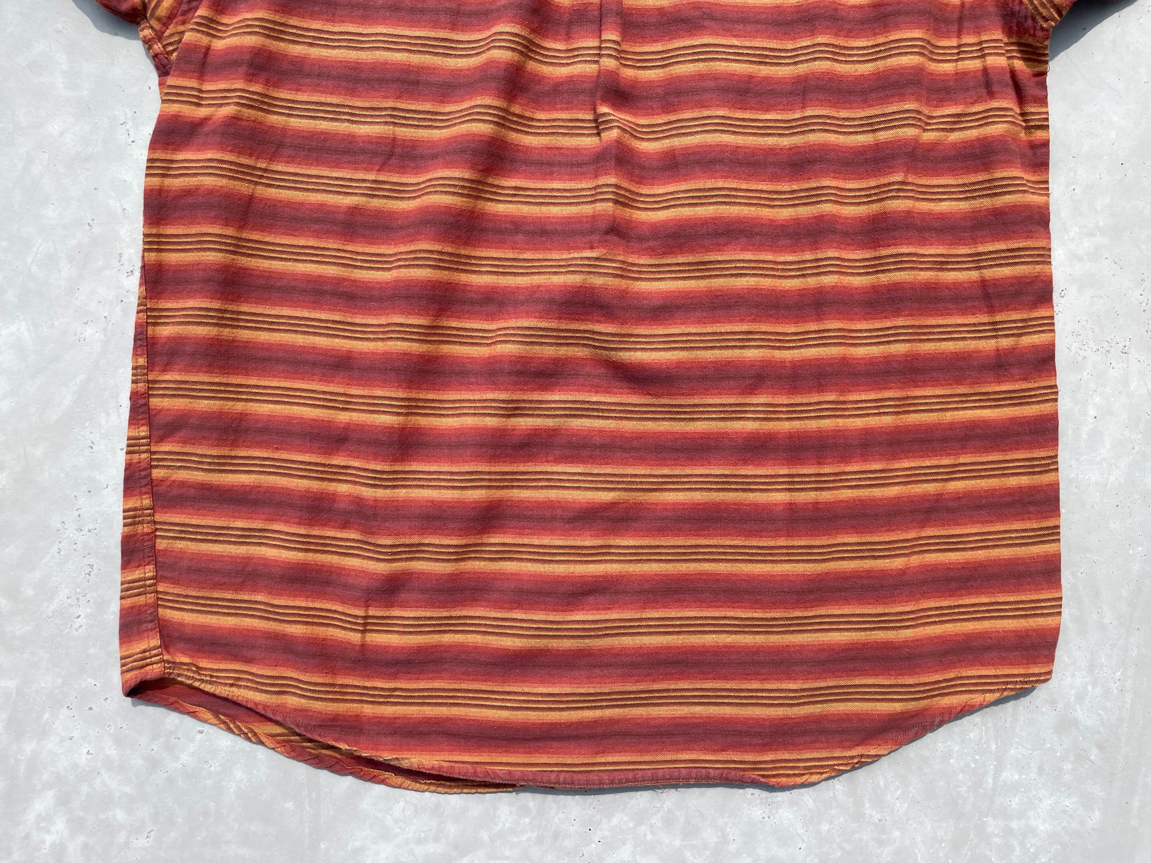 【商品詳細】パタゴニアの長袖シャツ。サイズはM。カラーはオレンジ×ブラウンベースのボーダーパターン。90-00年代ポルトガル製。珍しいオンブレベースのボーダーパターンを採用した洒落たデザイン。全体的なディーテールが大きく取られており、ドレープ感のあるシルエットになってます。おすすめ。