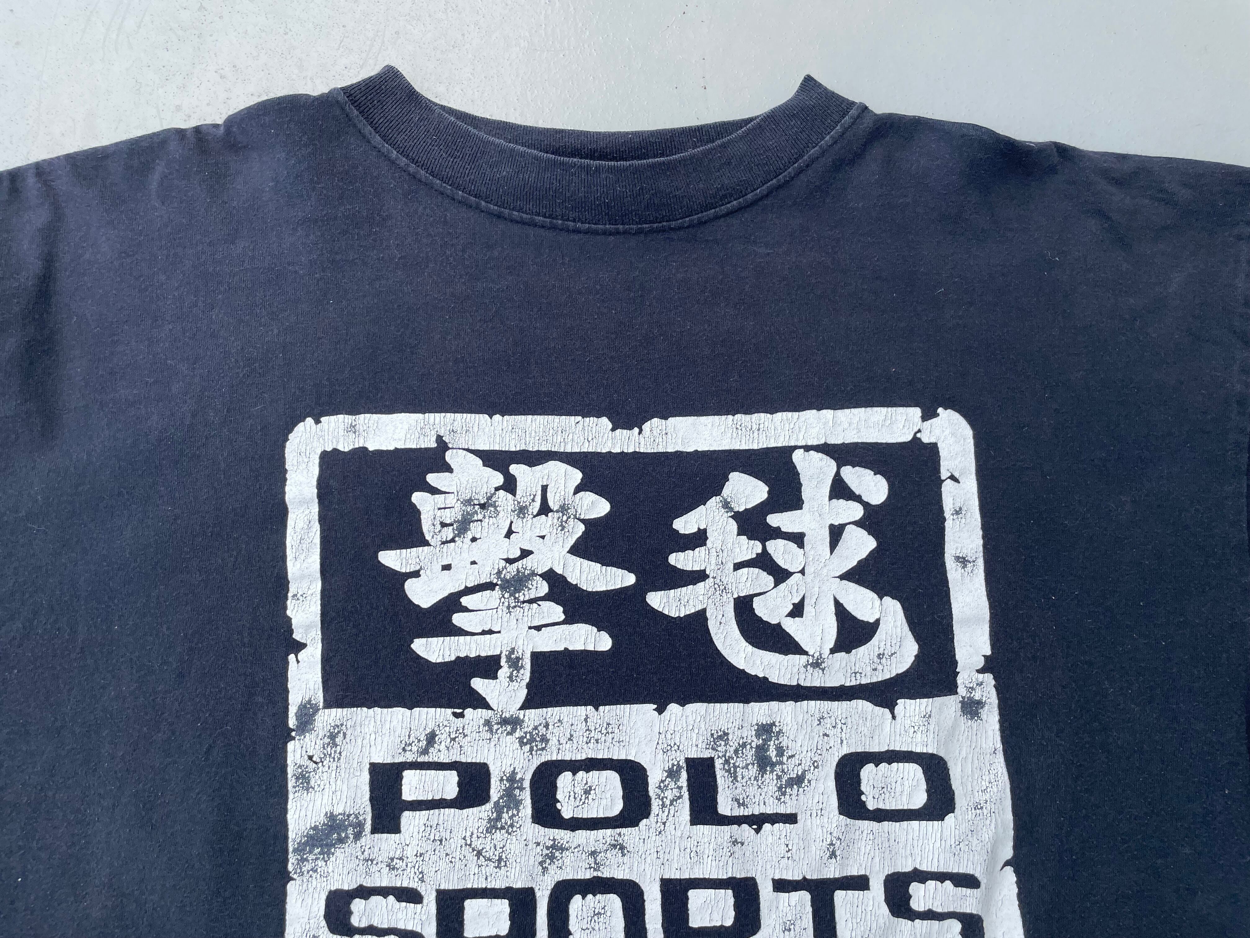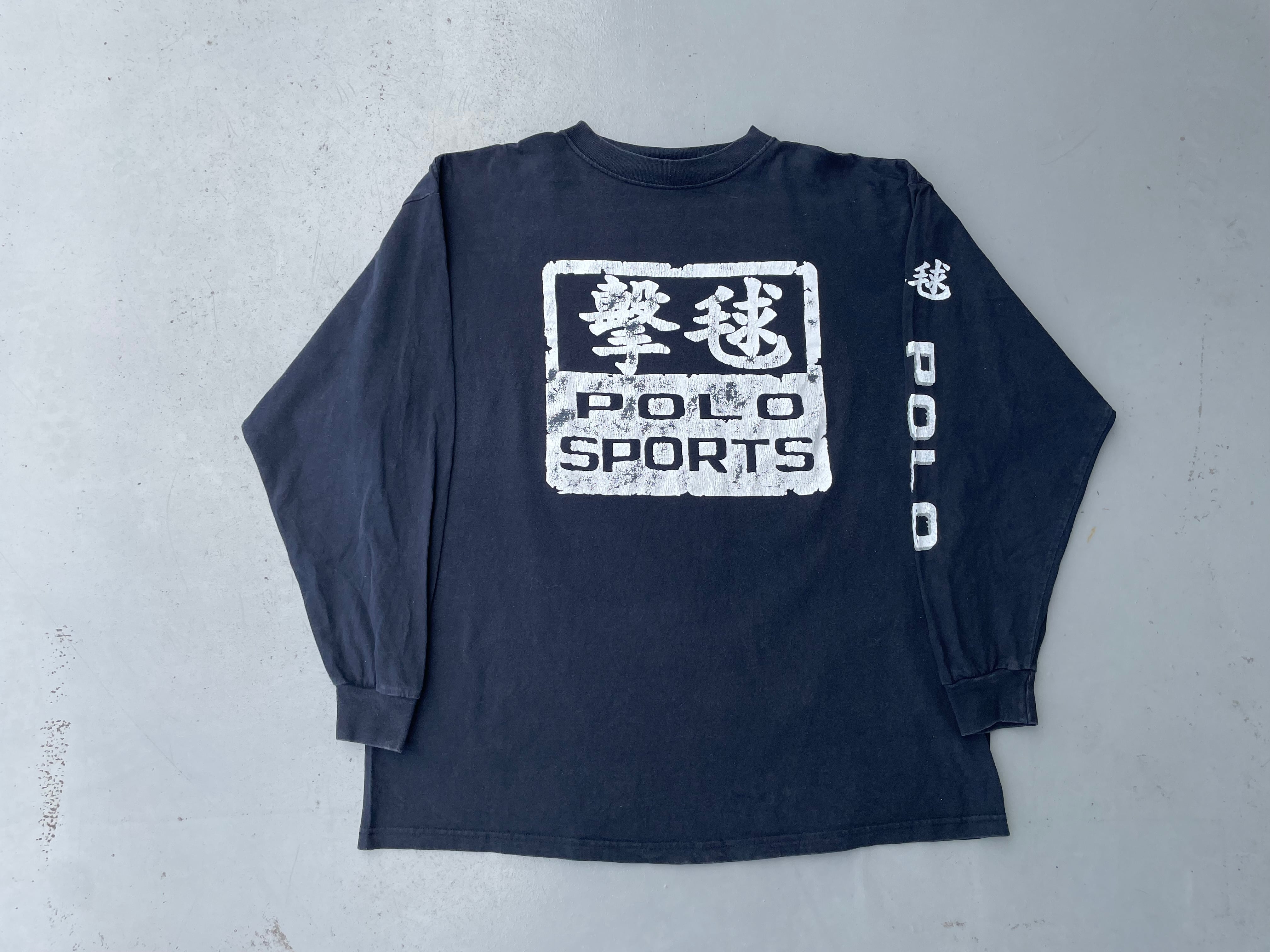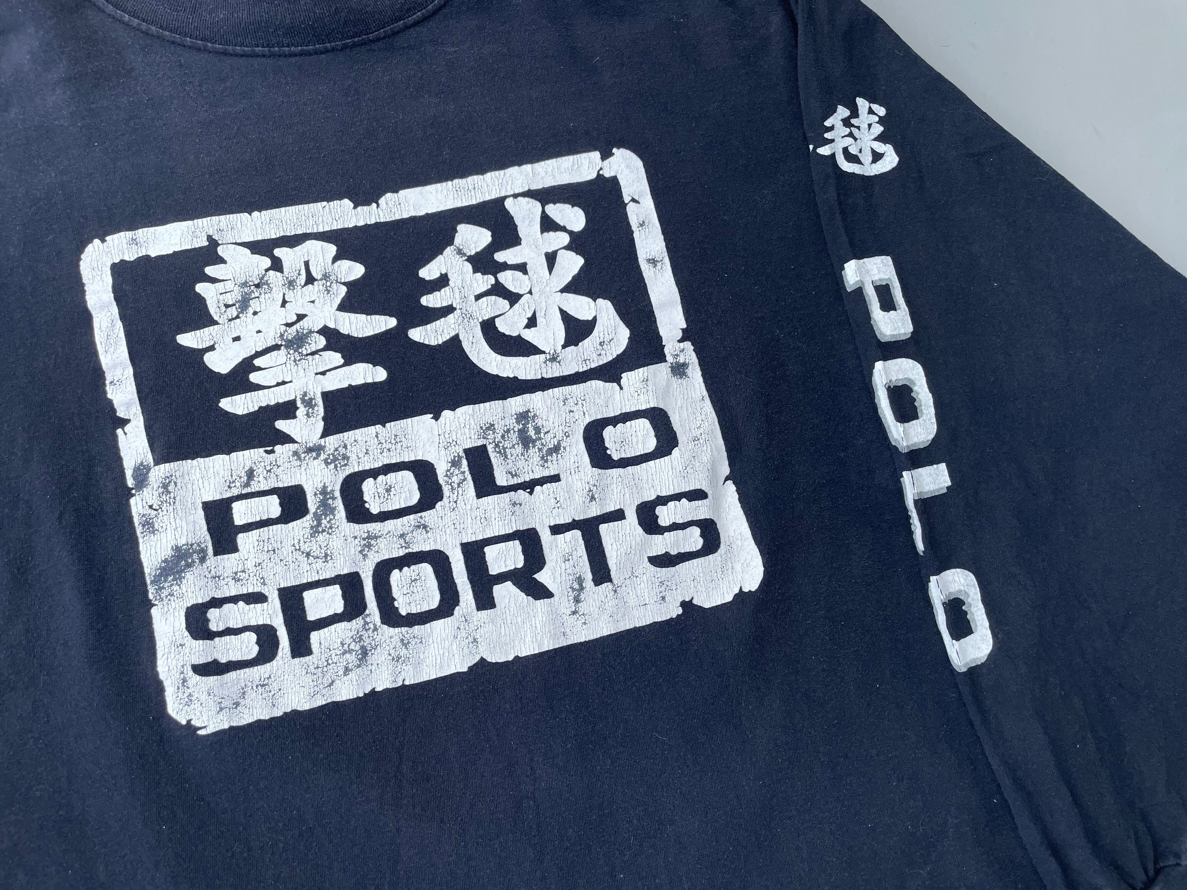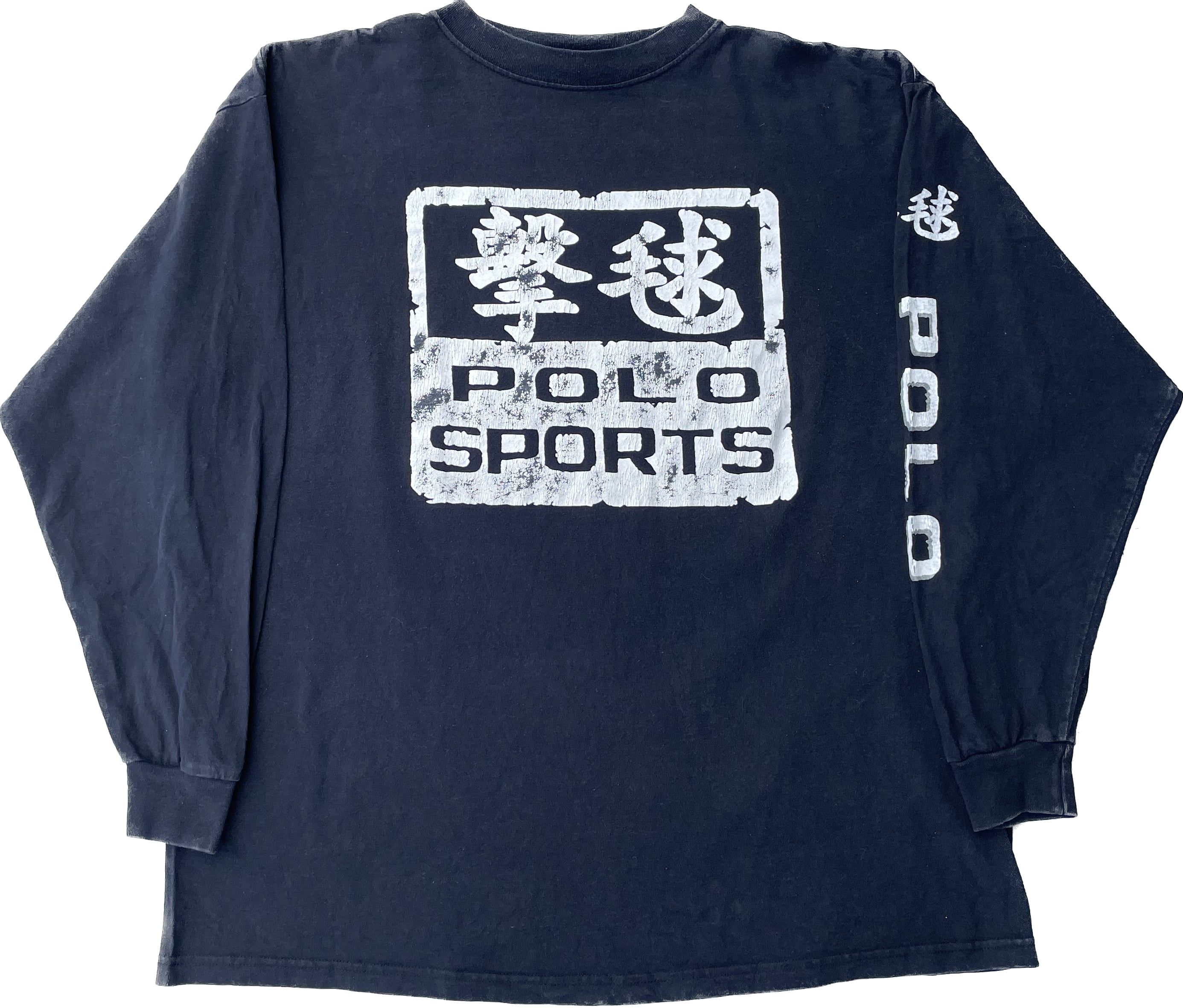 【商品詳細】ラルフローレンの長袖Tシャツ。サイズは実寸XL程度。カラーはブラック。90年代USA製。裾シングルステッチ。ラルフローレンのスポーツラインPOLO SPORTSのプリント物。東アジアの伝統的な競技”擊毬”とプリントされたシンプルながらインパクト抜群なデザイン。プリントの擦れ具合が良い雰囲気出してます。袖プリも調子良いです。サイズ大きめでブラックカラー◎