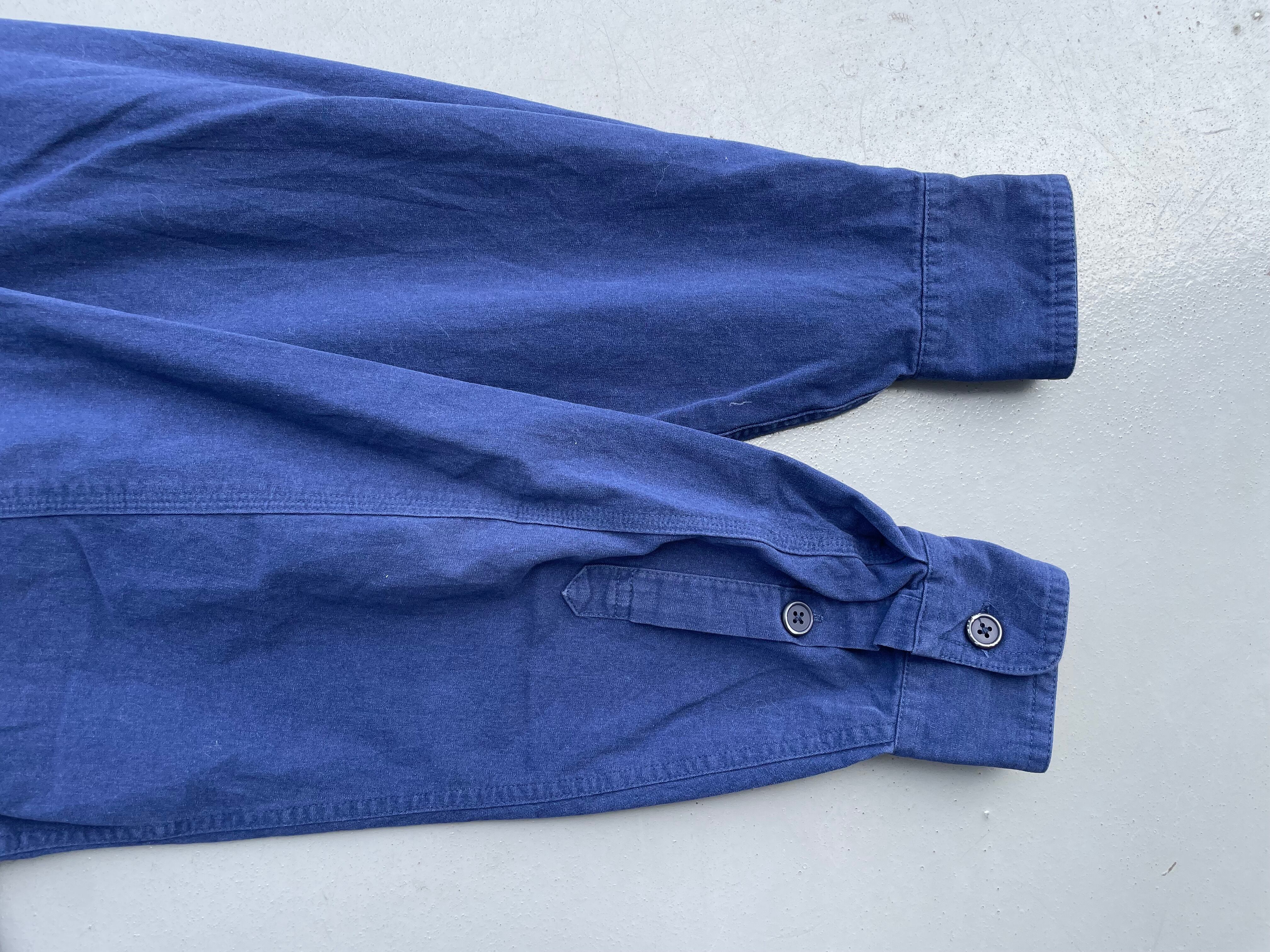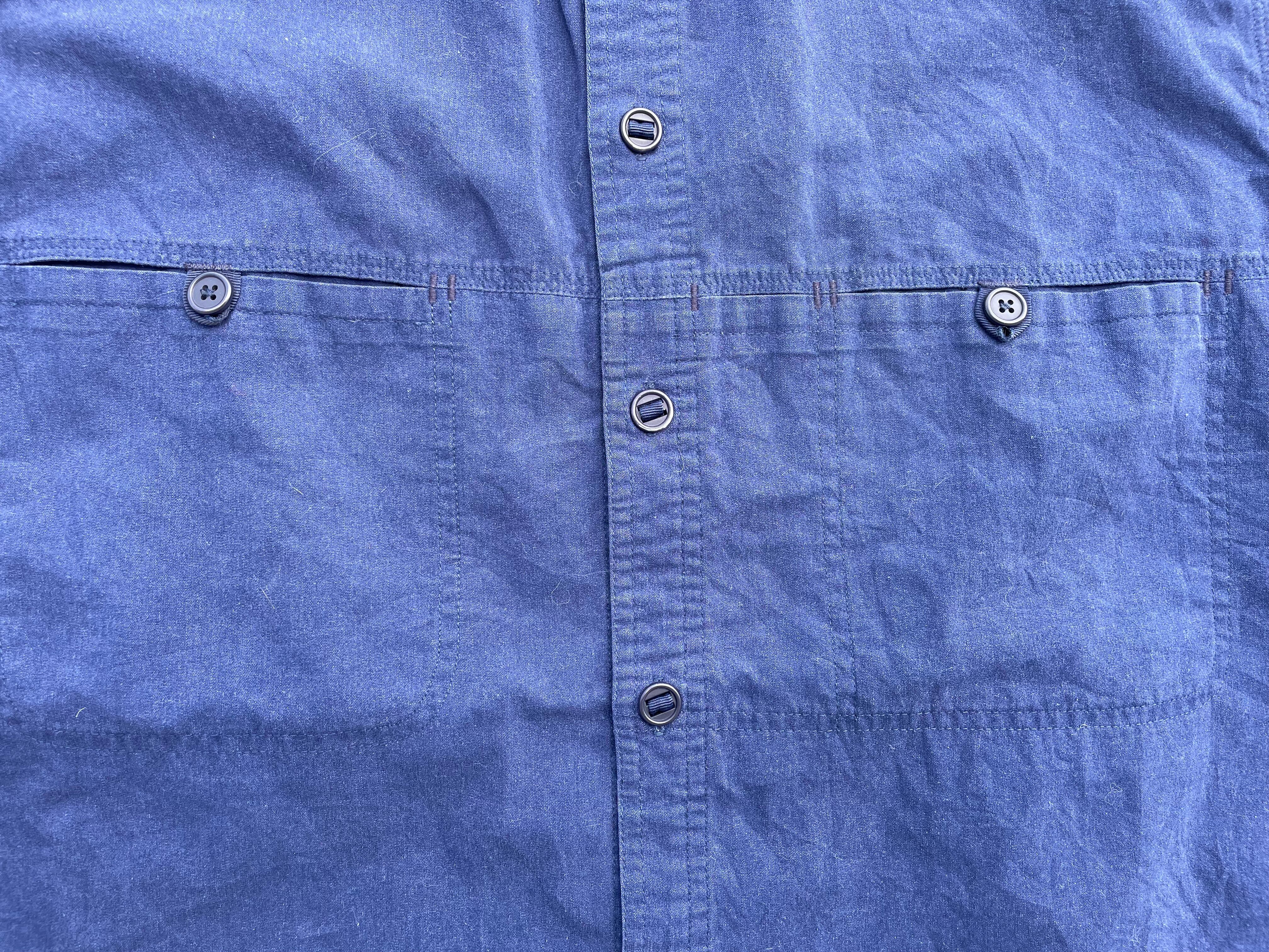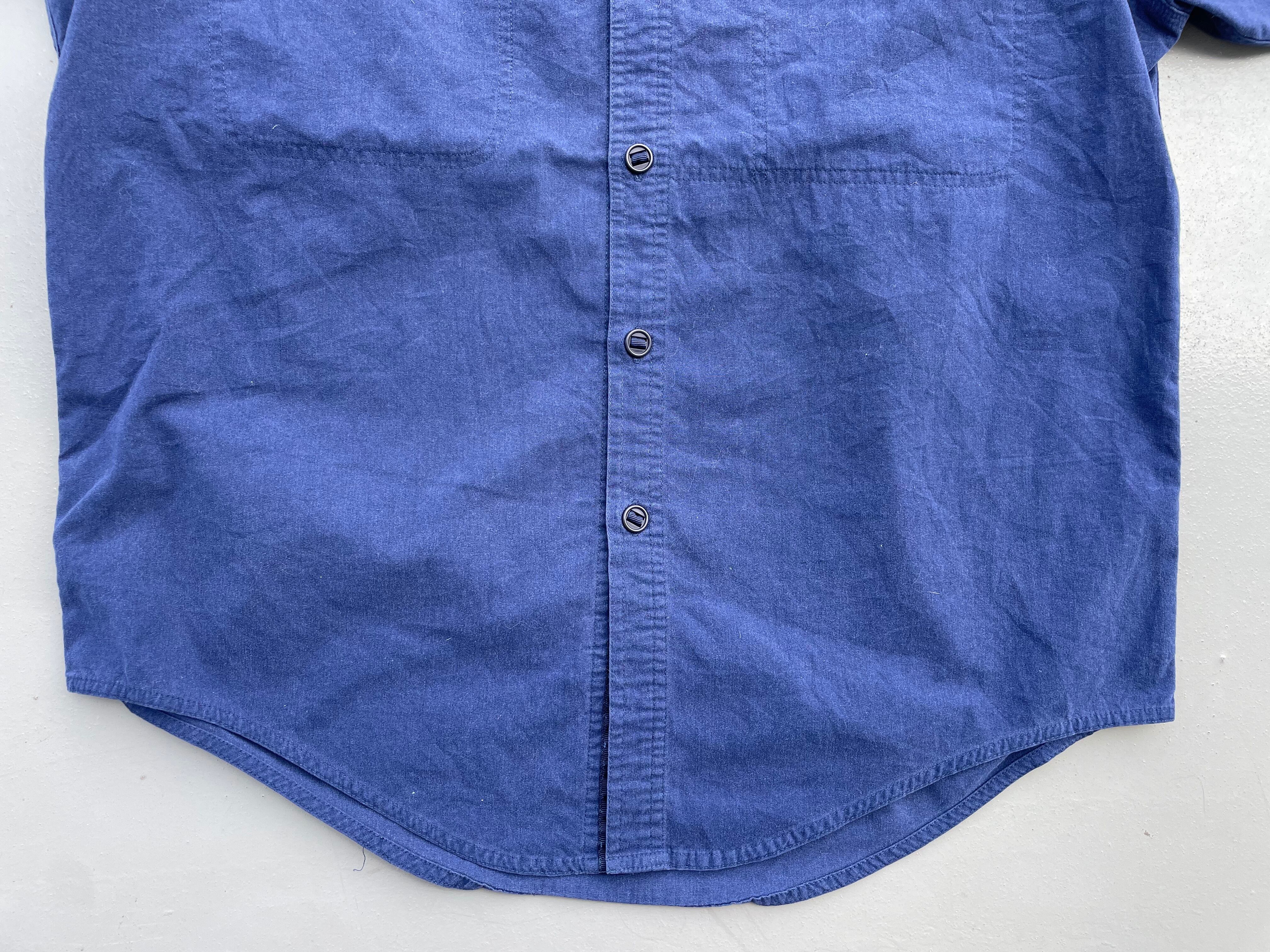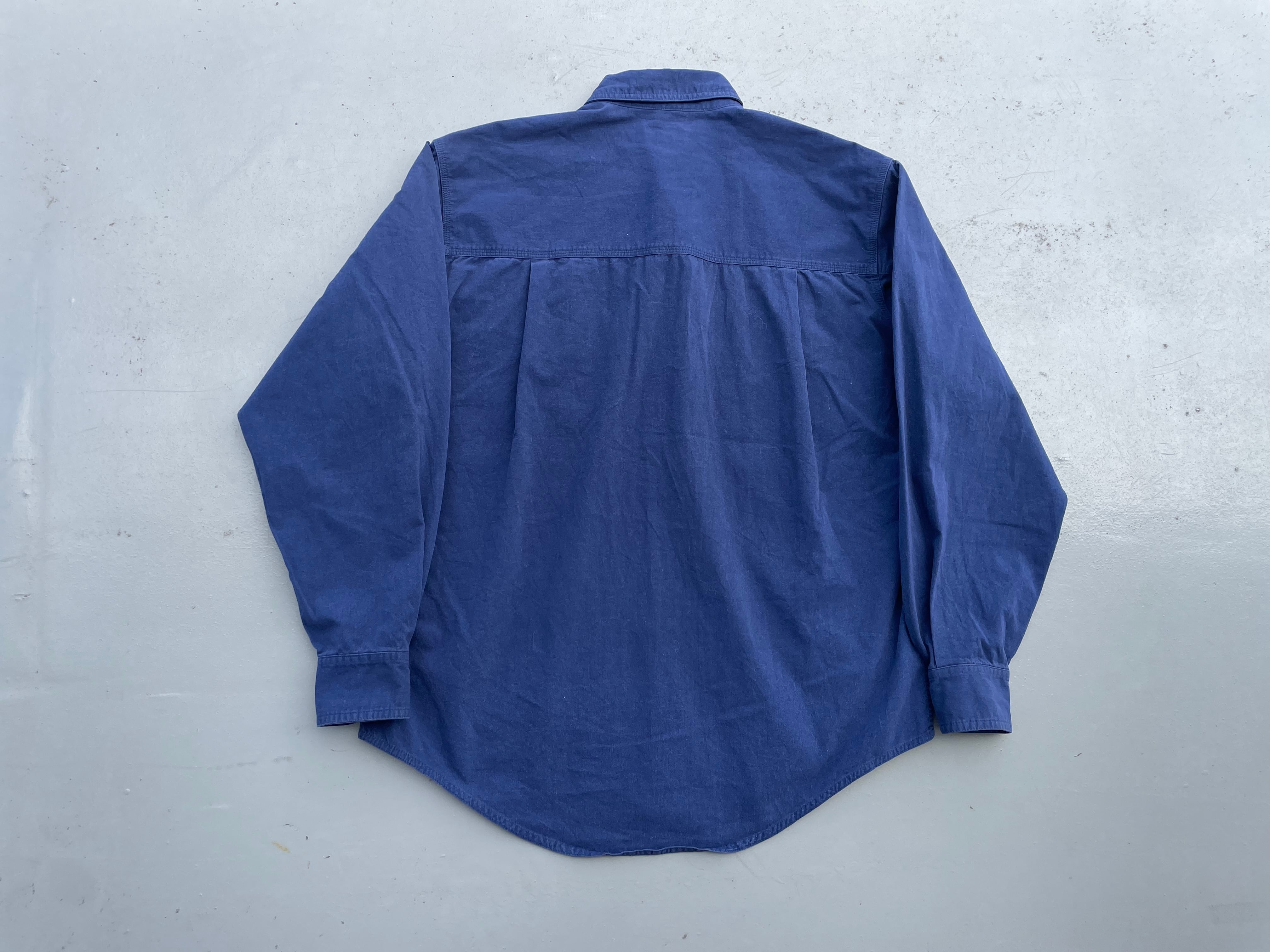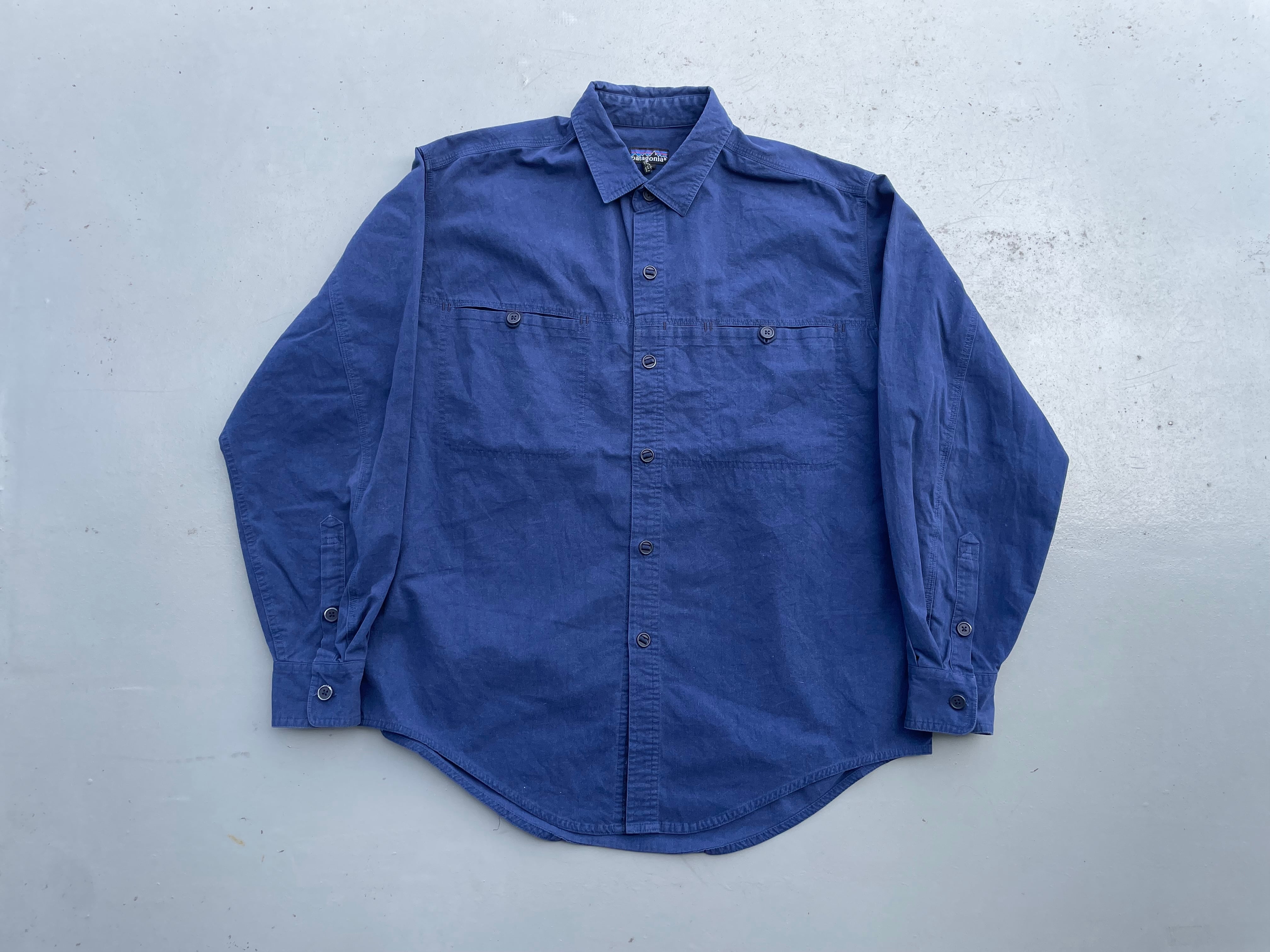 【商品詳細】パタゴニアの長袖シャツ。サイズはM-L程度。カラーはネイビーブルー。90年香港製。フロントのポケットとボタンが特徴的なソリッドなデザインの一着。しっかりとした作りのコットン×ポリエステル地。綺麗なディテールで着回し幅広めです。出回り少なめモデル。
