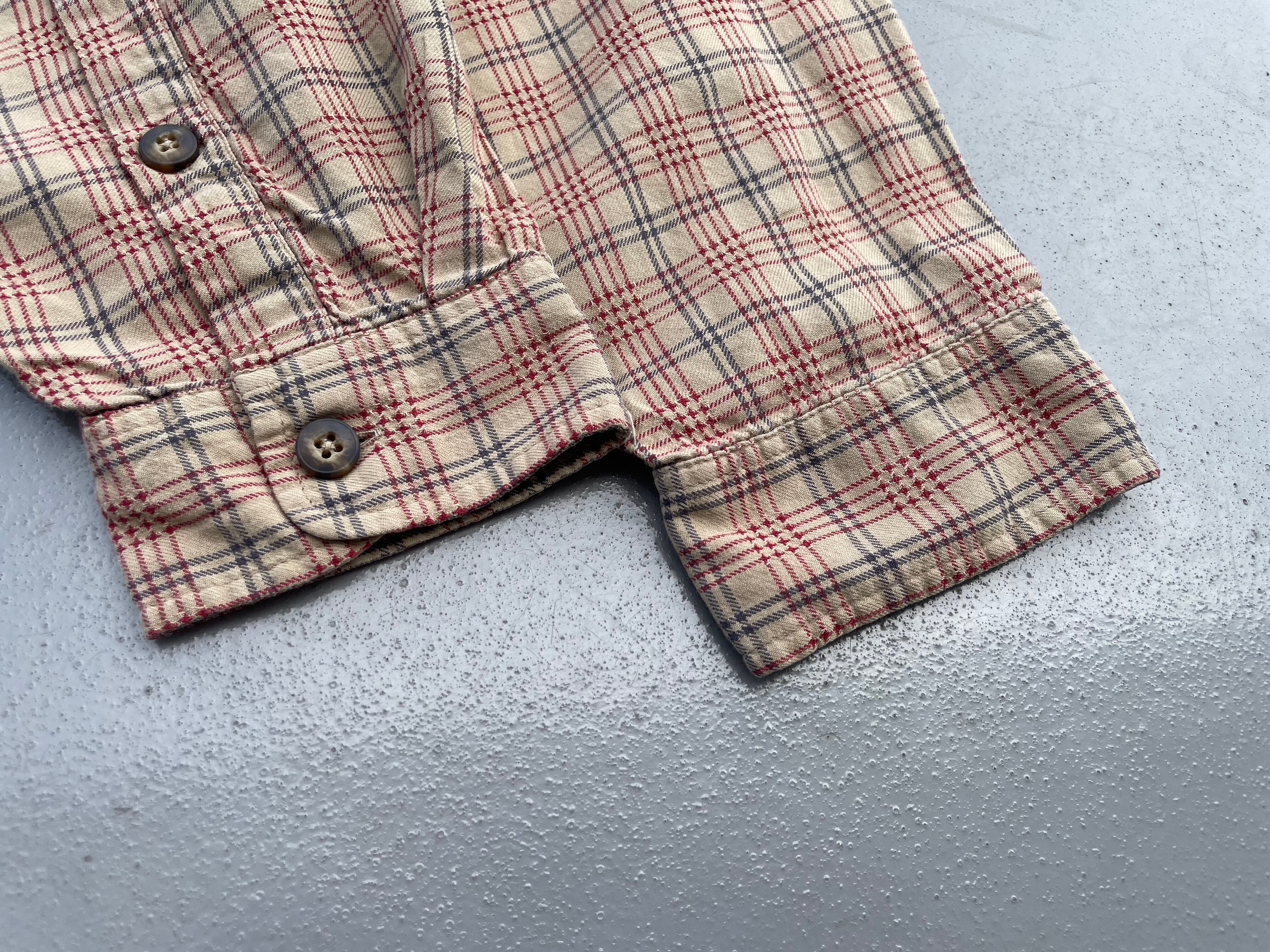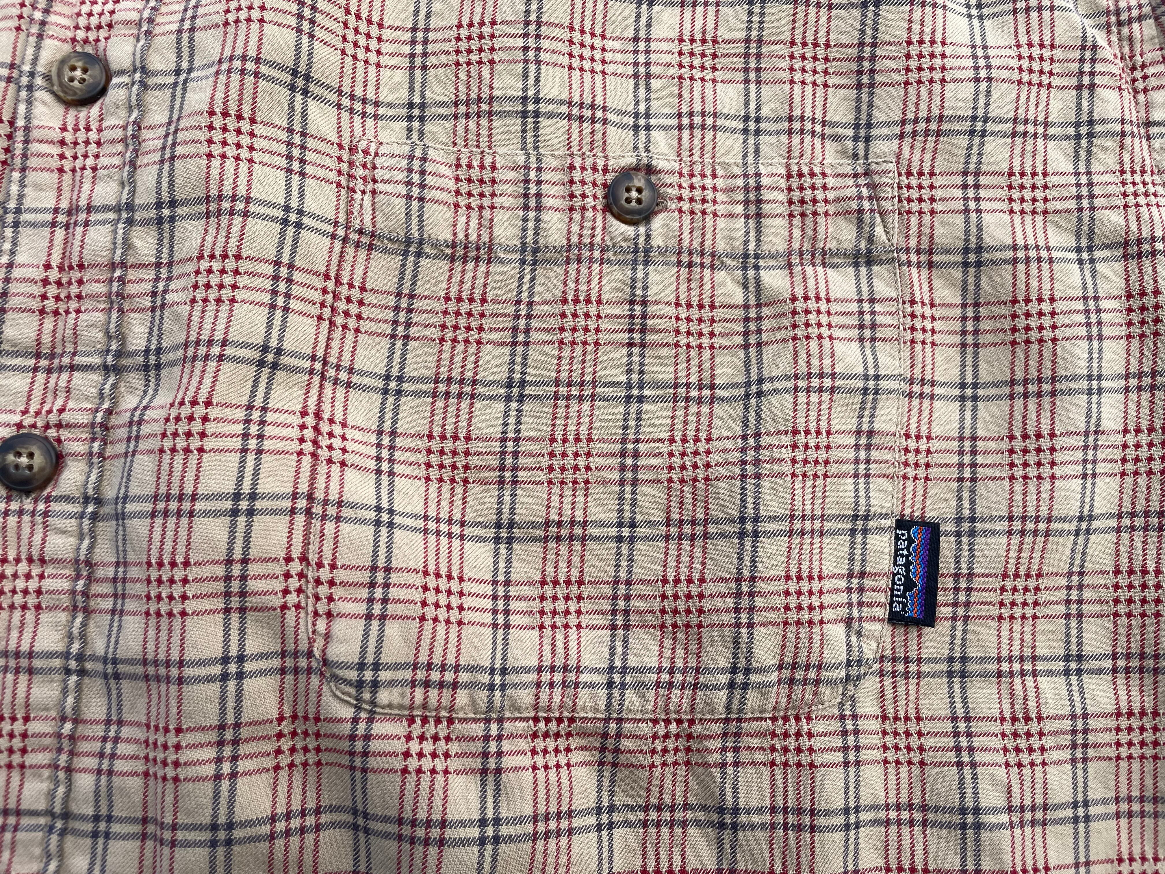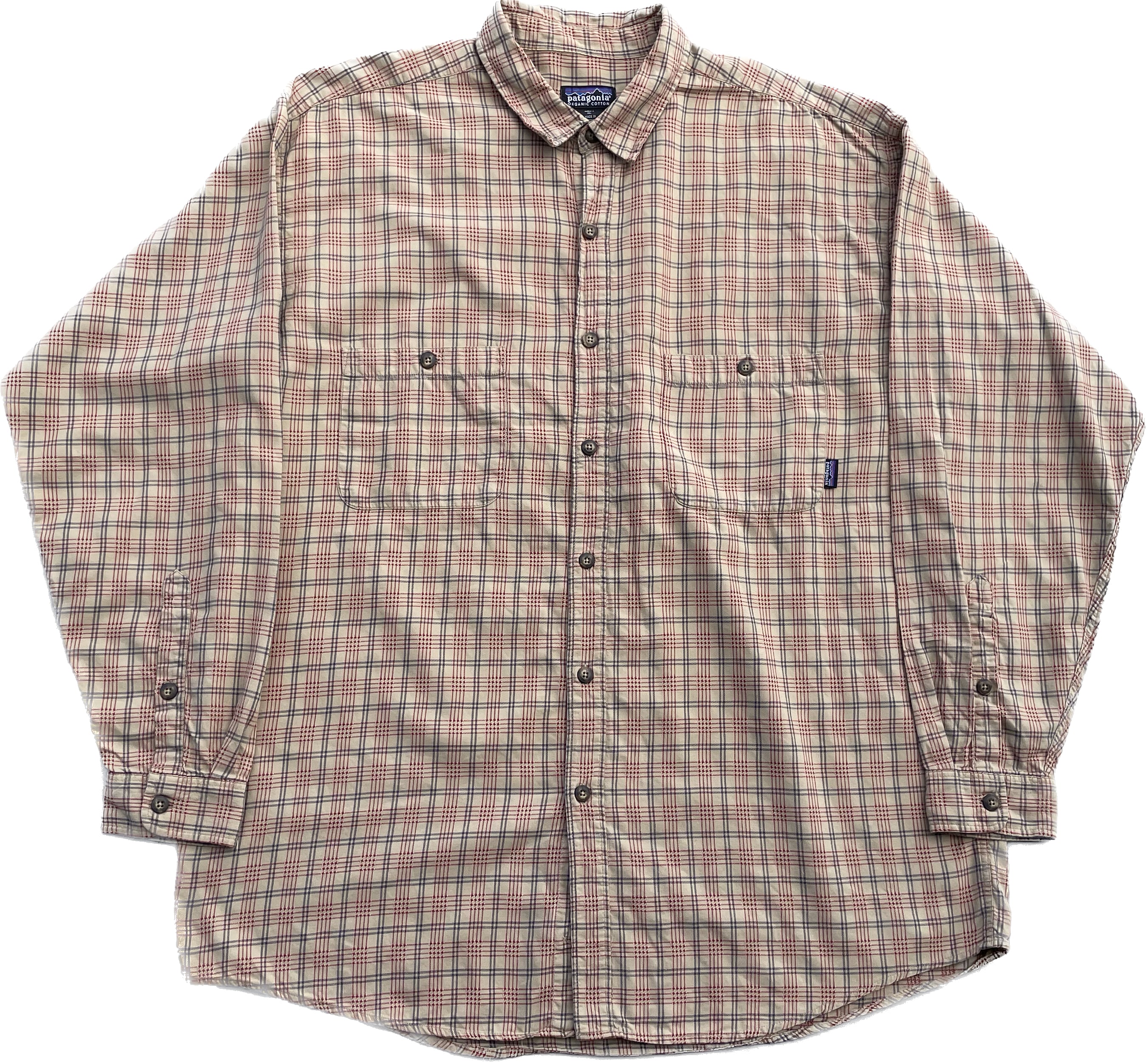 【商品詳細】パタゴニアの長袖シャツ。サイズはXL。カラーはベージュ×ブラック×レッドベースのチェックパターン。98年ポルトガル製。パタゴニアの中でも特に人気なポルトガル製シャツ。バーバリーのノバチェックのようなデザインに赤い折の入るアウトドアブランドらしからぬ洒落たチェックパターン。ドカンと大きめサイズでガバッとご着用いただけます。